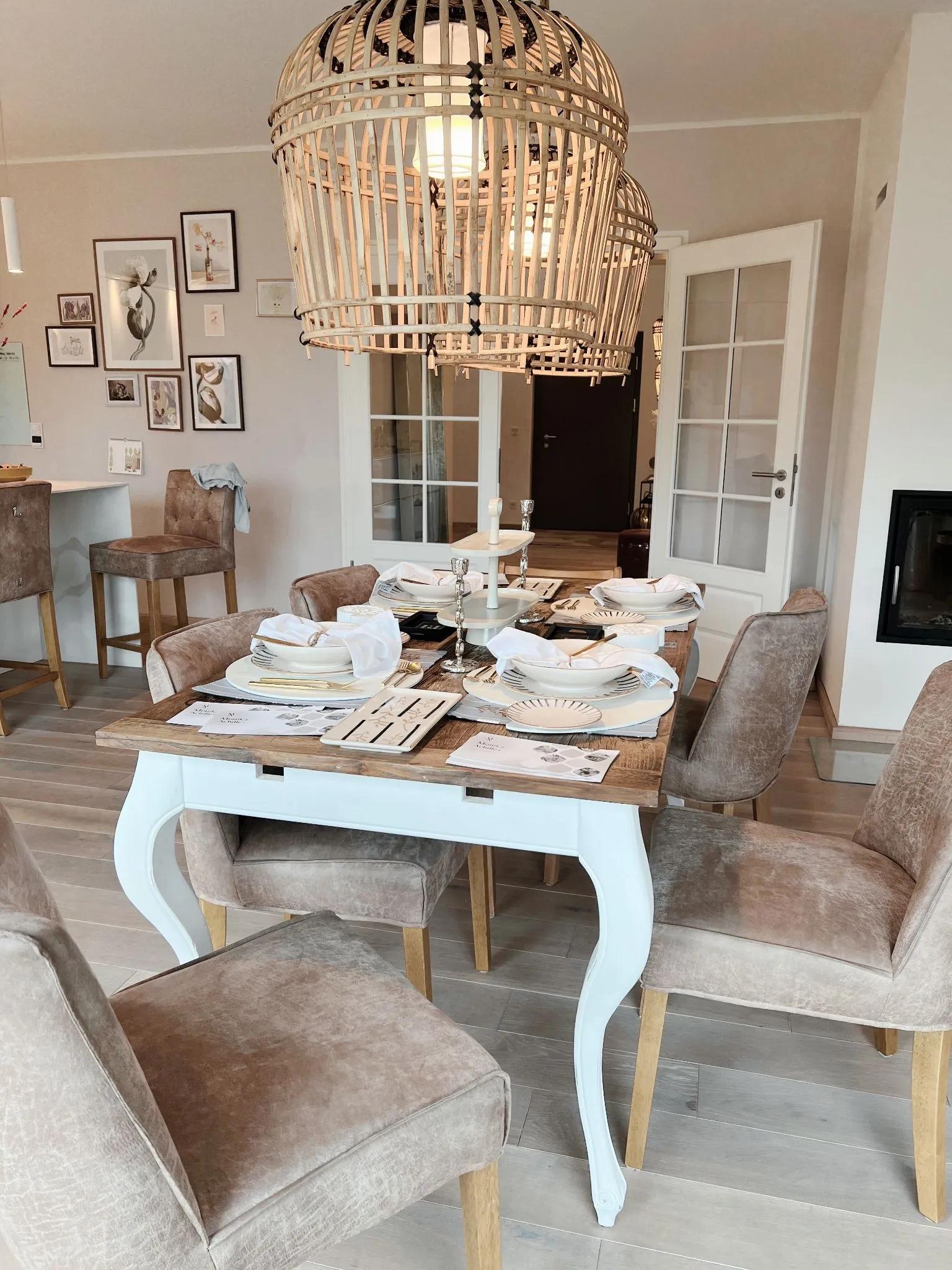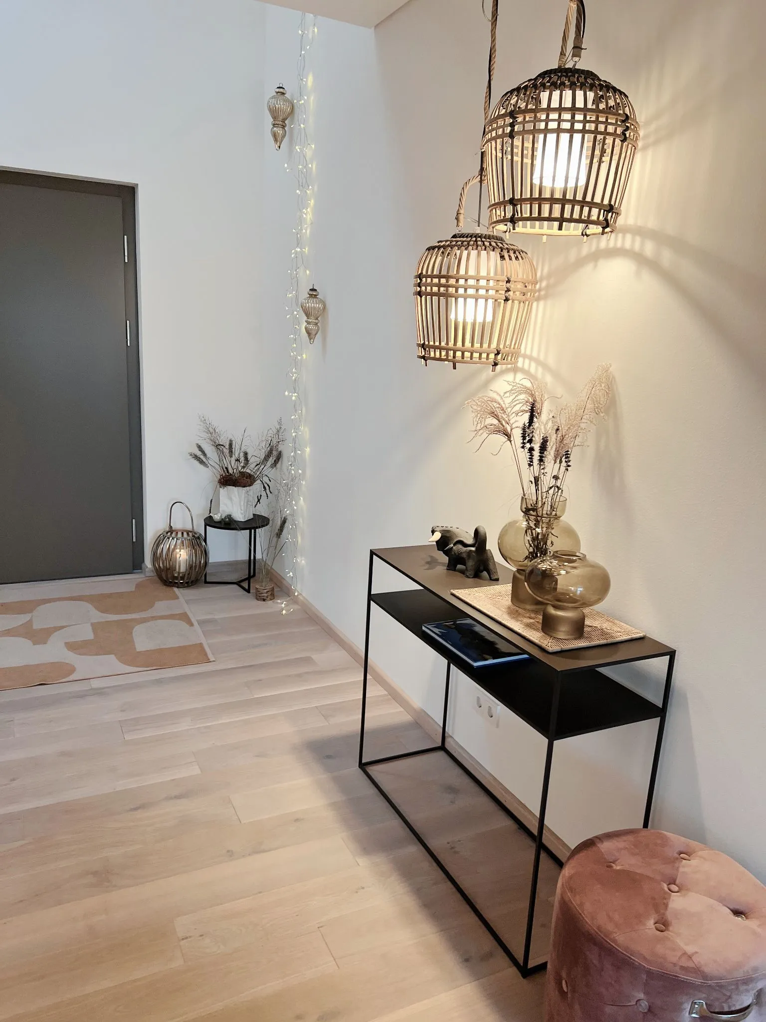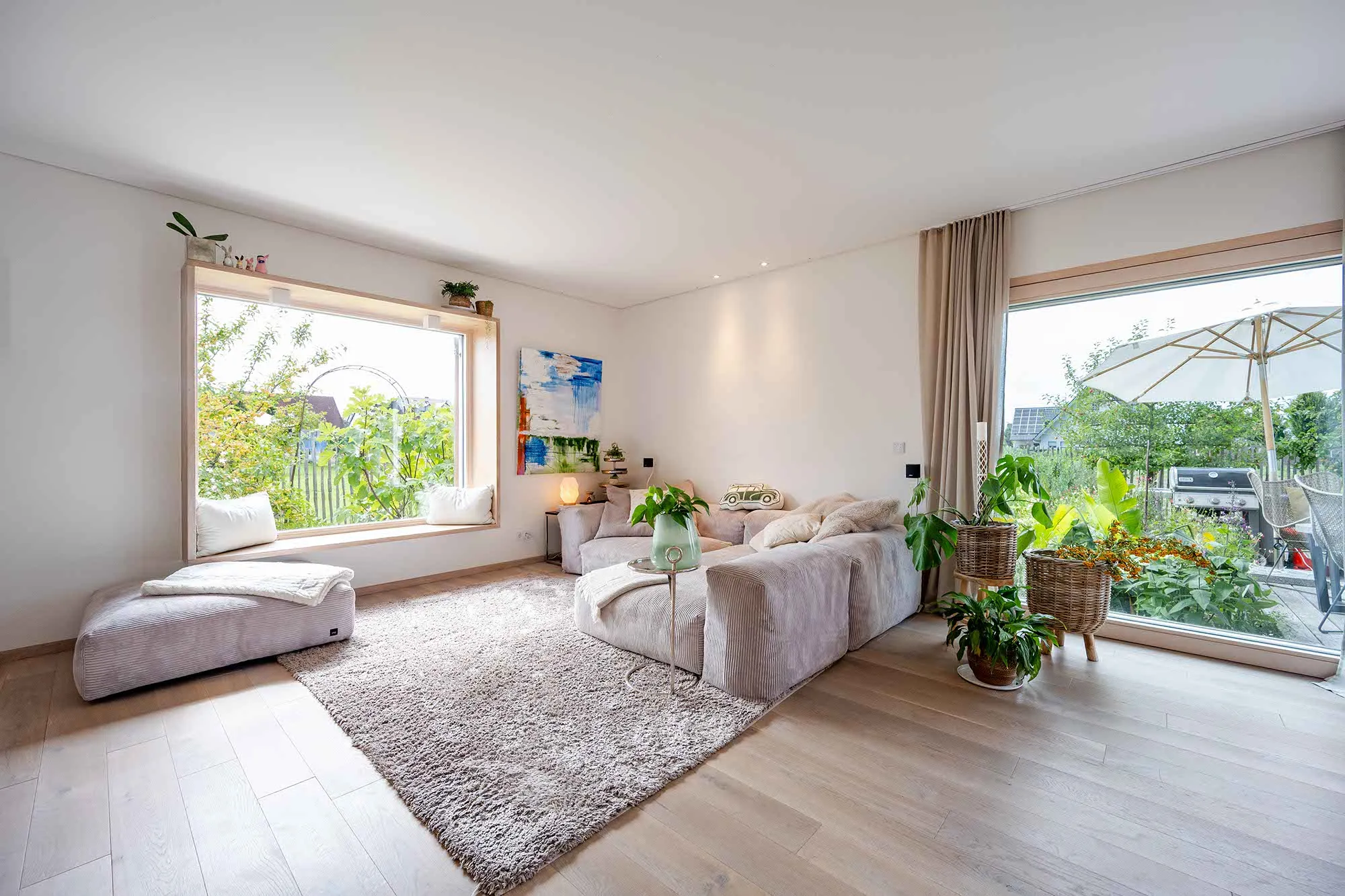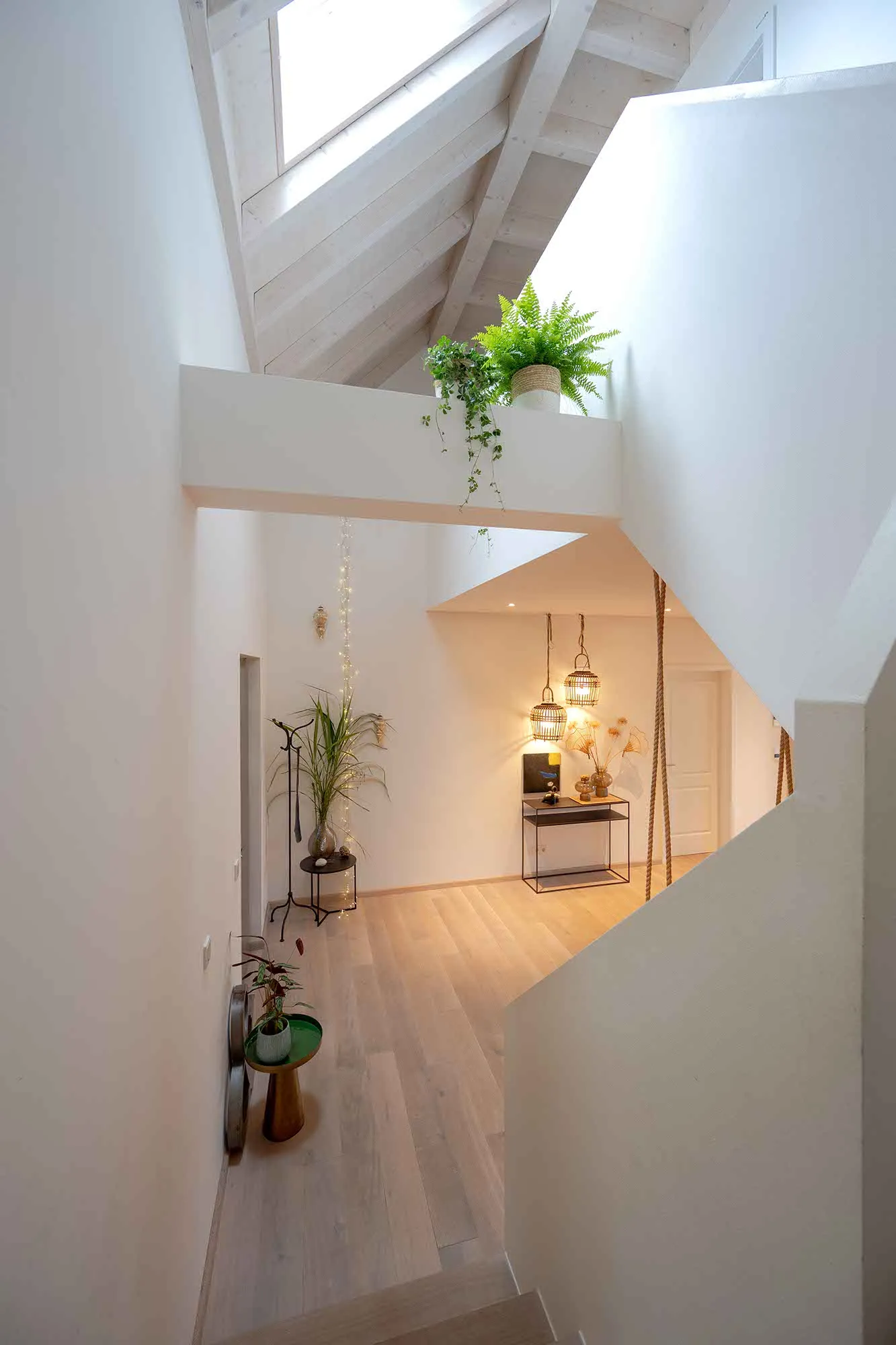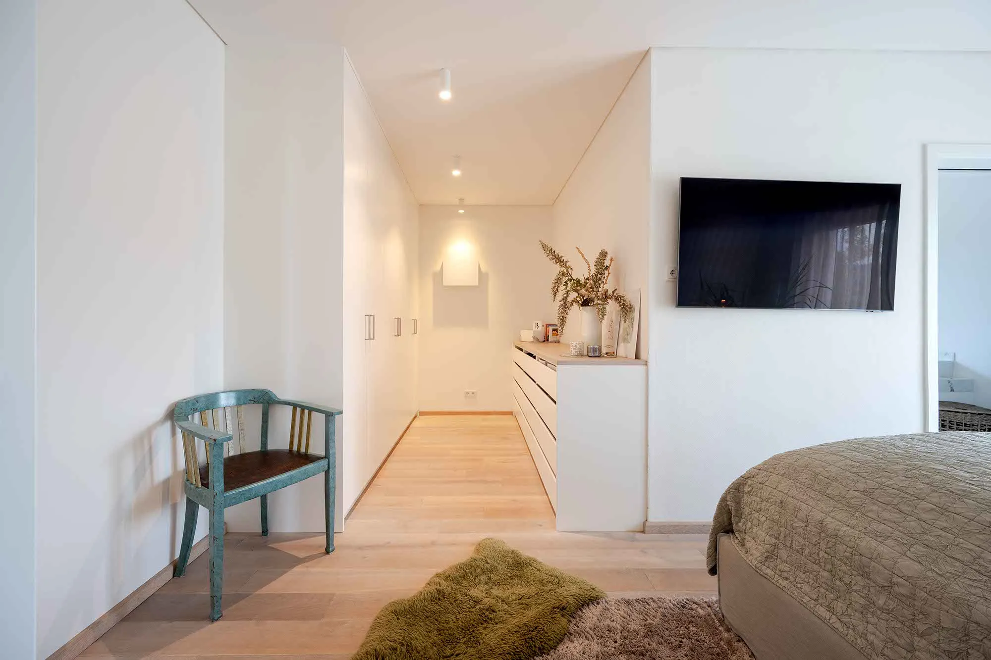 traditionelle, fränkische Bauweise mit Schleppgaube und Fensterläden; versteckter Durchgang in der Küchenfront zur Speisekammer; große Fliesenformate in Marmor-Optik; Mix aus puristischer Inneneinrichtung mit modernen Landhauselementen; mit Leistenschalung optisch abgesetztes Carport