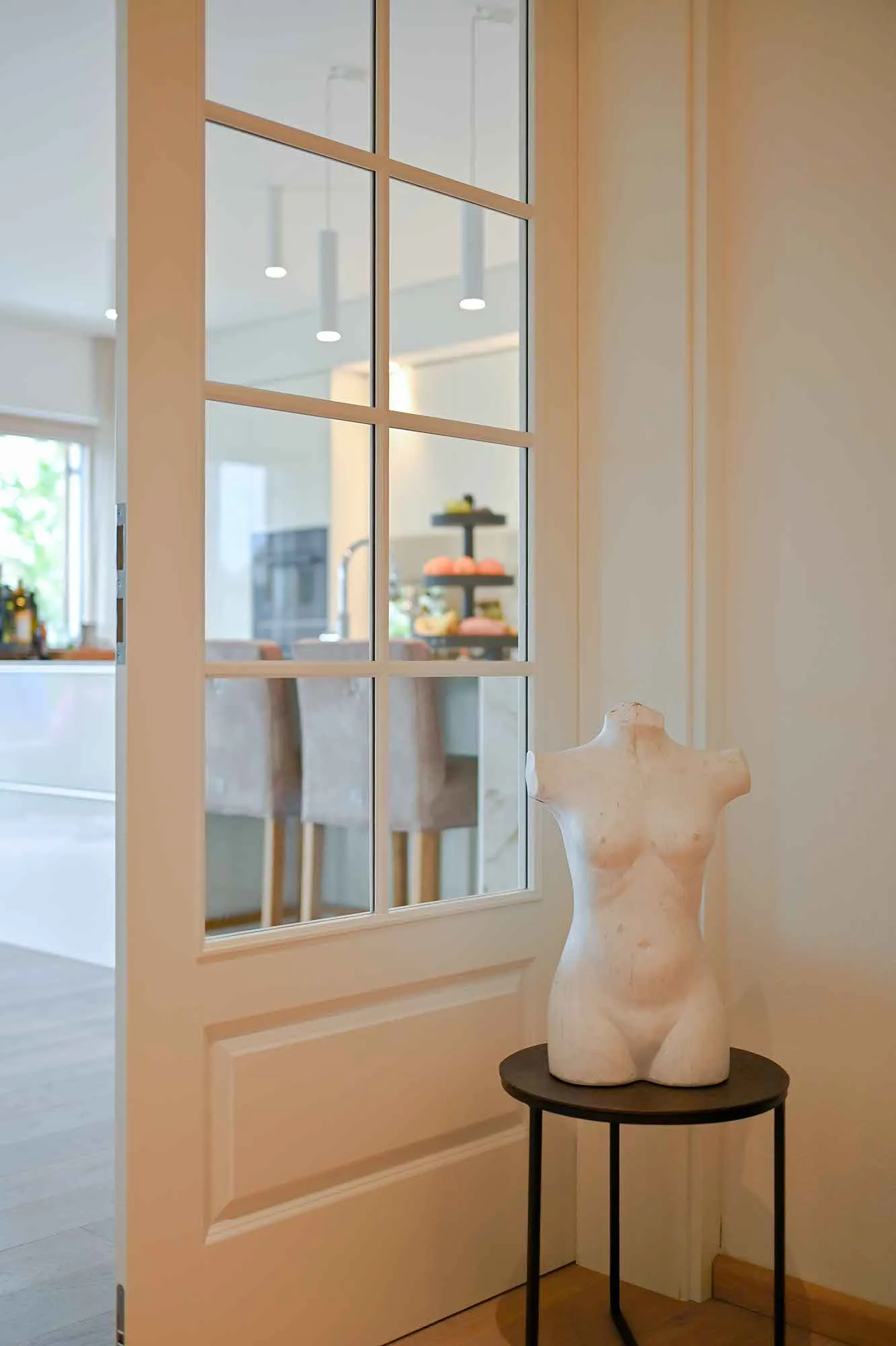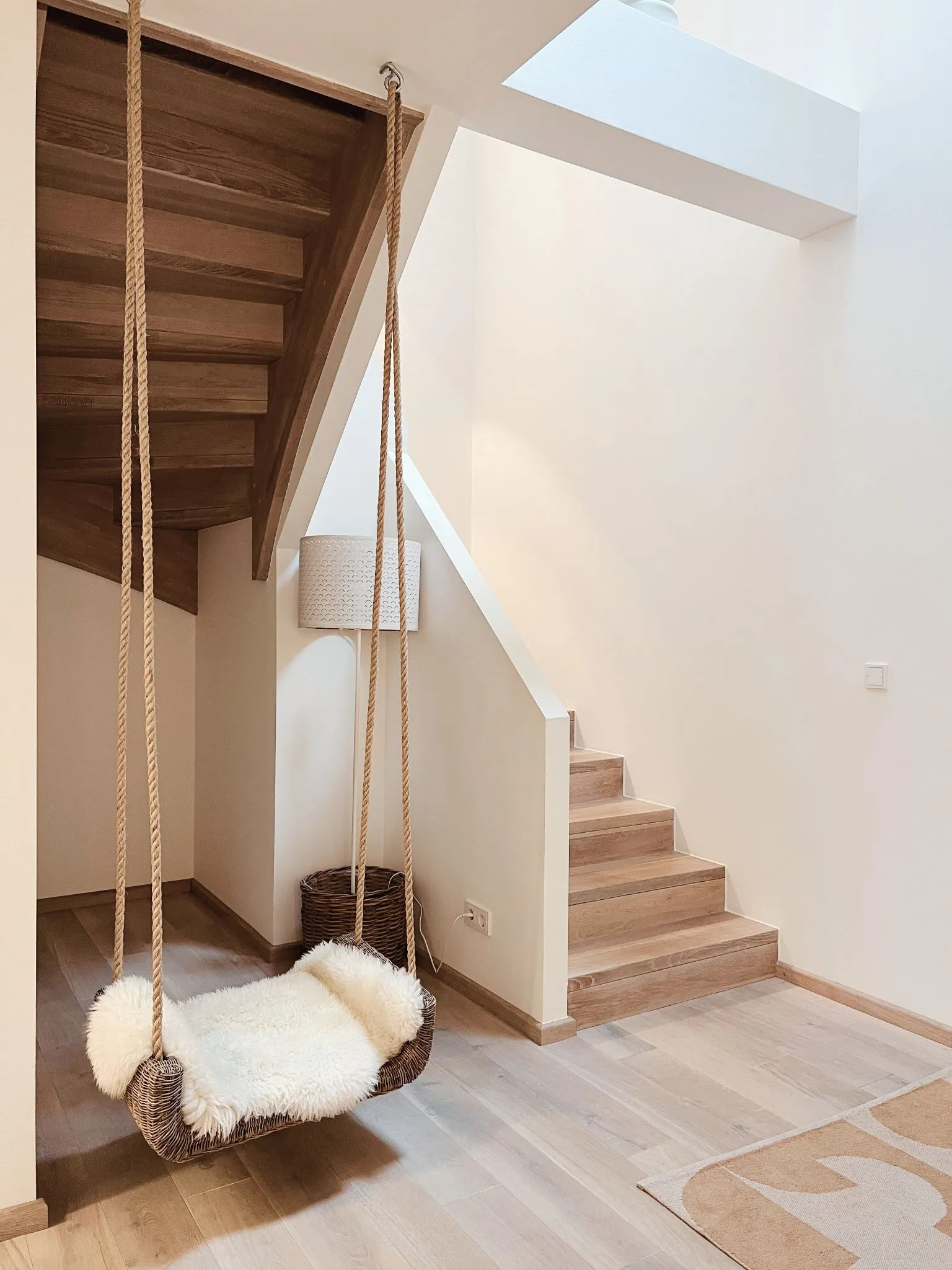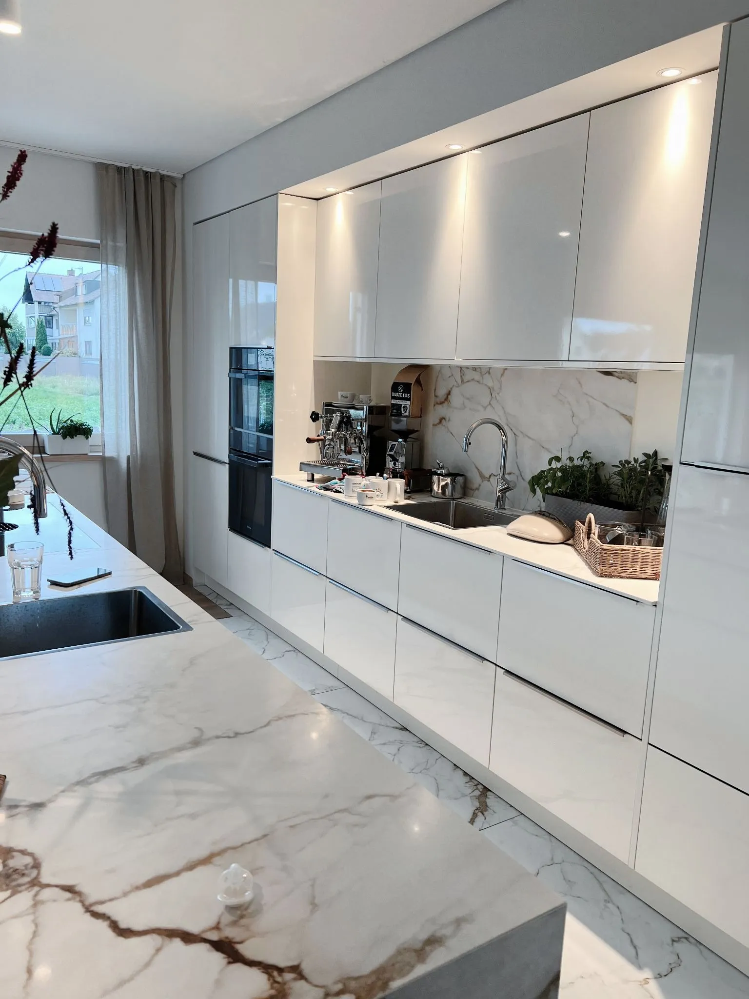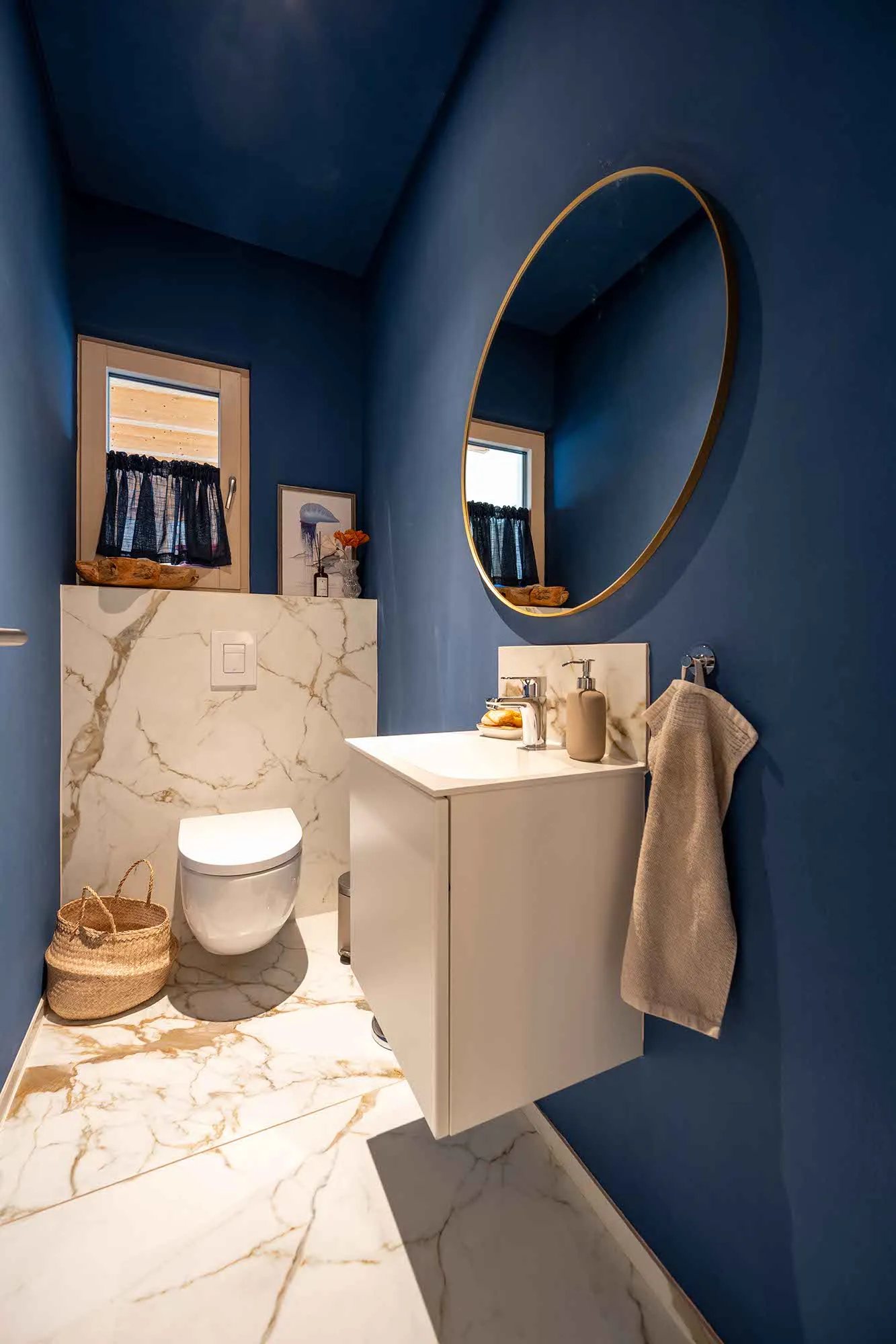 traditionelle, fränkische Bauweise mit Schleppgaube und Fensterläden; versteckter Durchgang in der Küchenfront zur Speisekammer; große Fliesenformate in Marmor-Optik; Mix aus puristischer Inneneinrichtung mit modernen Landhauselementen; mit Leistenschalung optisch abgesetztes Carport