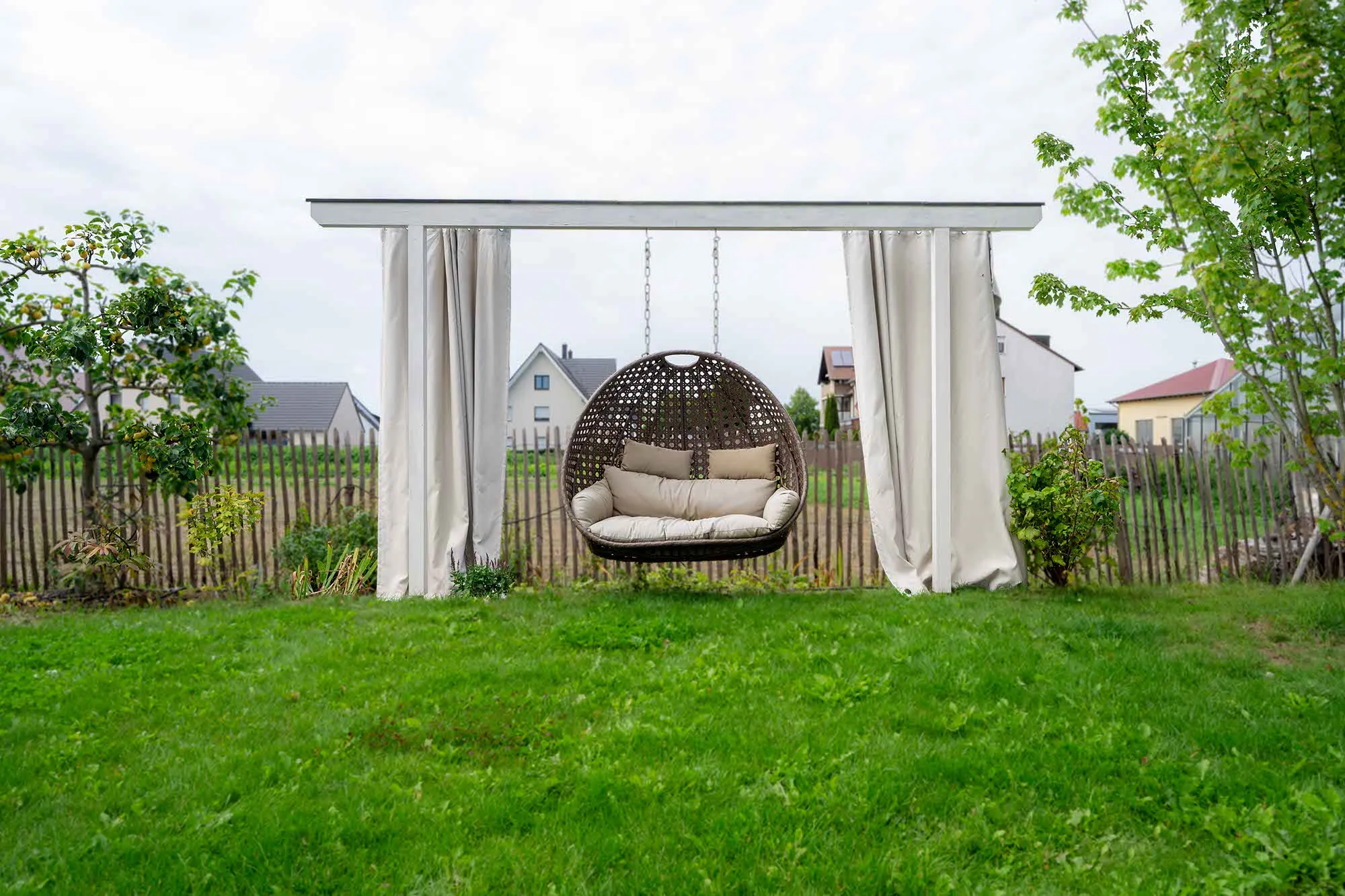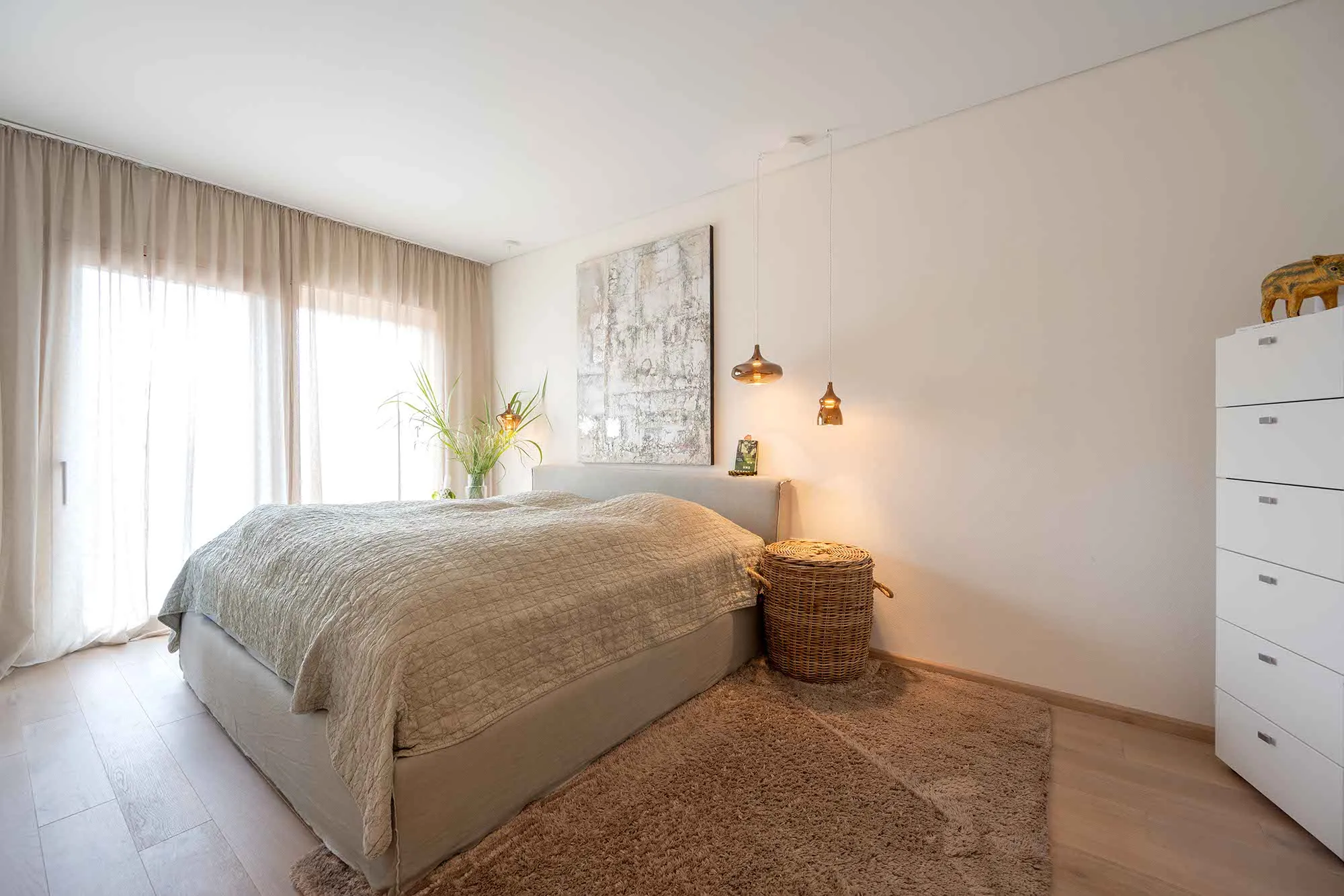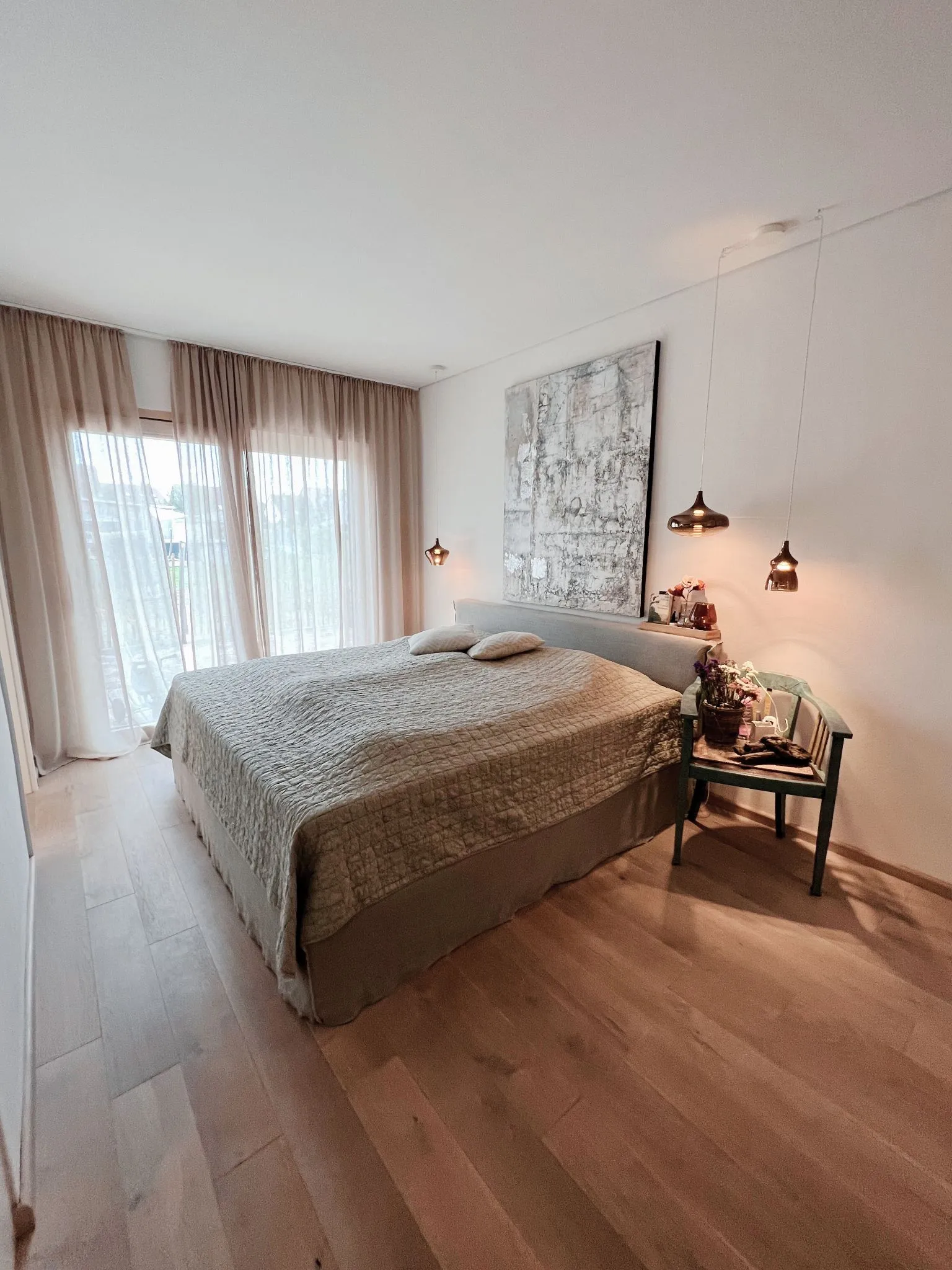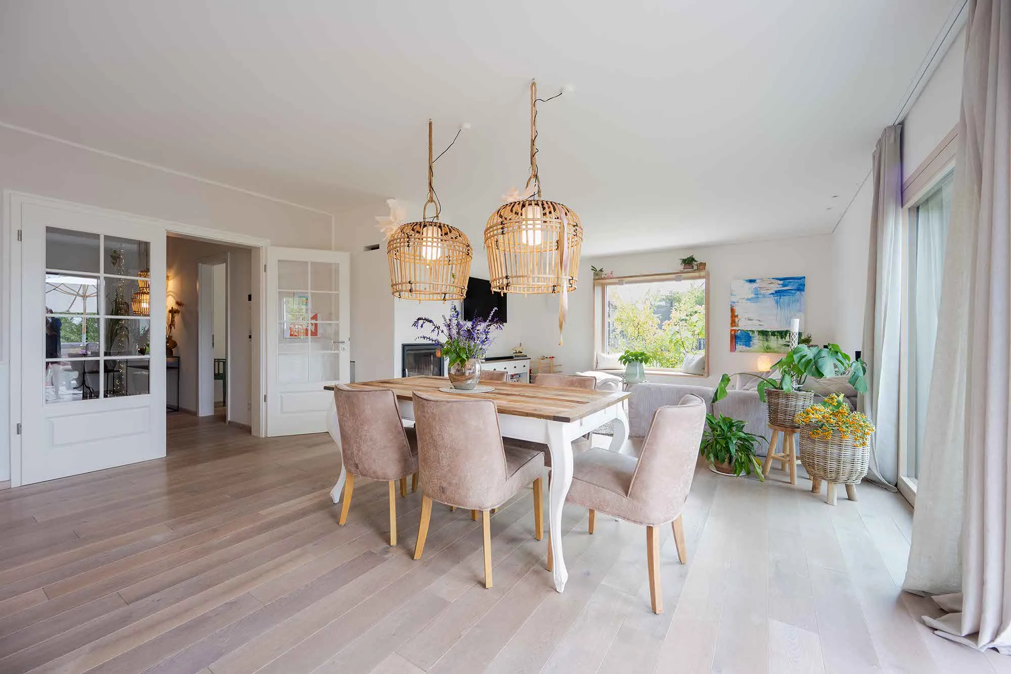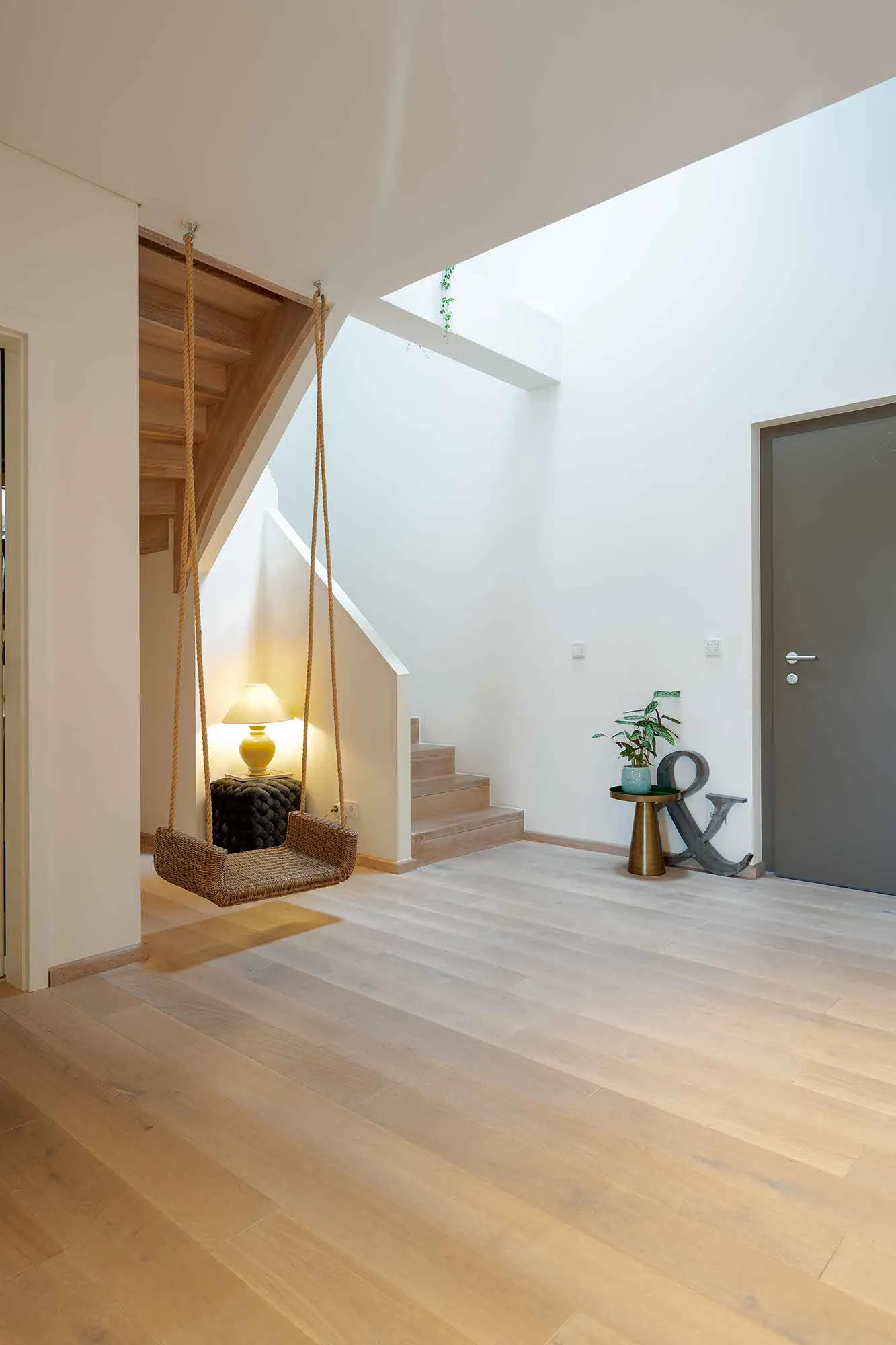 traditionelle, fränkische Bauweise mit Schleppgaube und Fensterläden; versteckter Durchgang in der Küchenfront zur Speisekammer; große Fliesenformate in Marmor-Optik; Mix aus puristischer Inneneinrichtung mit modernen Landhauselementen; mit Leistenschalung optisch abgesetztes Carport