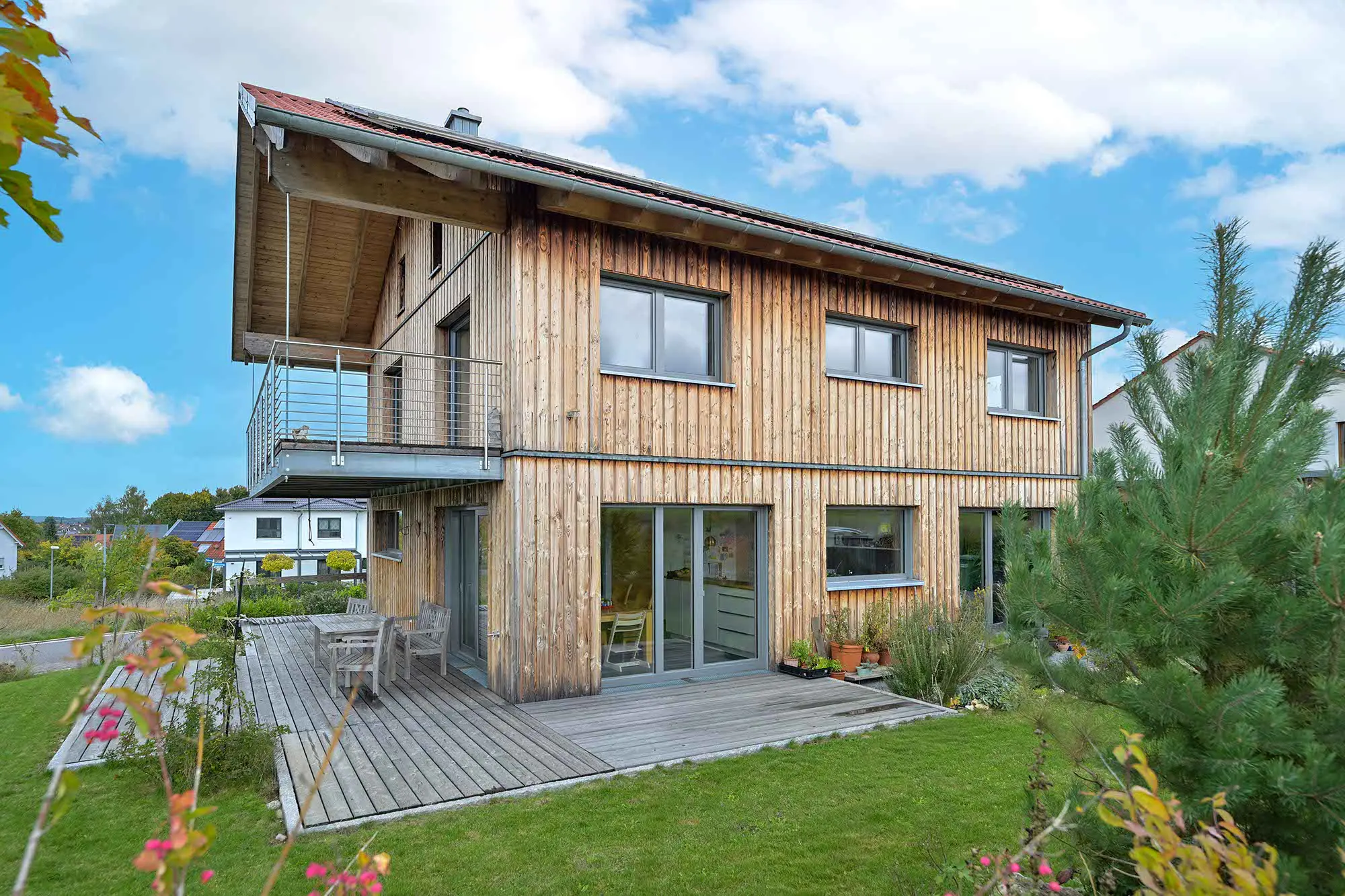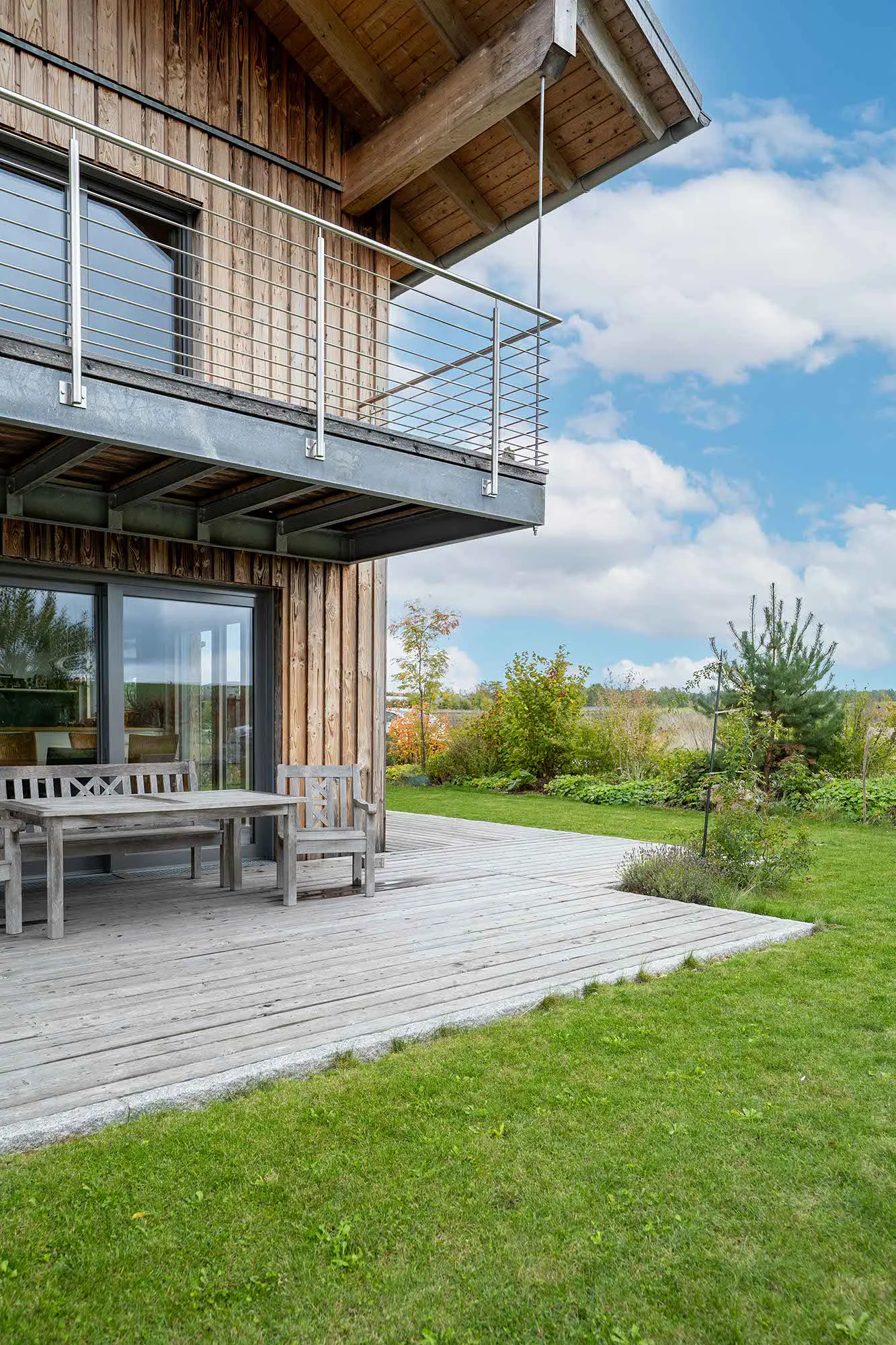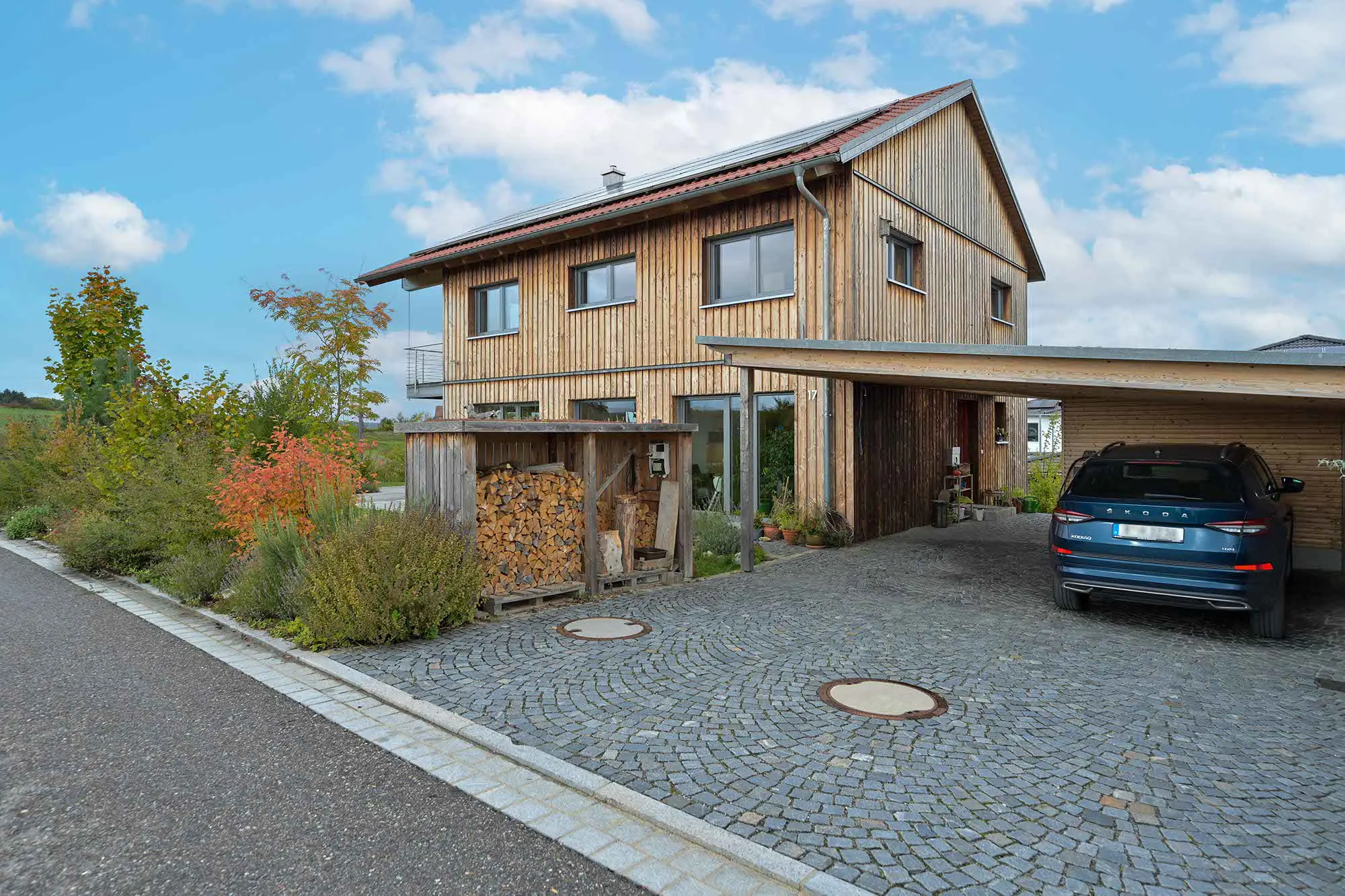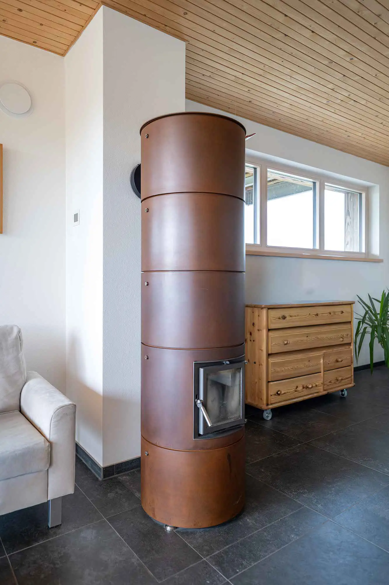 großer Balkon, Brettstapeldecke im EG, Wohnraumofen Rondolino