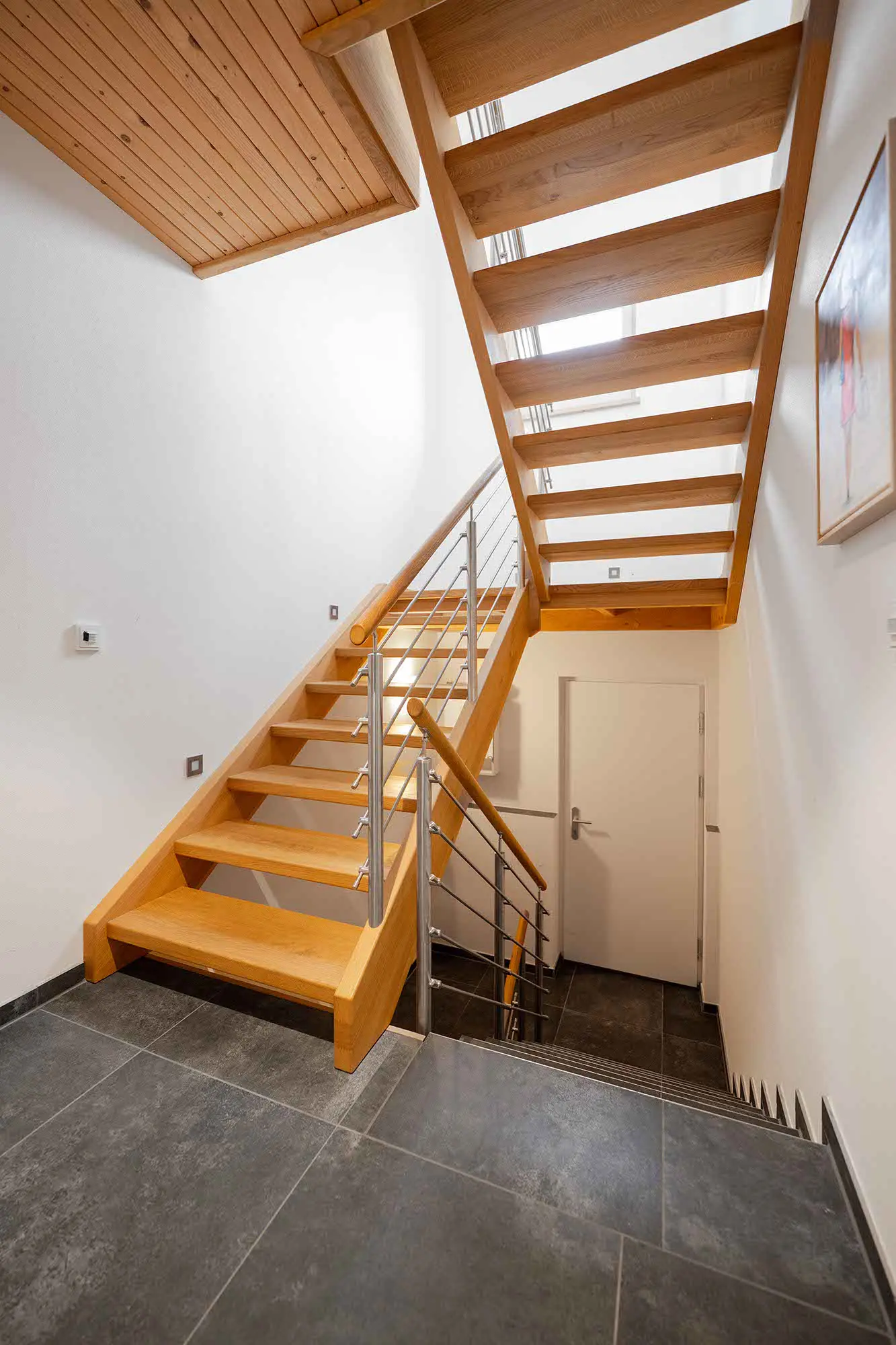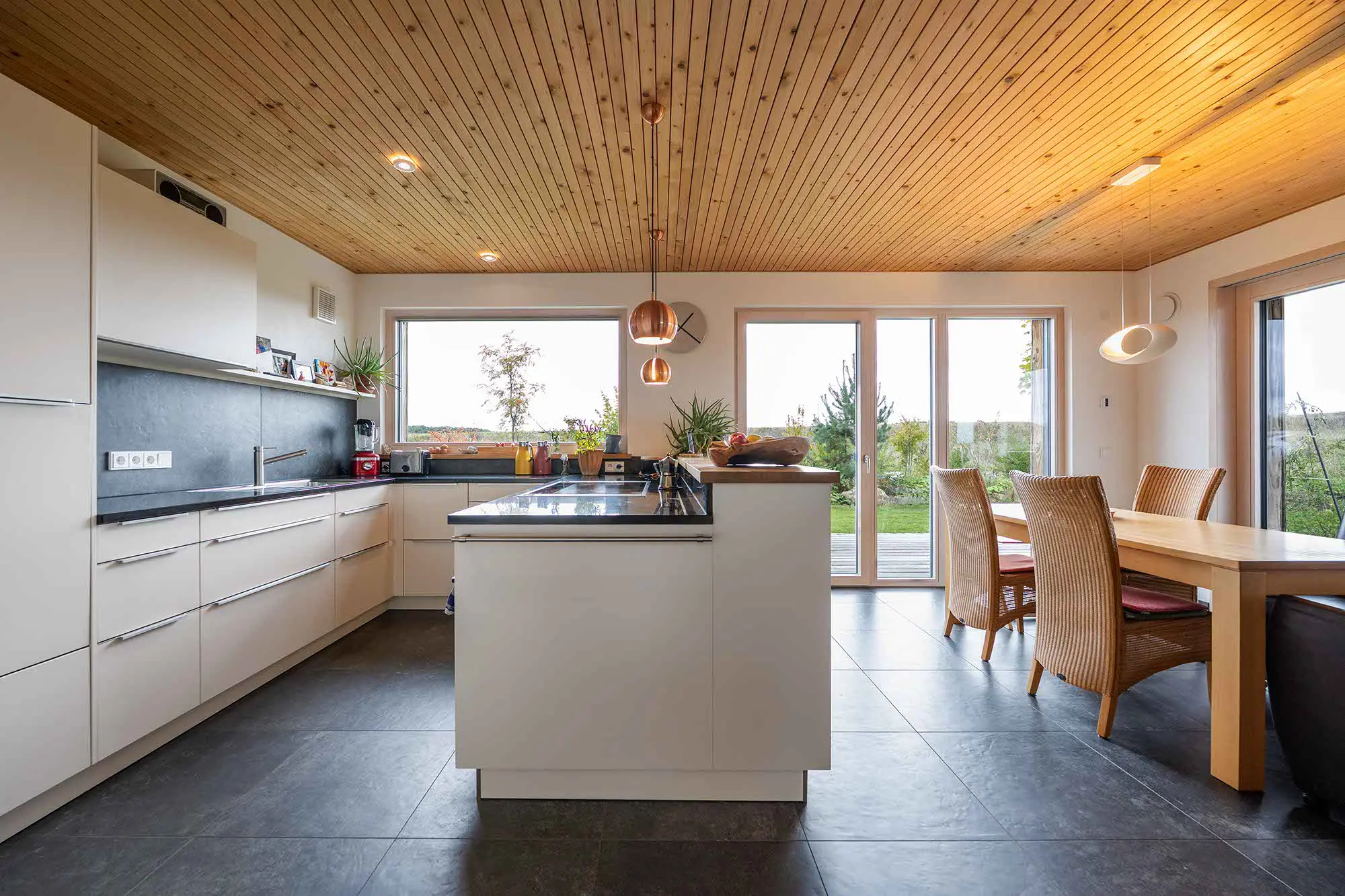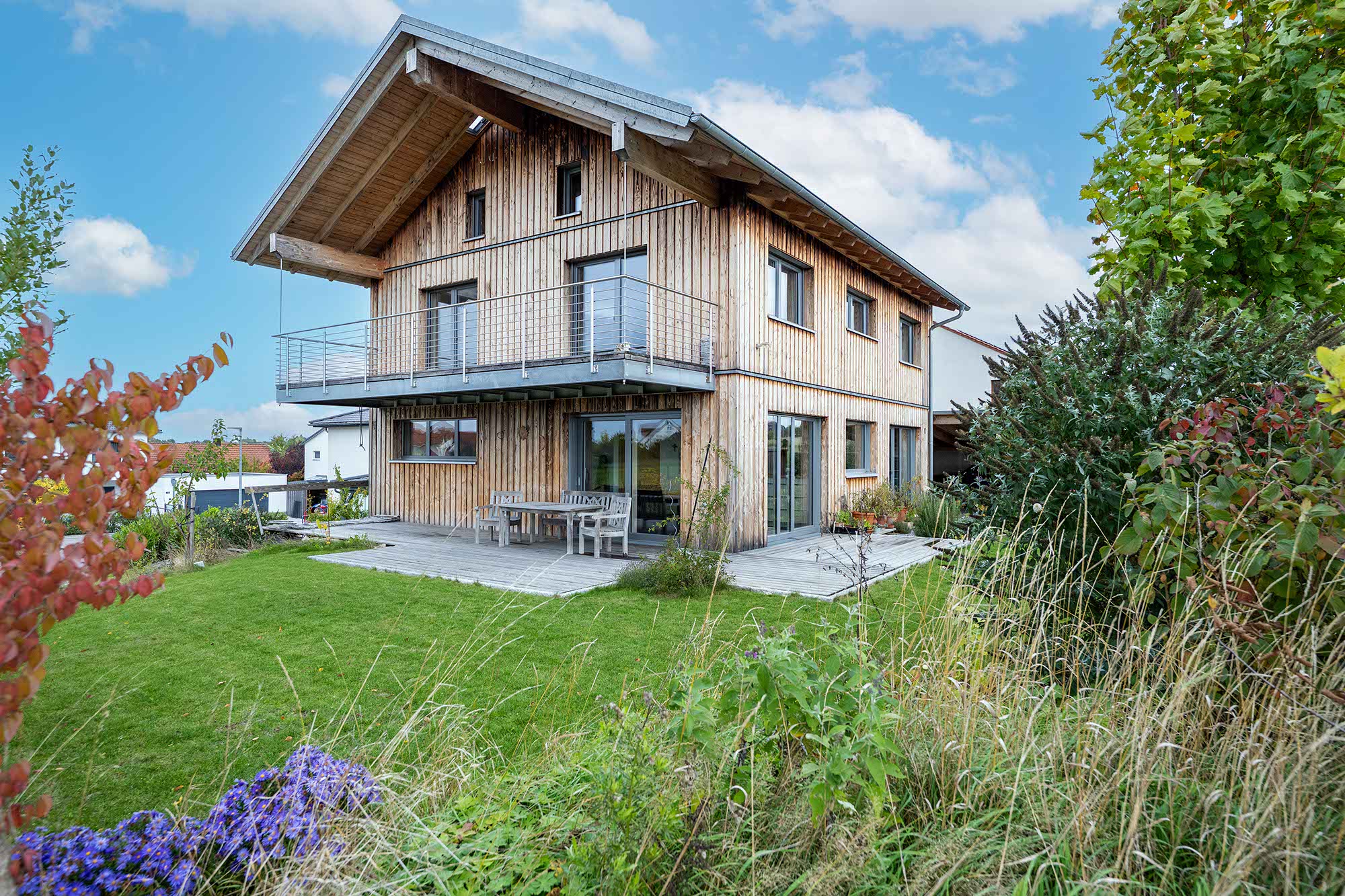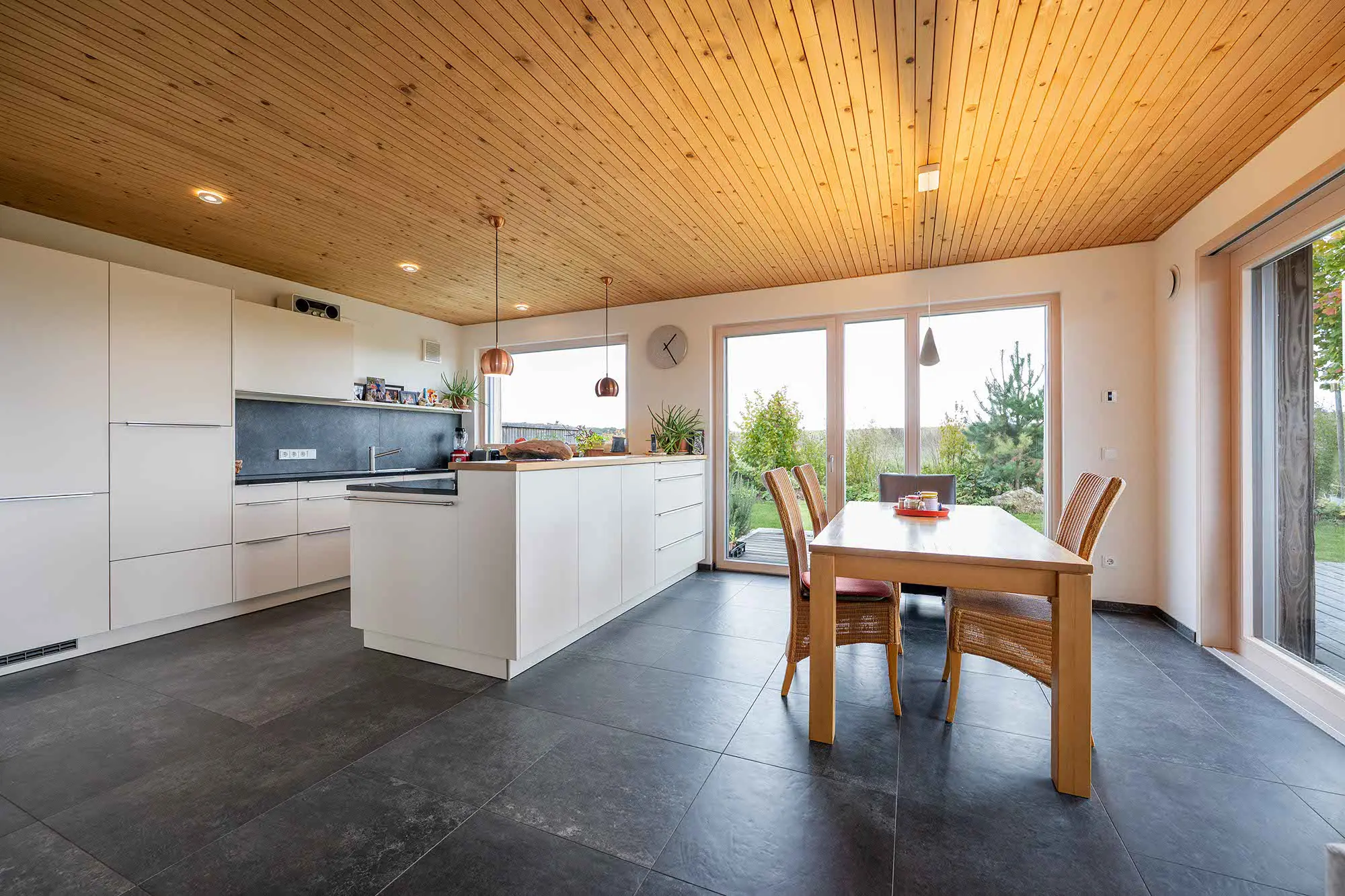 großer Balkon, Brettstapeldecke im EG, Wohnraumofen Rondolino