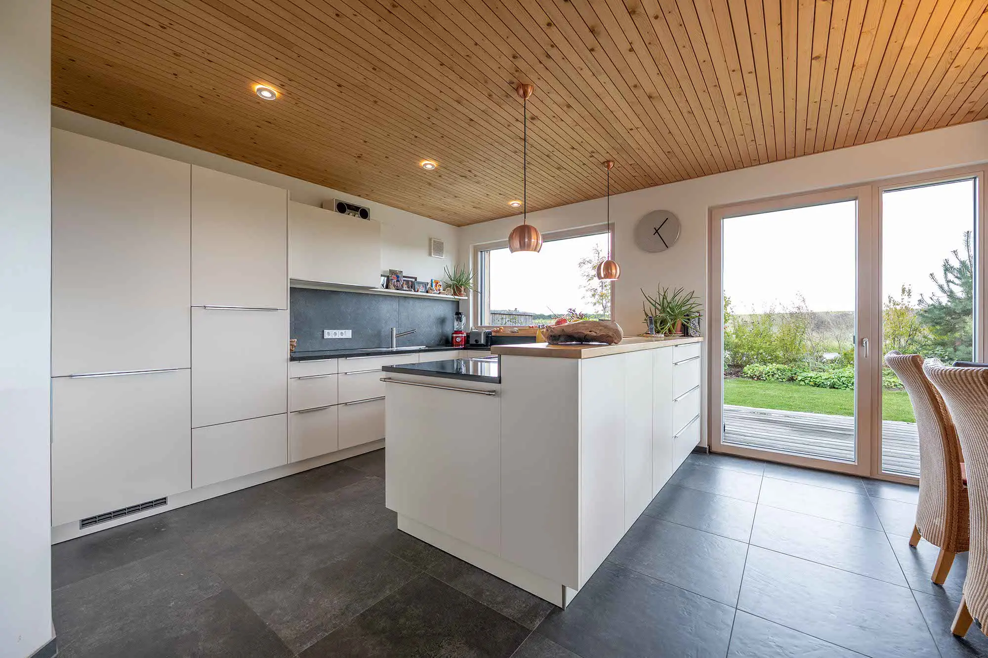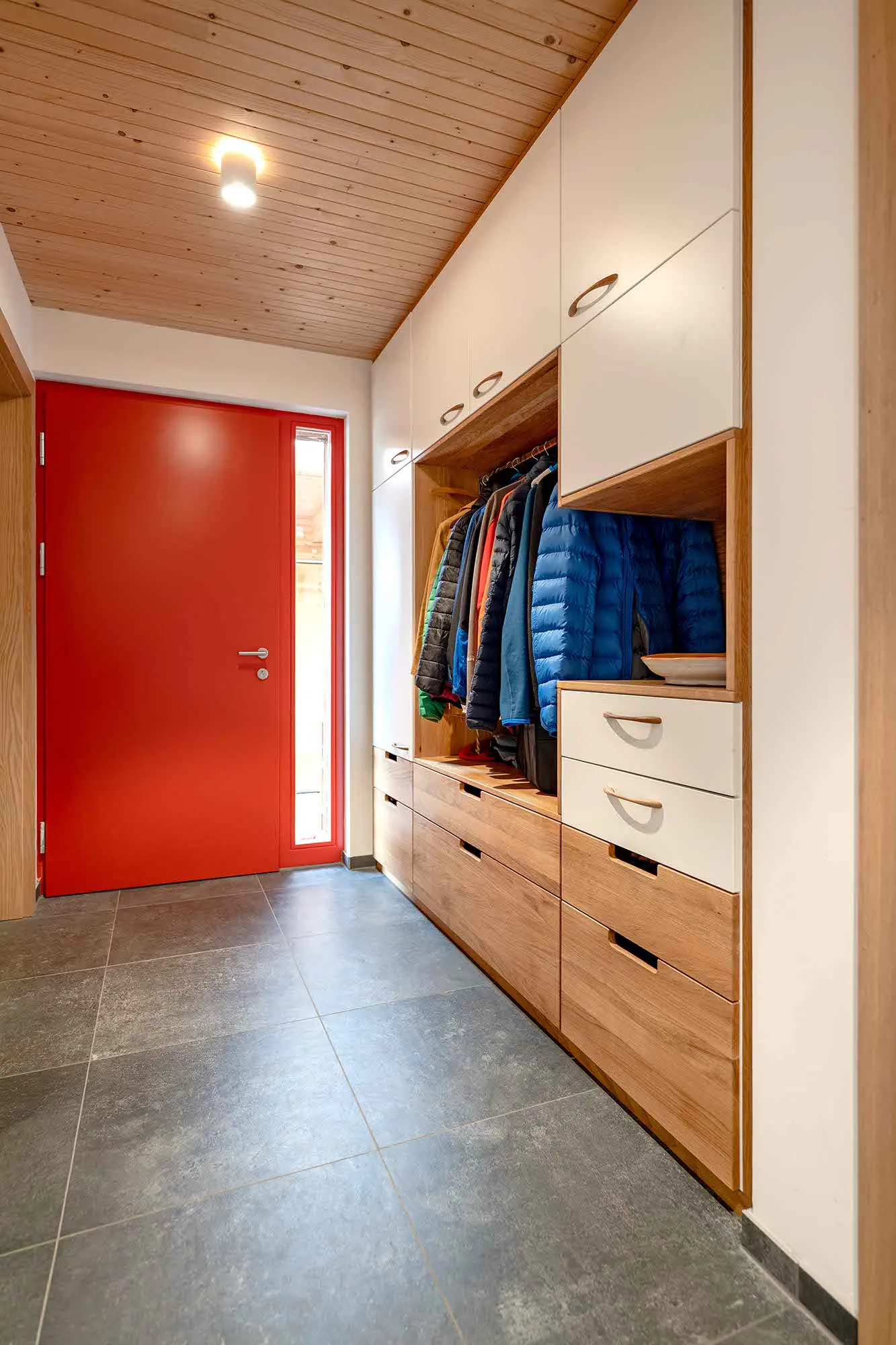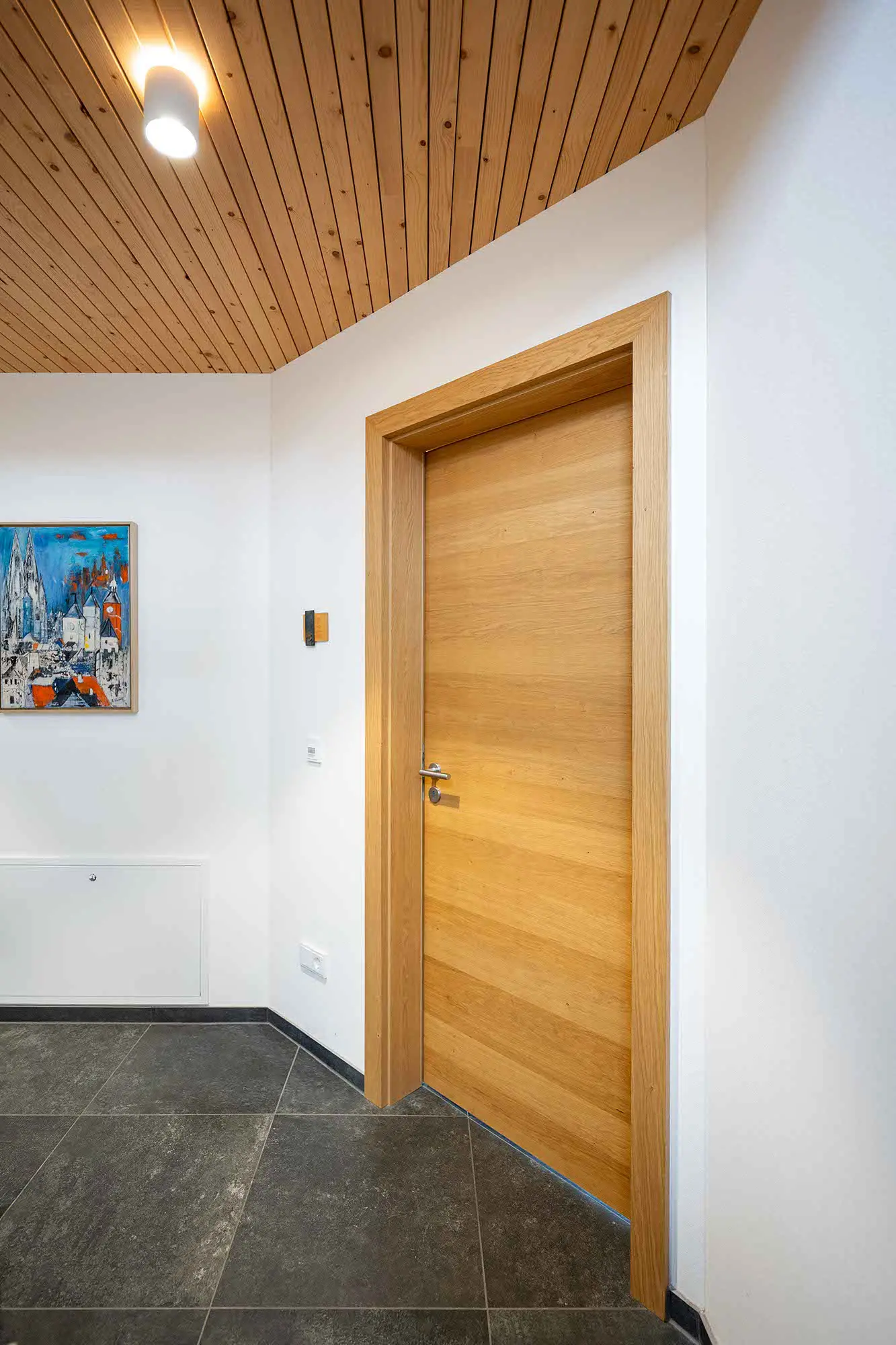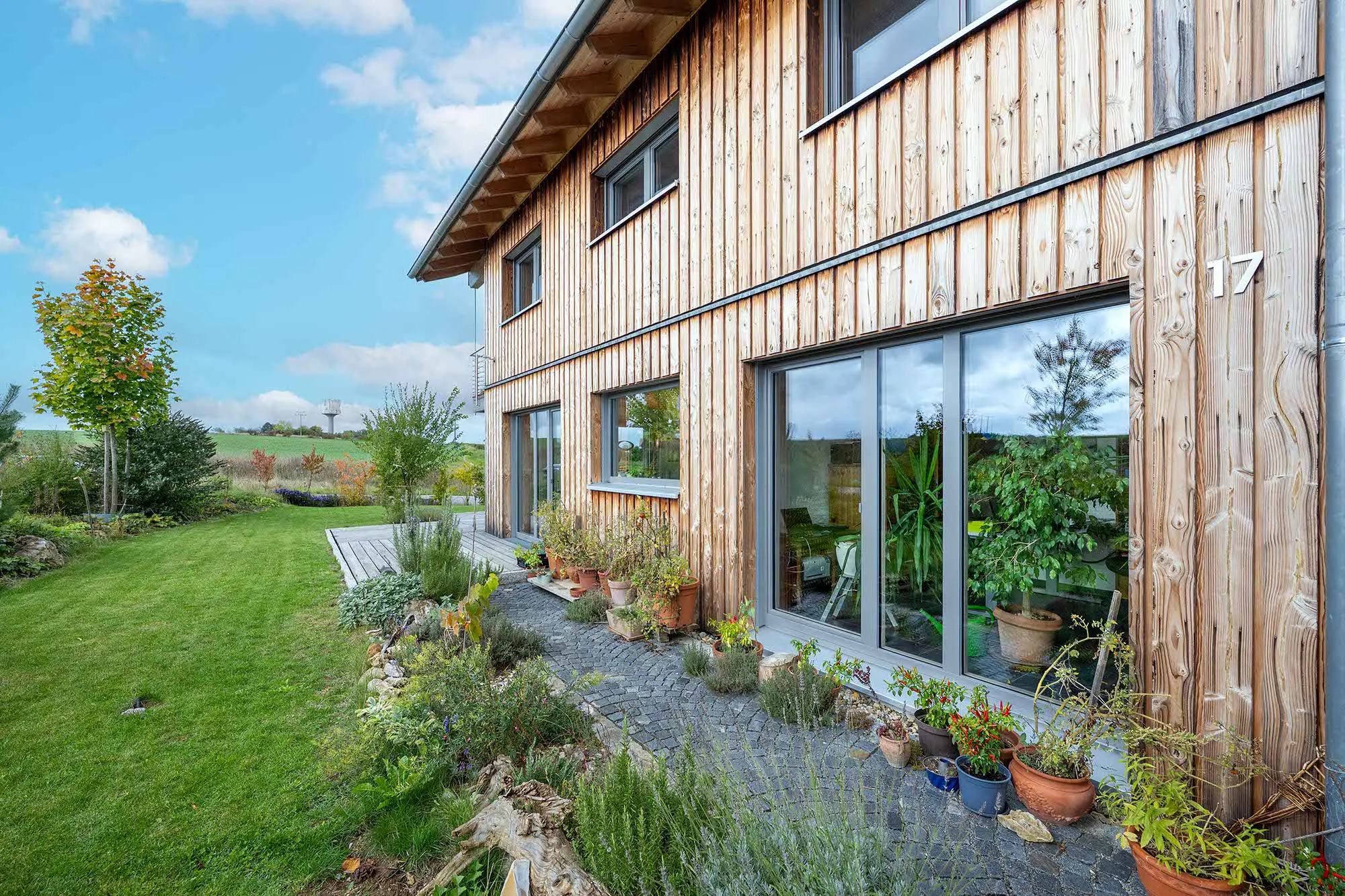 großer Balkon, Brettstapeldecke im EG, Wohnraumofen Rondolino