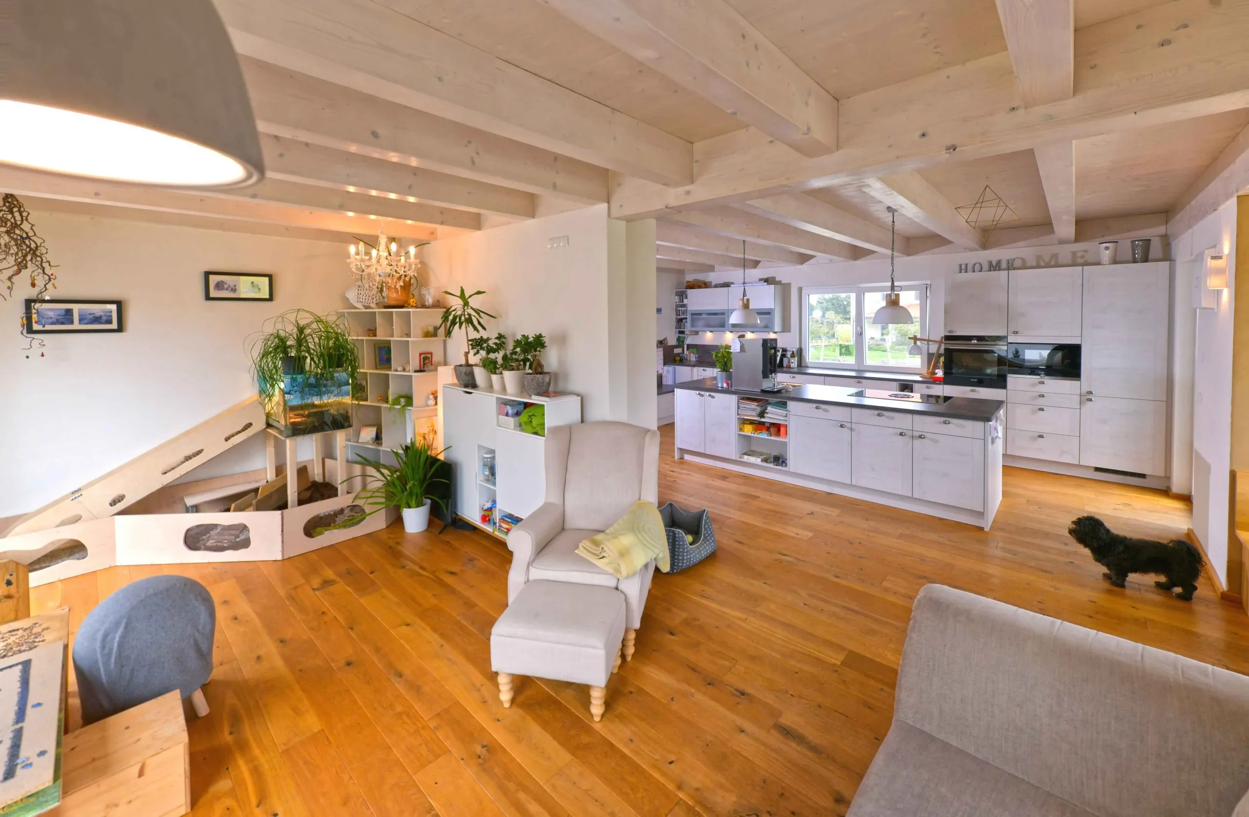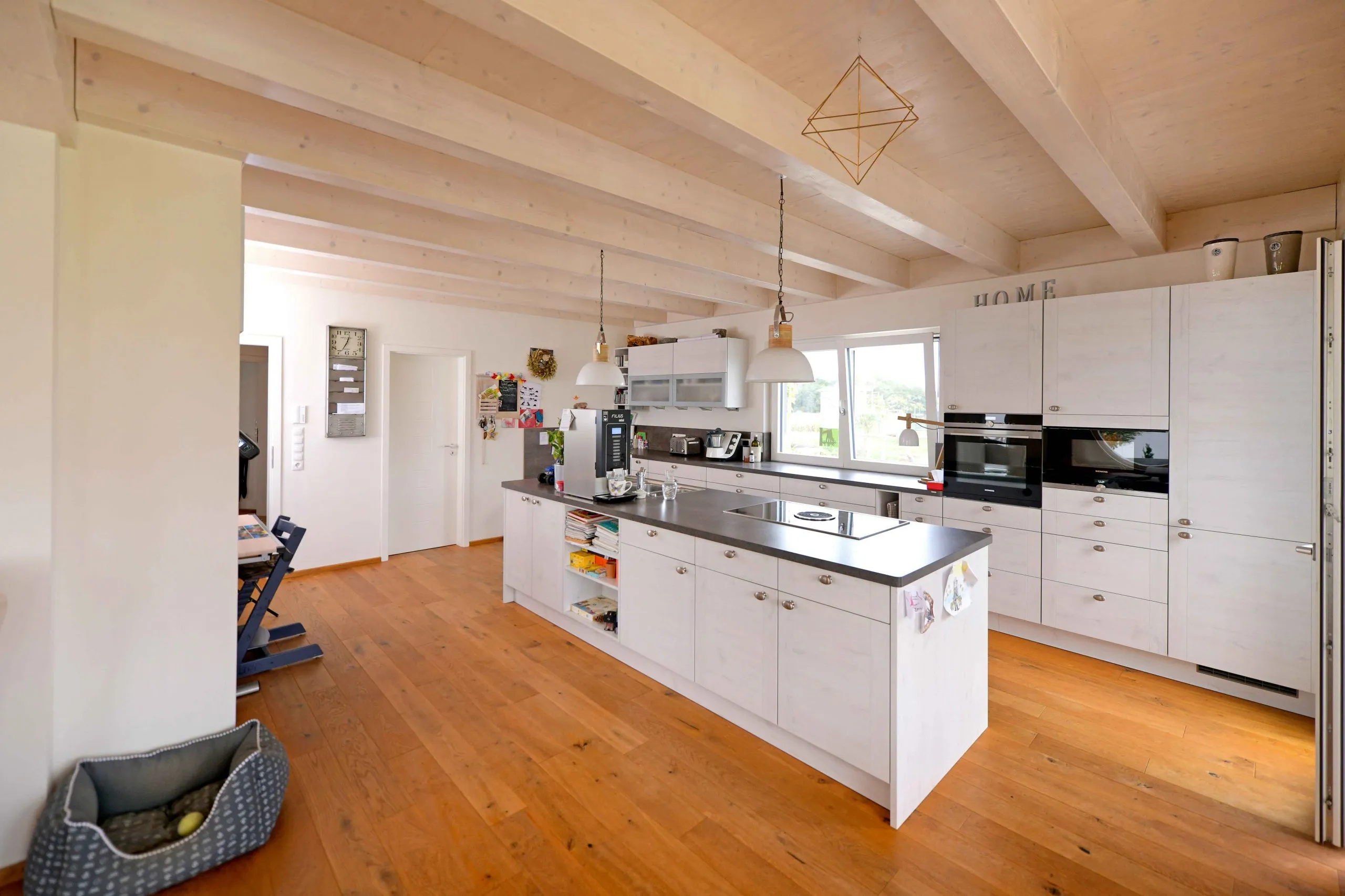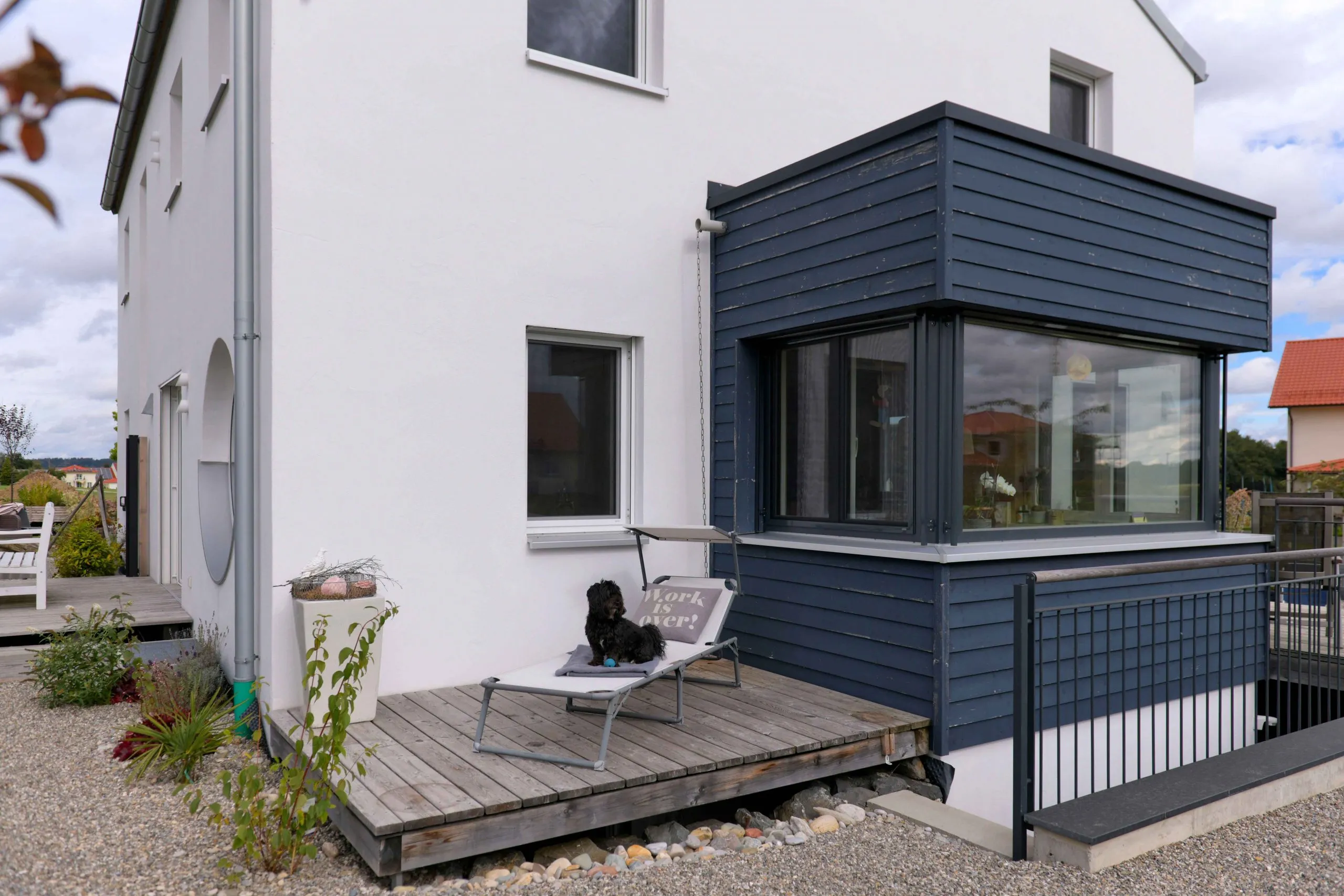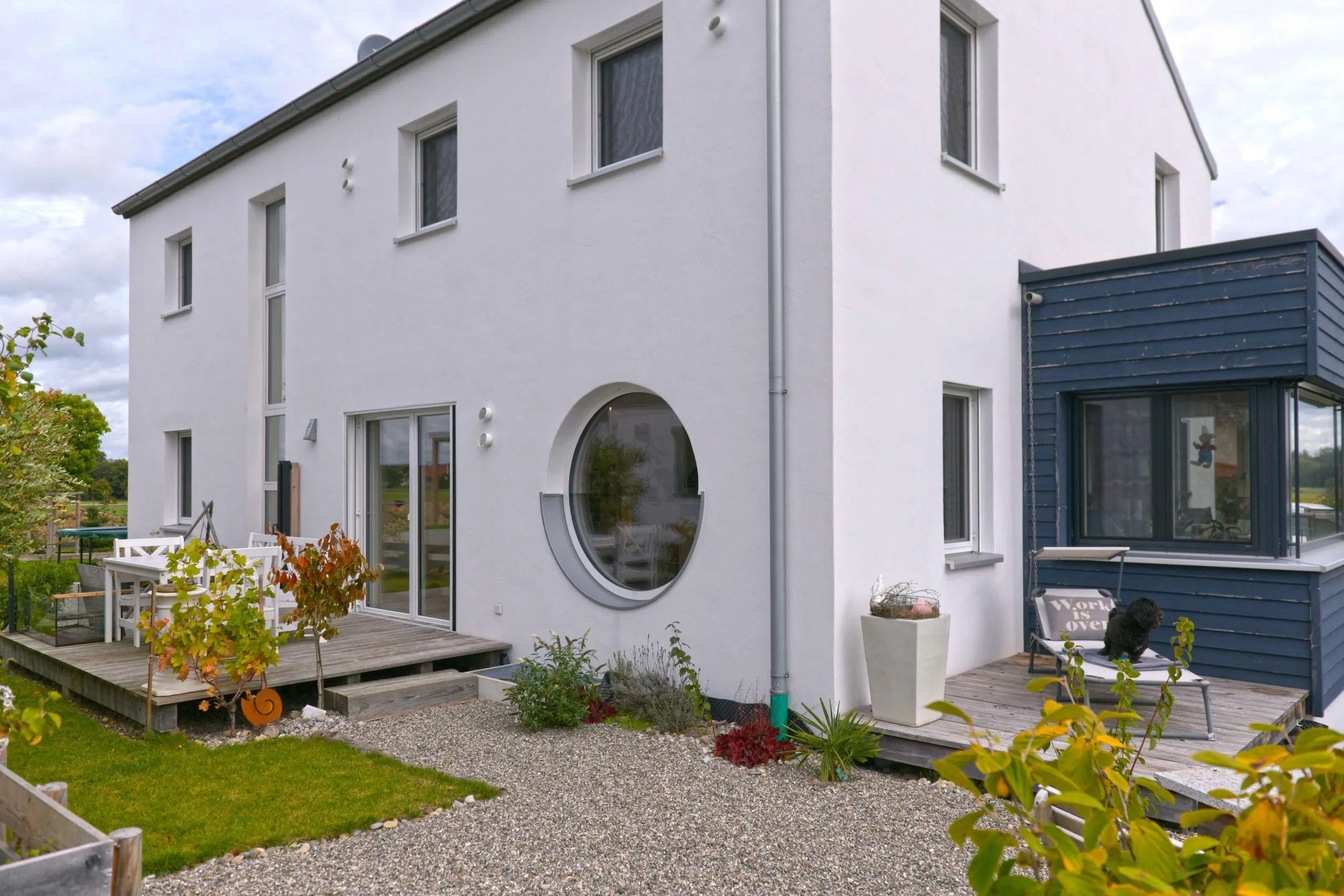 Einfamilienhaus mit Einliegerwohnung im Keller, mit Sichtdecke aus Dreischichtplatten, Erker mit blauer Holzfassade, rundes Fenster im Wohnbereich, Wandnischen