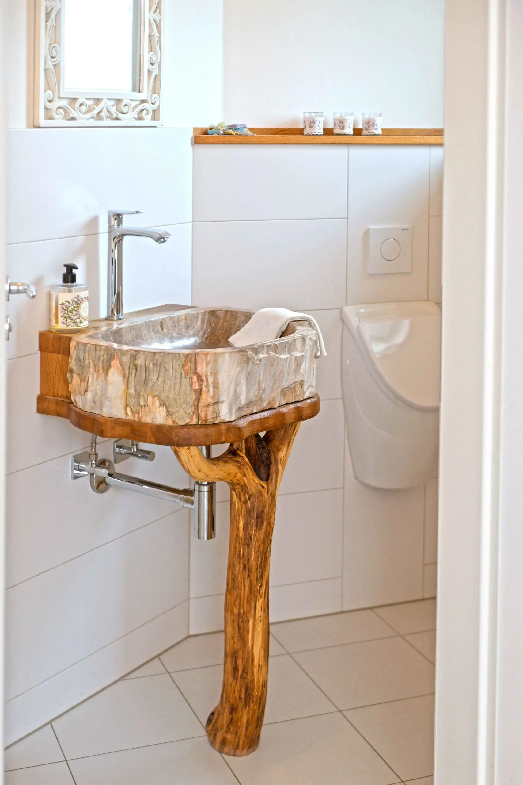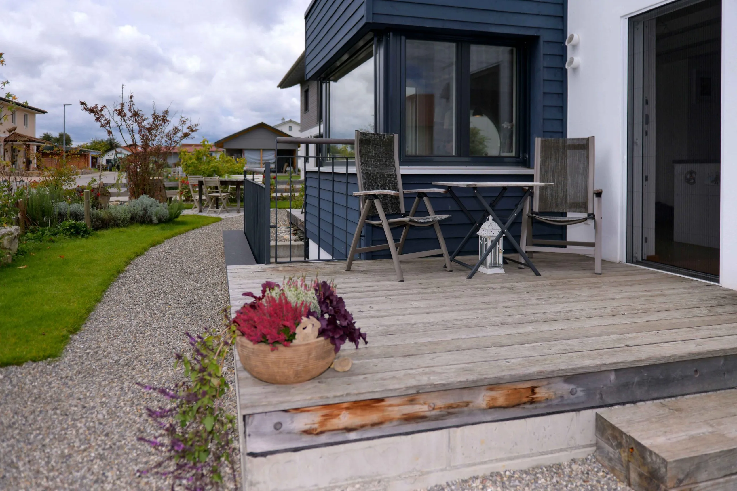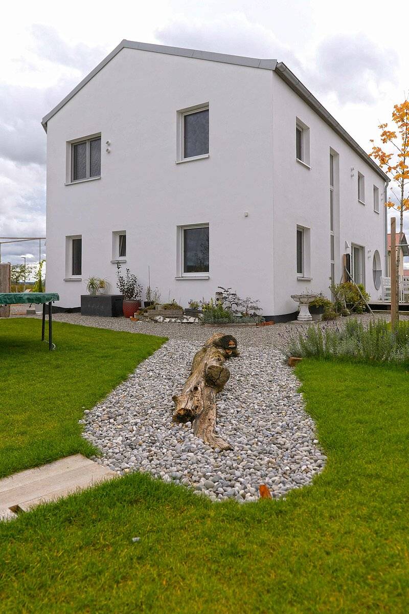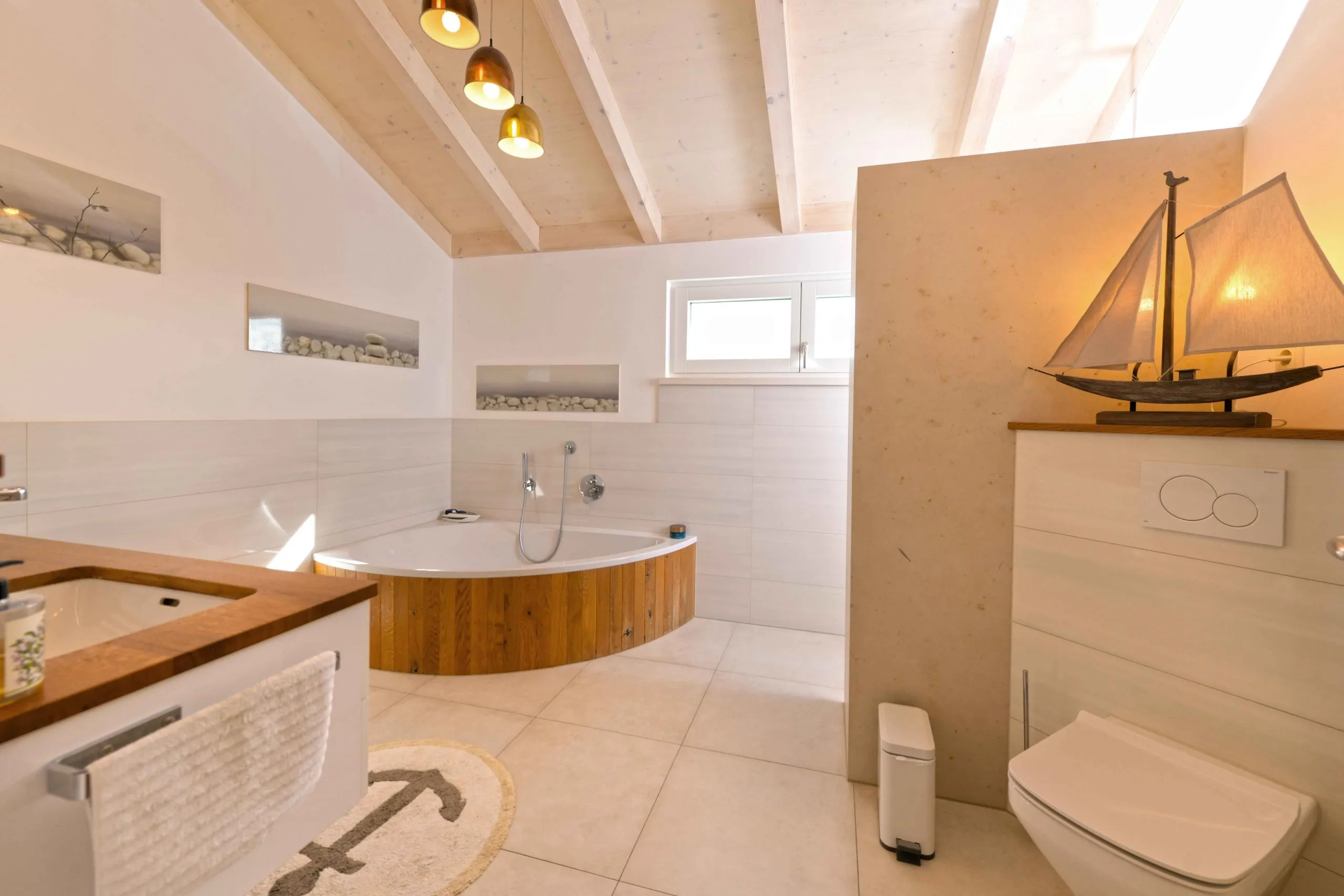 Einfamilienhaus mit Einliegerwohnung im Keller, mit Sichtdecke aus Dreischichtplatten, Erker mit blauer Holzfassade, rundes Fenster im Wohnbereich, Wandnischen