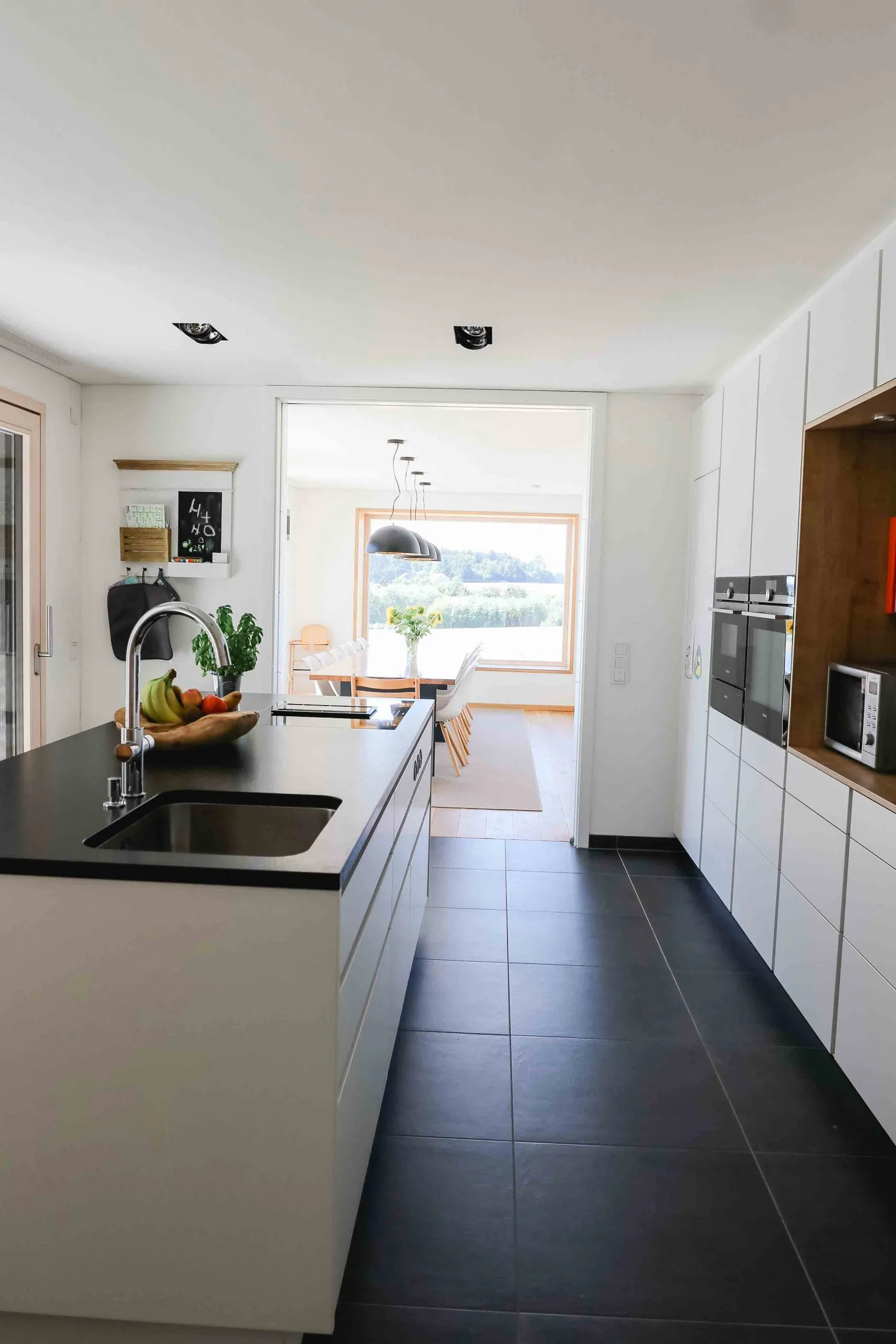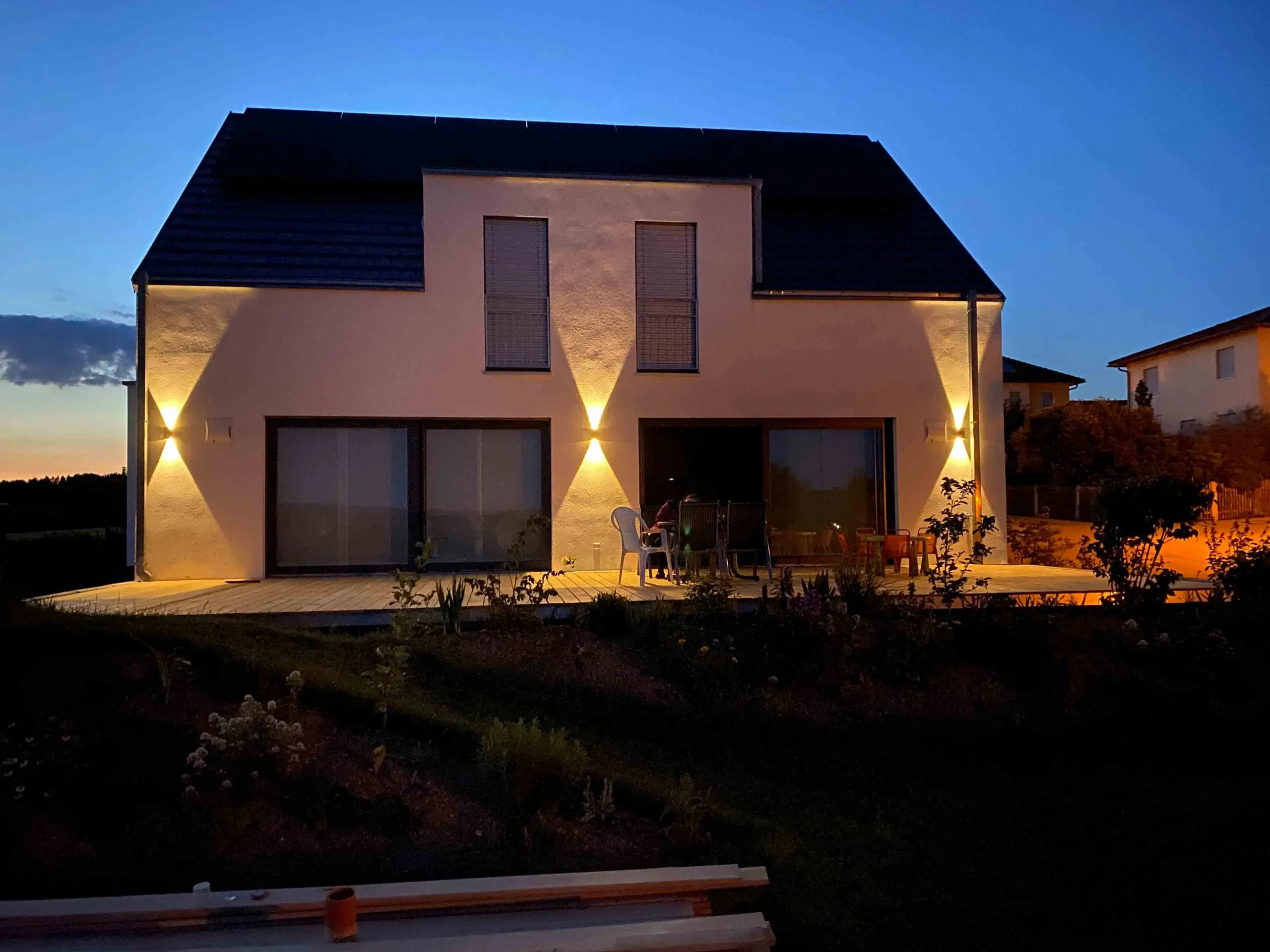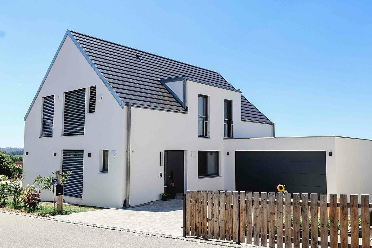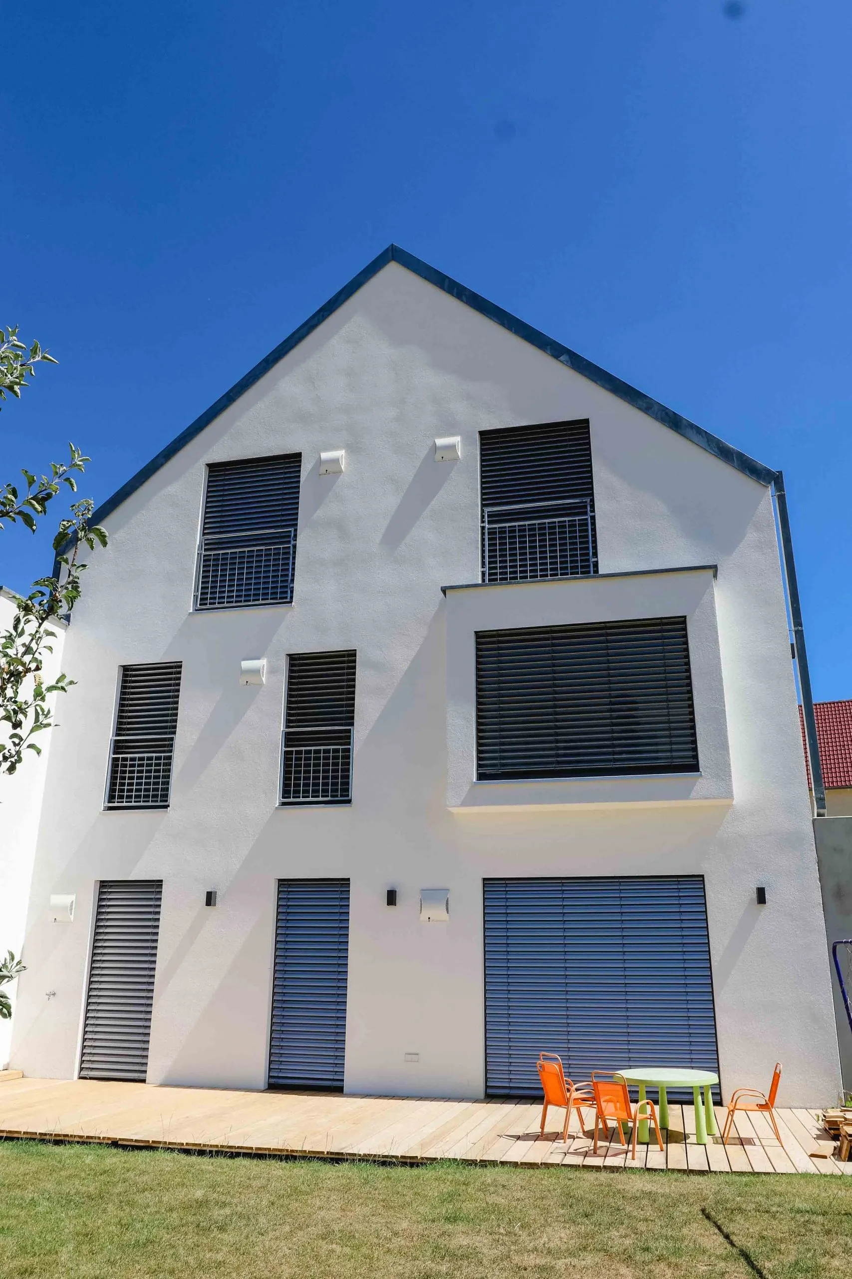 Schattenfuge, Wohnzimmer und Büro im Souterrain, große Küche, großer Essbereich, puristische Architektur und Einrichtung mit organischen Akzenten, Spielflur im Obergeschoss für die Kinder, Einbauschränke zur optimalen Platznutzung, Aufgesattelte Faltwerktreppe mit geschlossenem Geländer umlaufenden von OG bis KG, Schleppgauben mit Flachdachabdichtung, Garagenflachdach mit Begrünung, Zisterne für Regenwasser, zur Versickerung des Regenwassers auf dem eigenen Grundstück, Photovoltaik mit Stromspeicher