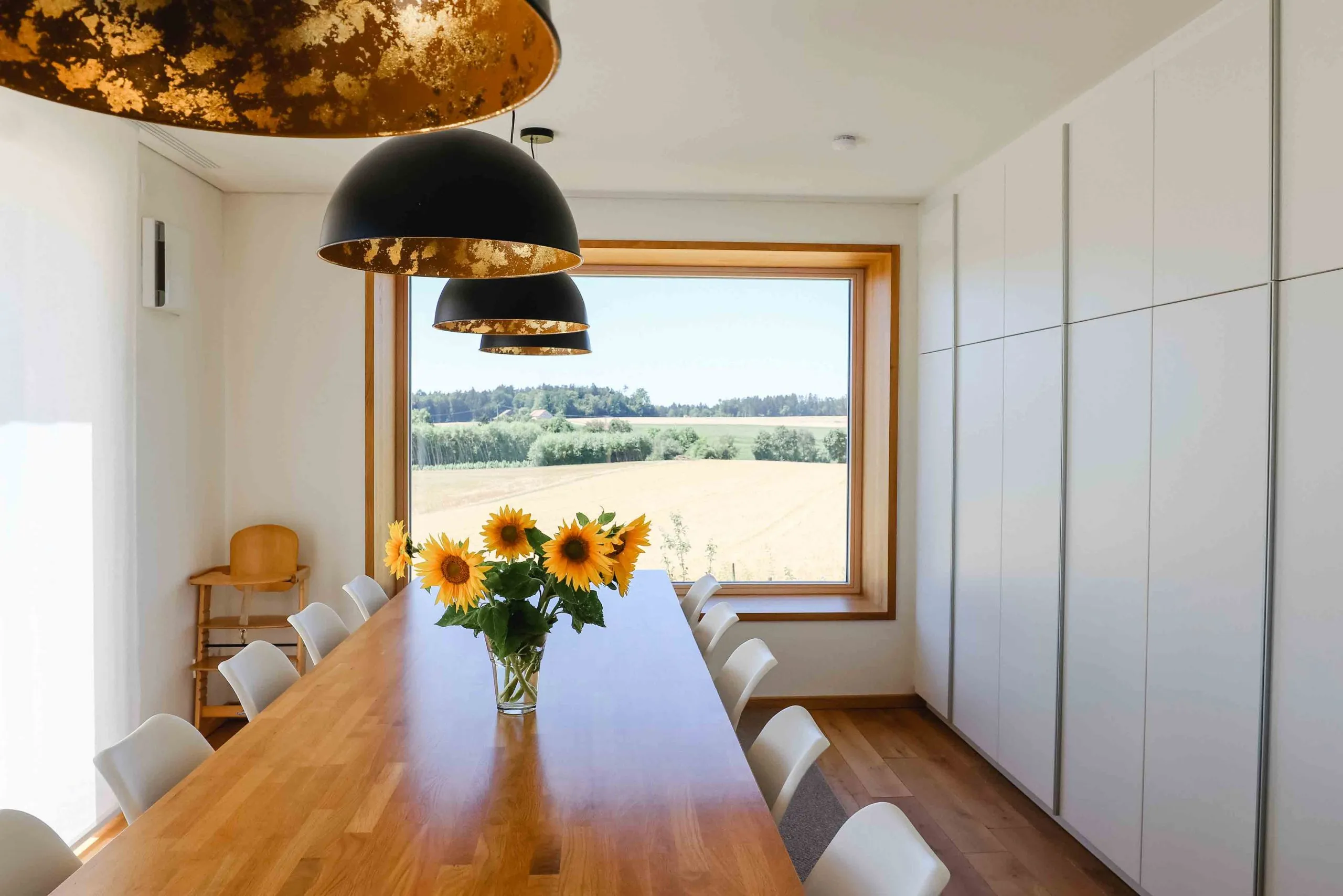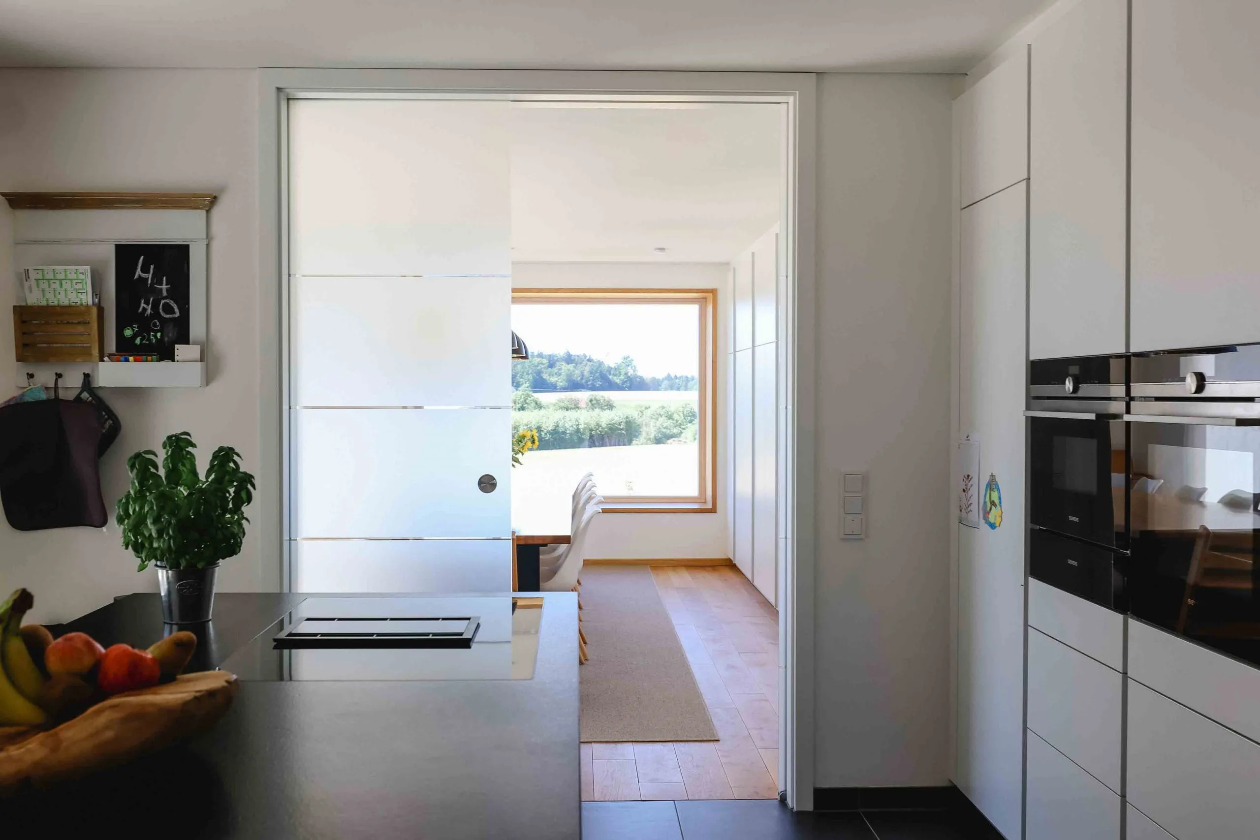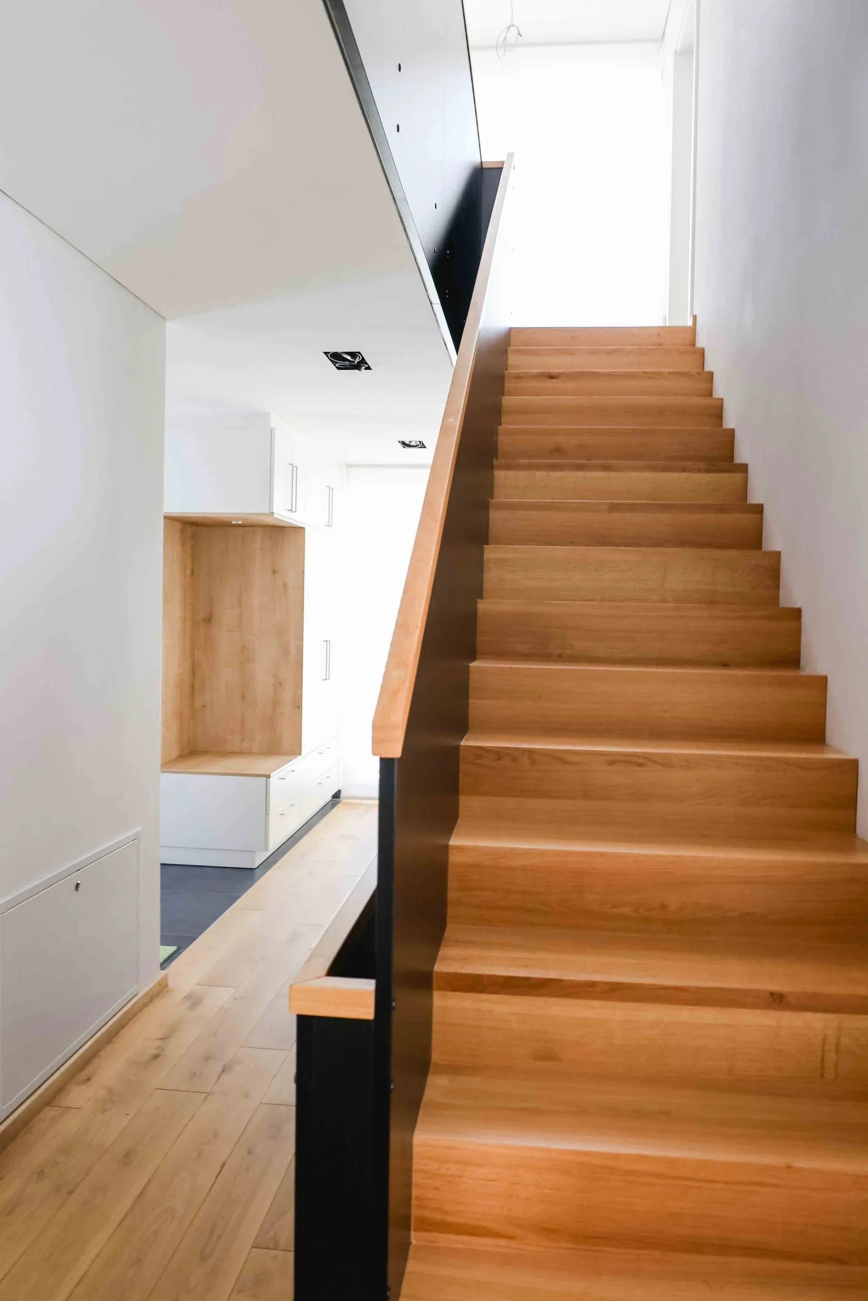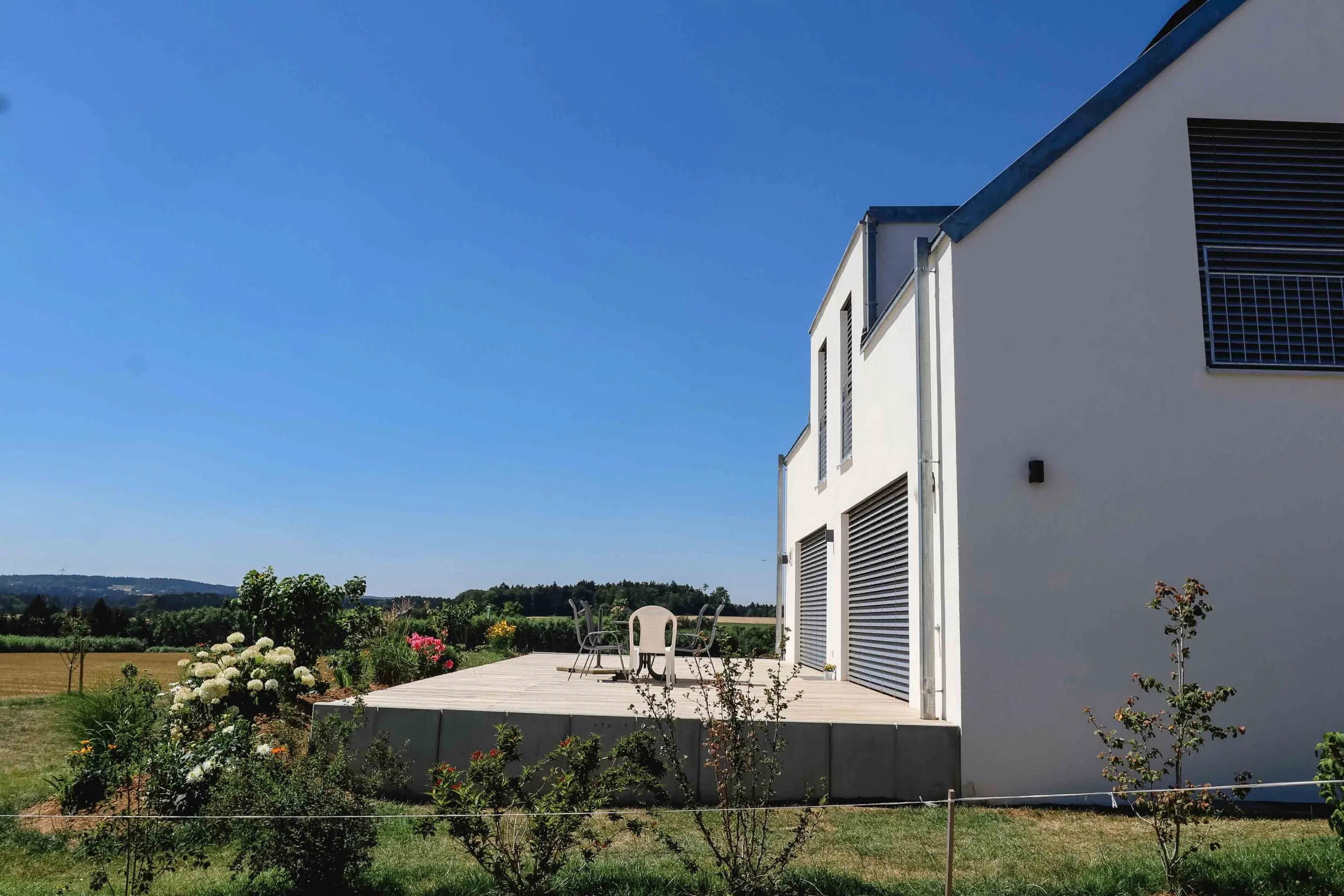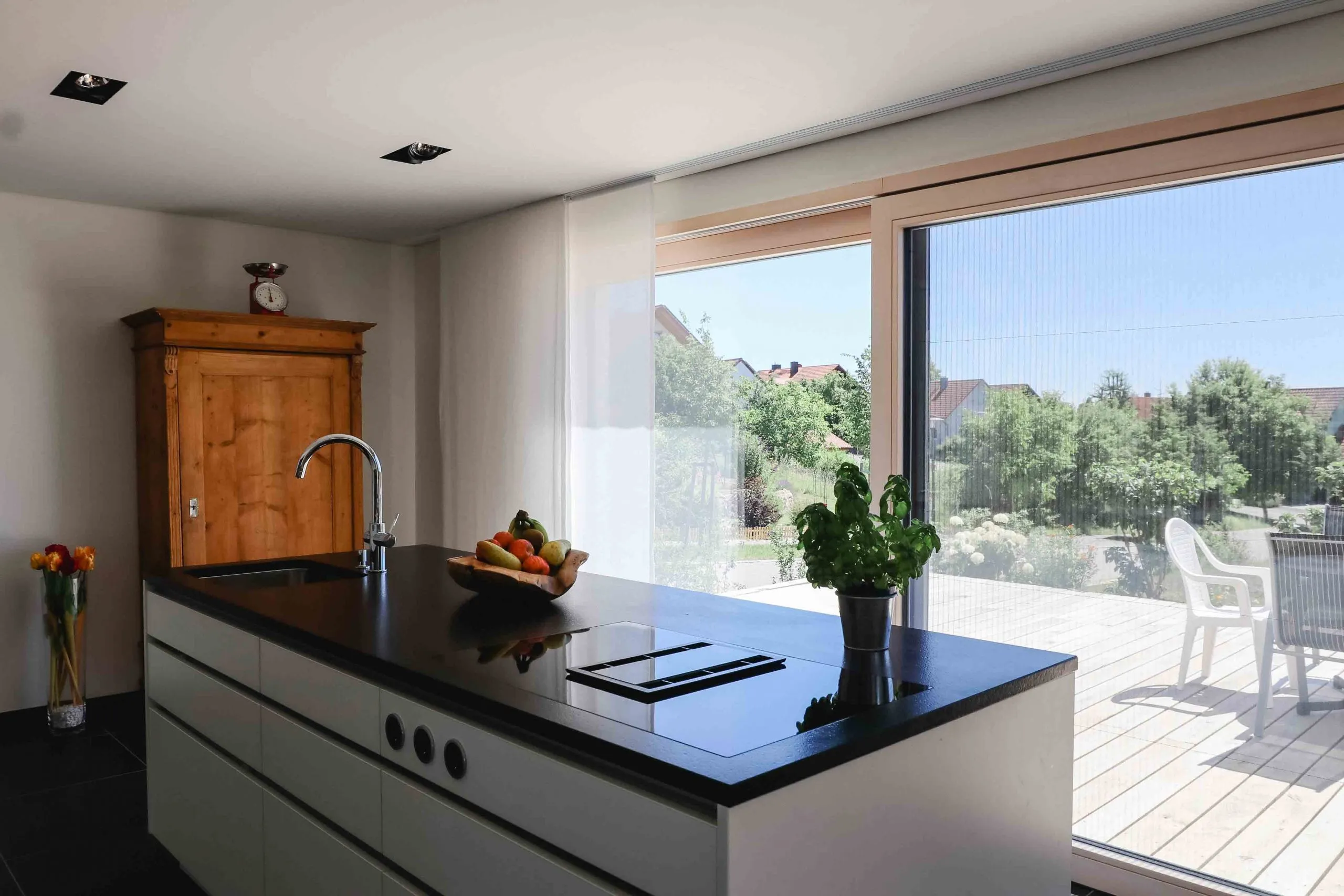 Schattenfuge, Wohnzimmer und Büro im Souterrain, große Küche, großer Essbereich, puristische Architektur und Einrichtung mit organischen Akzenten, Spielflur im Obergeschoss für die Kinder, Einbauschränke zur optimalen Platznutzung, Aufgesattelte Faltwerktreppe mit geschlossenem Geländer umlaufenden von OG bis KG, Schleppgauben mit Flachdachabdichtung, Garagenflachdach mit Begrünung, Zisterne für Regenwasser, zur Versickerung des Regenwassers auf dem eigenen Grundstück, Photovoltaik mit Stromspeicher