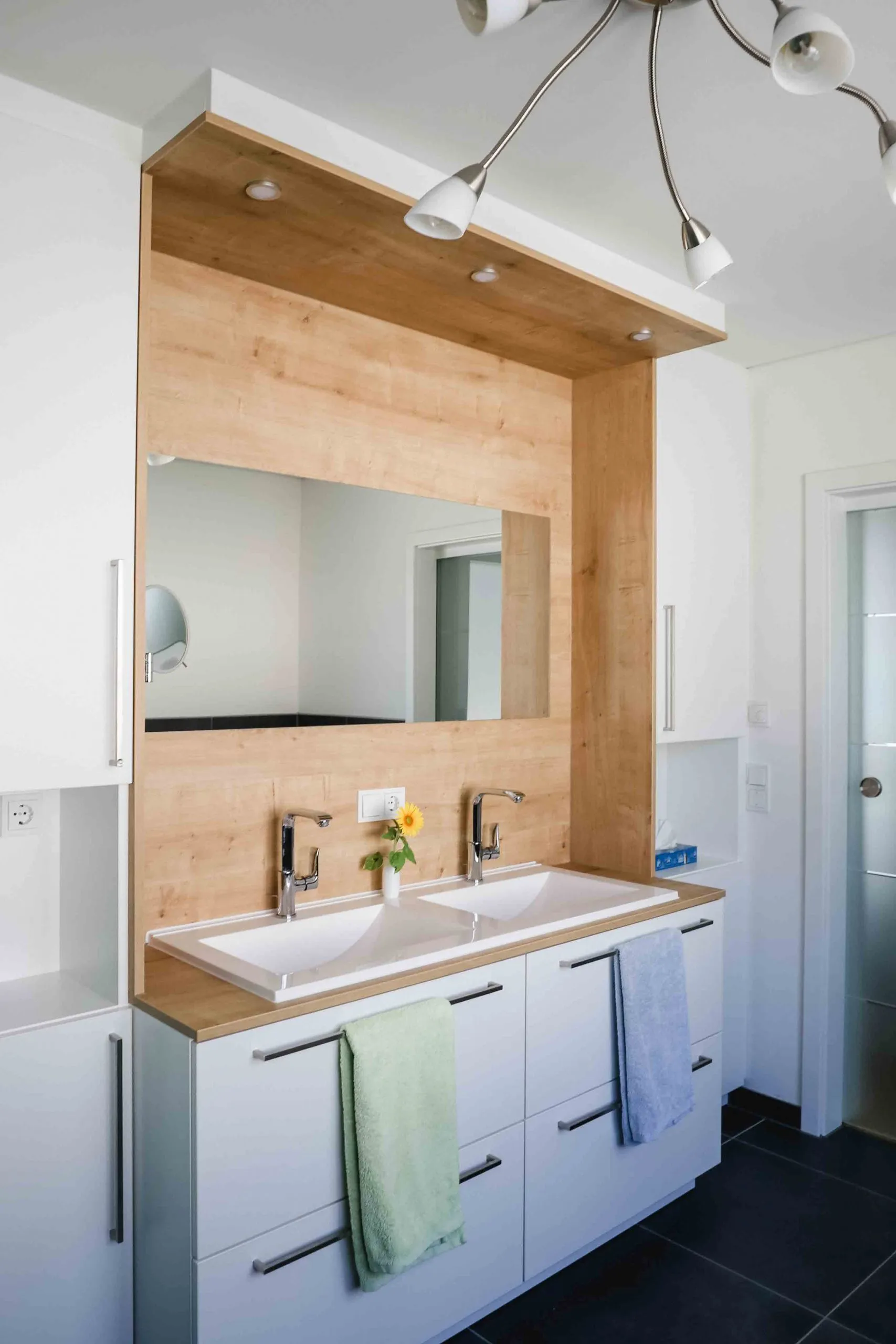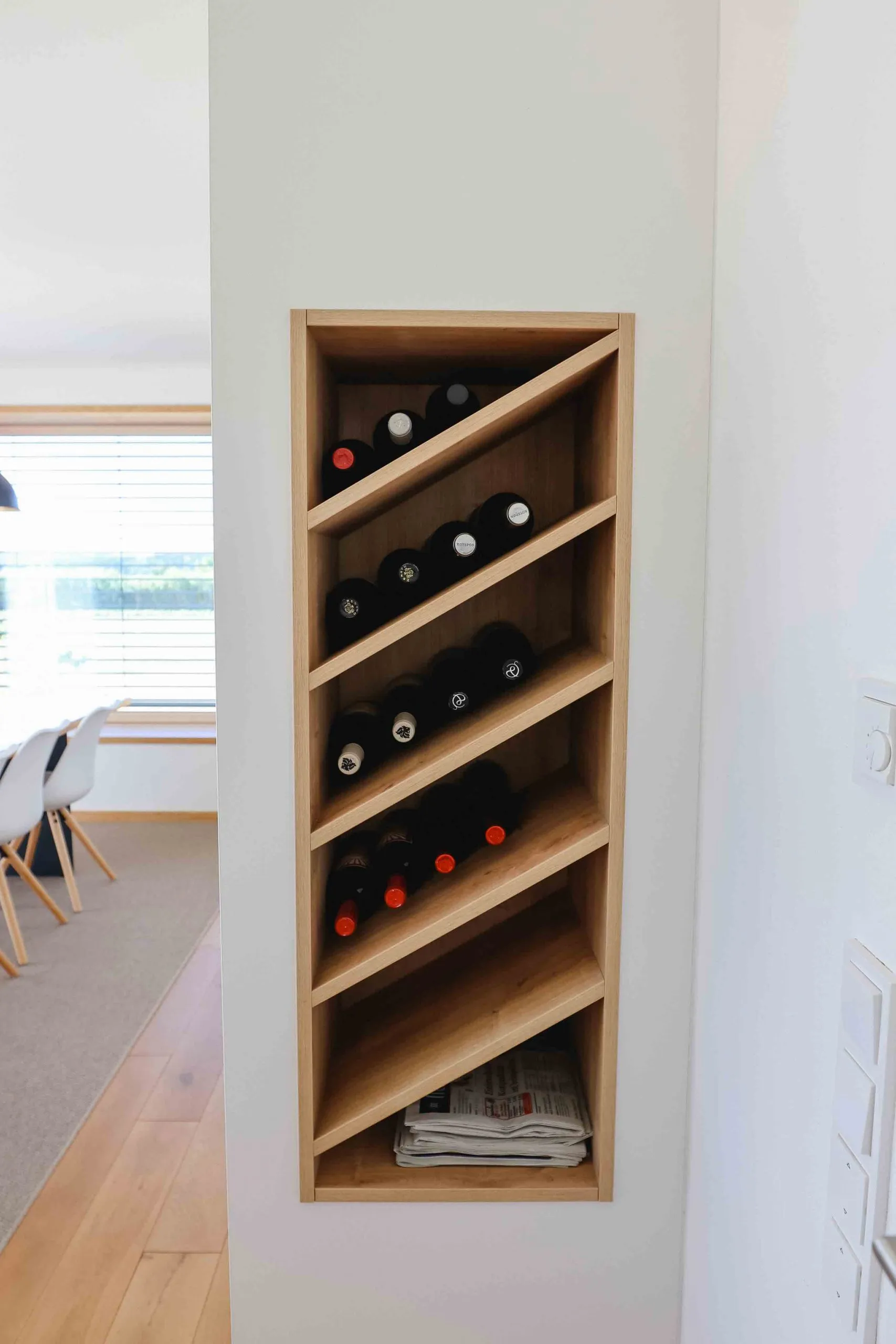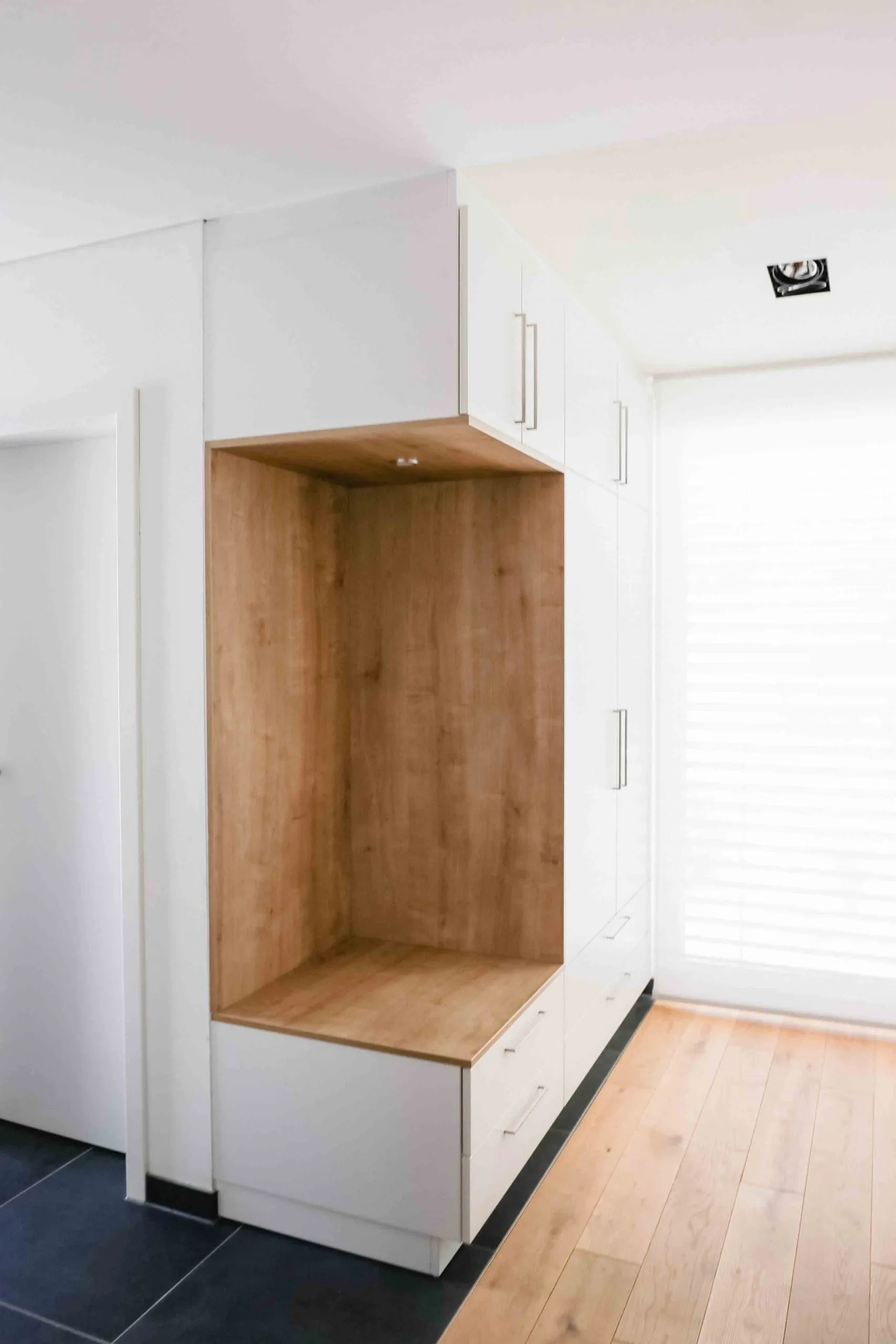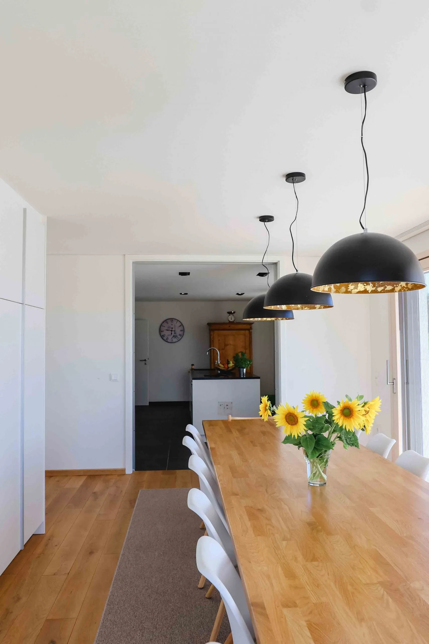 Schattenfuge, Wohnzimmer und Büro im Souterrain, große Küche, großer Essbereich, puristische Architektur und Einrichtung mit organischen Akzenten, Spielflur im Obergeschoss für die Kinder, Einbauschränke zur optimalen Platznutzung, Aufgesattelte Faltwerktreppe mit geschlossenem Geländer umlaufenden von OG bis KG, Schleppgauben mit Flachdachabdichtung, Garagenflachdach mit Begrünung, Zisterne für Regenwasser, zur Versickerung des Regenwassers auf dem eigenen Grundstück, Photovoltaik mit Stromspeicher