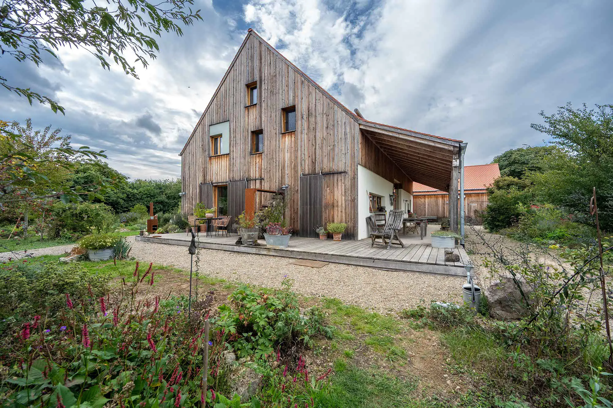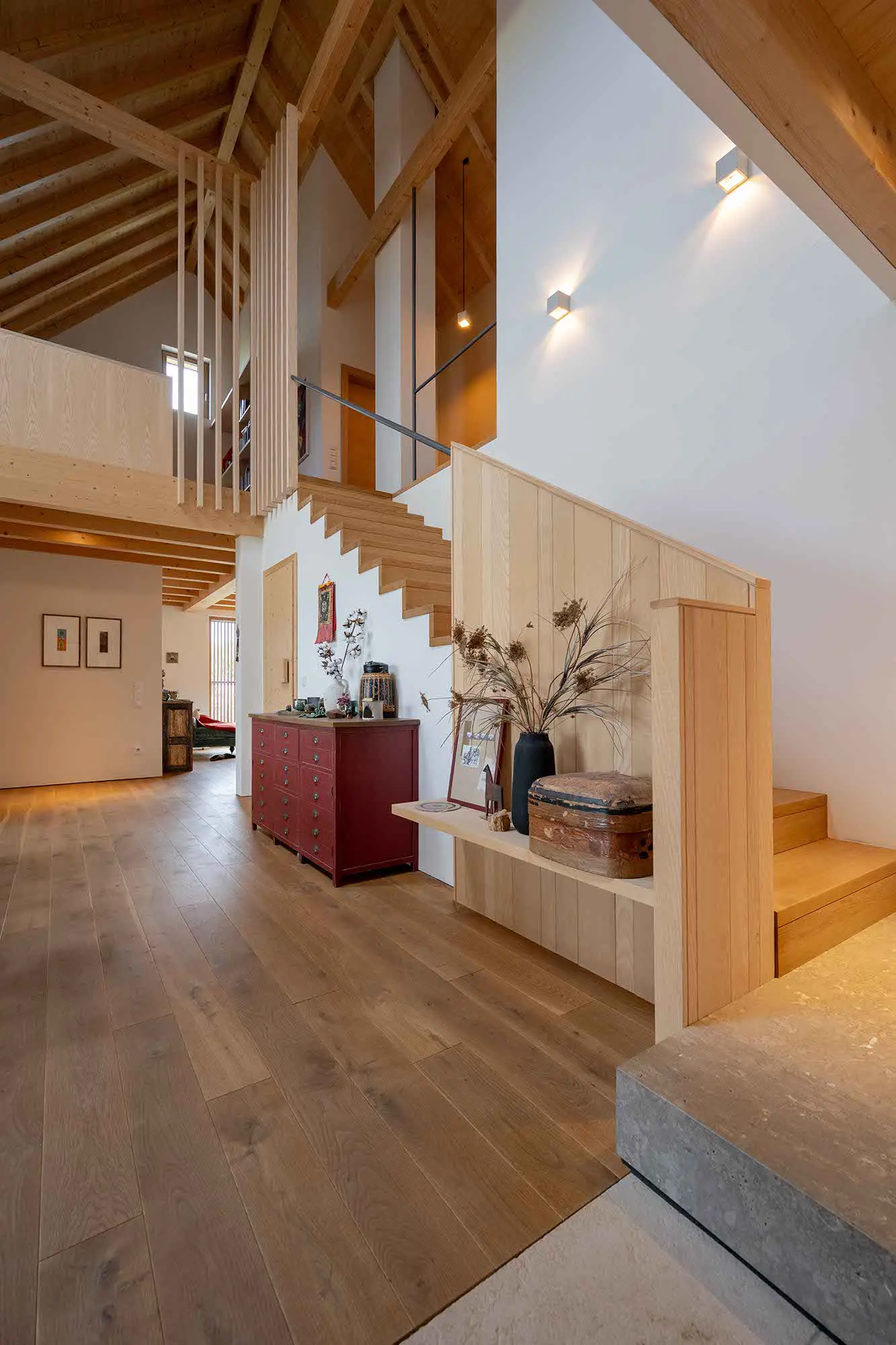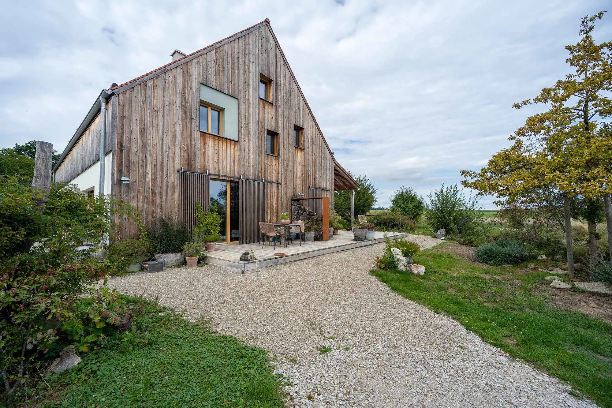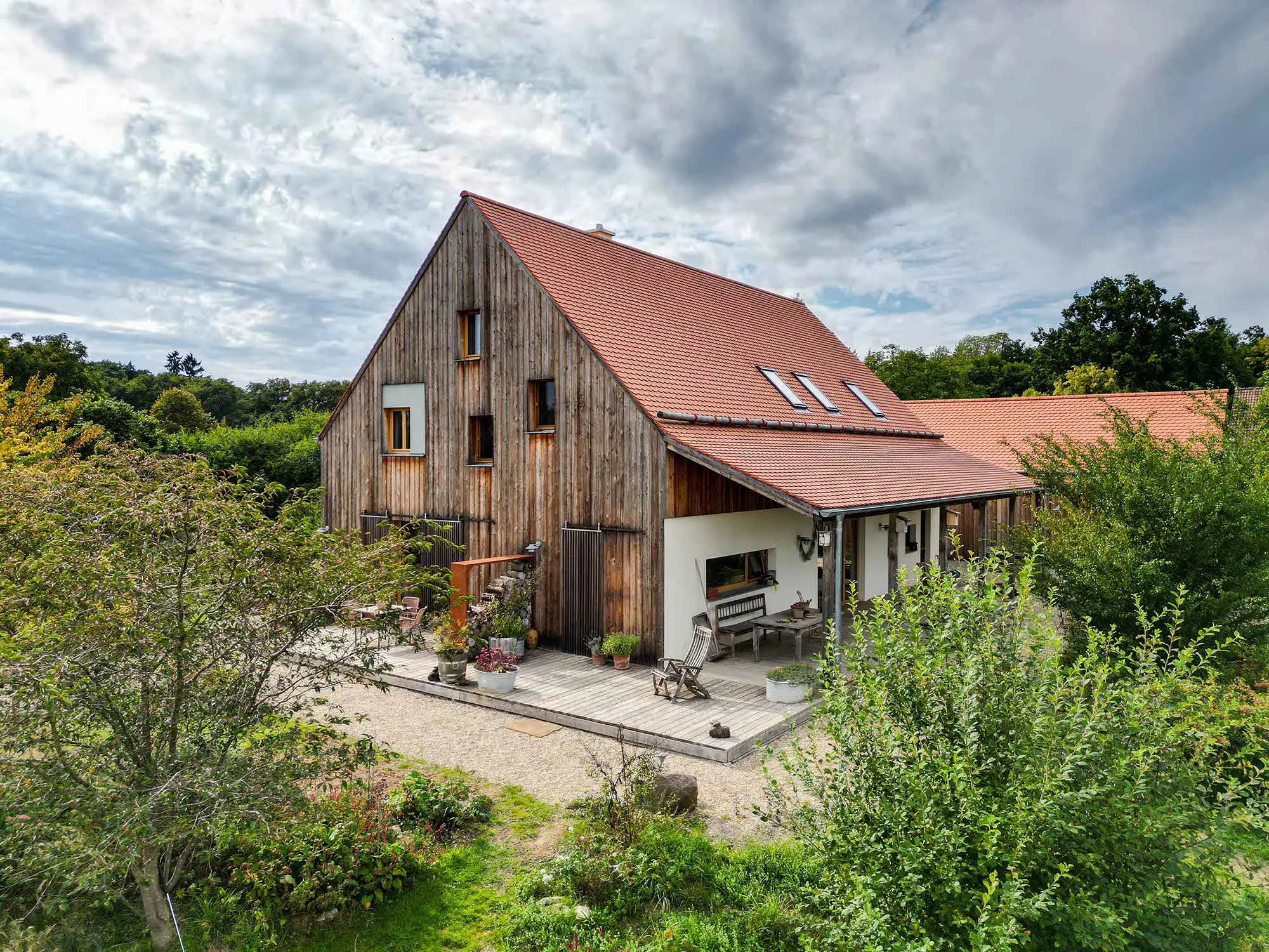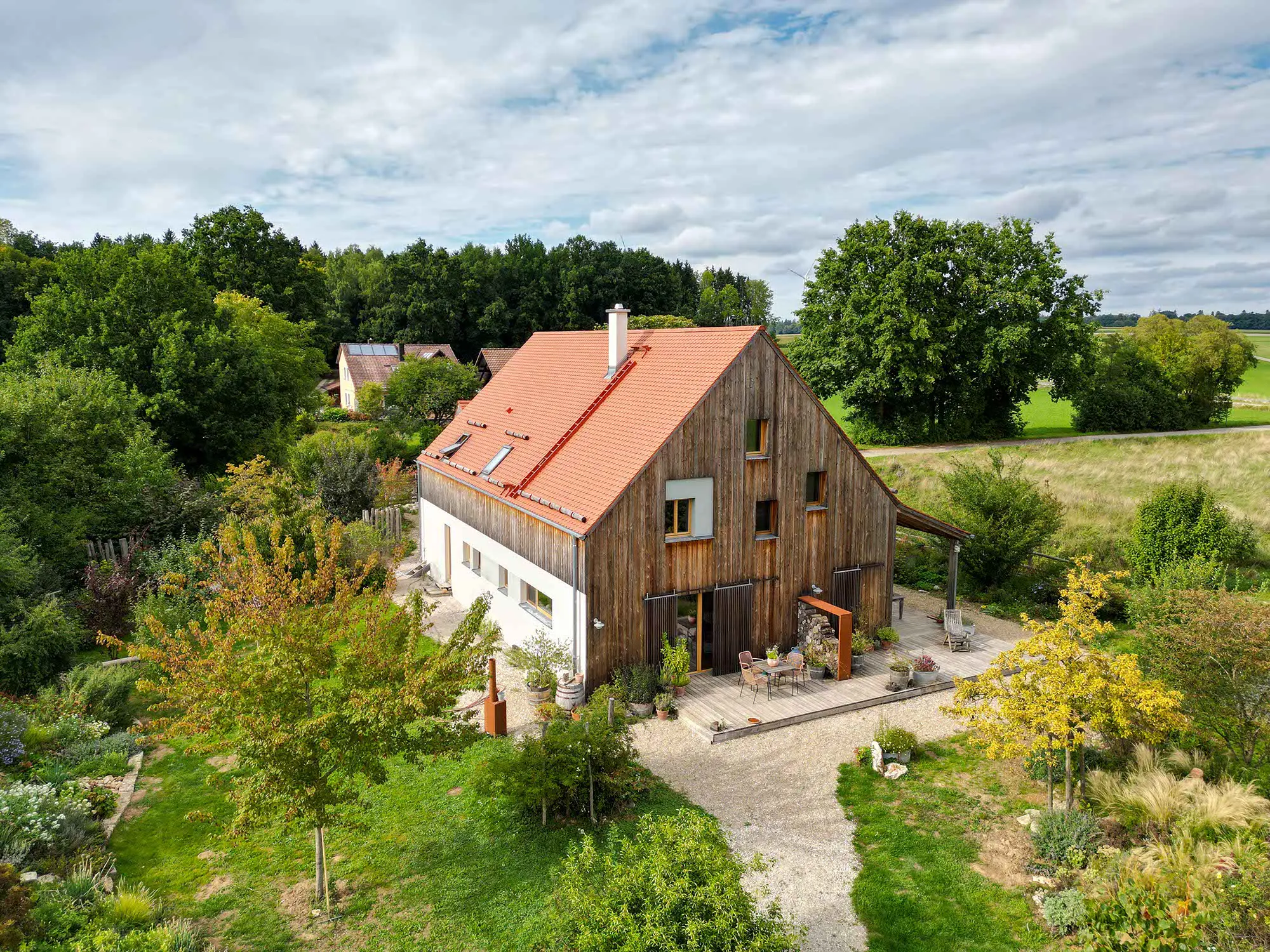 Biberziegel-Dach, traditioneller Rundholz-Schneefang, Holzfassade, großzügige Wohnräume mit viel Holz, natürlicher Garten, große Fensterflächen für viel Tageslicht, Galerie mit offenem Luftraum, überdachte Terrasse mit Weitblick