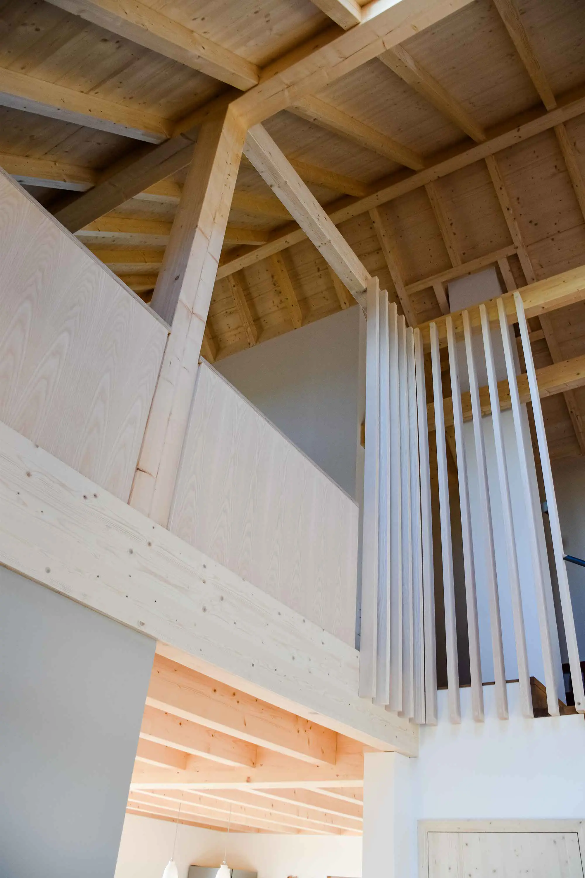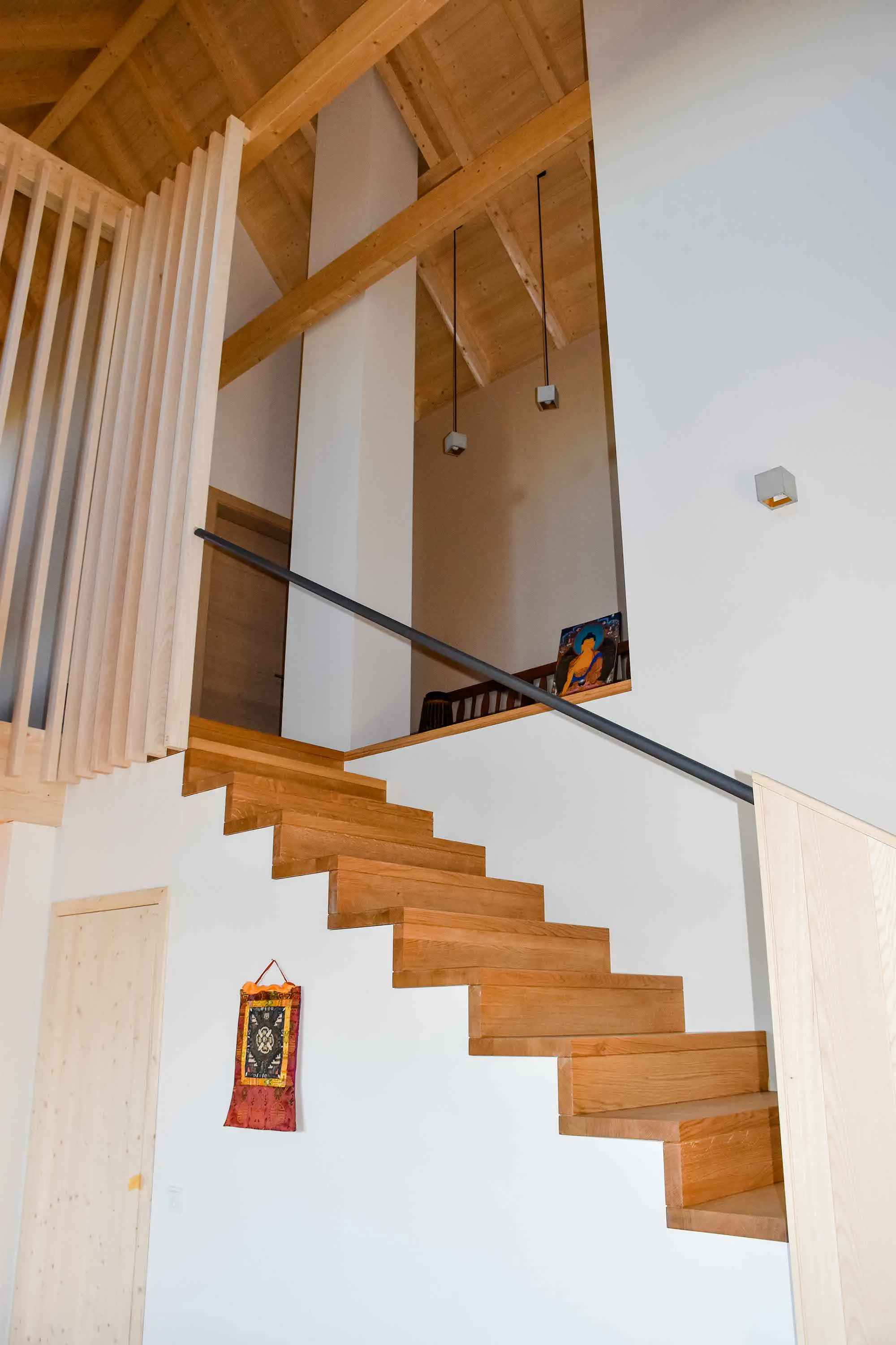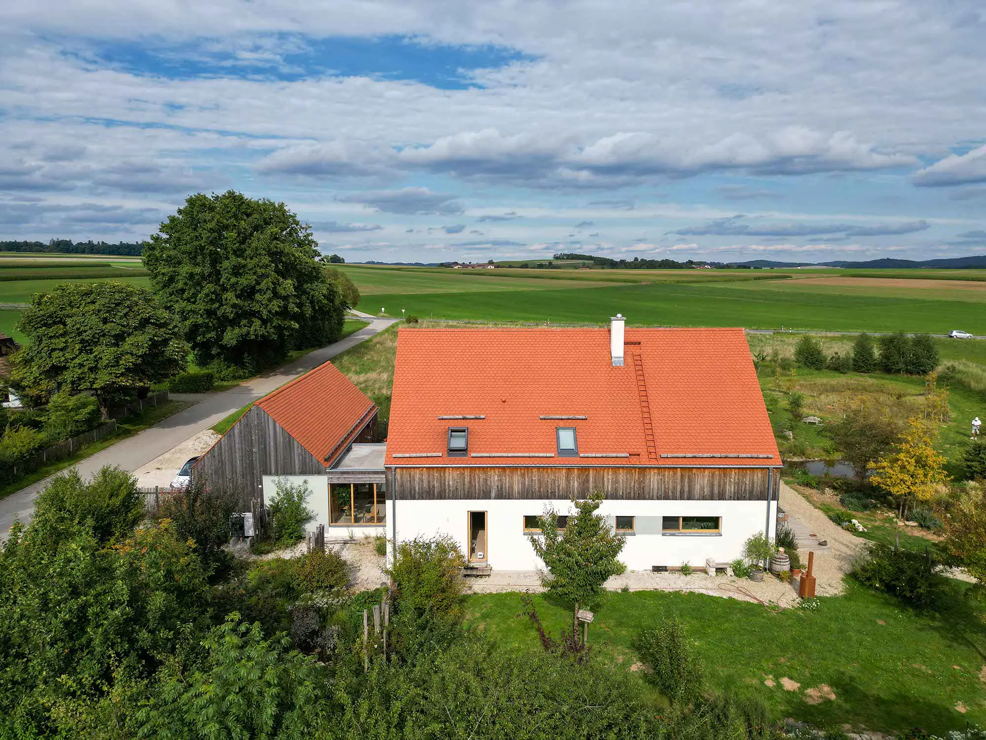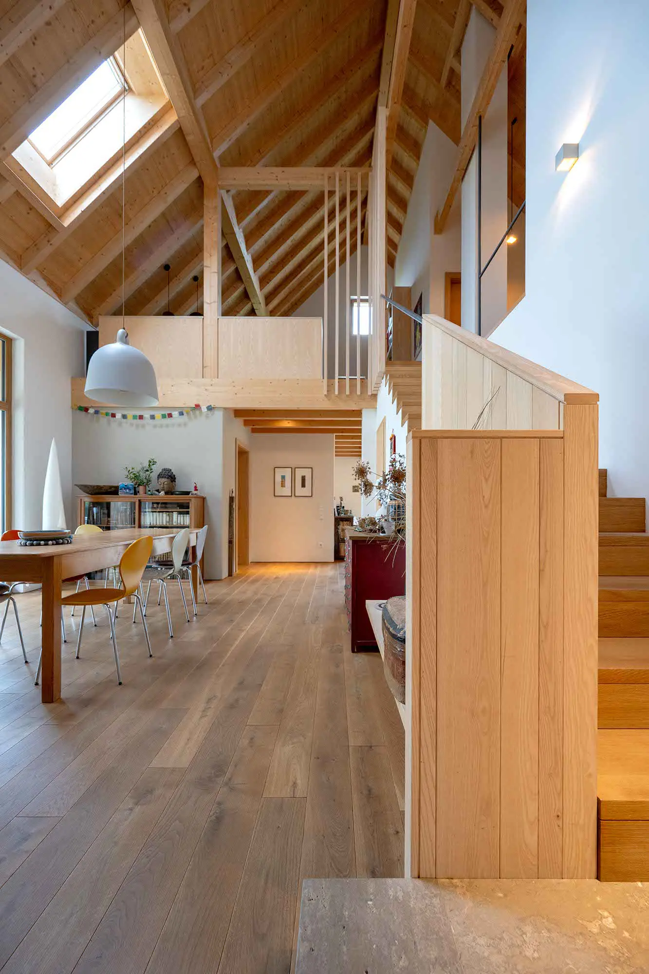 Biberziegel-Dach, traditioneller Rundholz-Schneefang, Holzfassade, großzügige Wohnräume mit viel Holz, natürlicher Garten, große Fensterflächen für viel Tageslicht, Galerie mit offenem Luftraum, überdachte Terrasse mit Weitblick