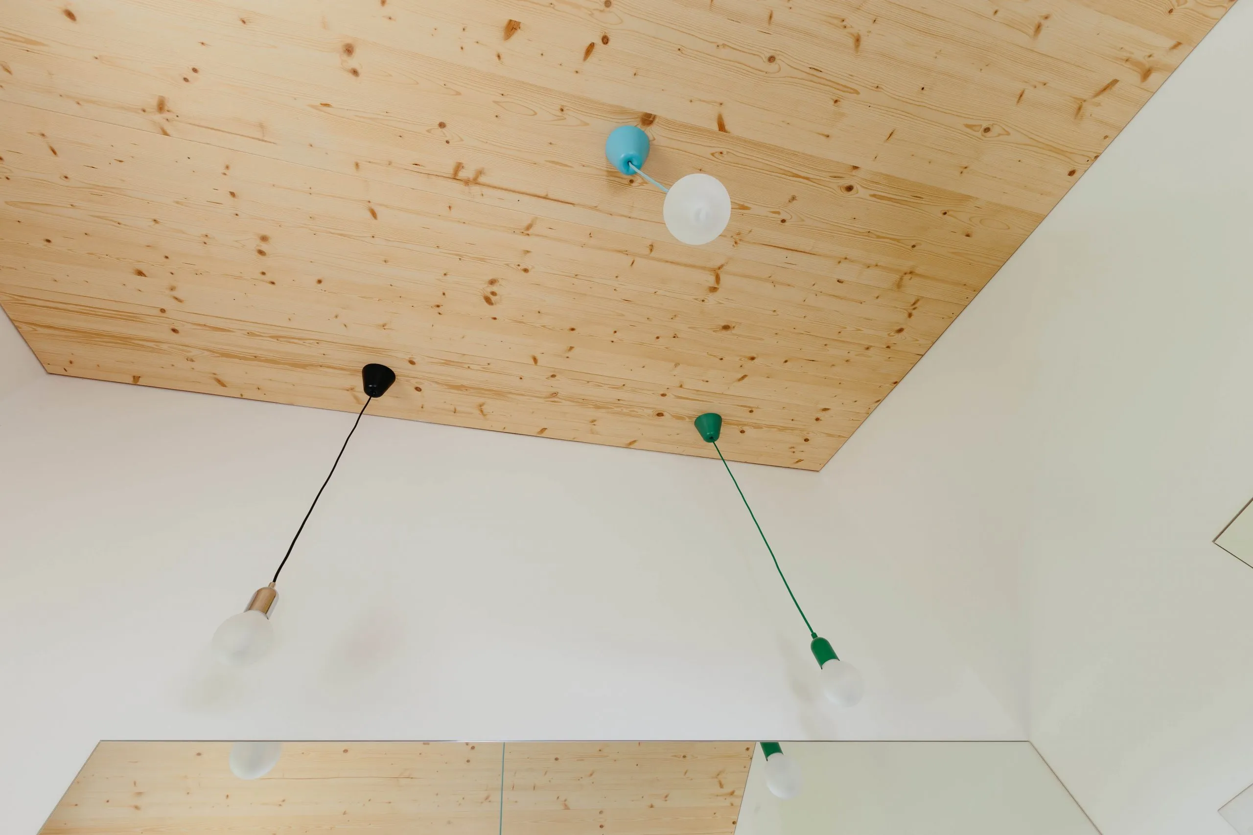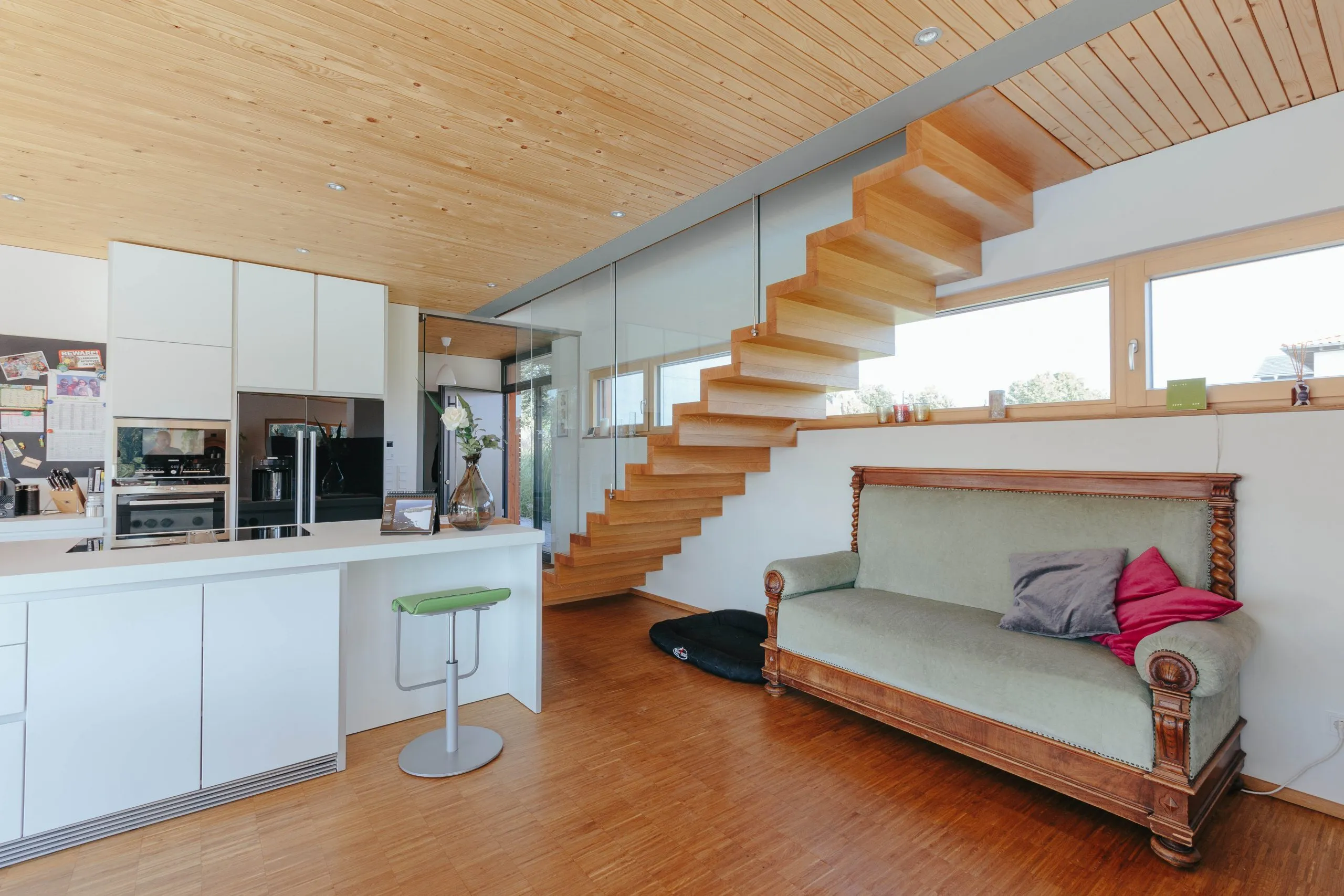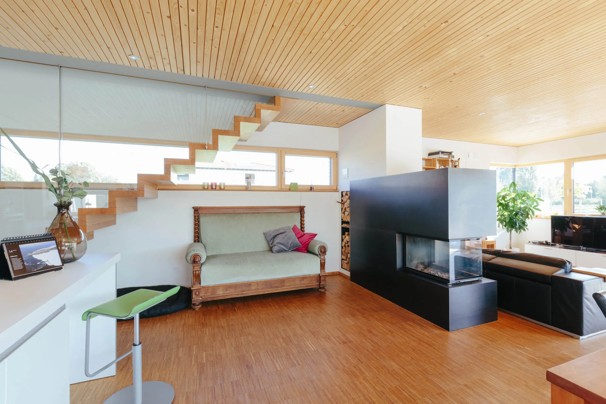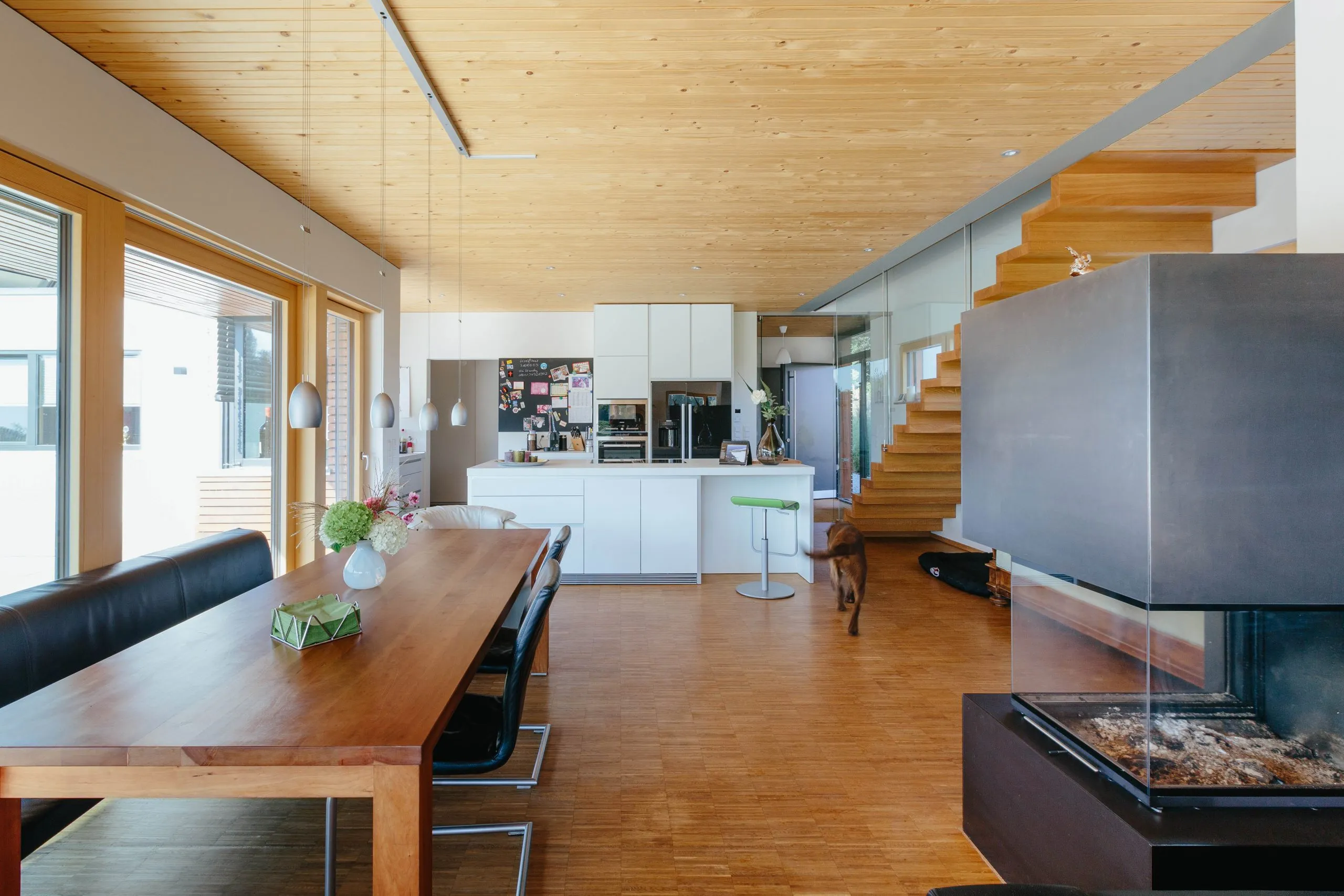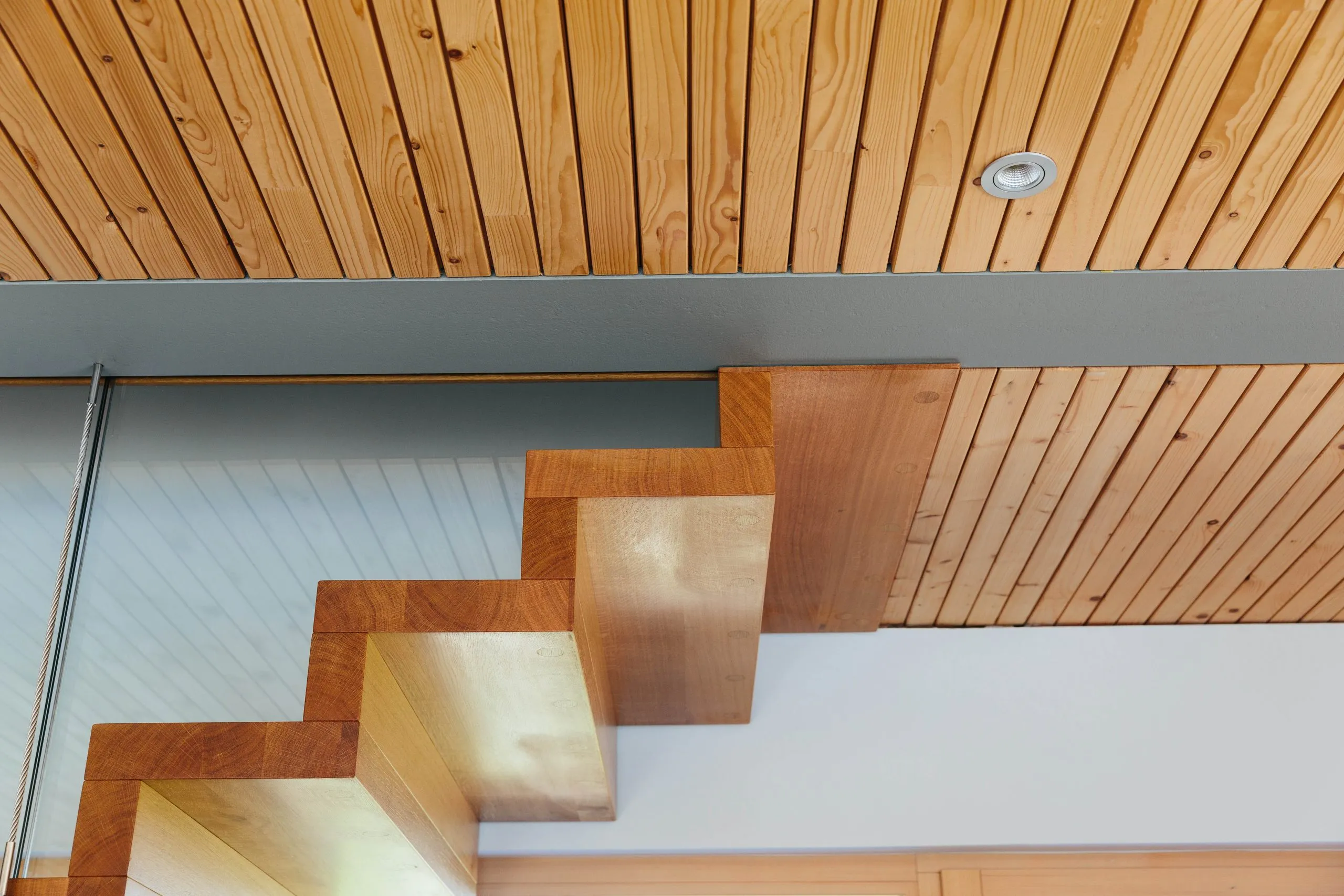 Brettstapeldecke im EG, Dachstuhl innen mit Dreischichtplatten aus Fichte verkleidet