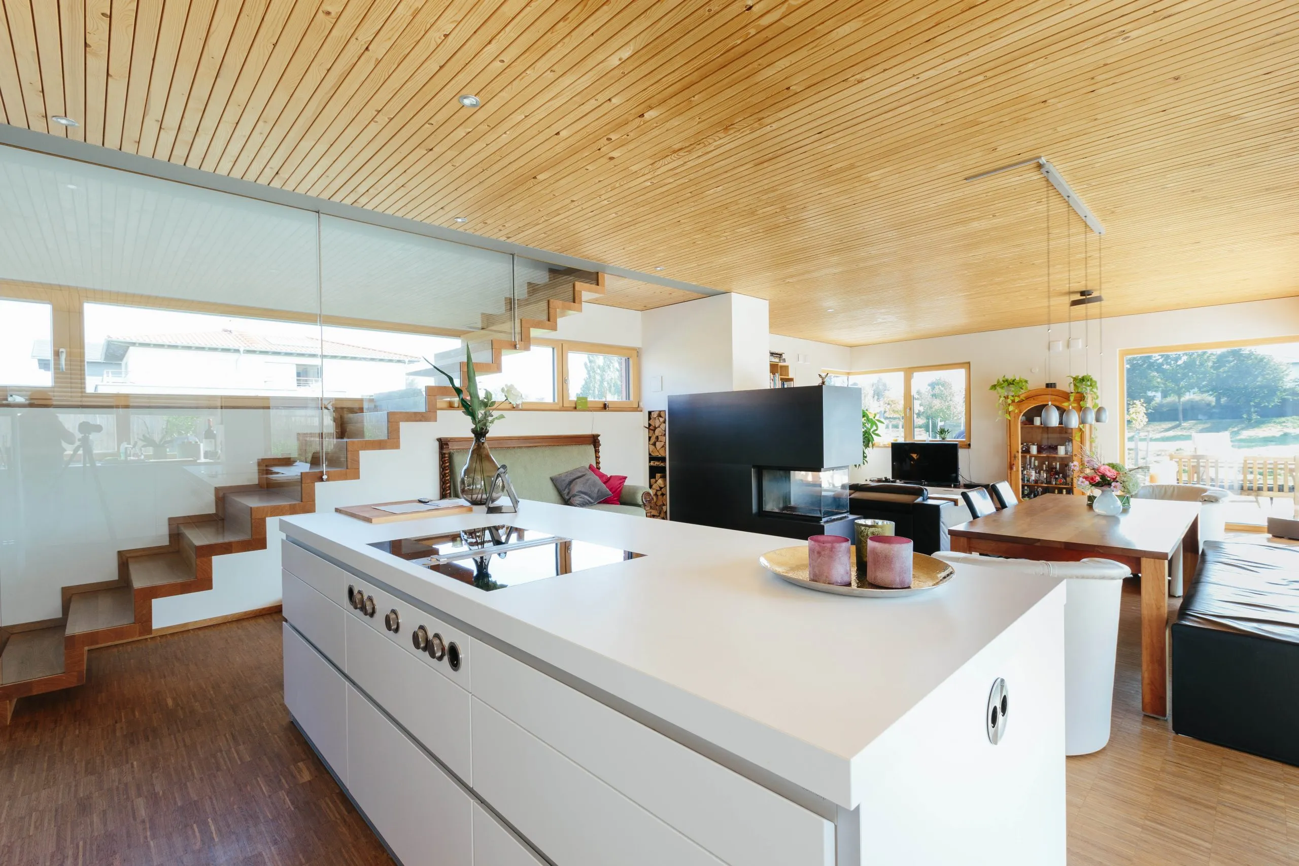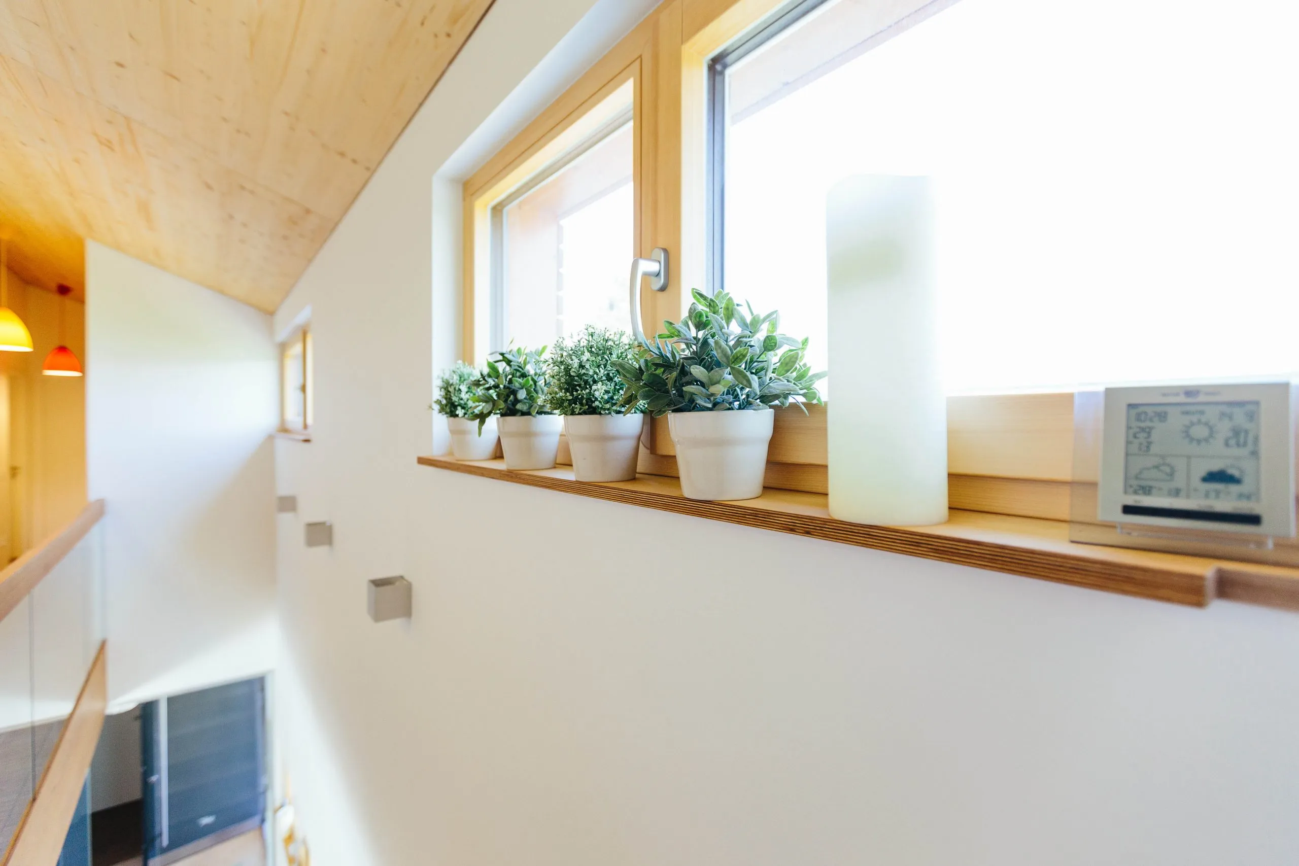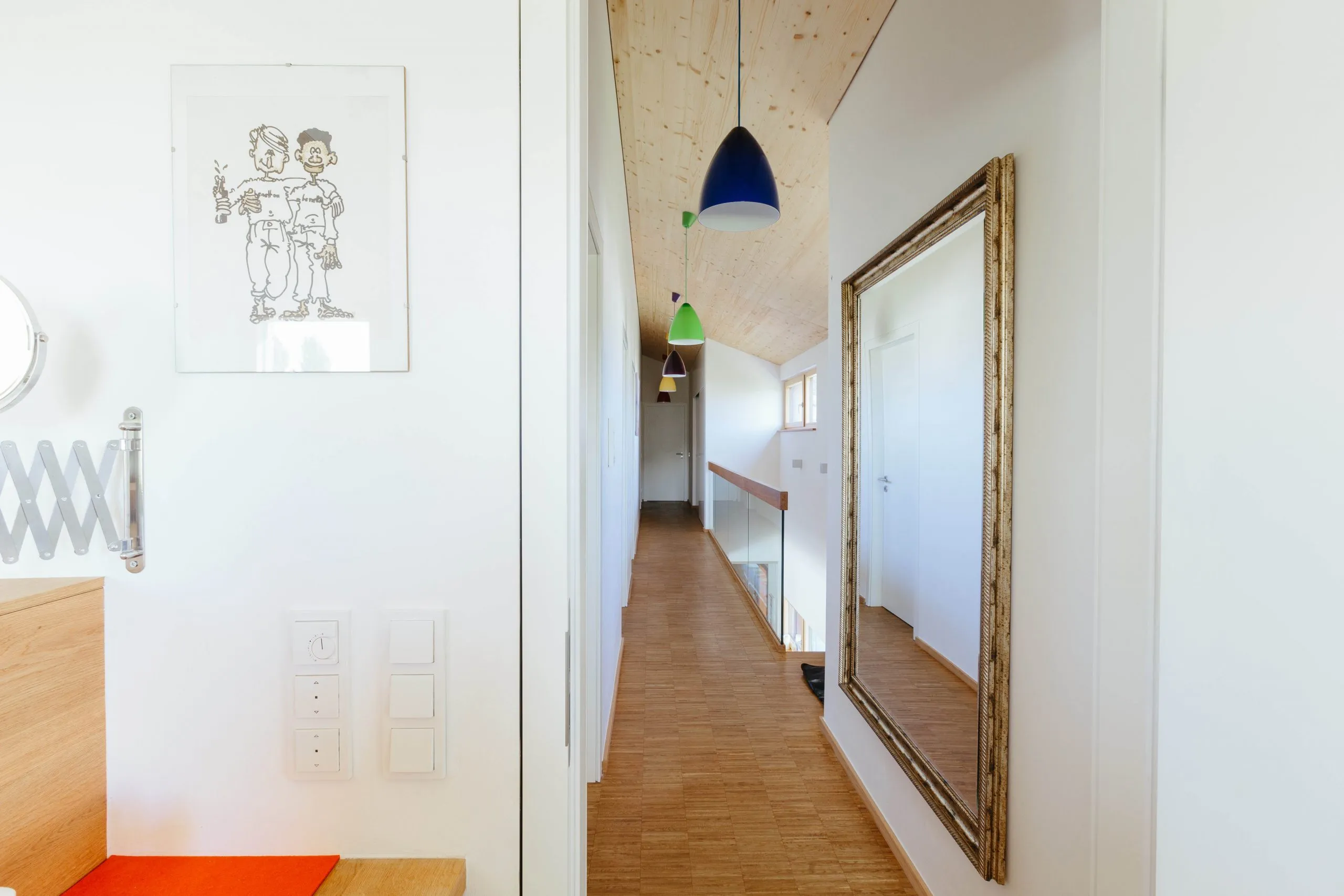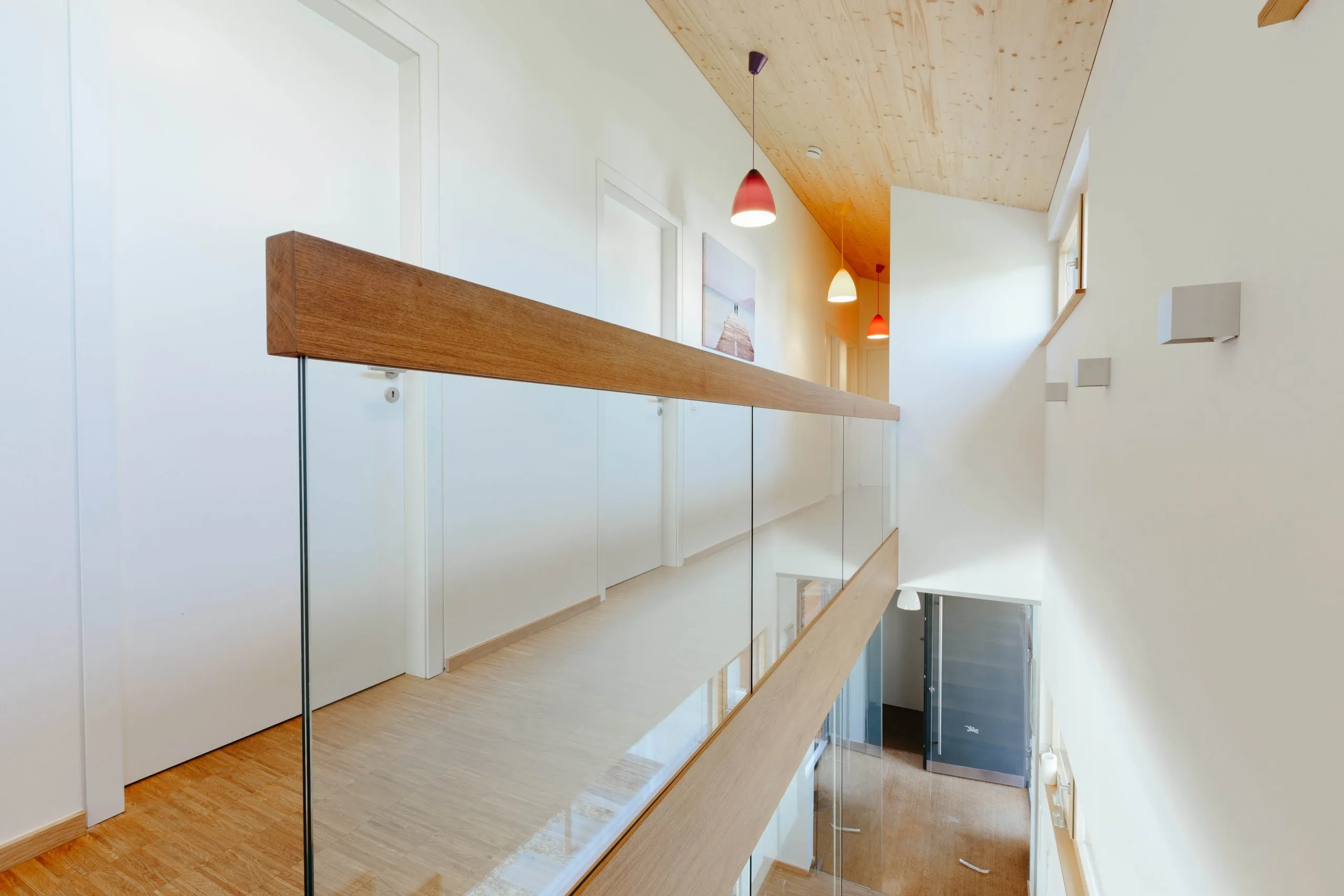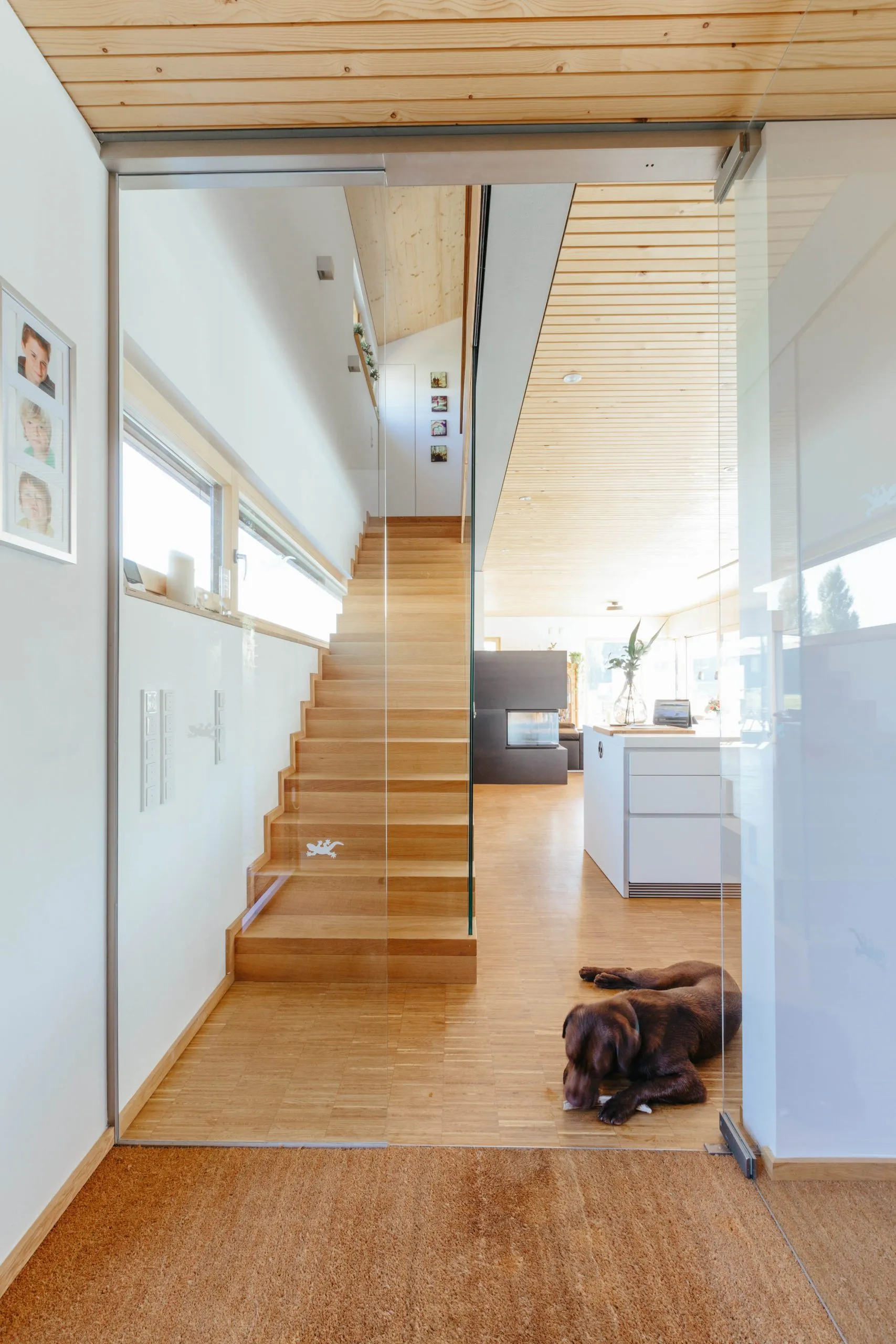Brettstapeldecke im EG, Dachstuhl innen mit Dreischichtplatten aus Fichte verkleidet