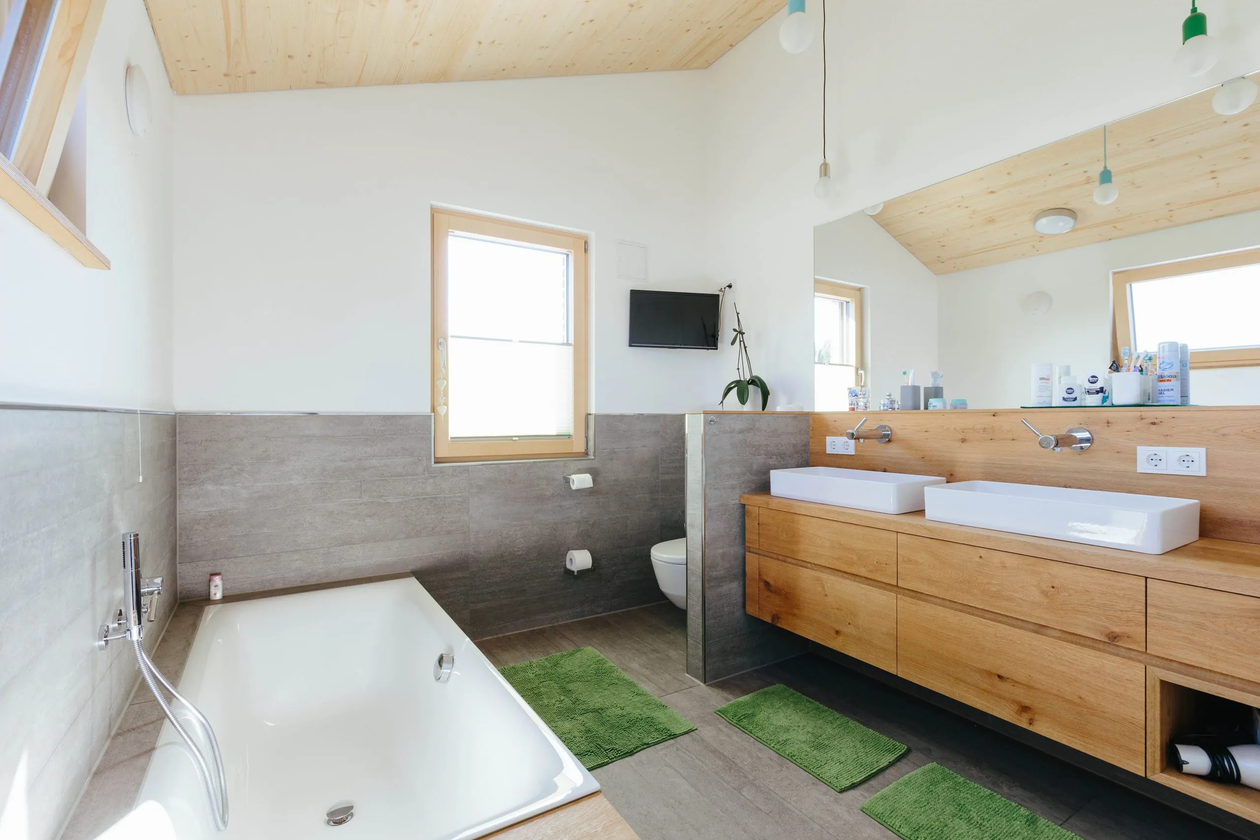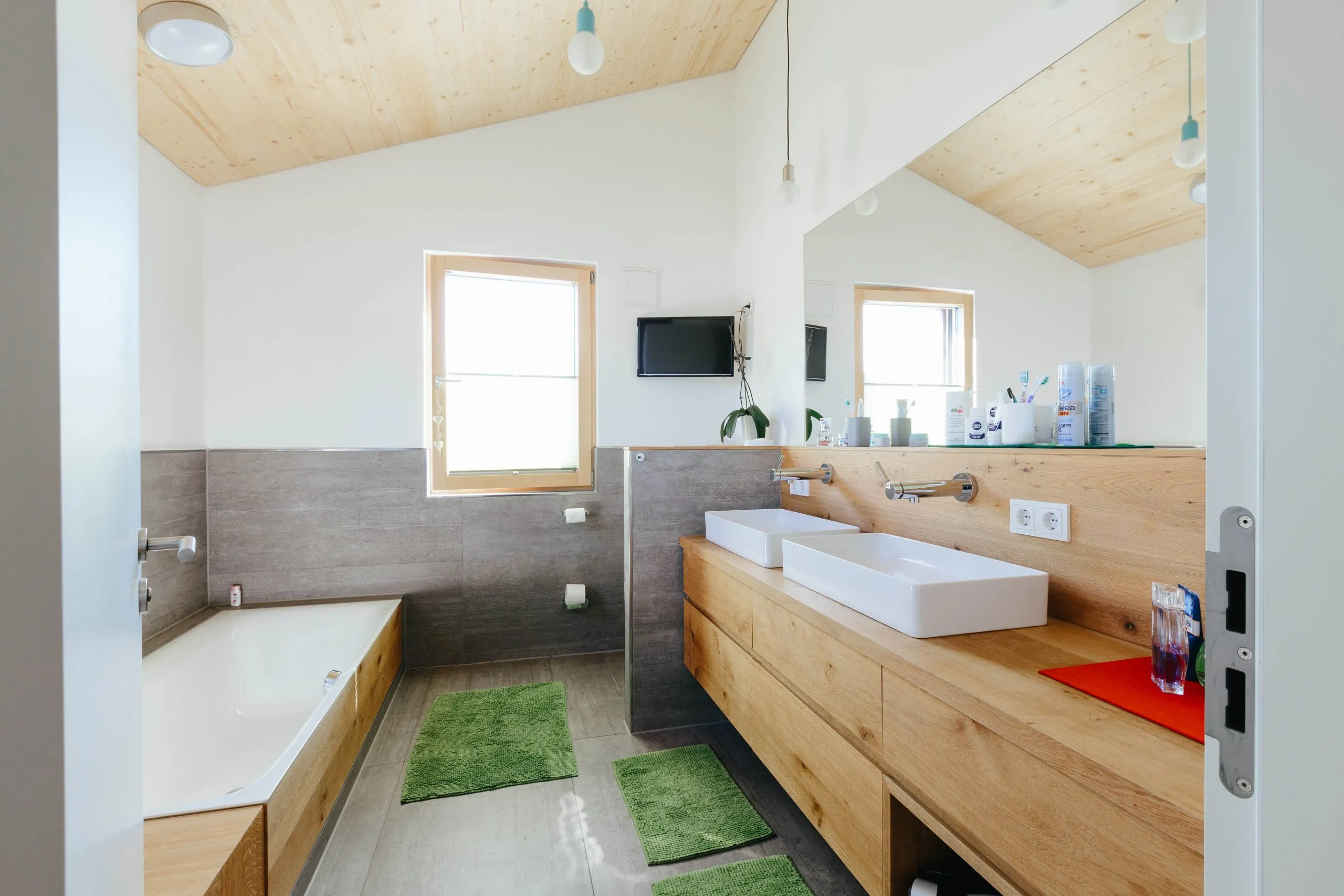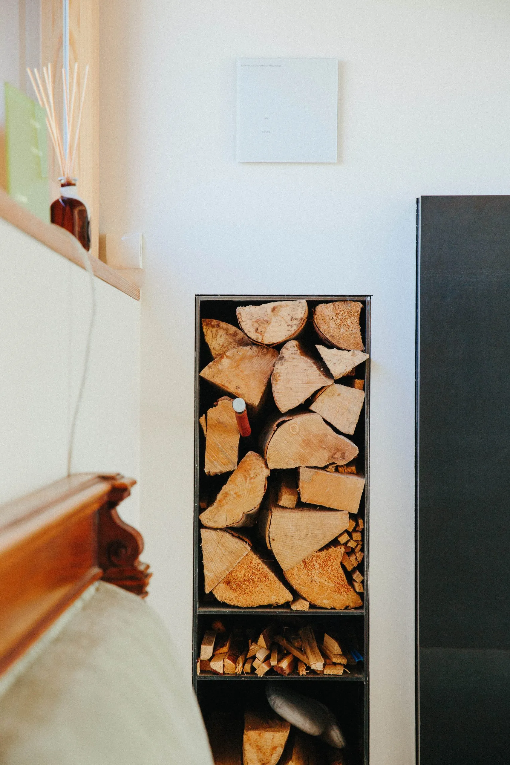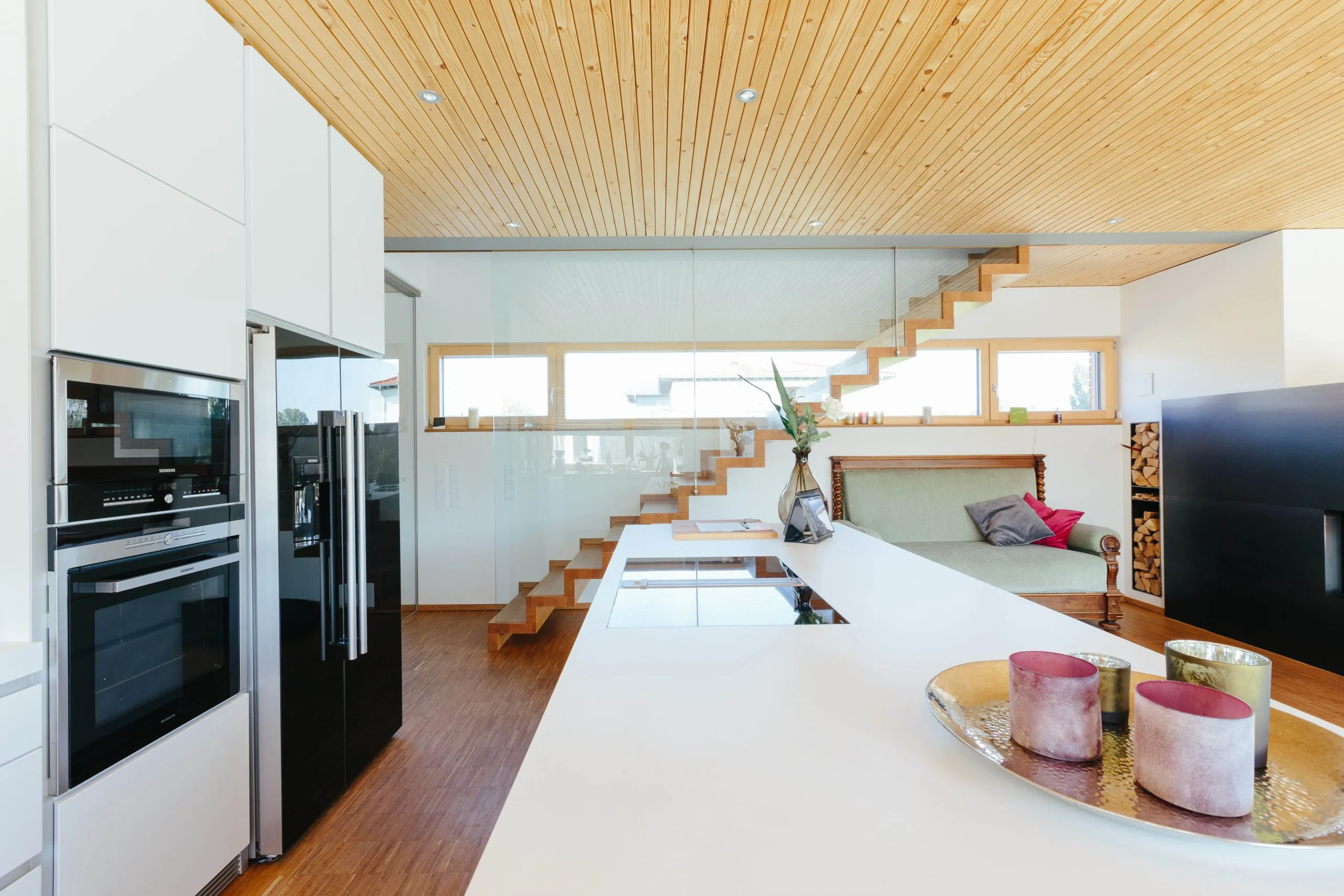 Brettstapeldecke im EG, Dachstuhl innen mit Dreischichtplatten aus Fichte verkleidet