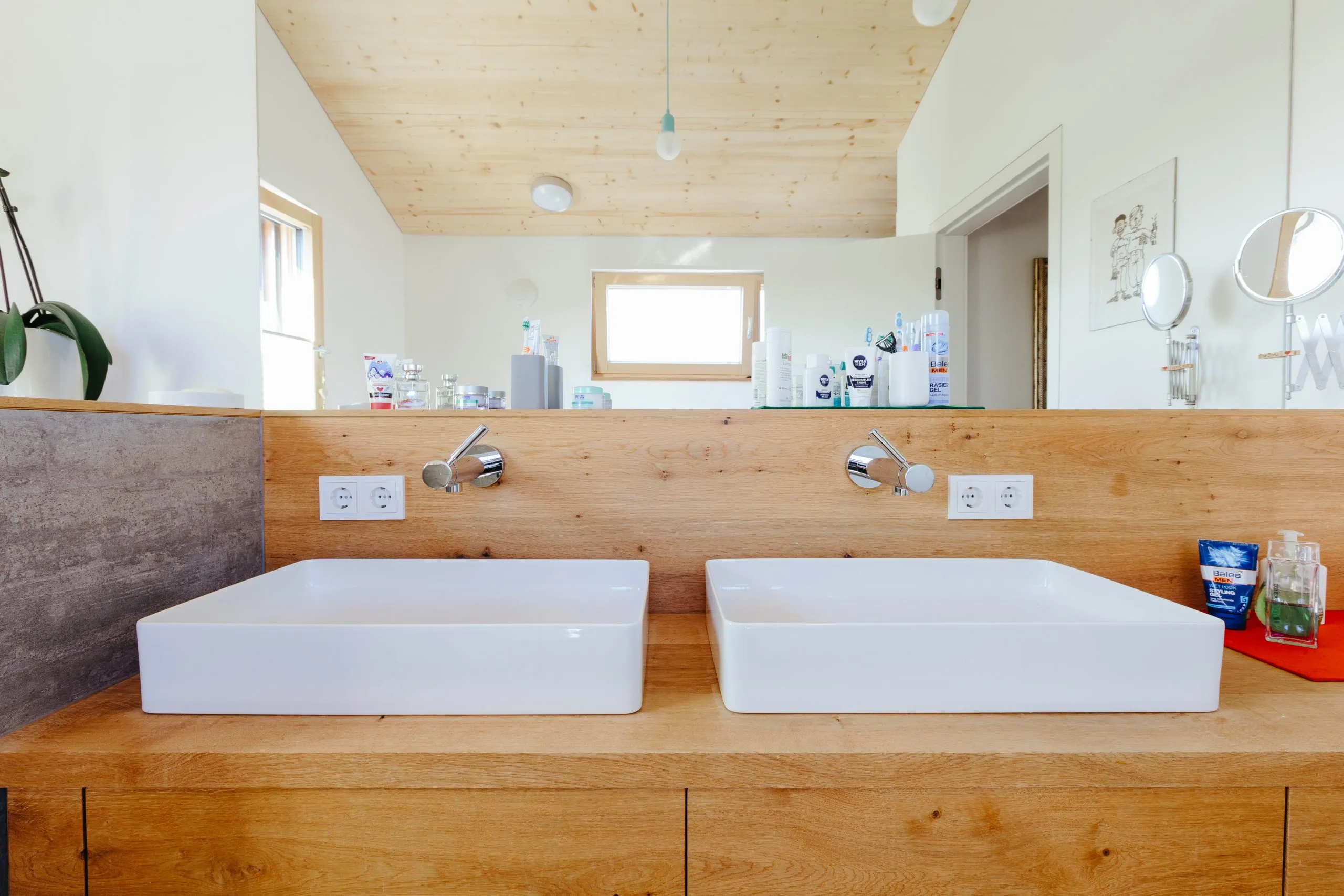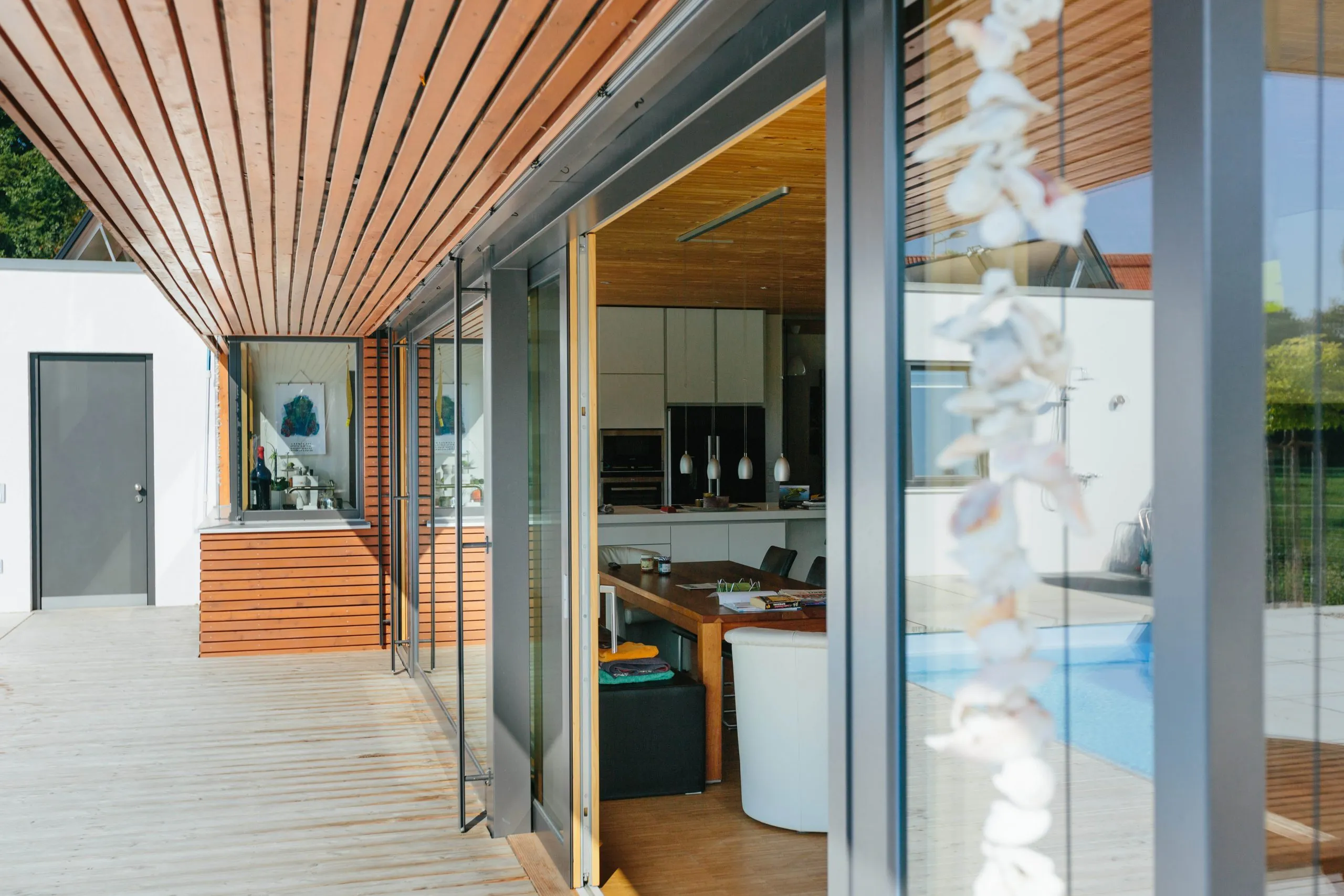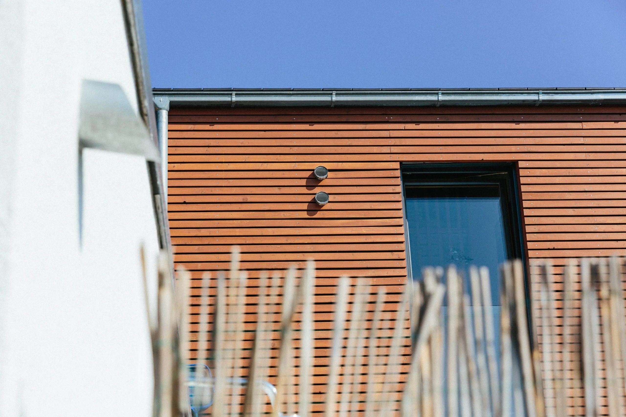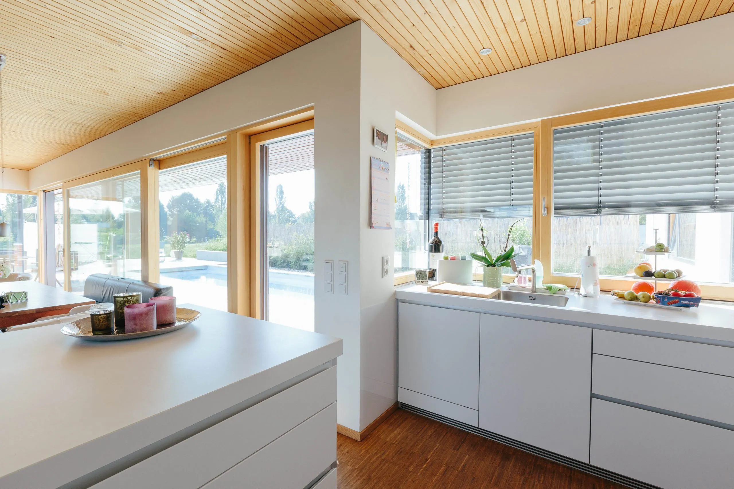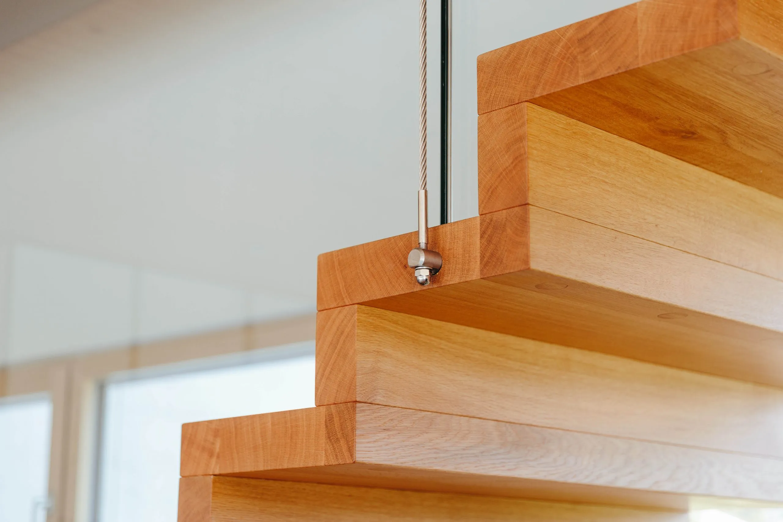 Brettstapeldecke im EG, Dachstuhl innen mit Dreischichtplatten aus Fichte verkleidet