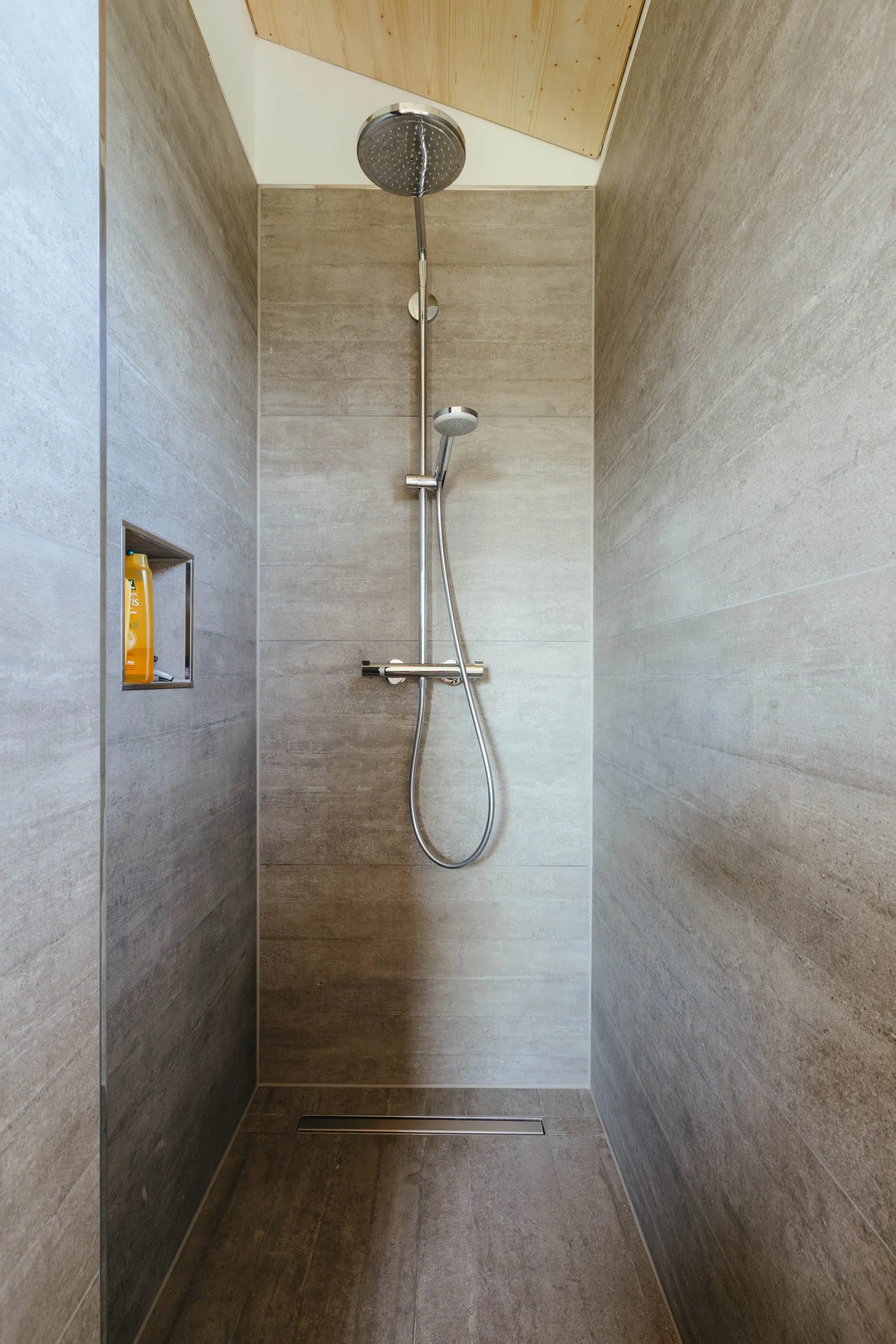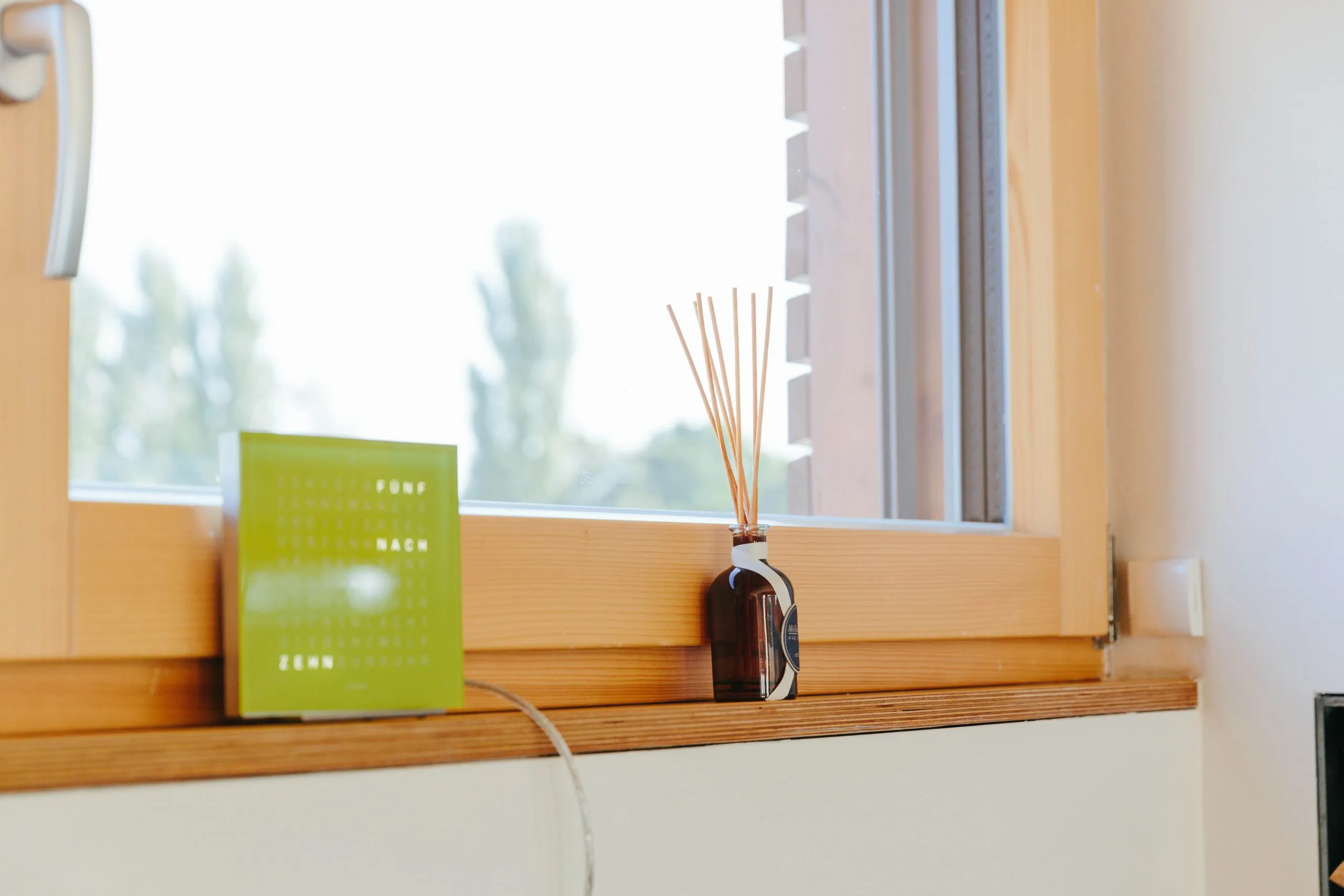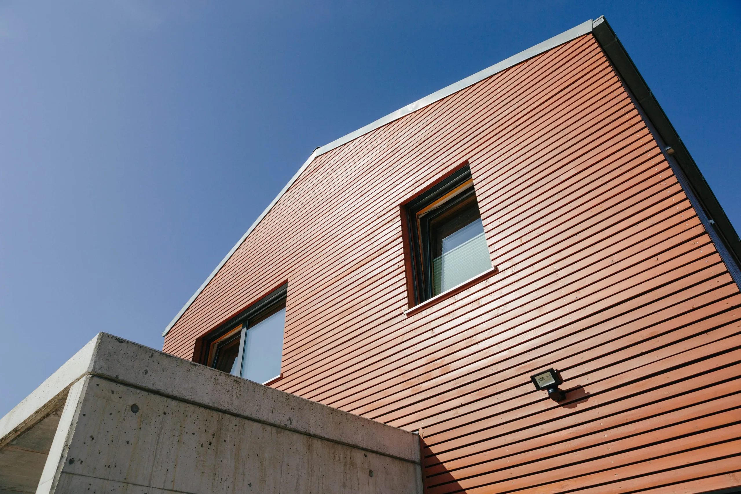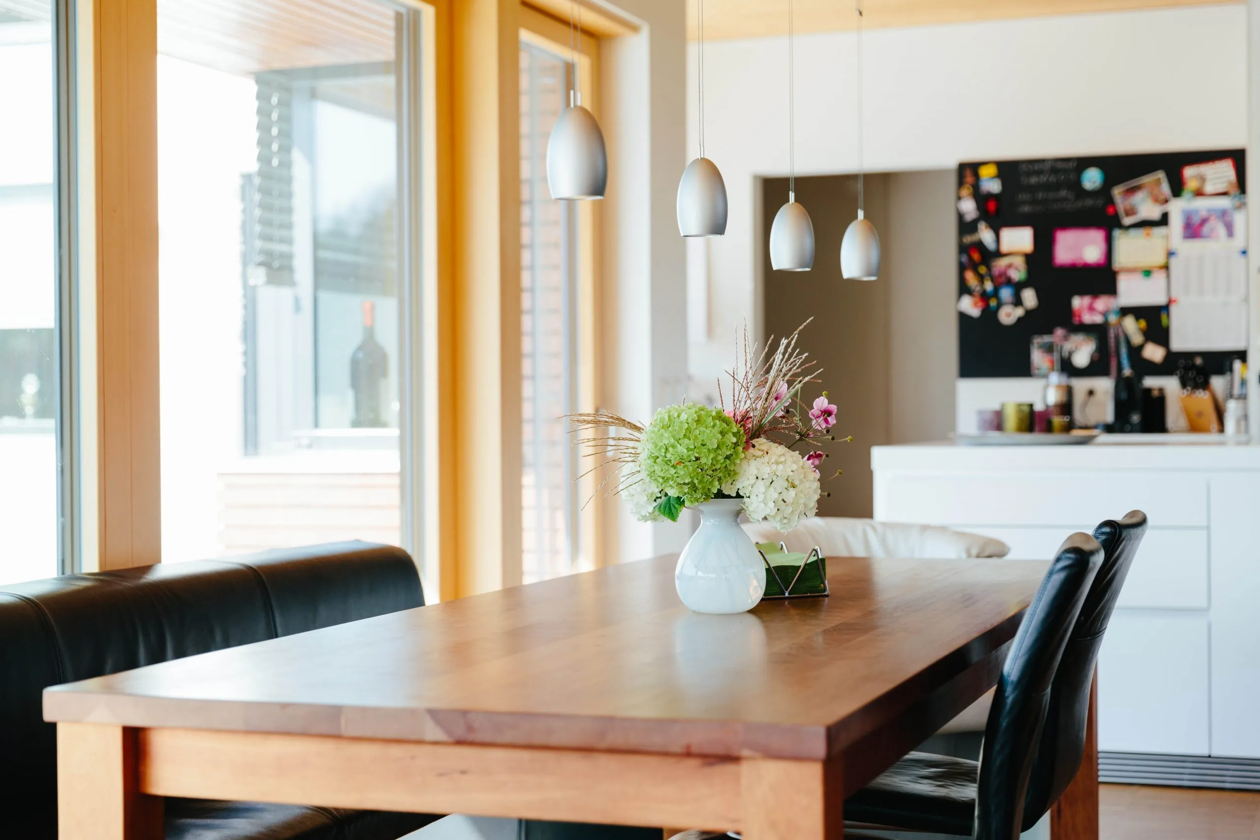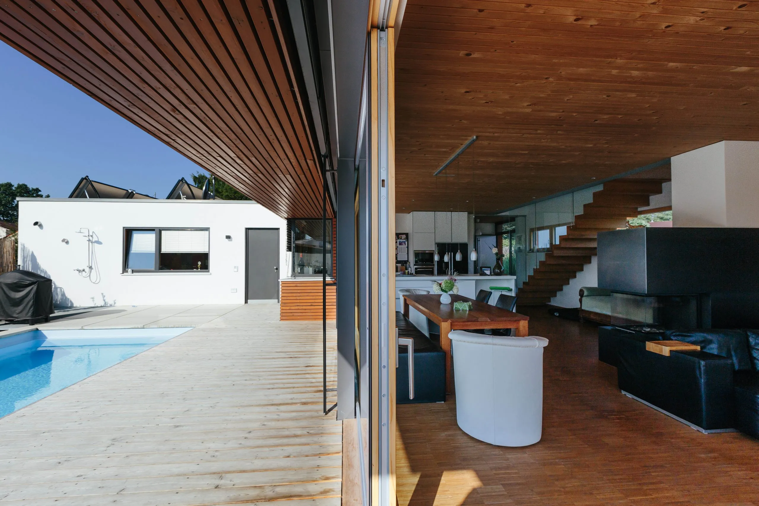 Brettstapeldecke im EG, Dachstuhl innen mit Dreischichtplatten aus Fichte verkleidet