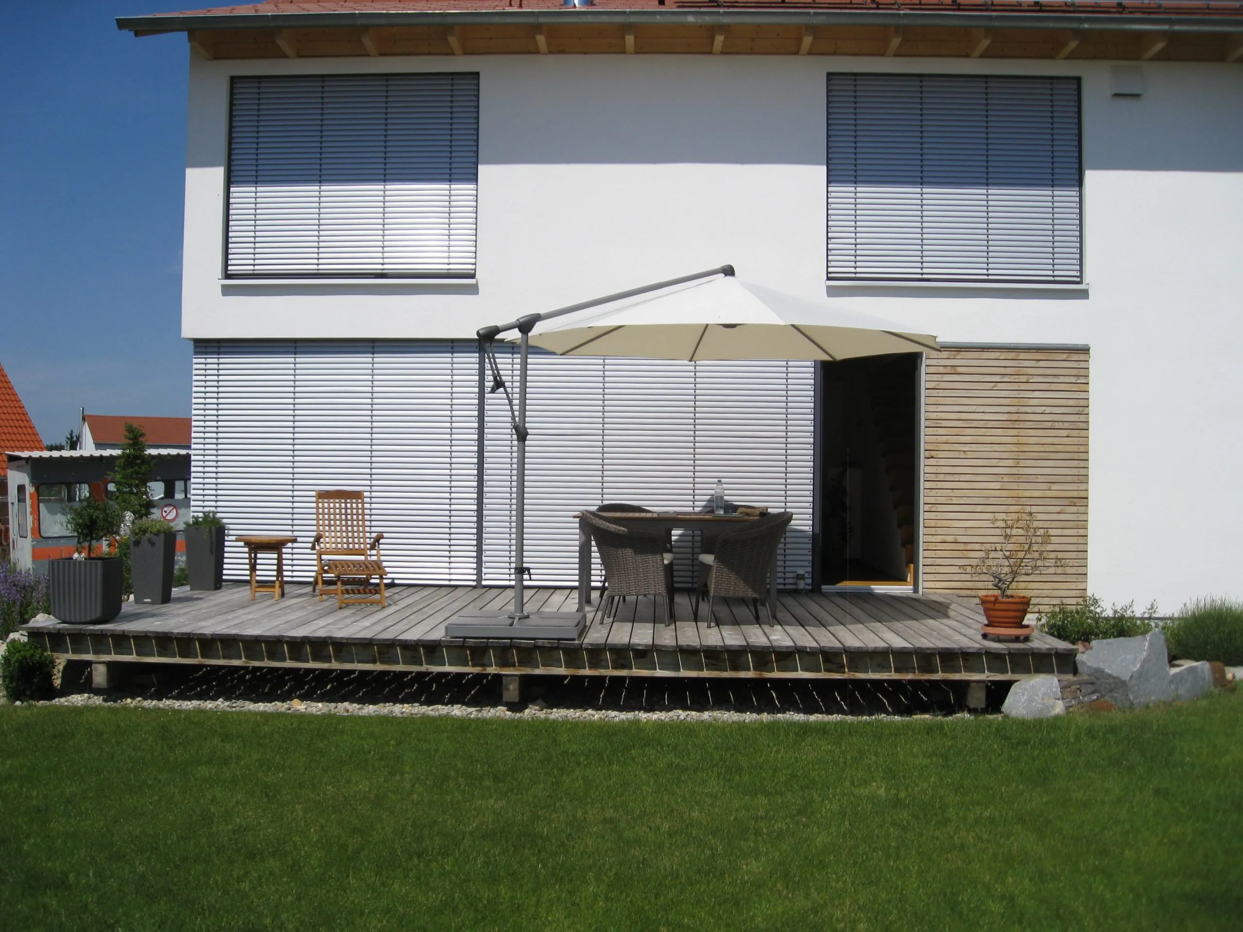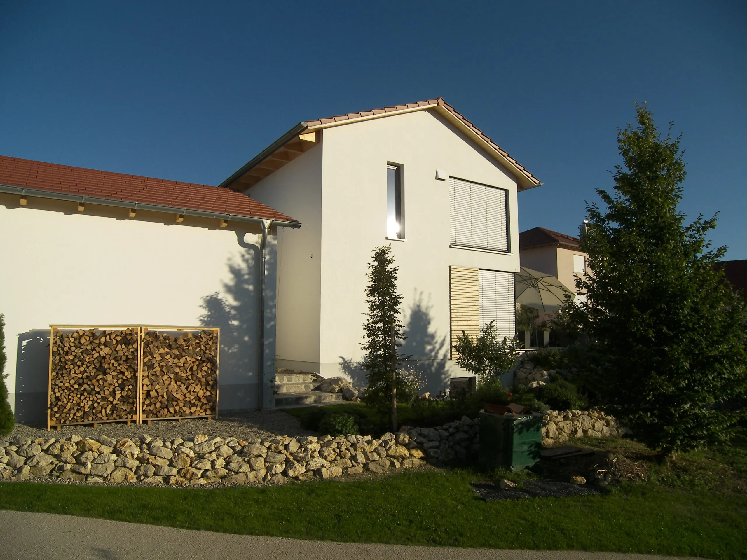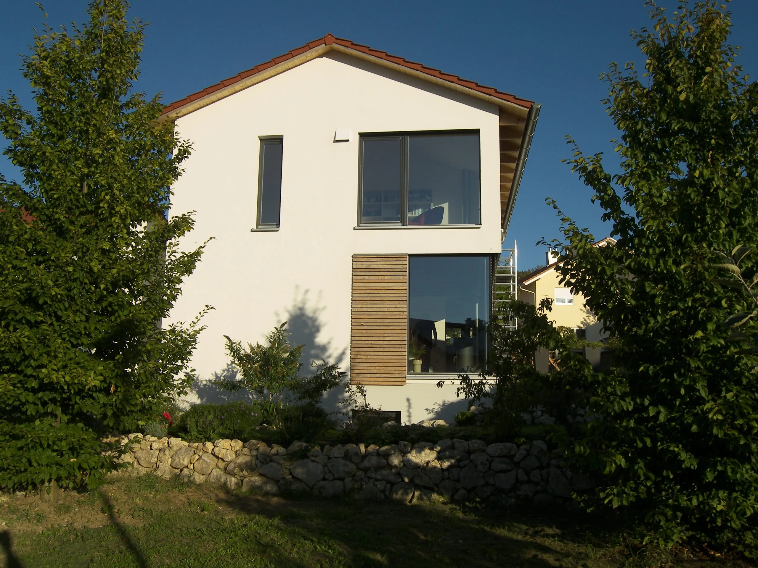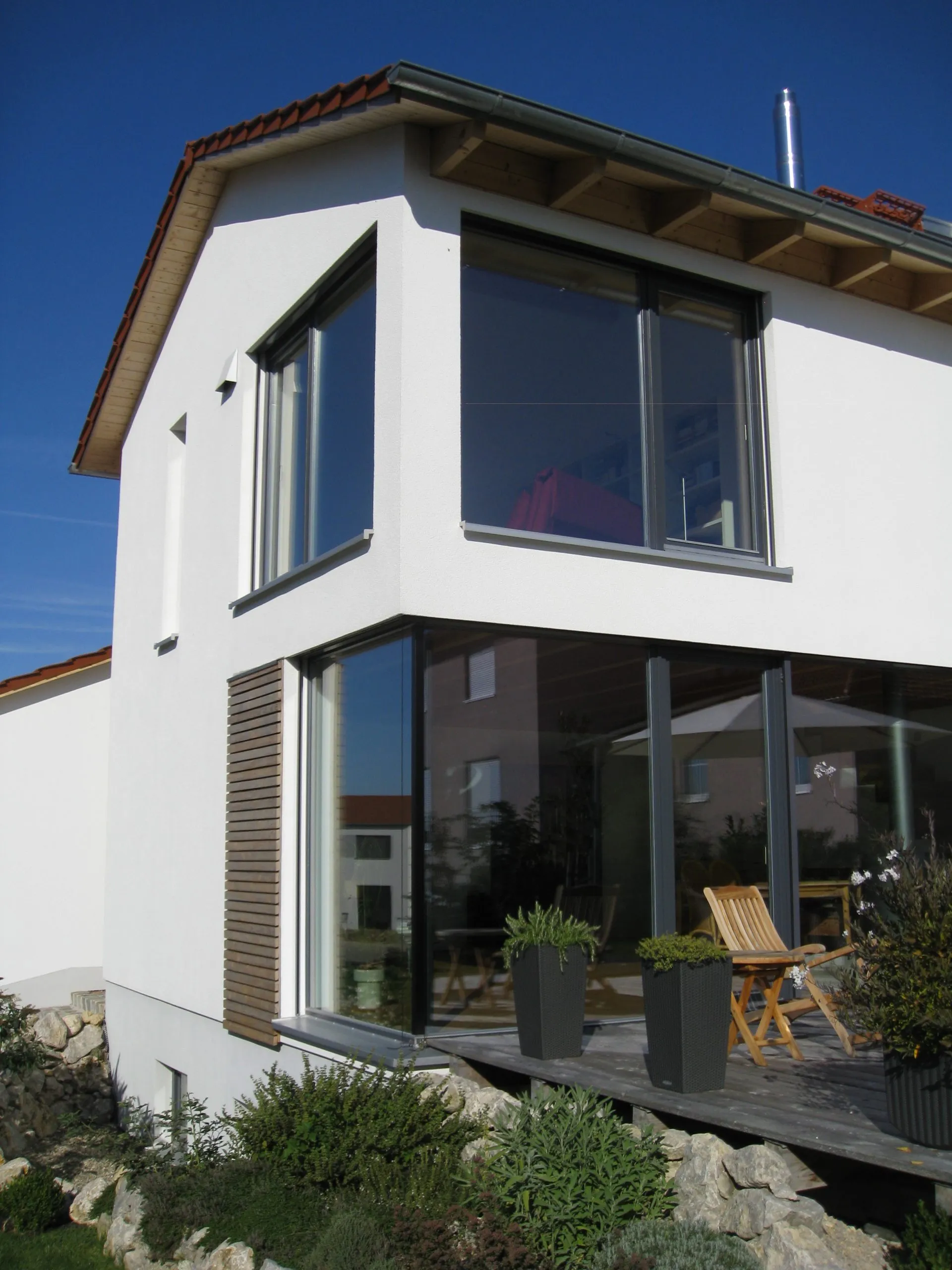Wohnhaus mit Kamin von EG Decke bis über das Dach, Ofen von unten an Kamin angeschlossen
