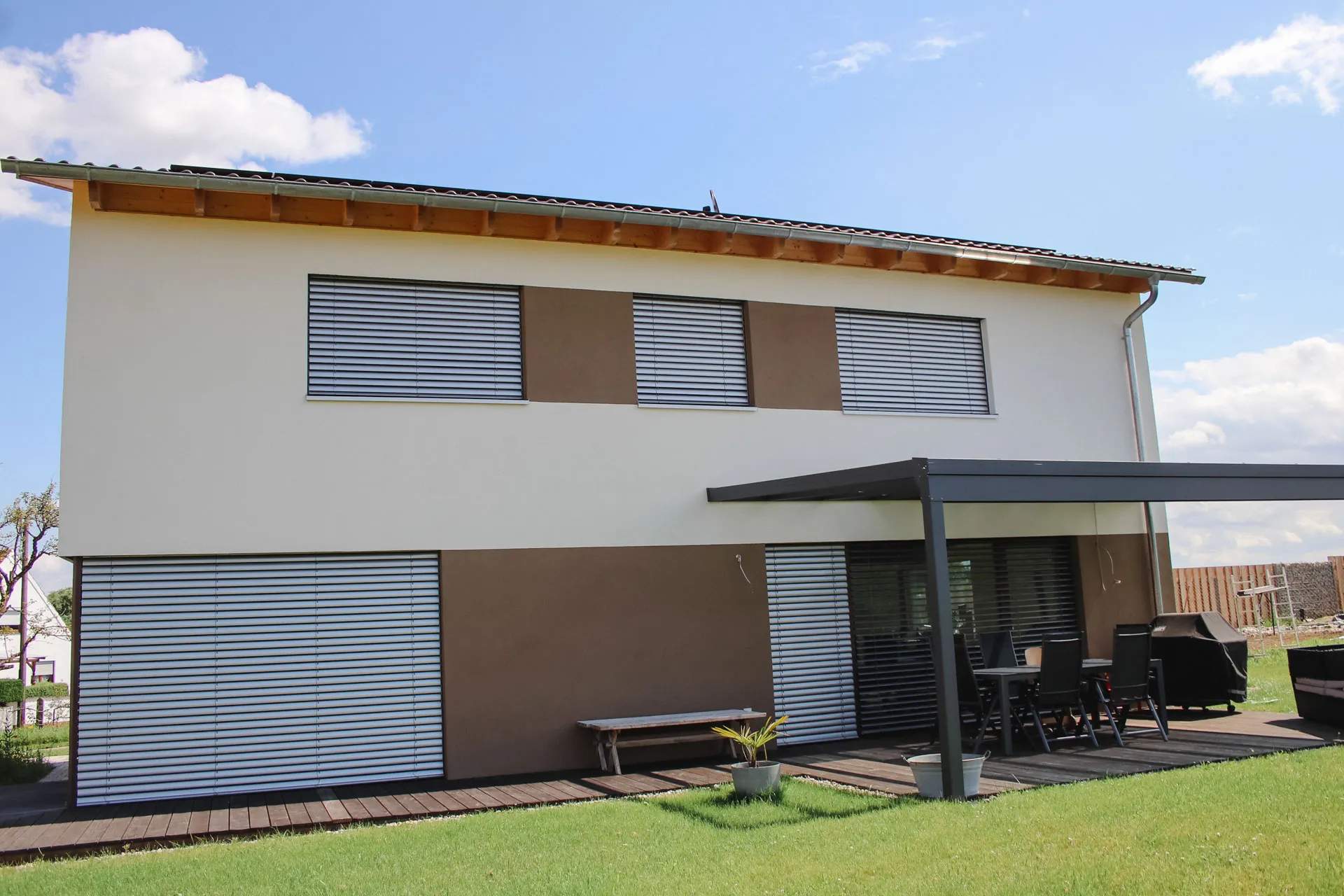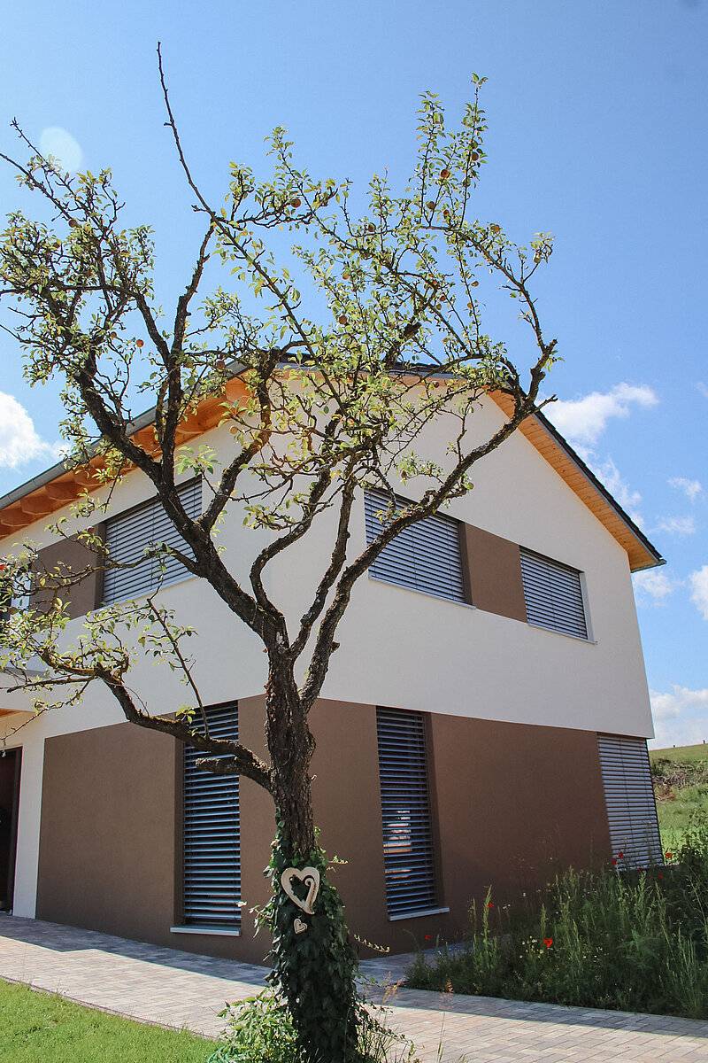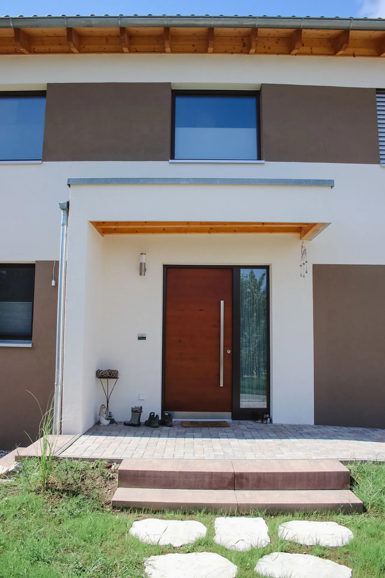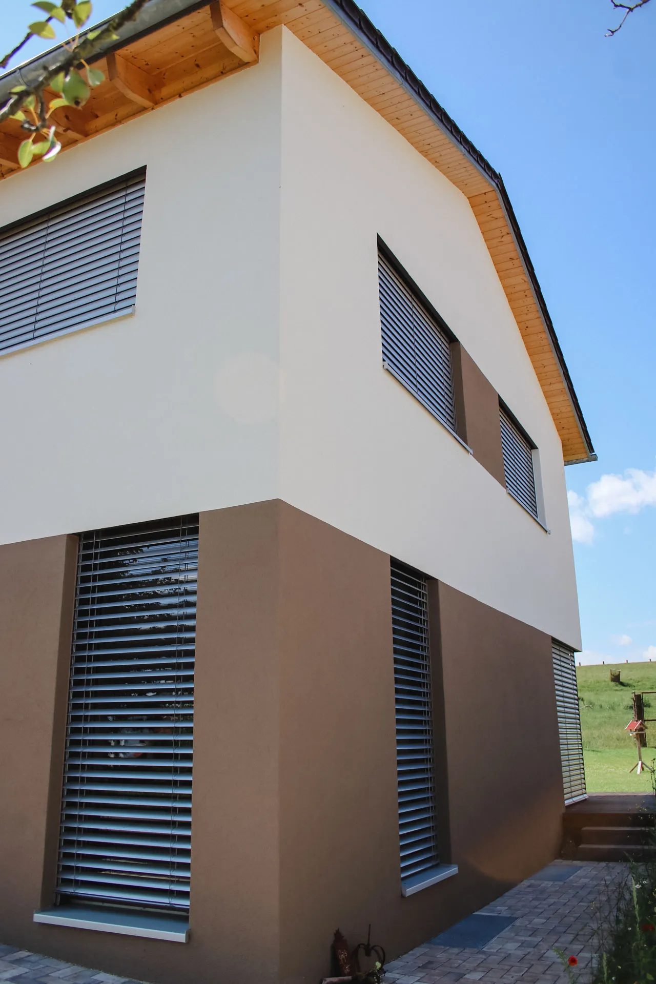 Farbspiel durch zwei Fassadenfarben, Luft-Wärmepumpe im Keller, Eichentreppe mit schwarzen Setzstufen, 6,5-Meter Deckenspannweite im Erdgeschoss ohne Stützen