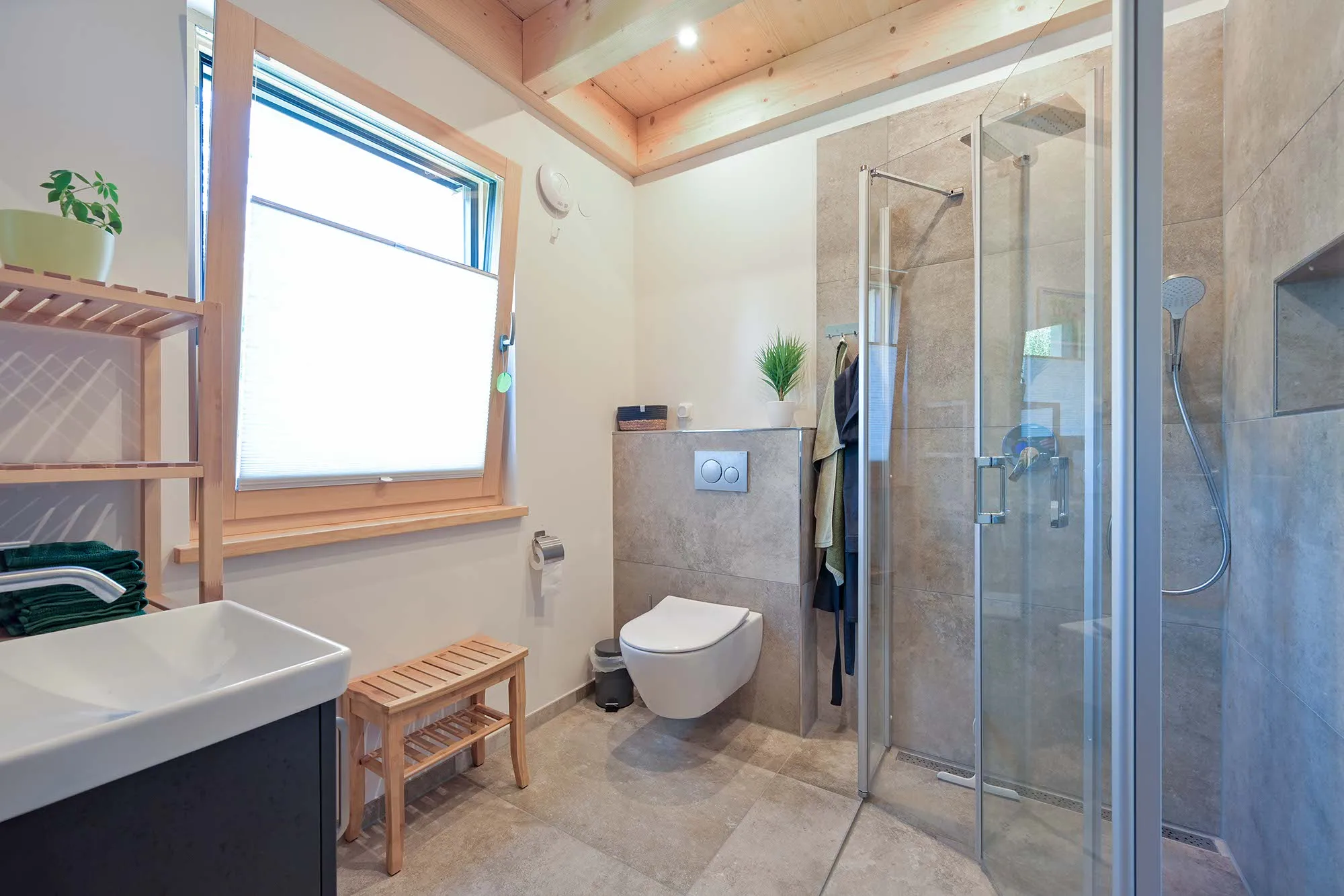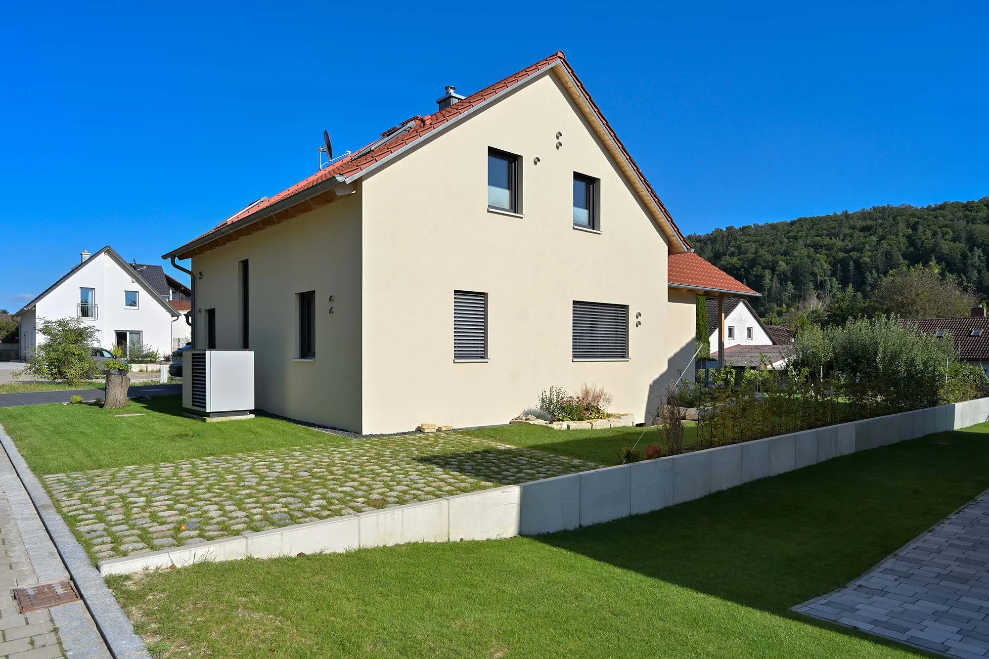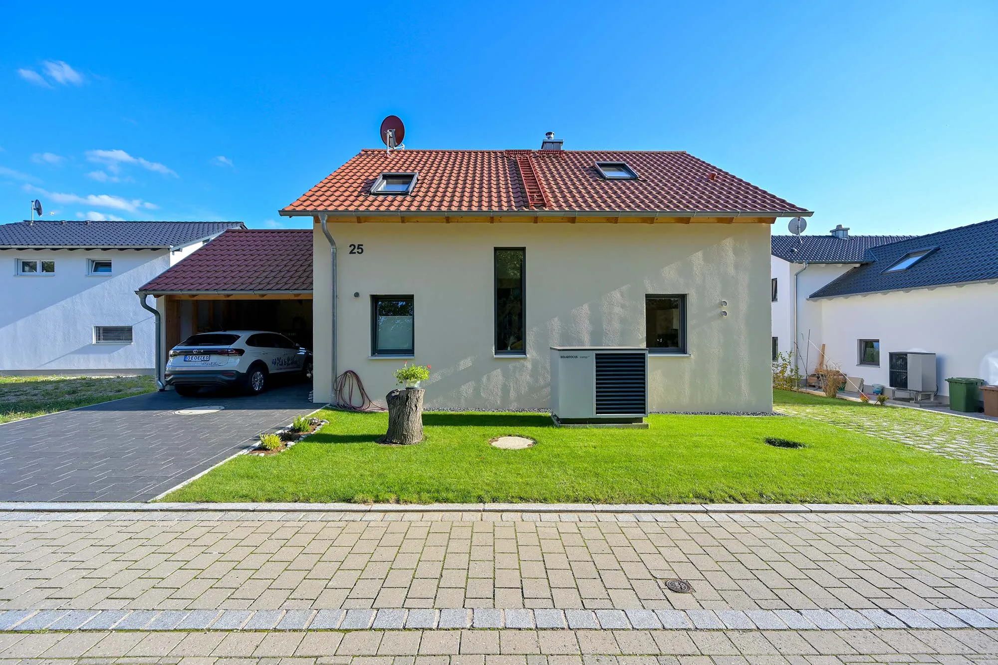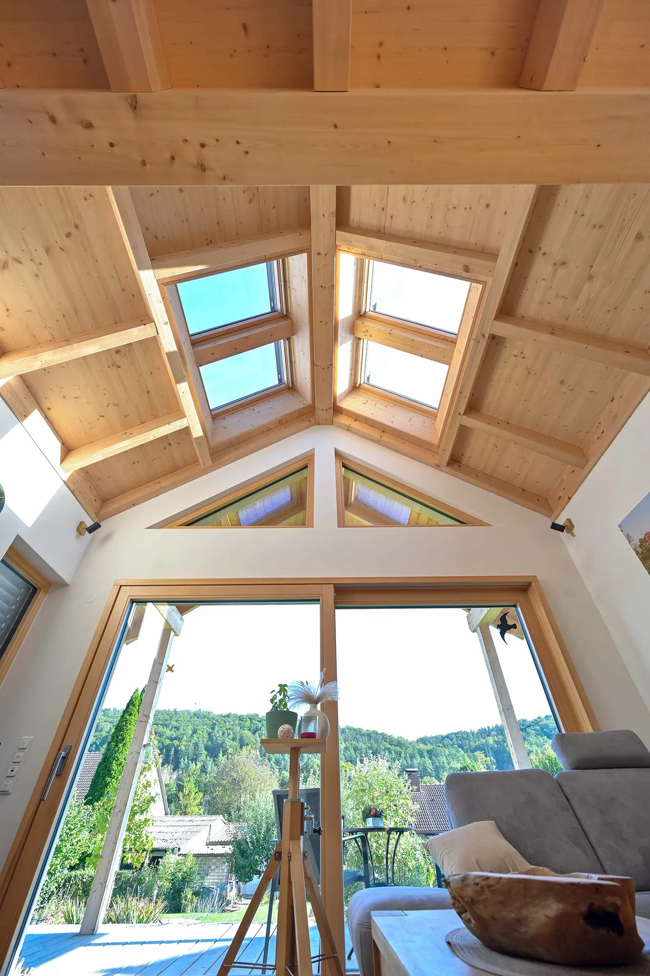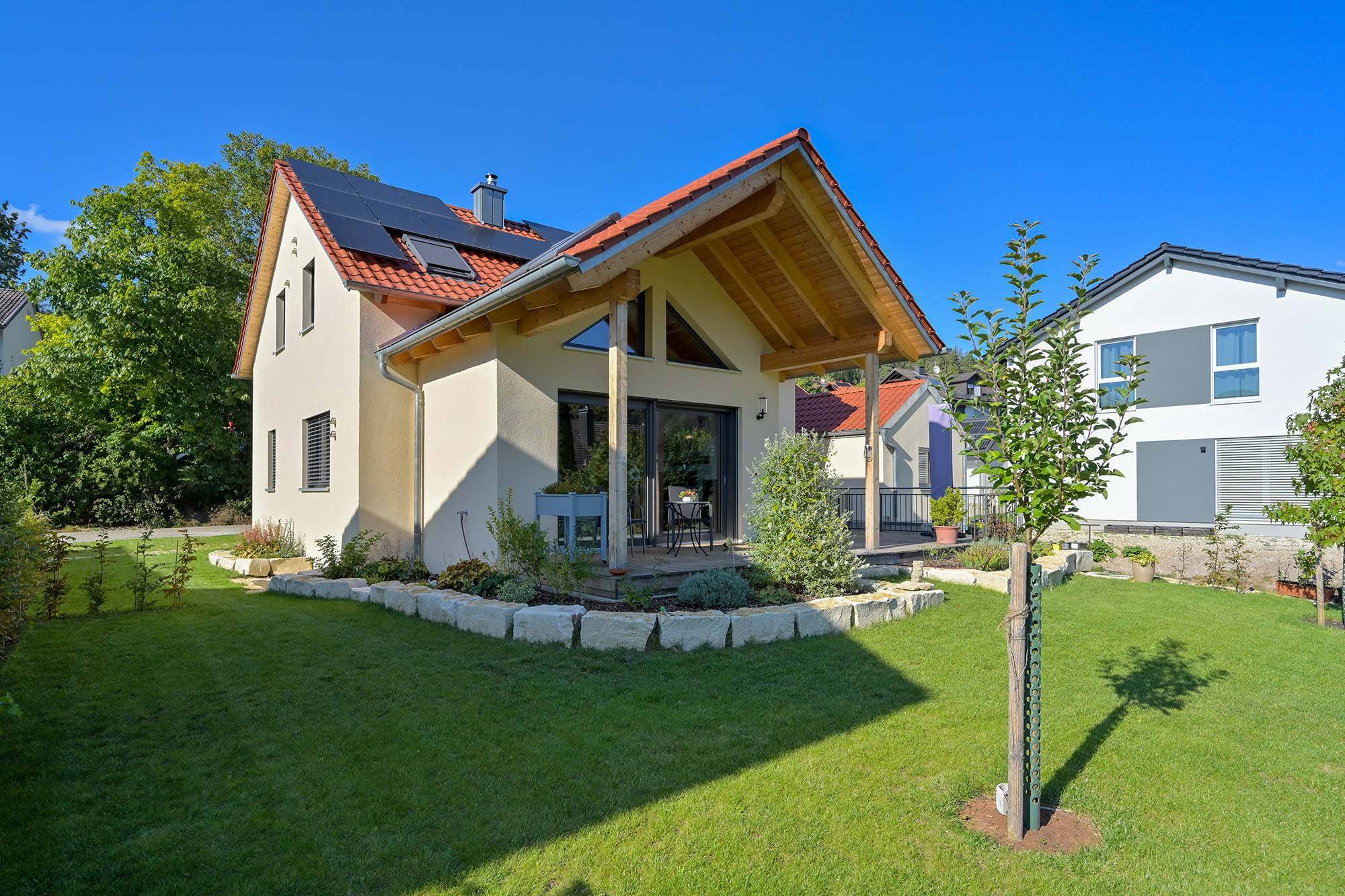 großer Dachüberstand als Terrassenüberdachung, hohes Wohnzimmer mit Dachfenster, am Carport angeschlossener Geräteraum, Drempelwand im OG bei Dachschrägen als Stauraum