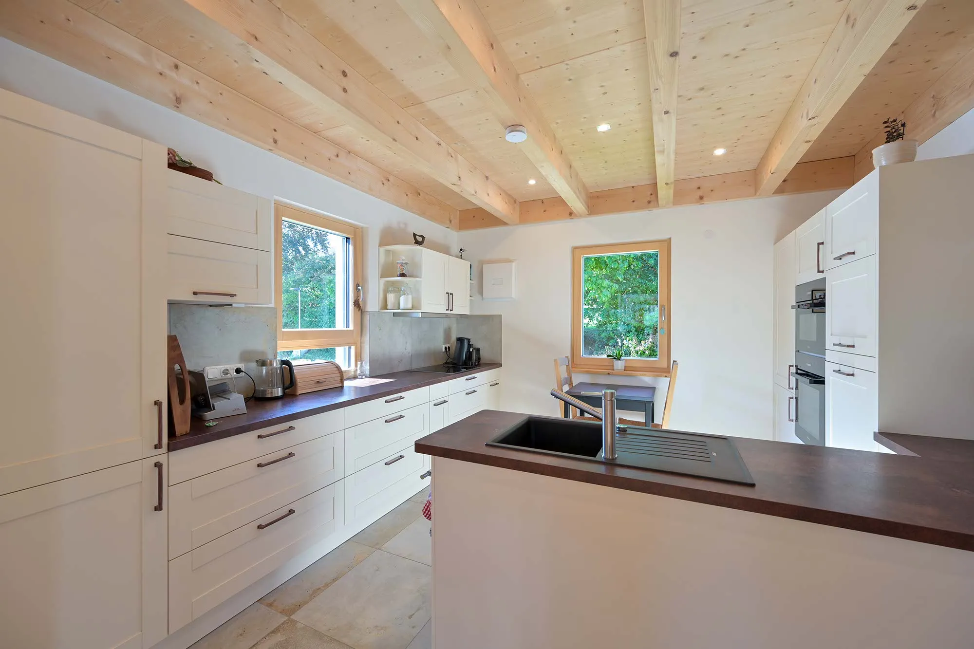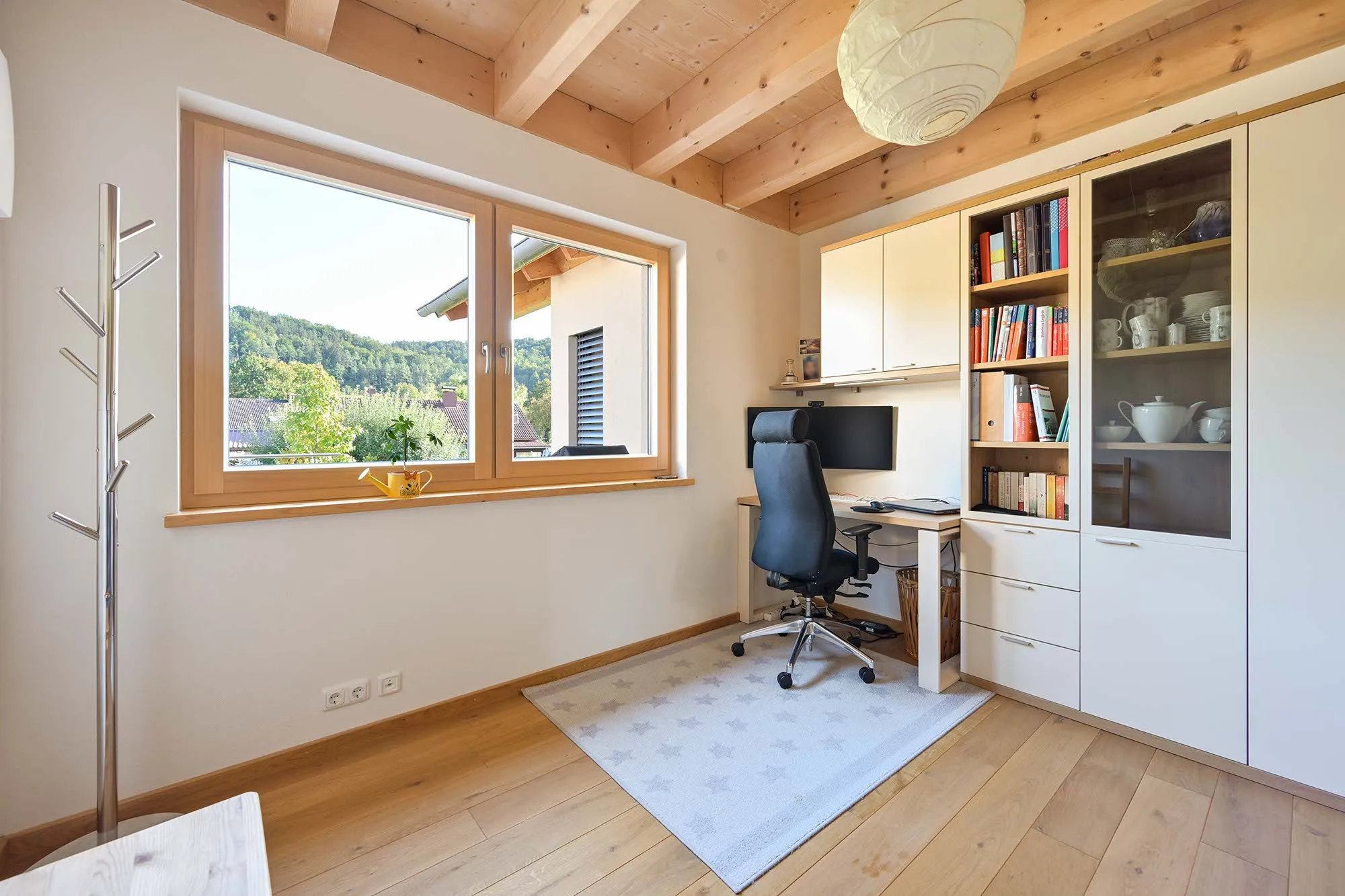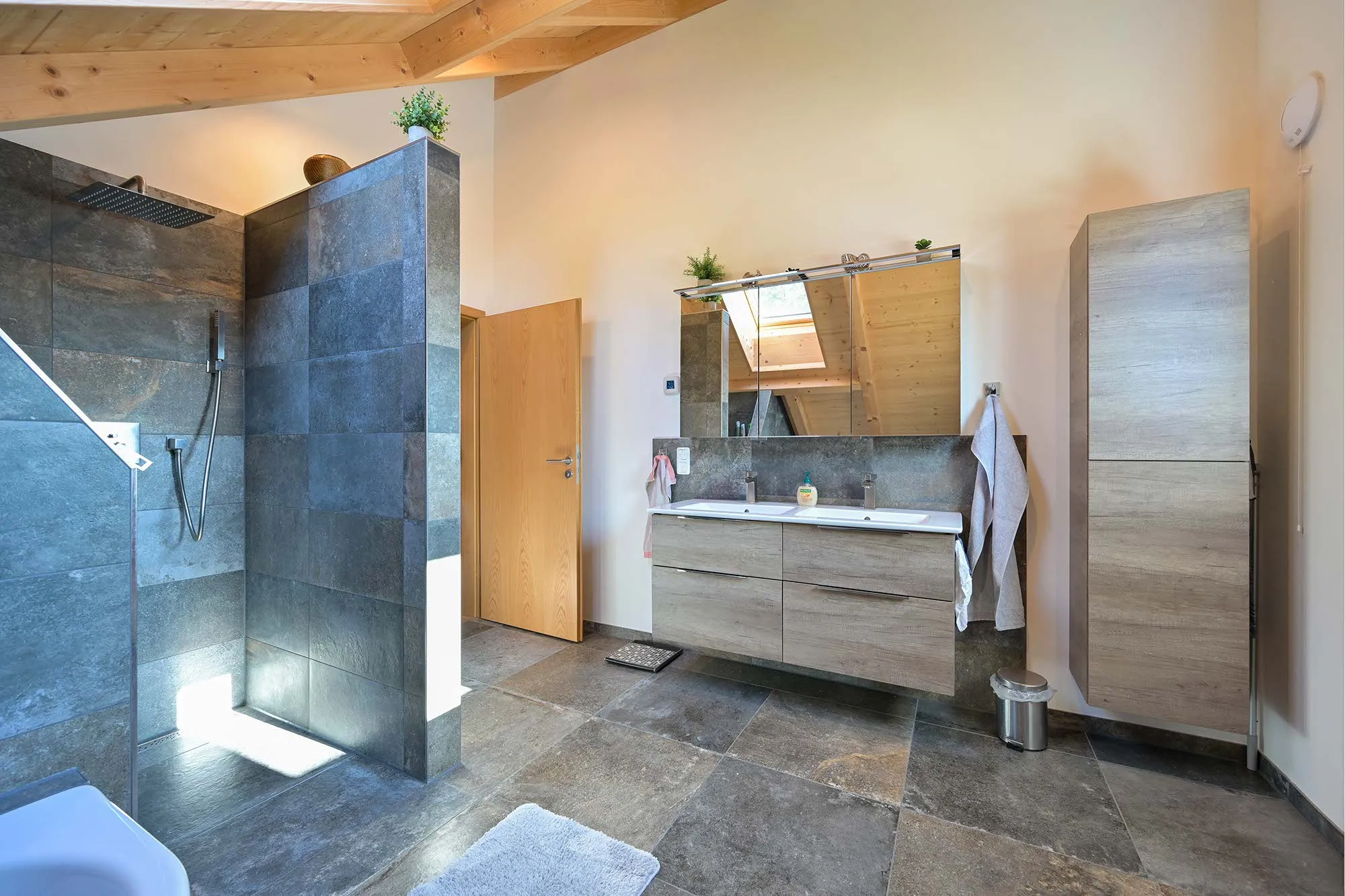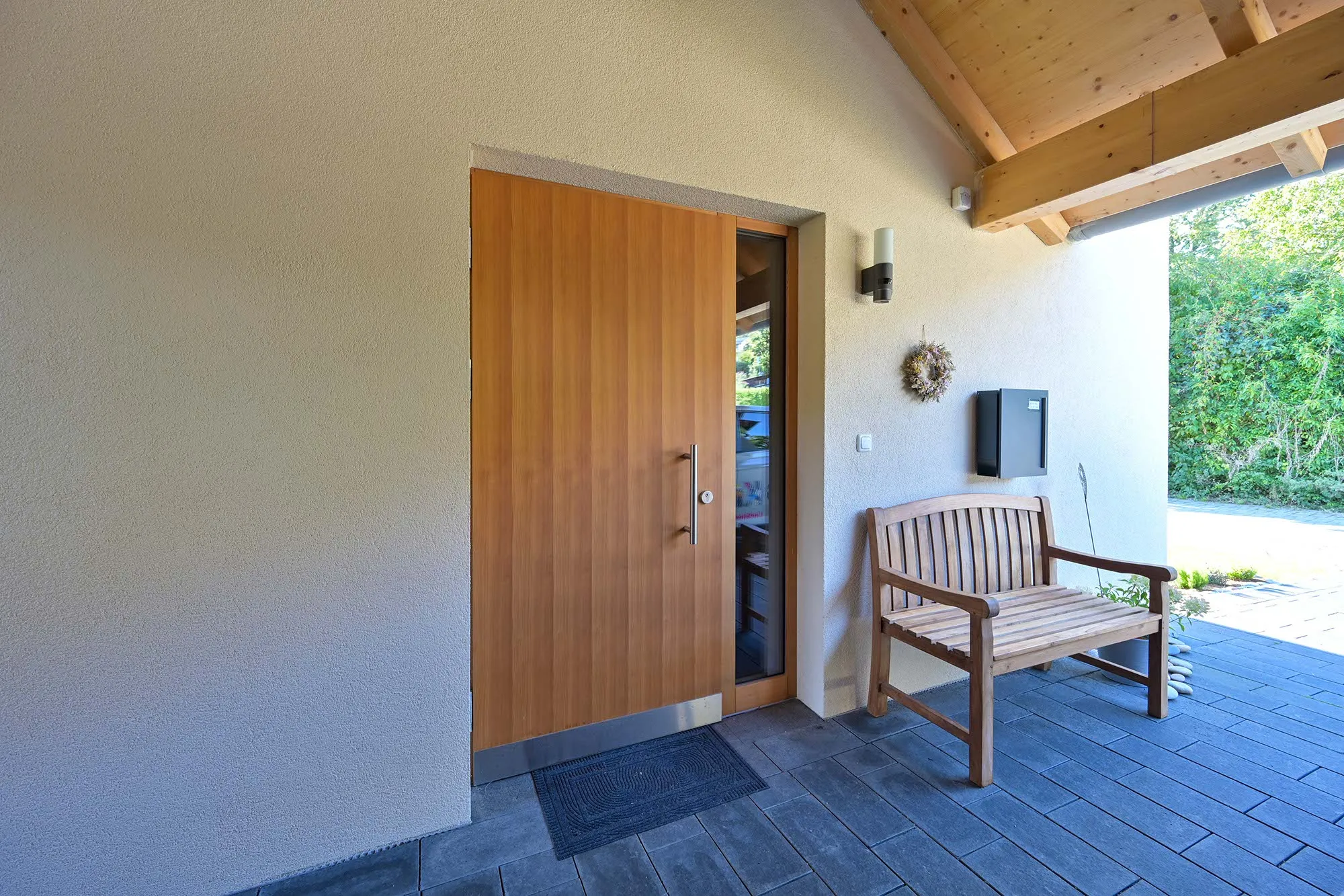 großer Dachüberstand als Terrassenüberdachung, hohes Wohnzimmer mit Dachfenster, am Carport angeschlossener Geräteraum, Drempelwand im OG bei Dachschrägen als Stauraum