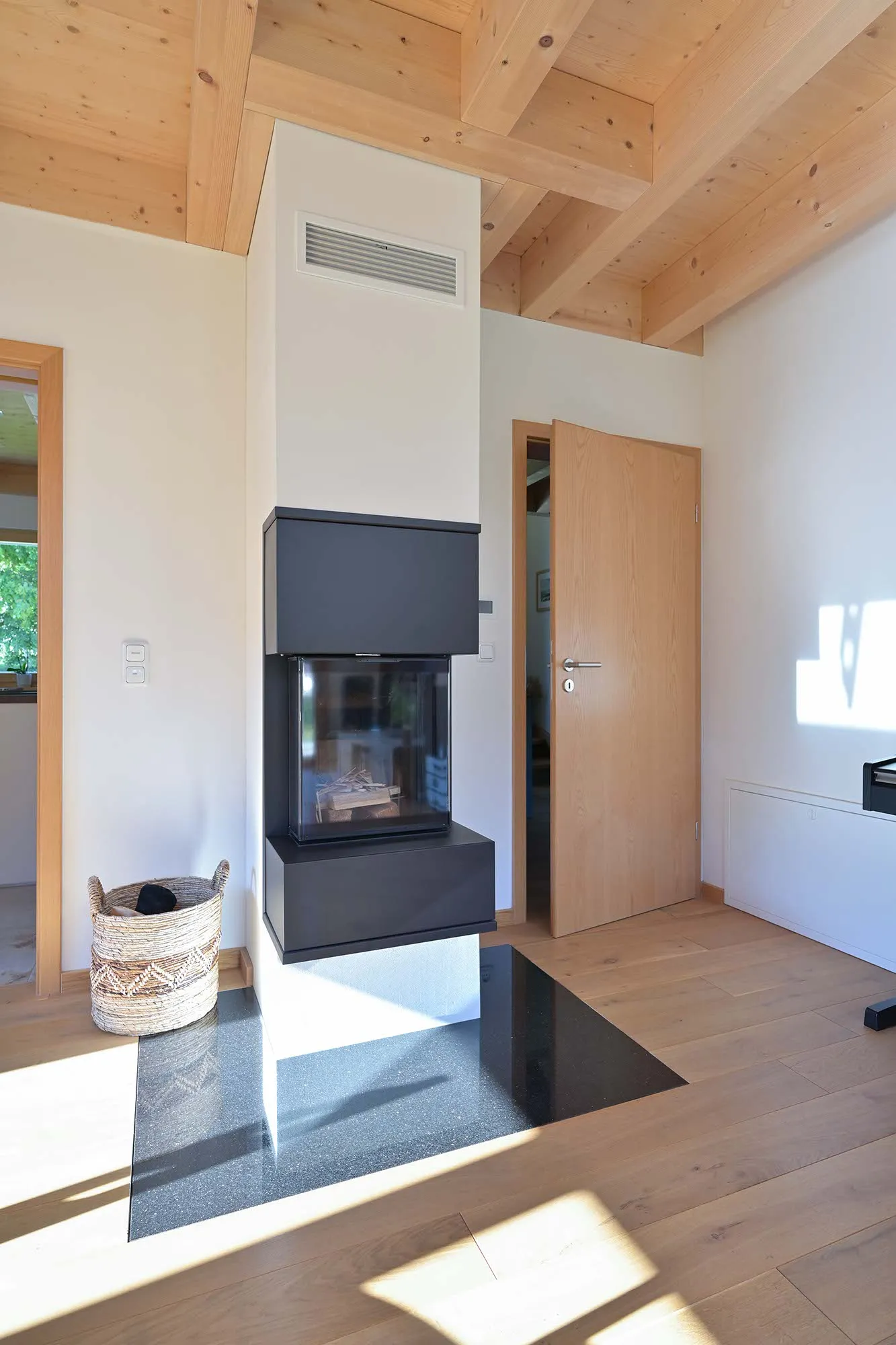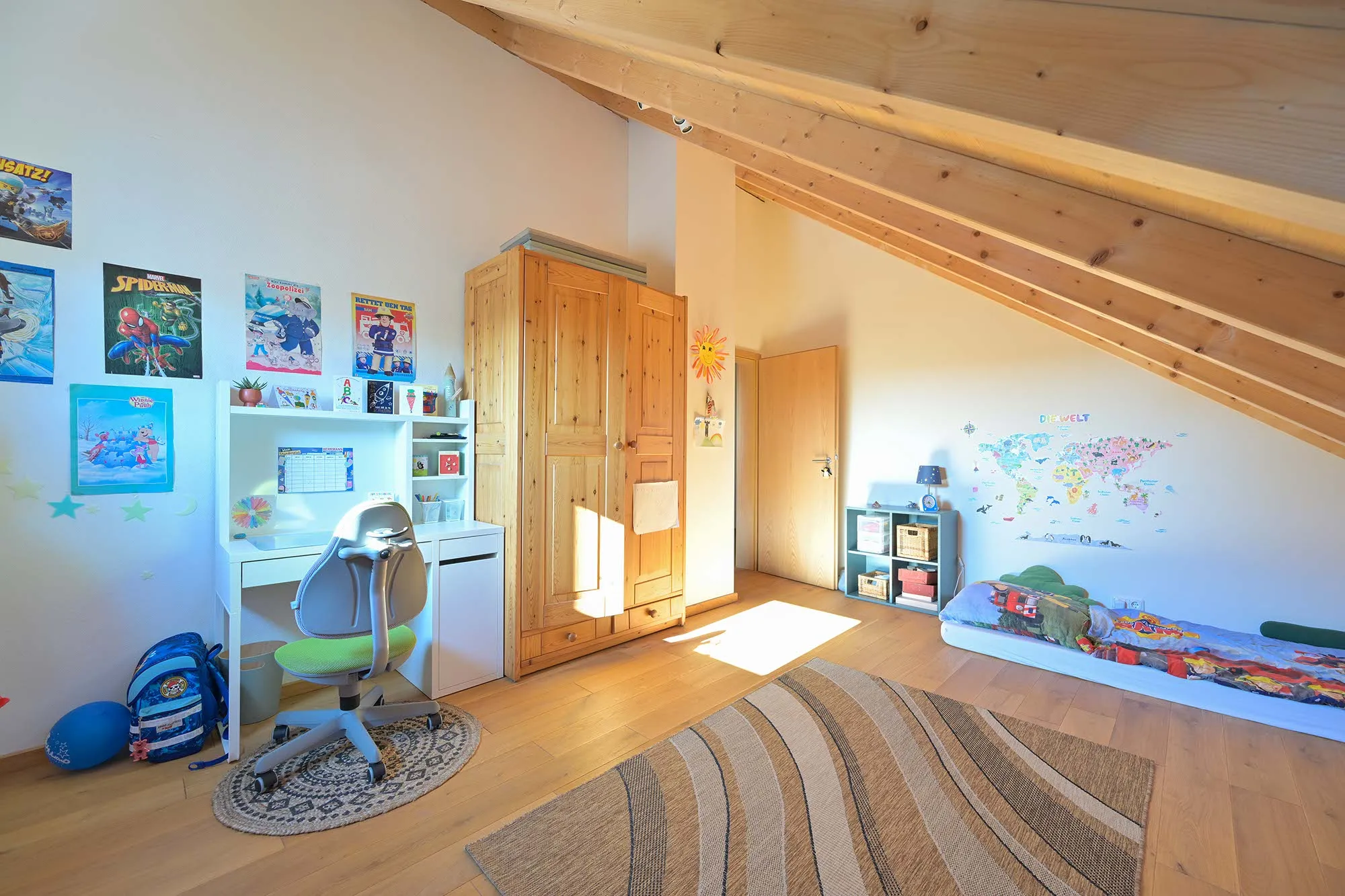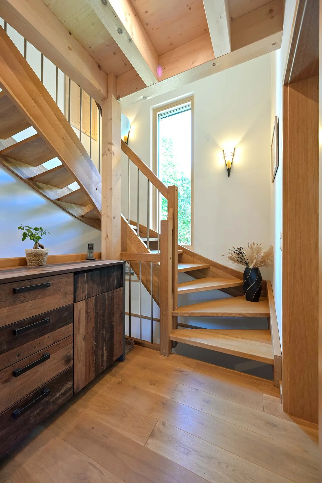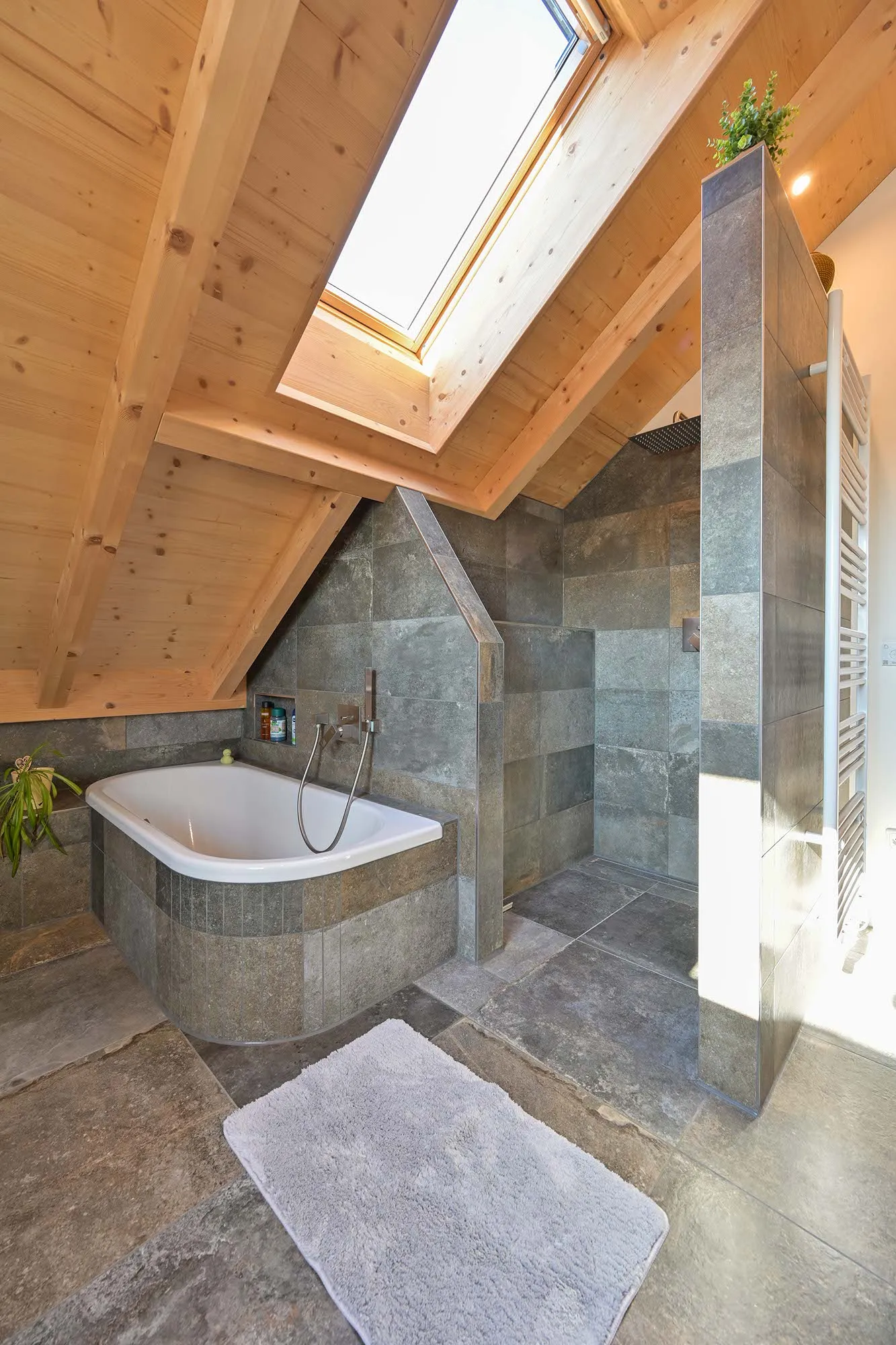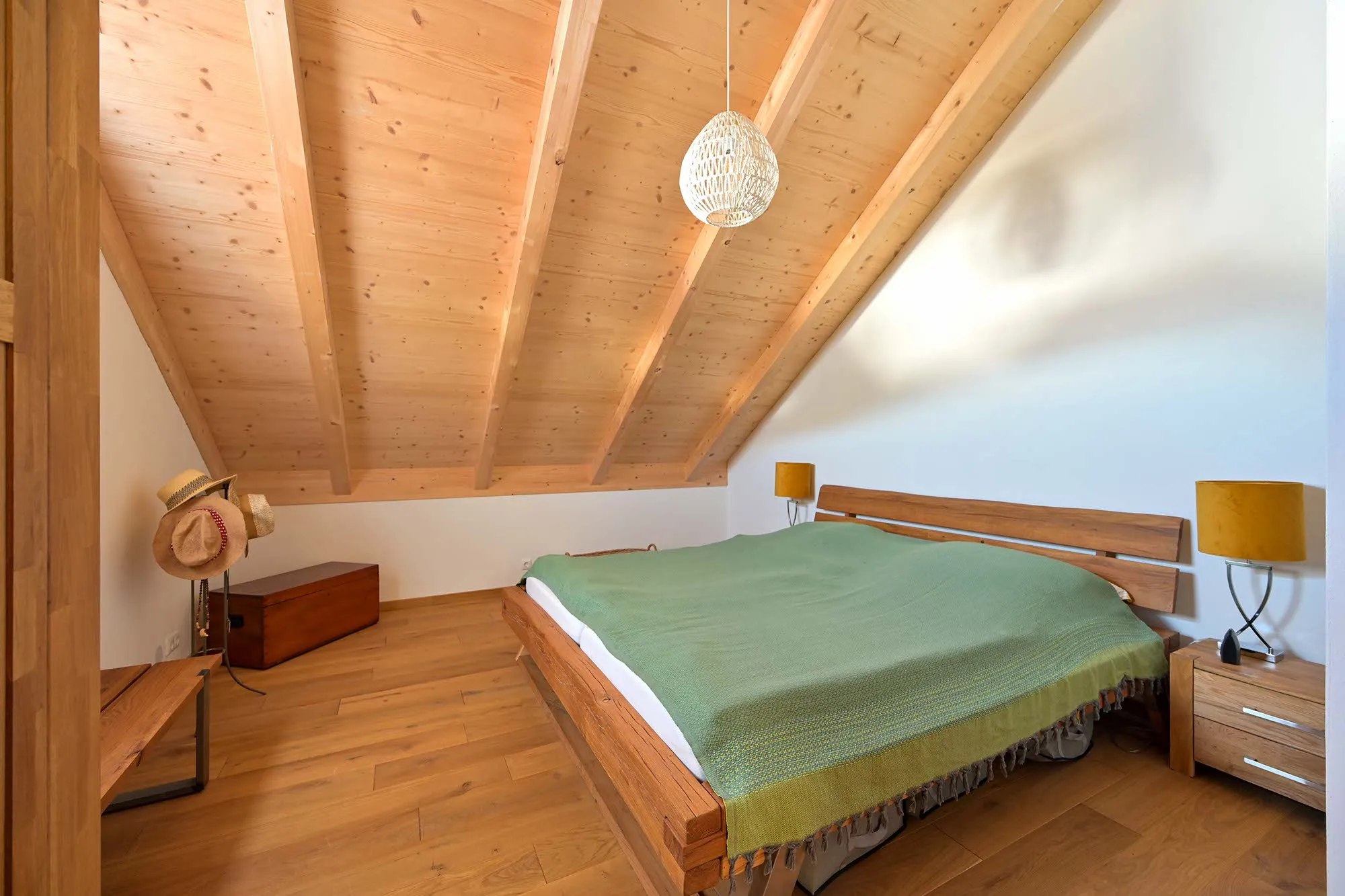 großer Dachüberstand als Terrassenüberdachung, hohes Wohnzimmer mit Dachfenster, am Carport angeschlossener Geräteraum, Drempelwand im OG bei Dachschrägen als Stauraum