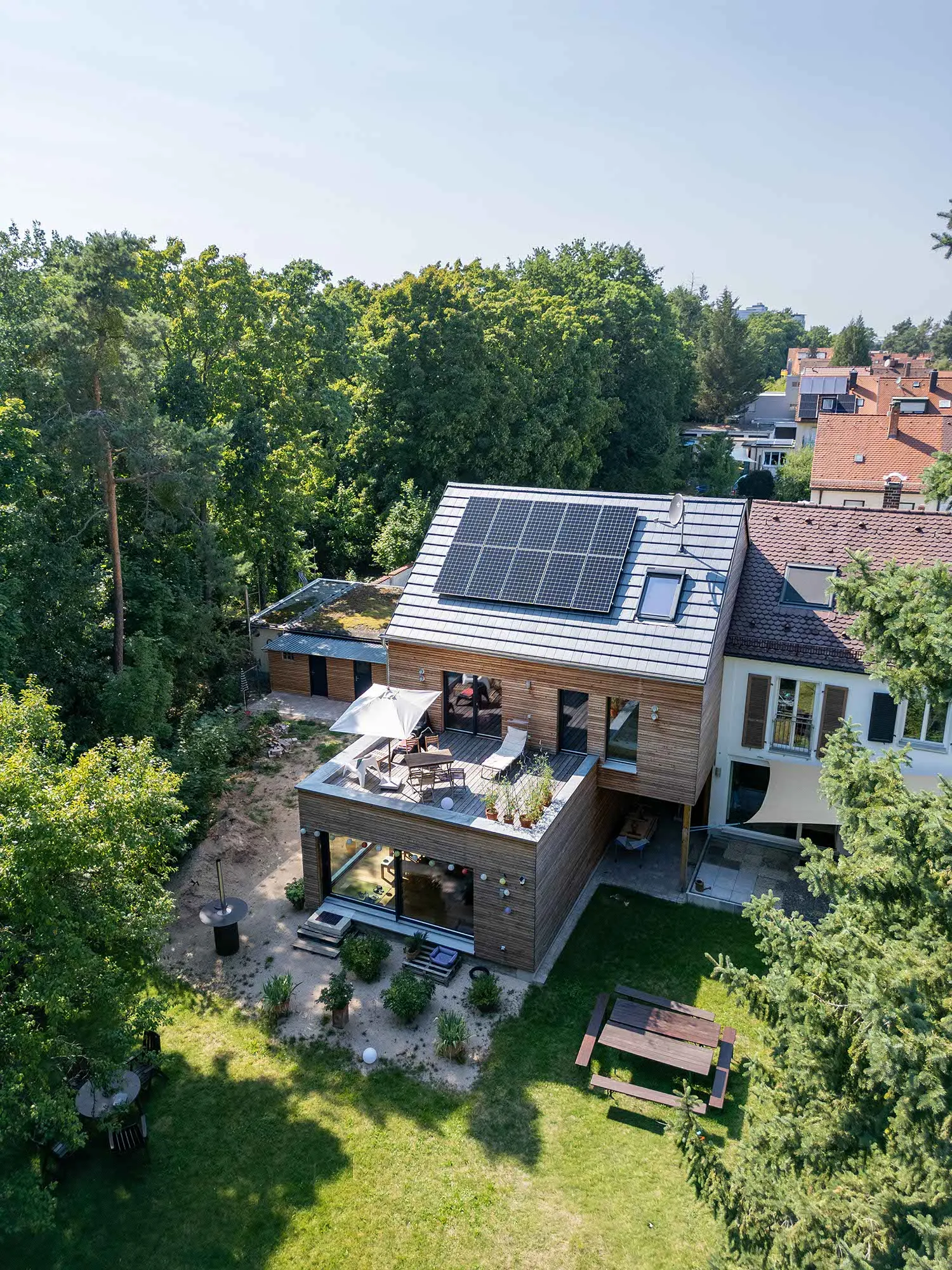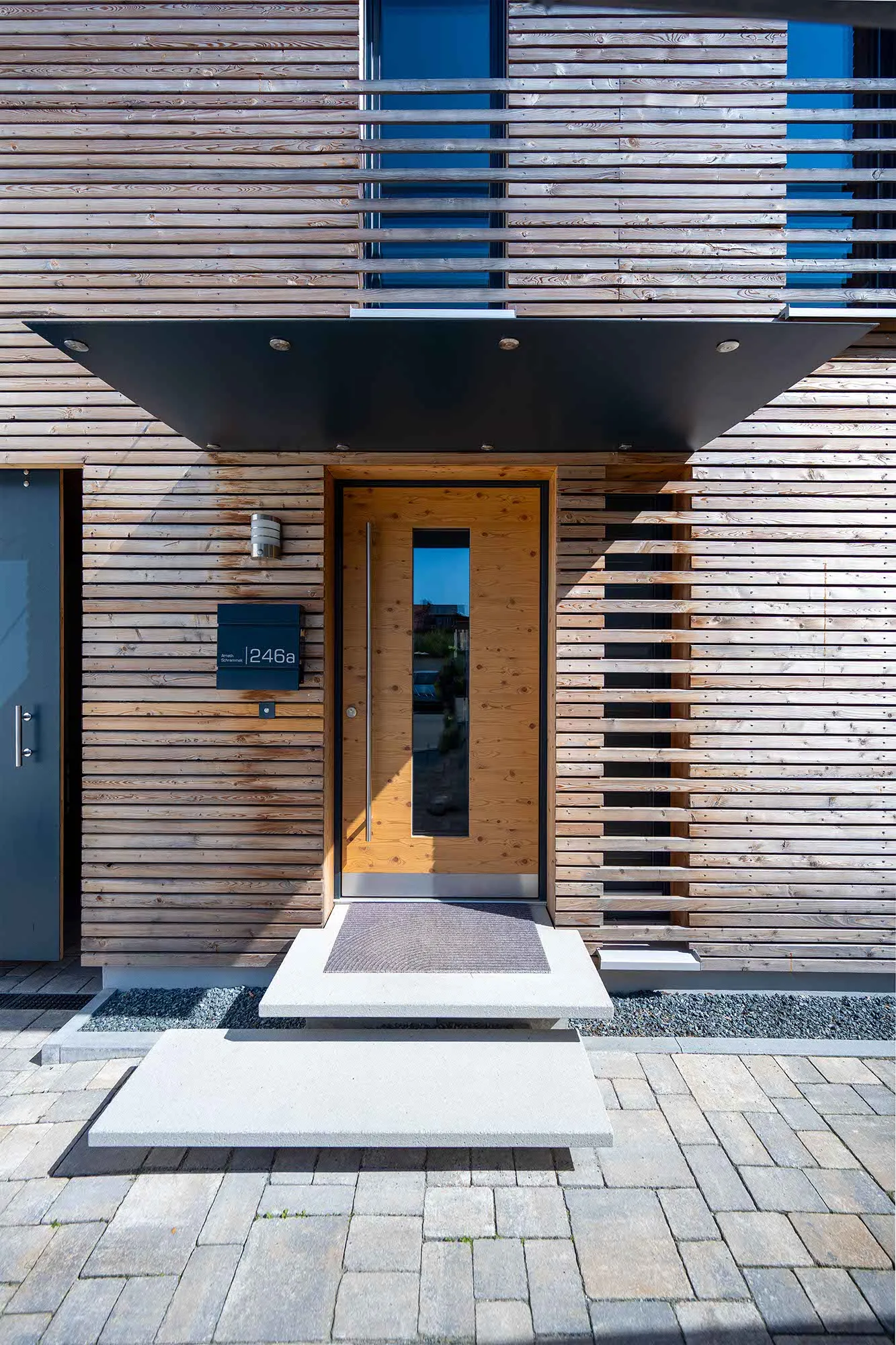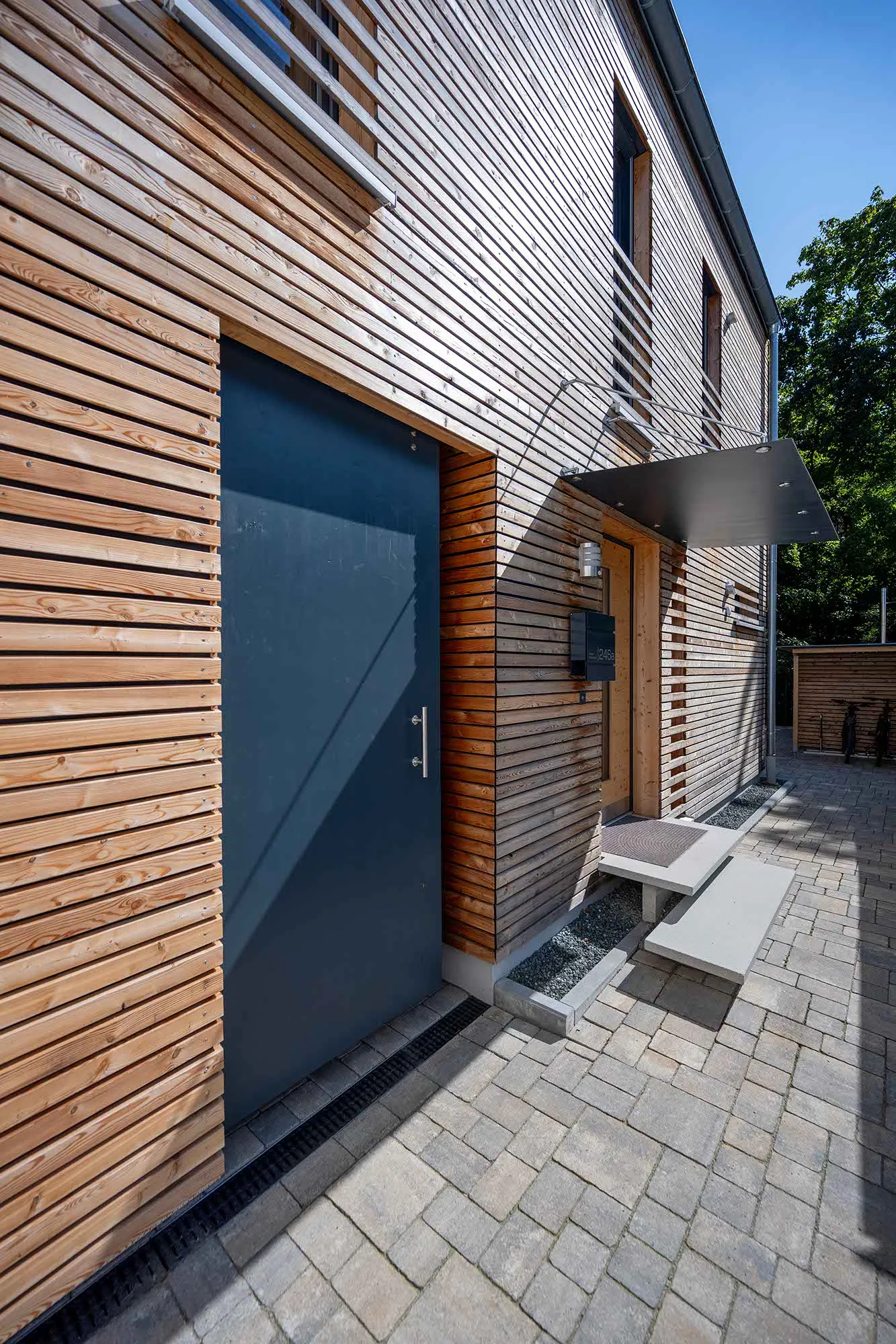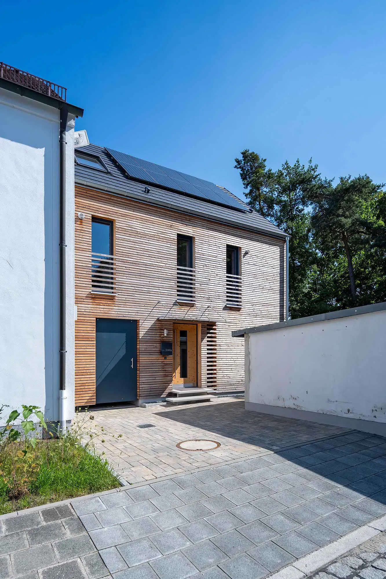 Reihenendhaus, Naturholzfassade, zwei Vollgeschosse und Dachgeschoss mit zwei kleinen Büros