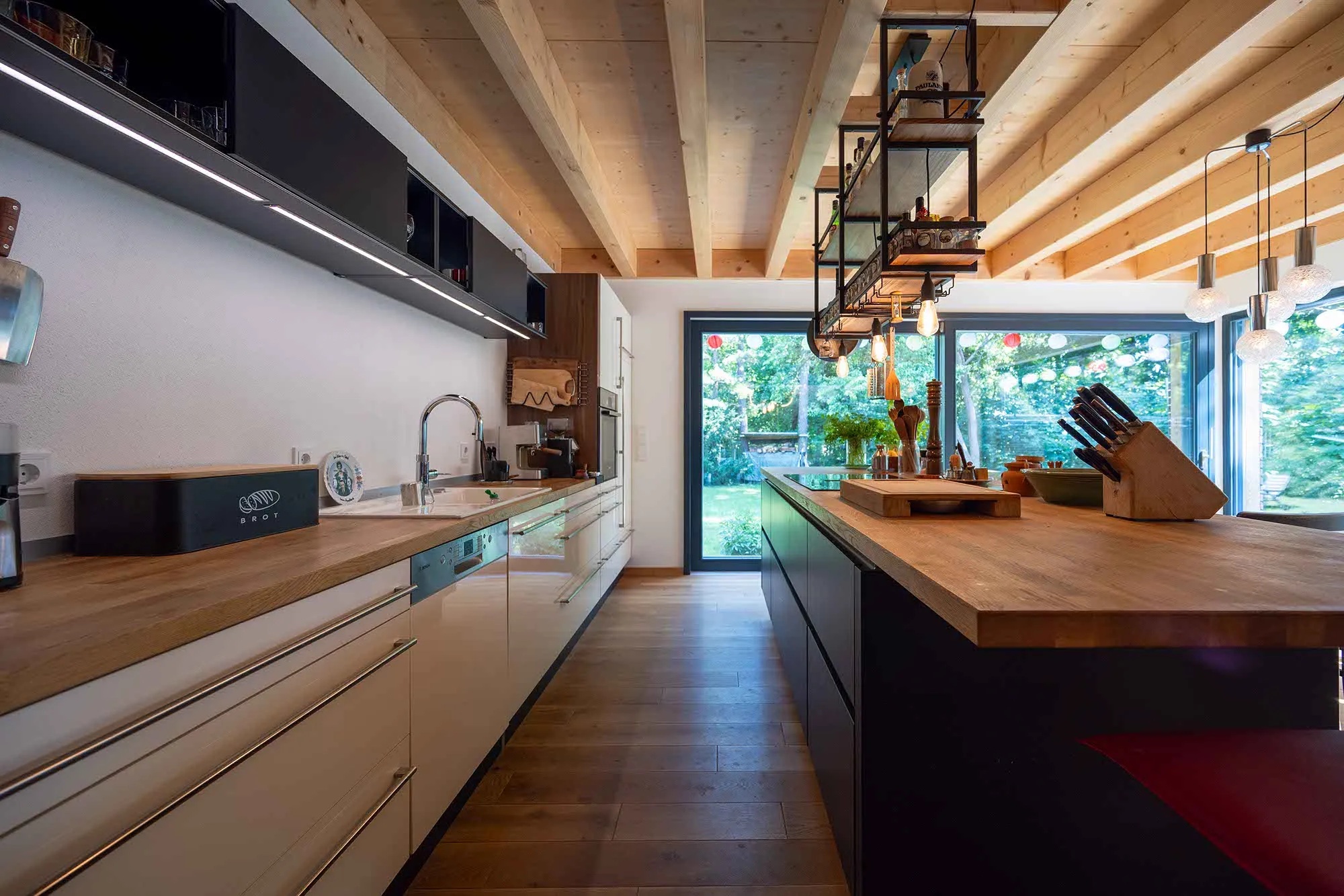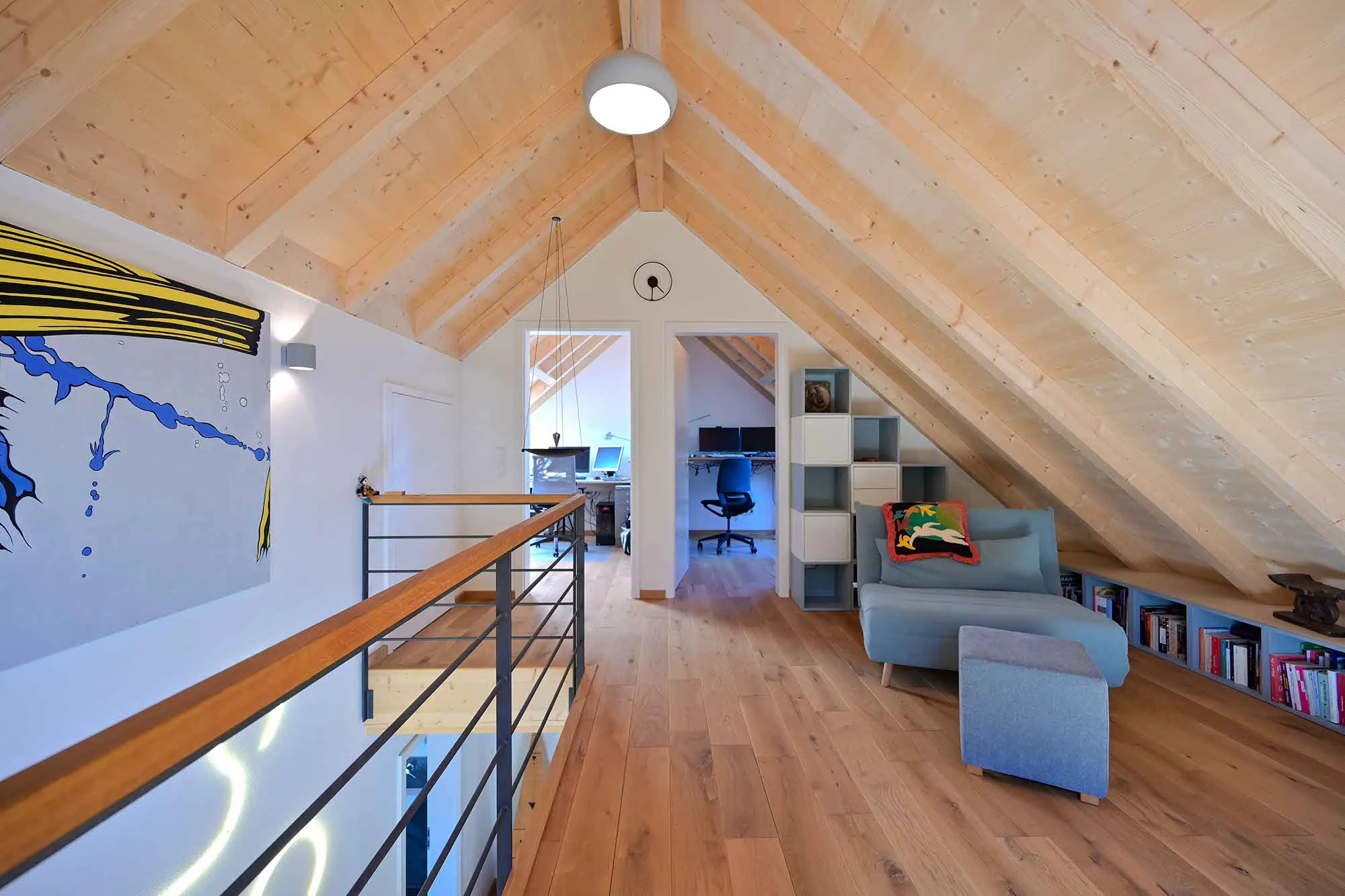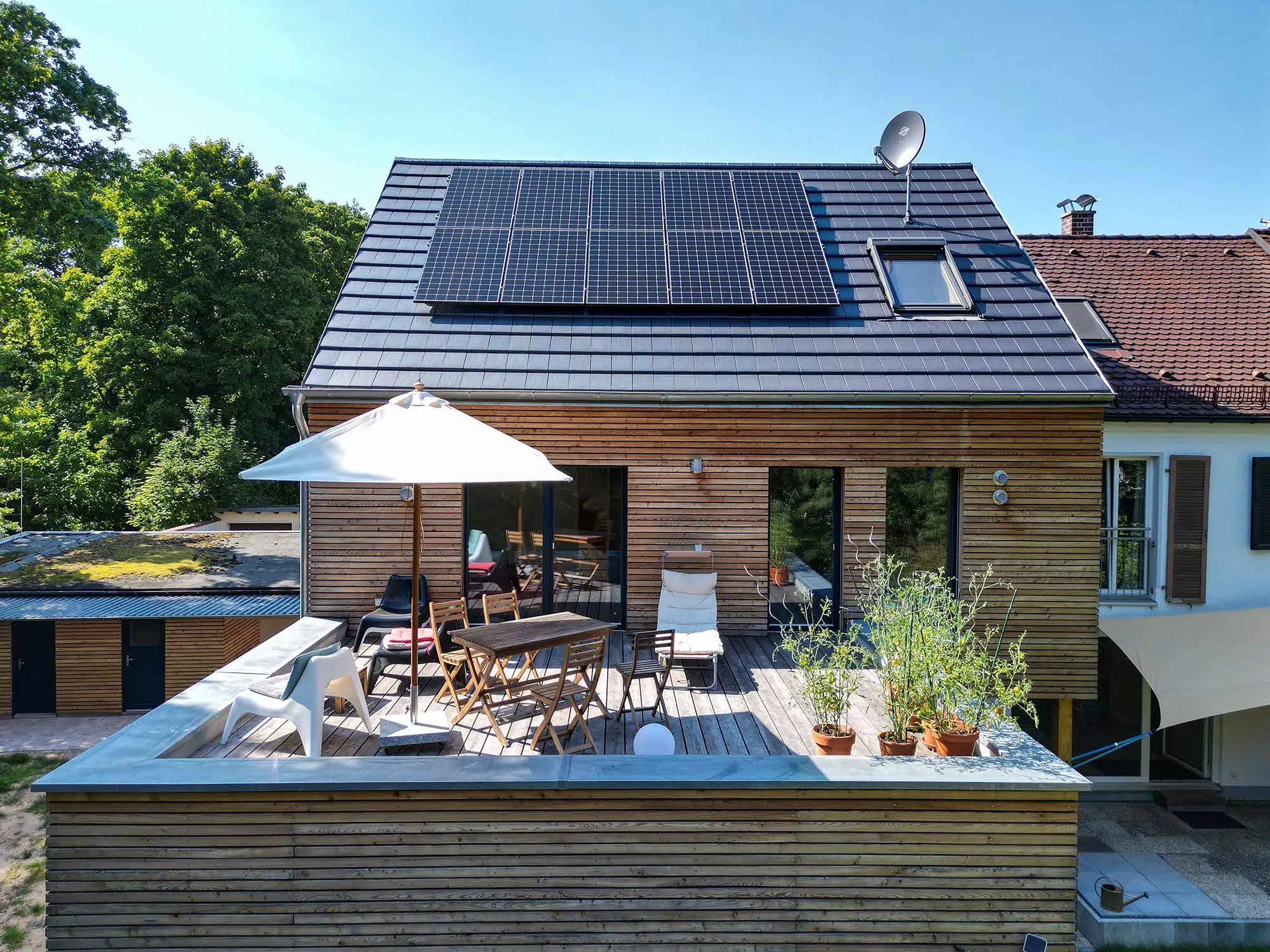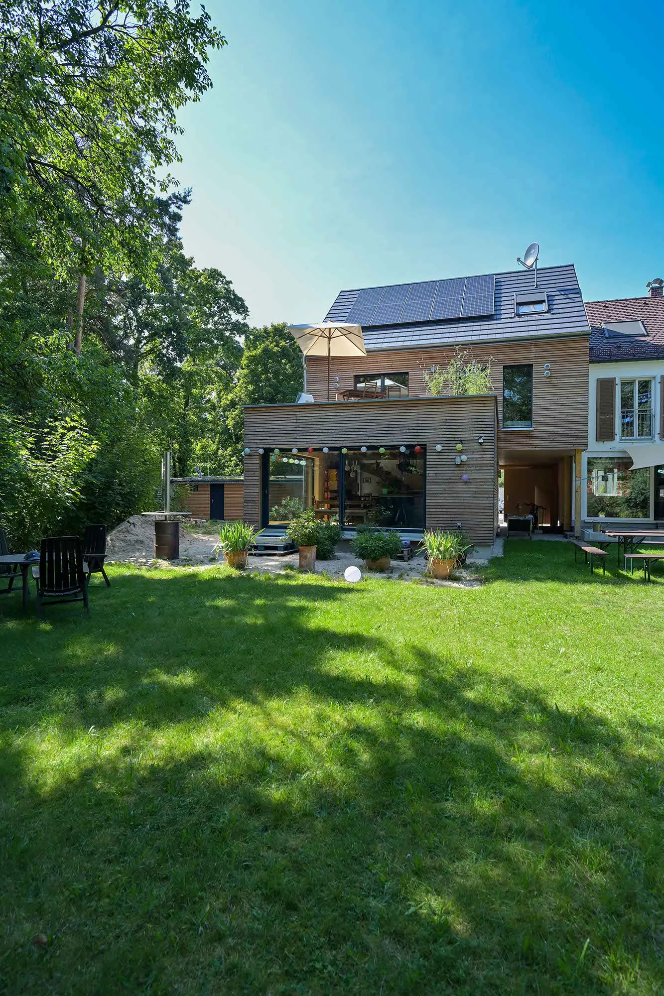 Reihenendhaus, Naturholzfassade, zwei Vollgeschosse und Dachgeschoss mit zwei kleinen Büros