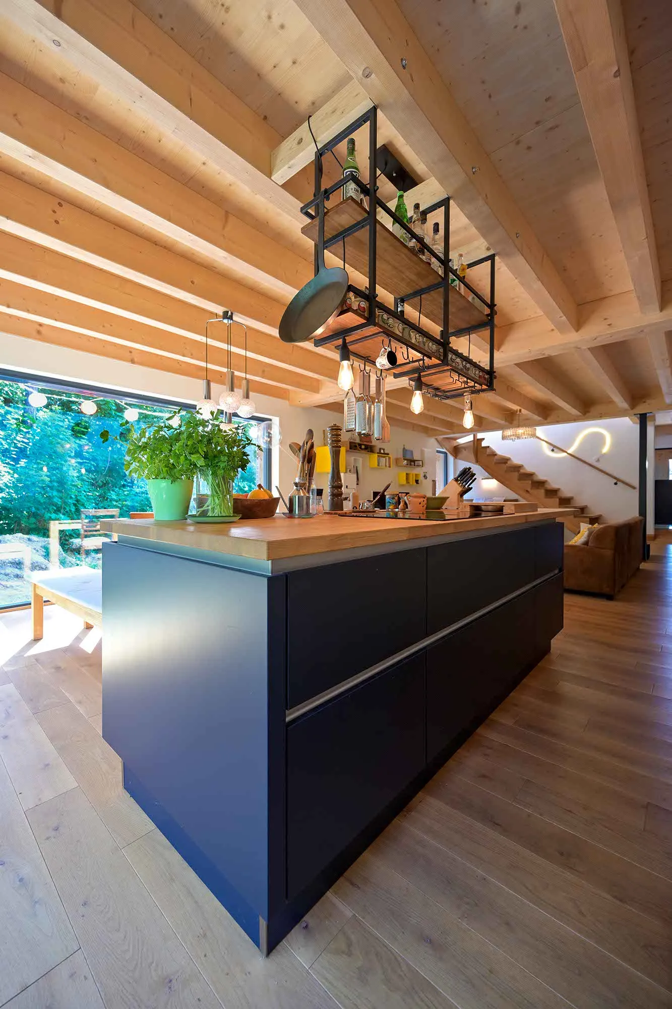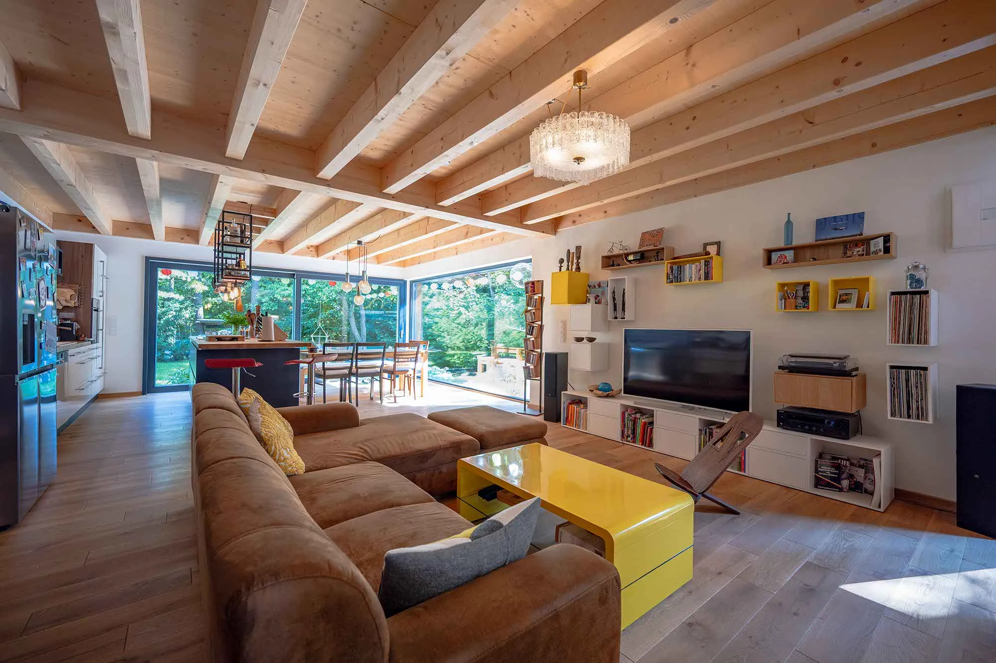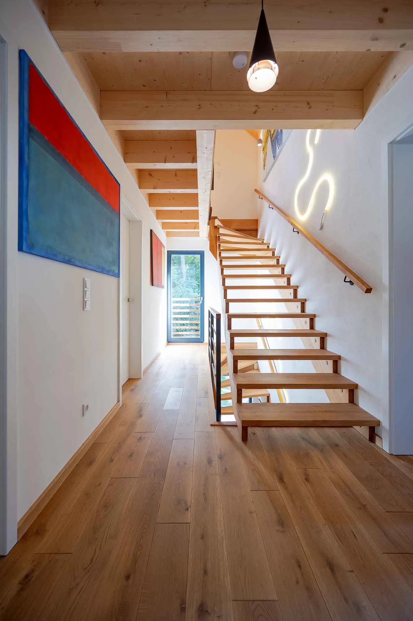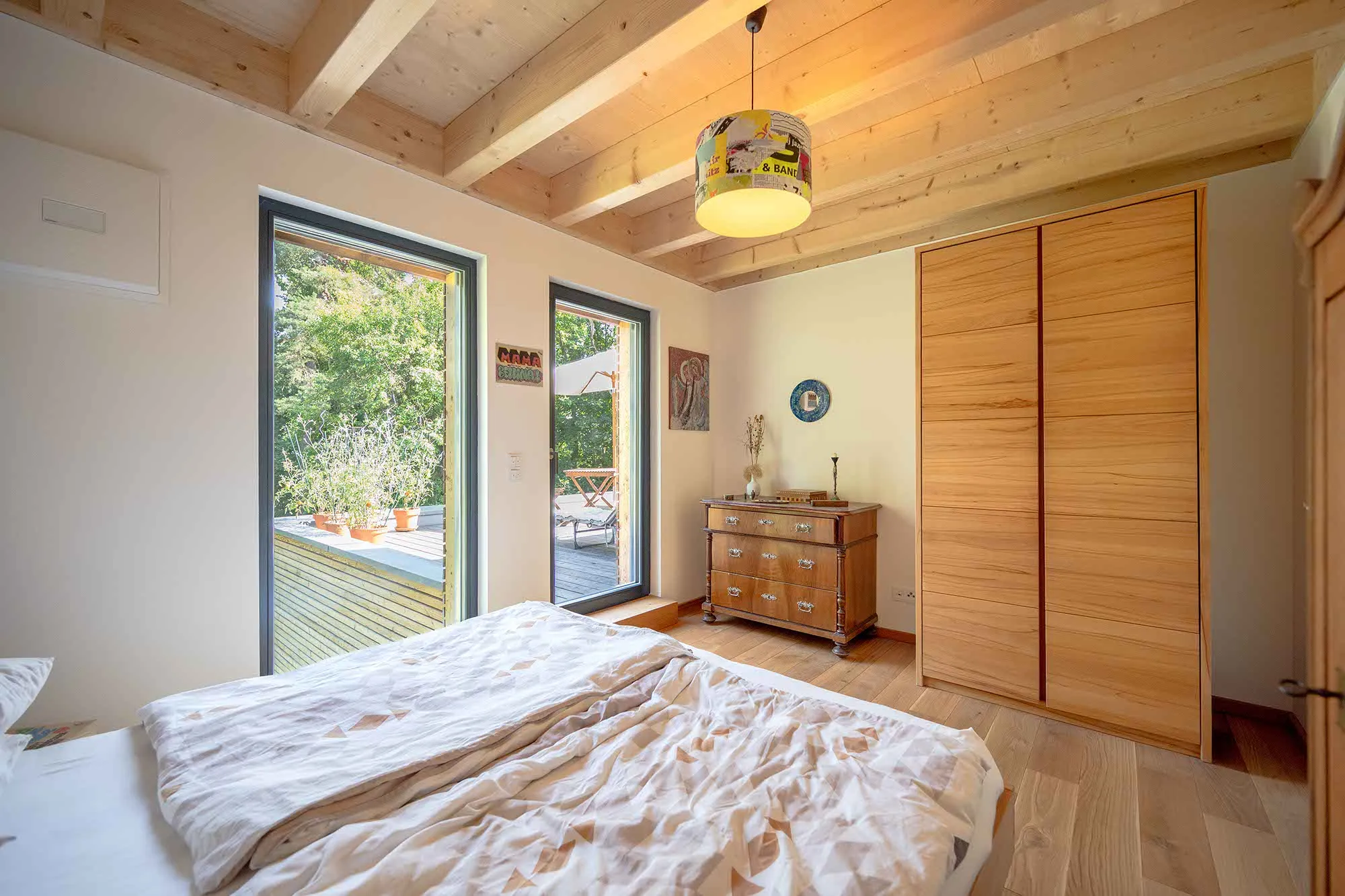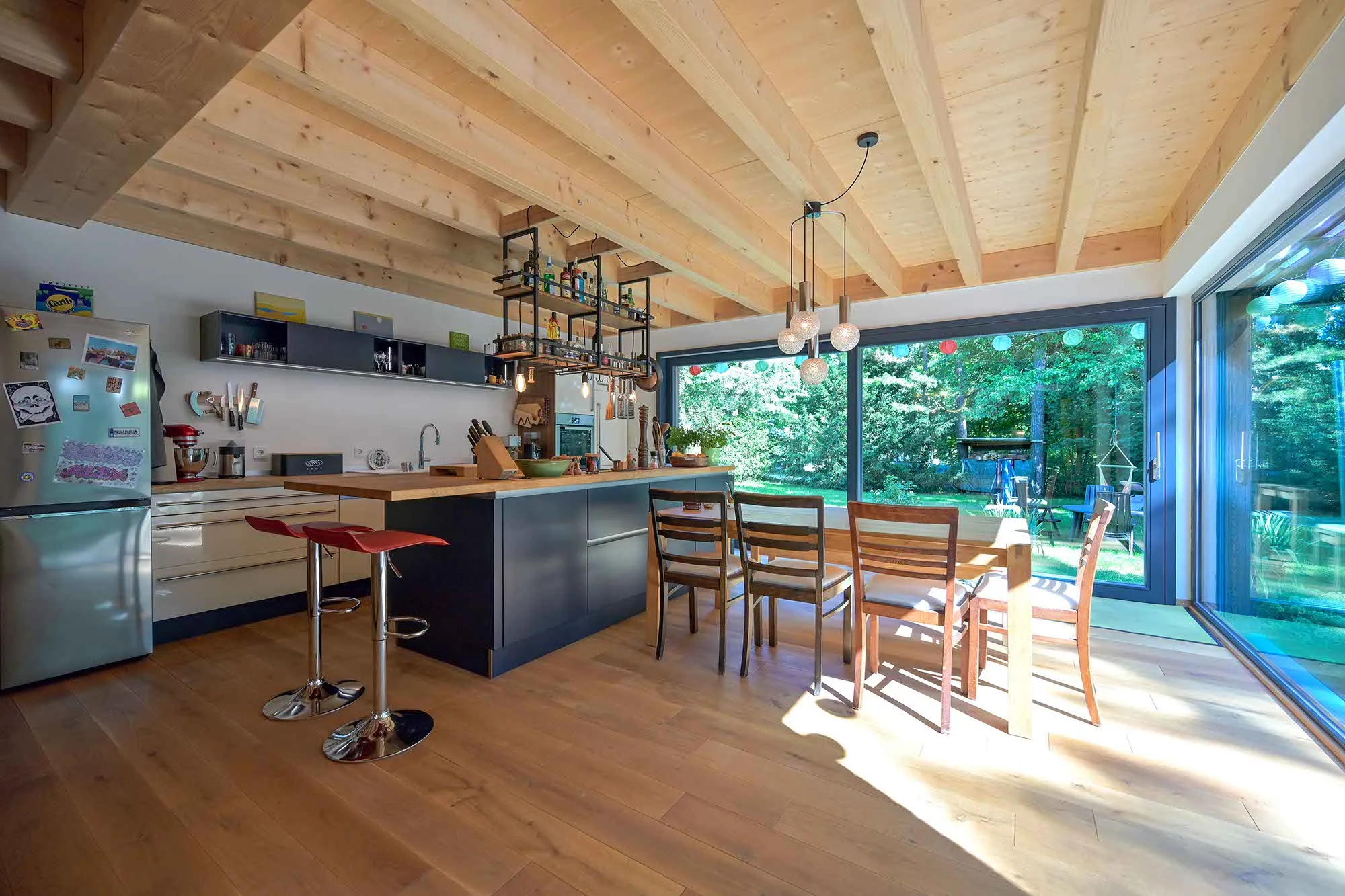 Reihenendhaus, Naturholzfassade, zwei Vollgeschosse und Dachgeschoss mit zwei kleinen Büros