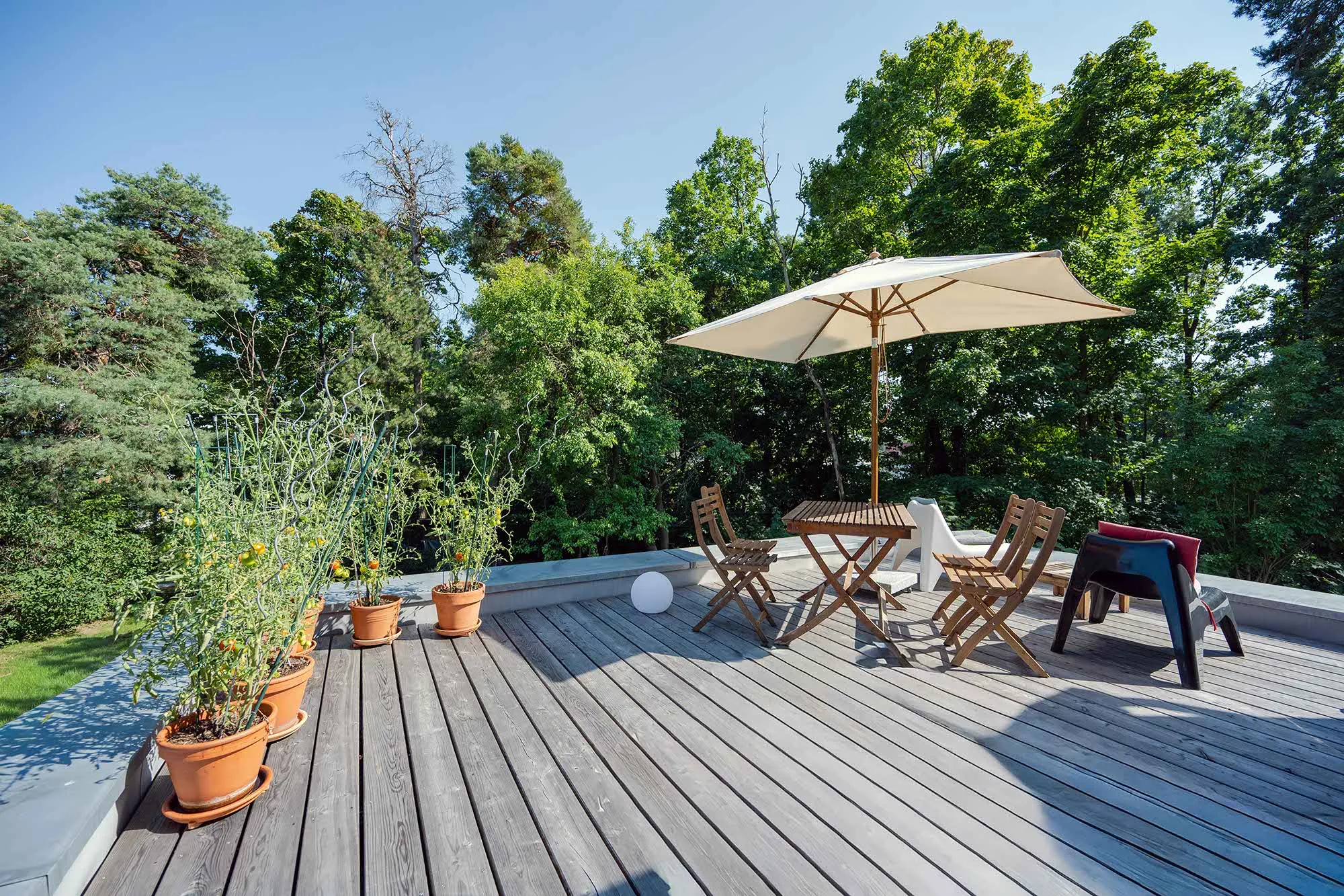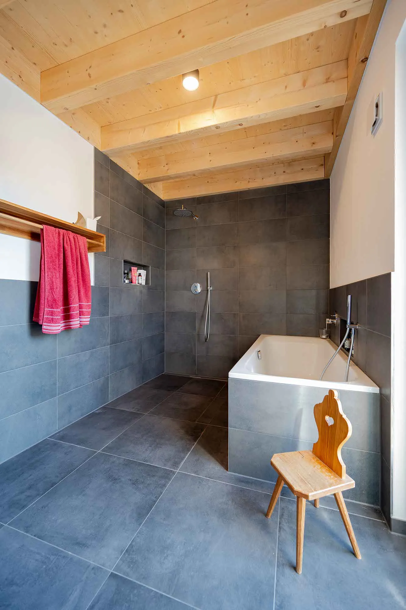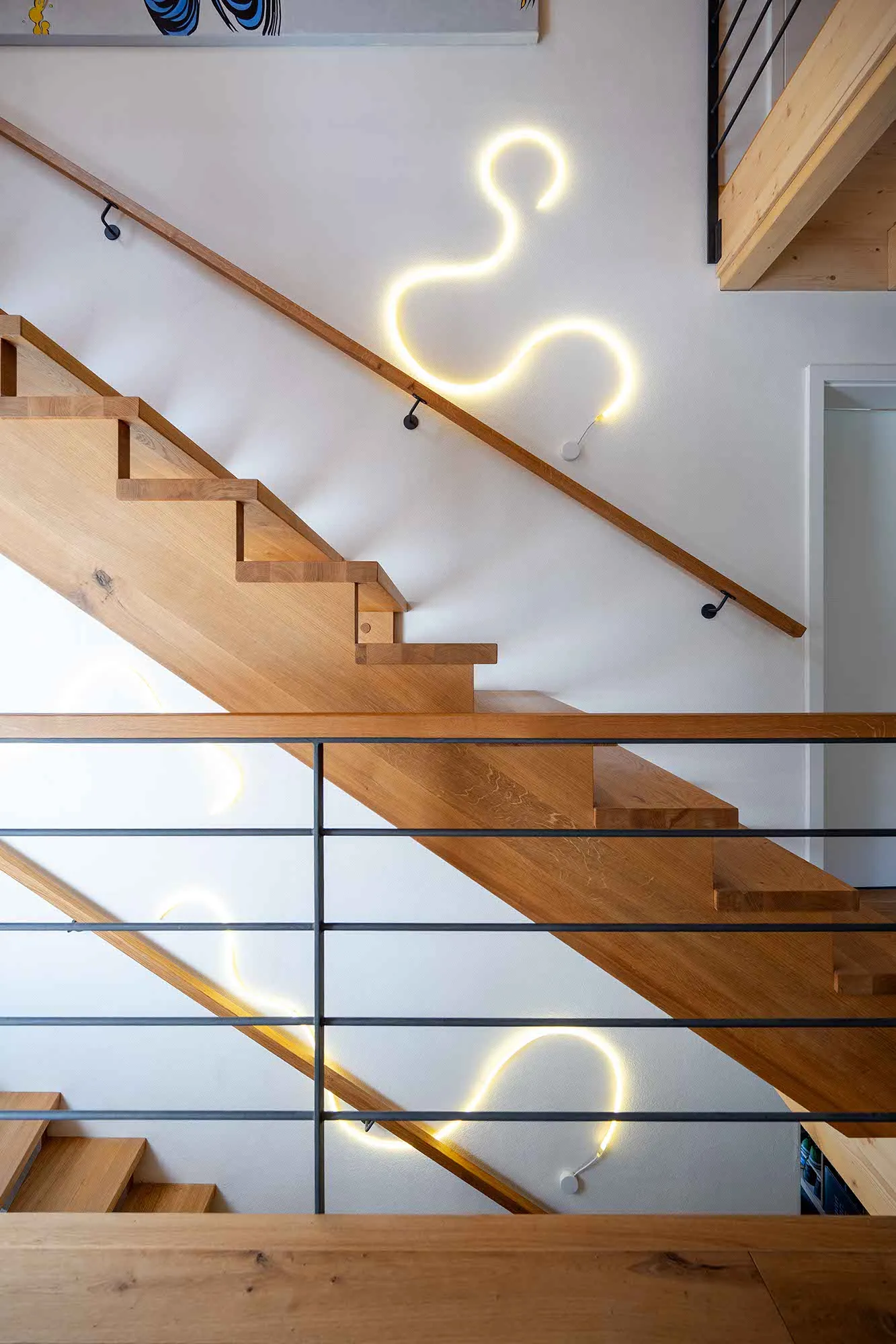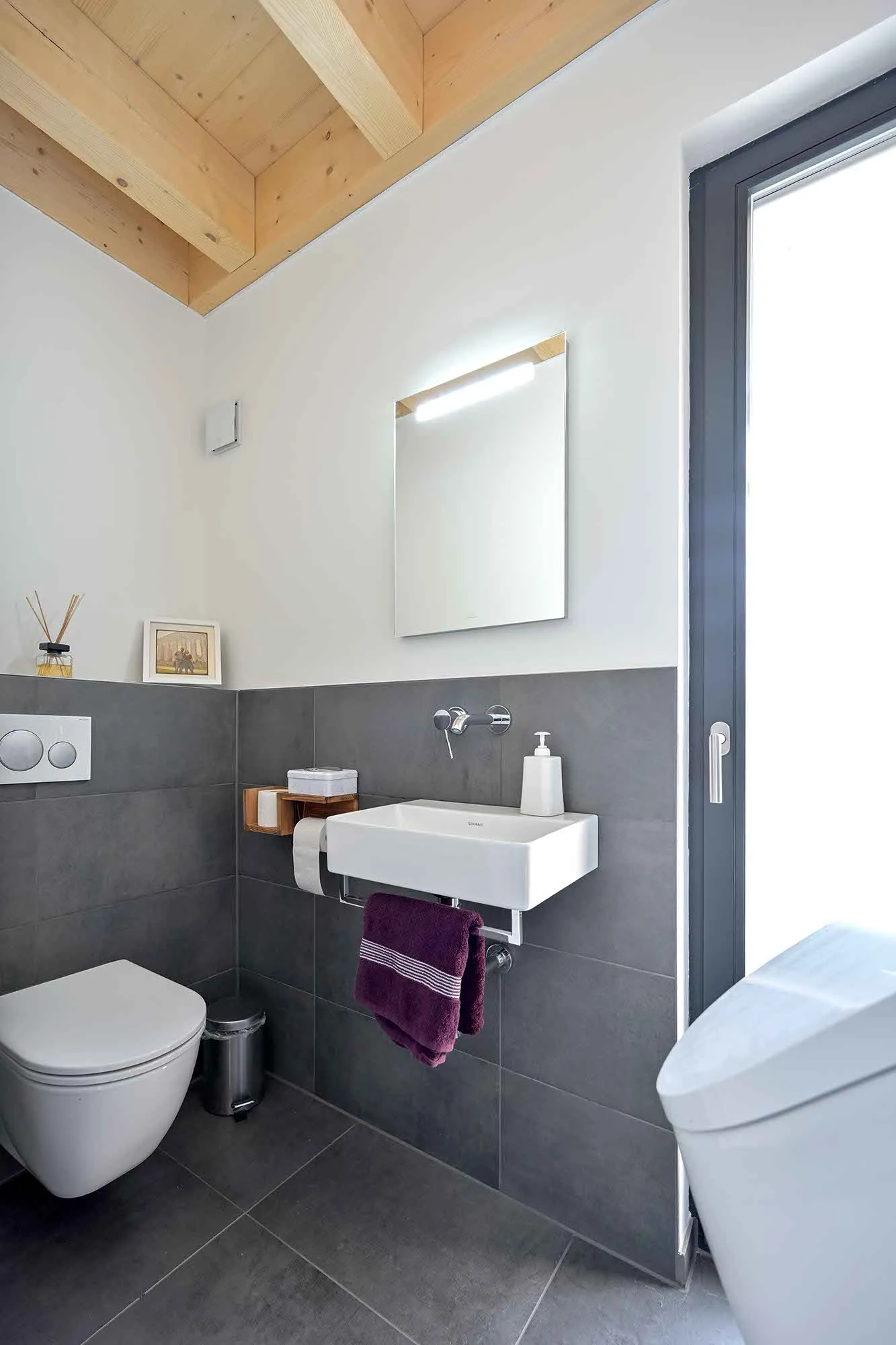 Reihenendhaus, Naturholzfassade, zwei Vollgeschosse und Dachgeschoss mit zwei kleinen Büros