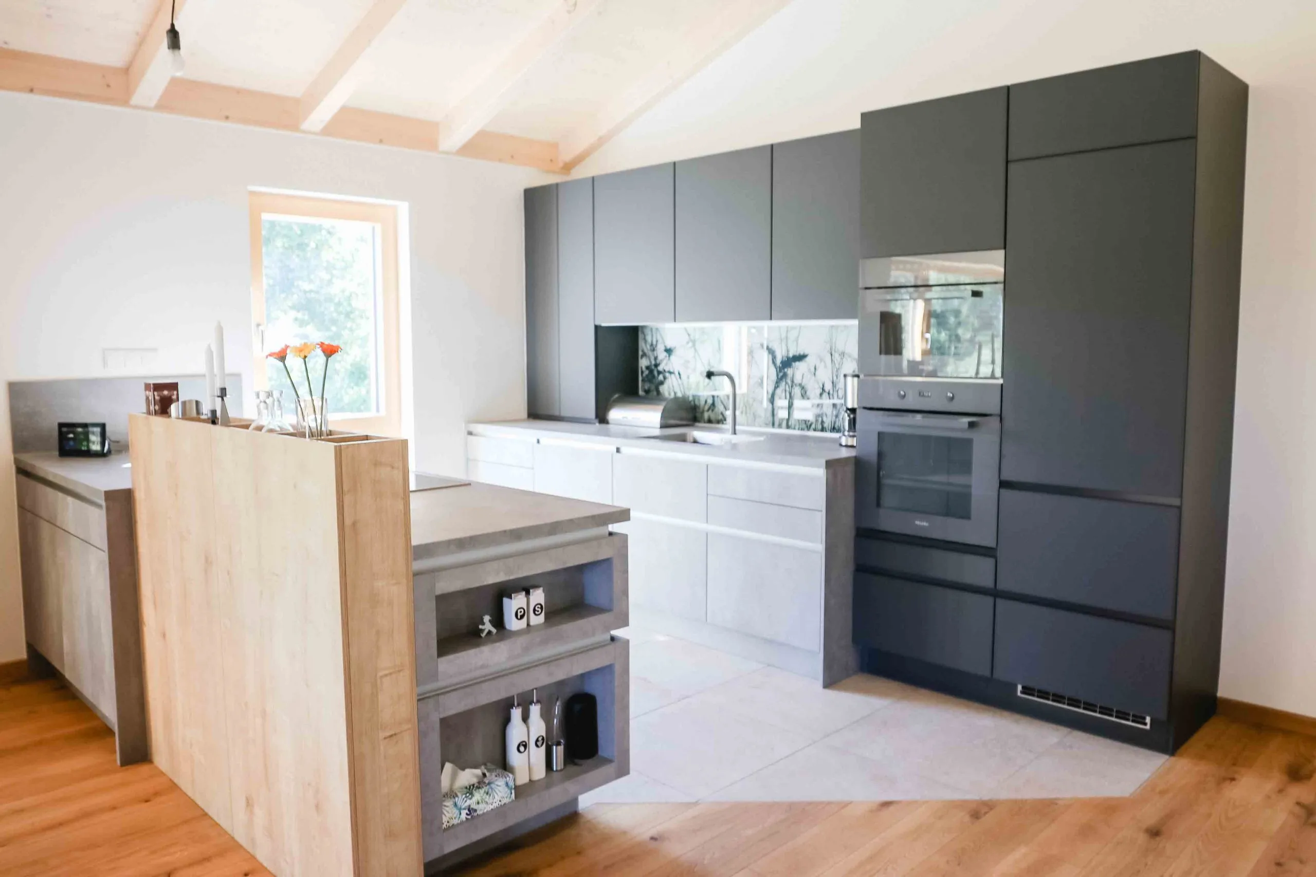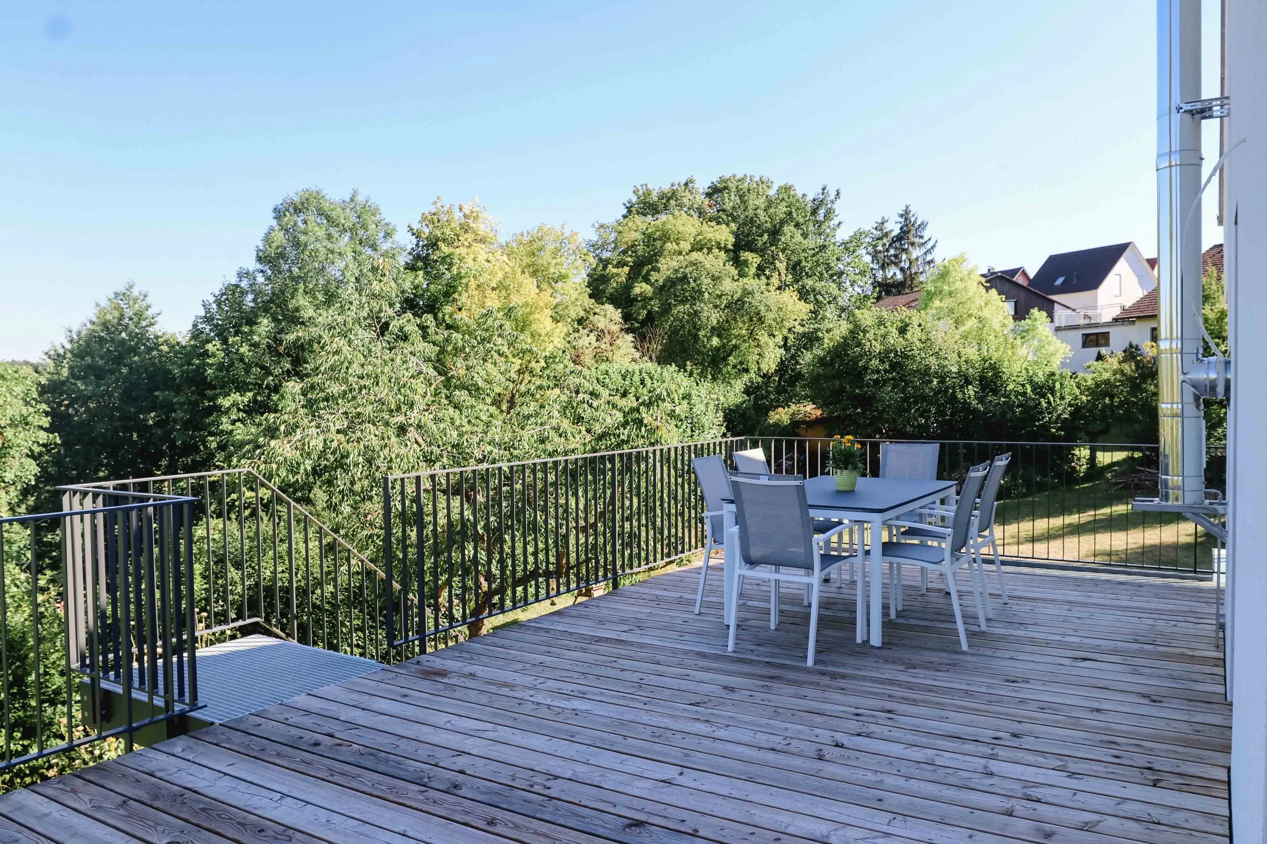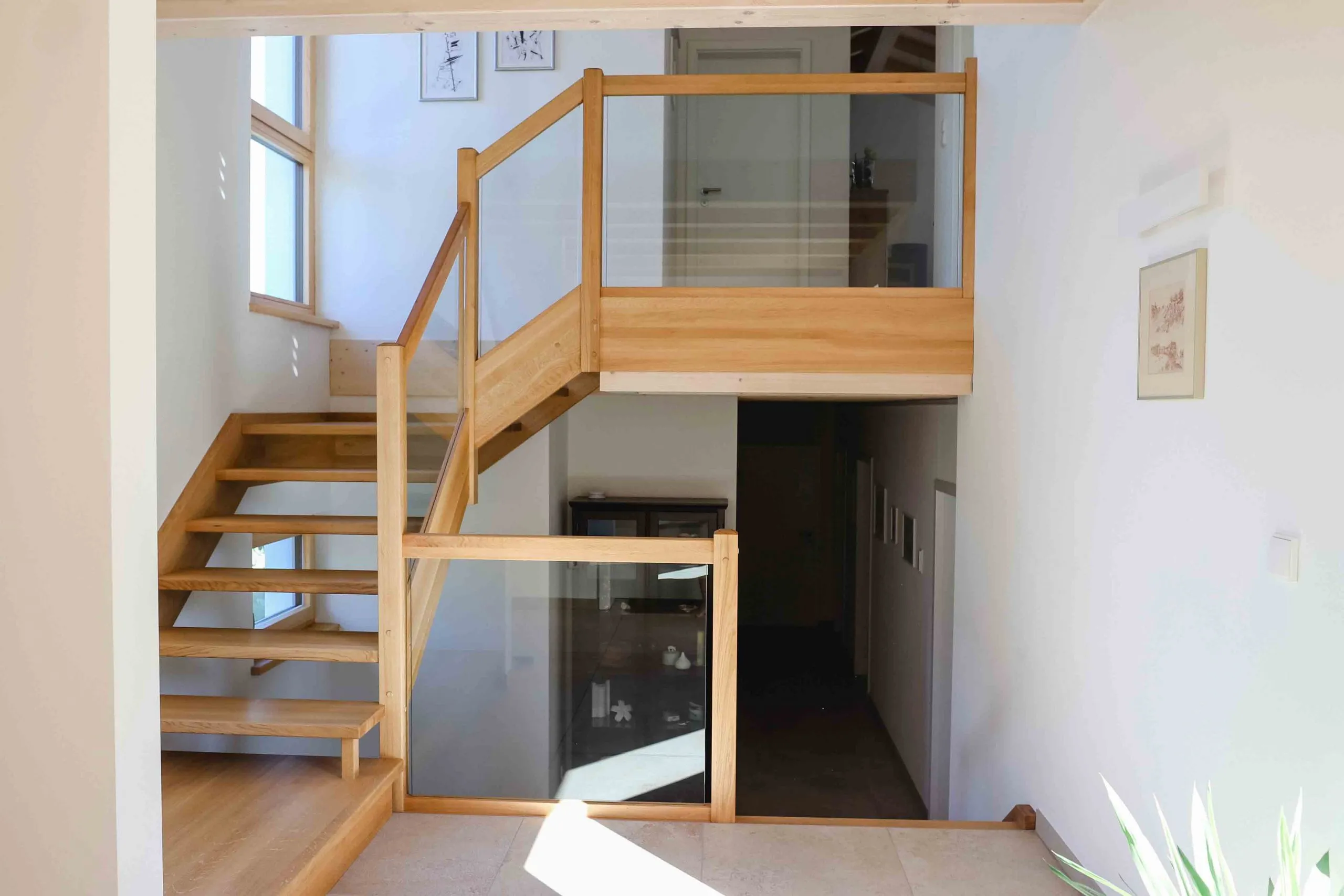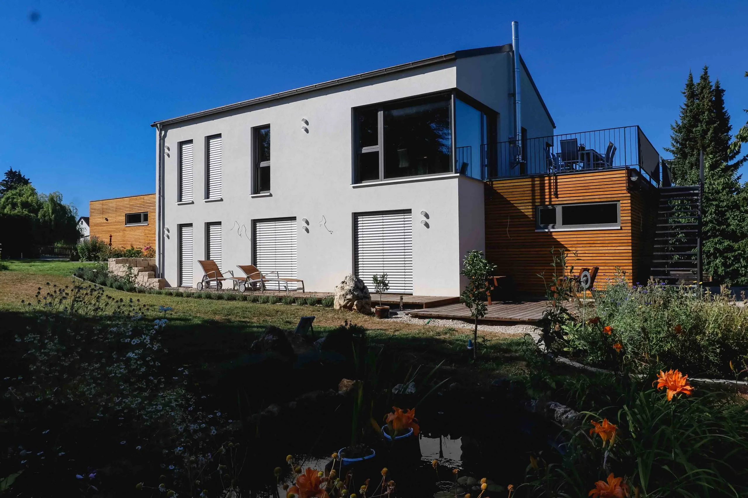 Wohnräume im Obergeschoss, Split-Level-Treppe mit Glasgeländer, große Garage mit Zwischenbau & Dachbegrünung, Dachterrasse mit Außentreppe