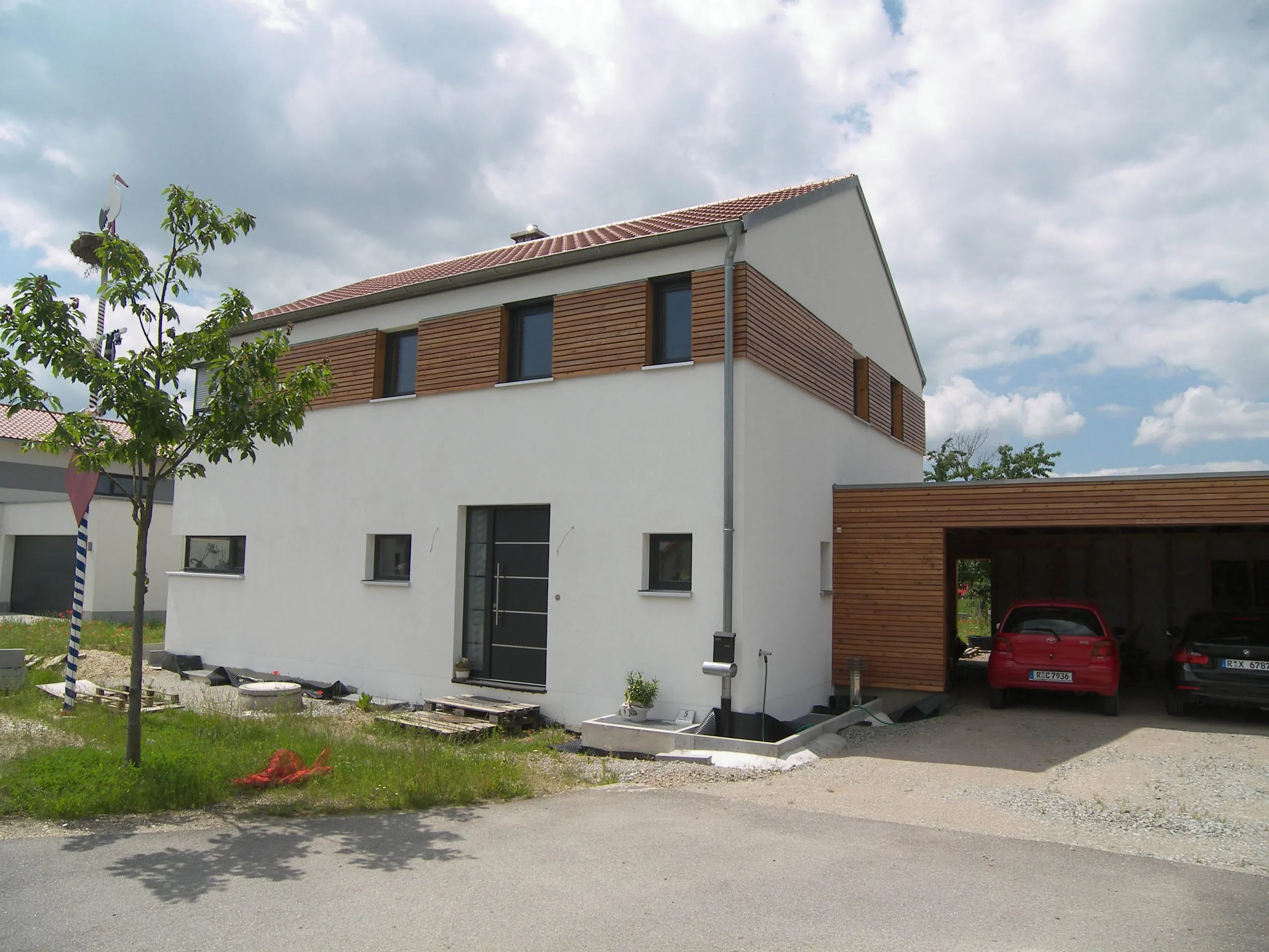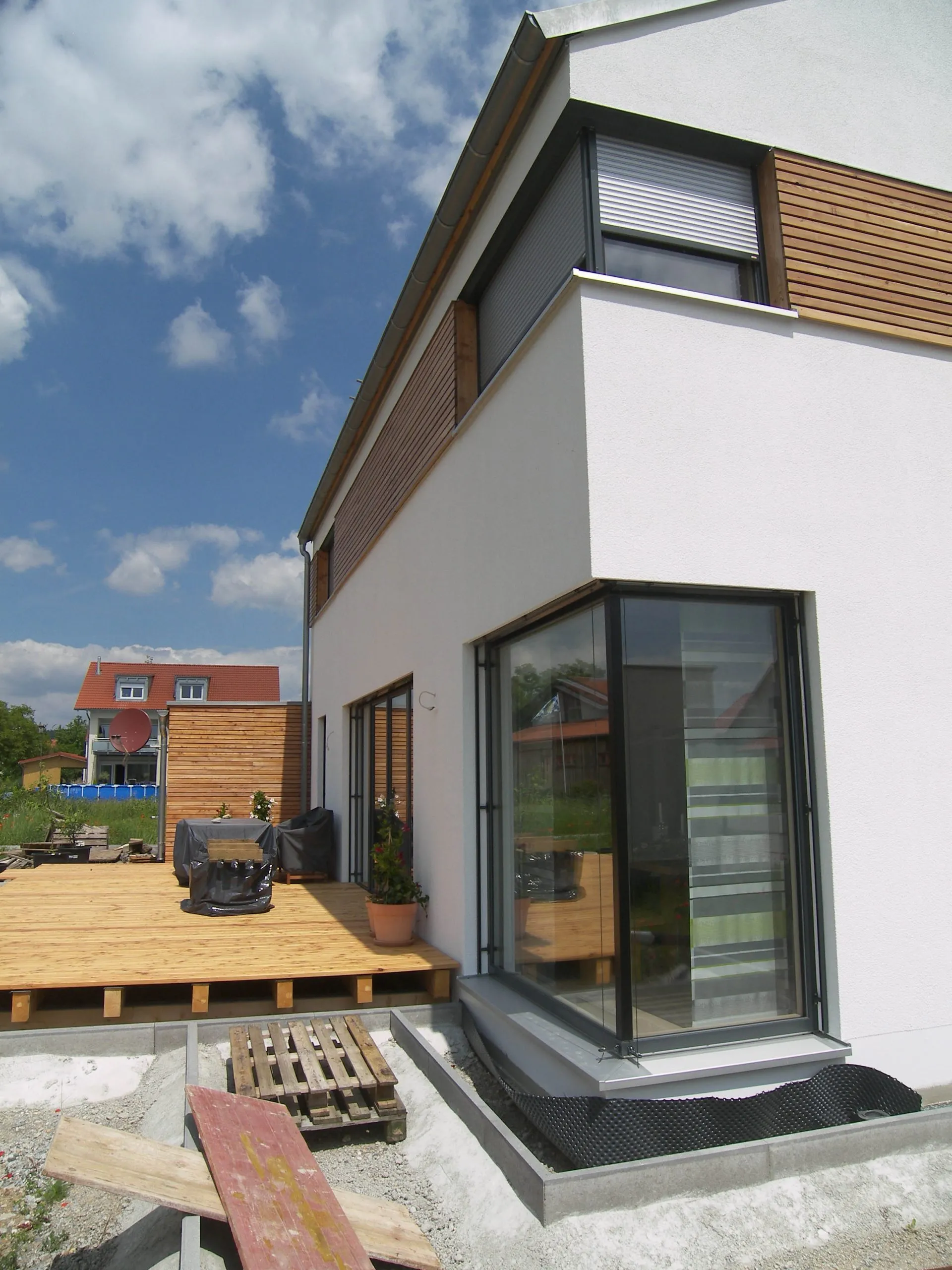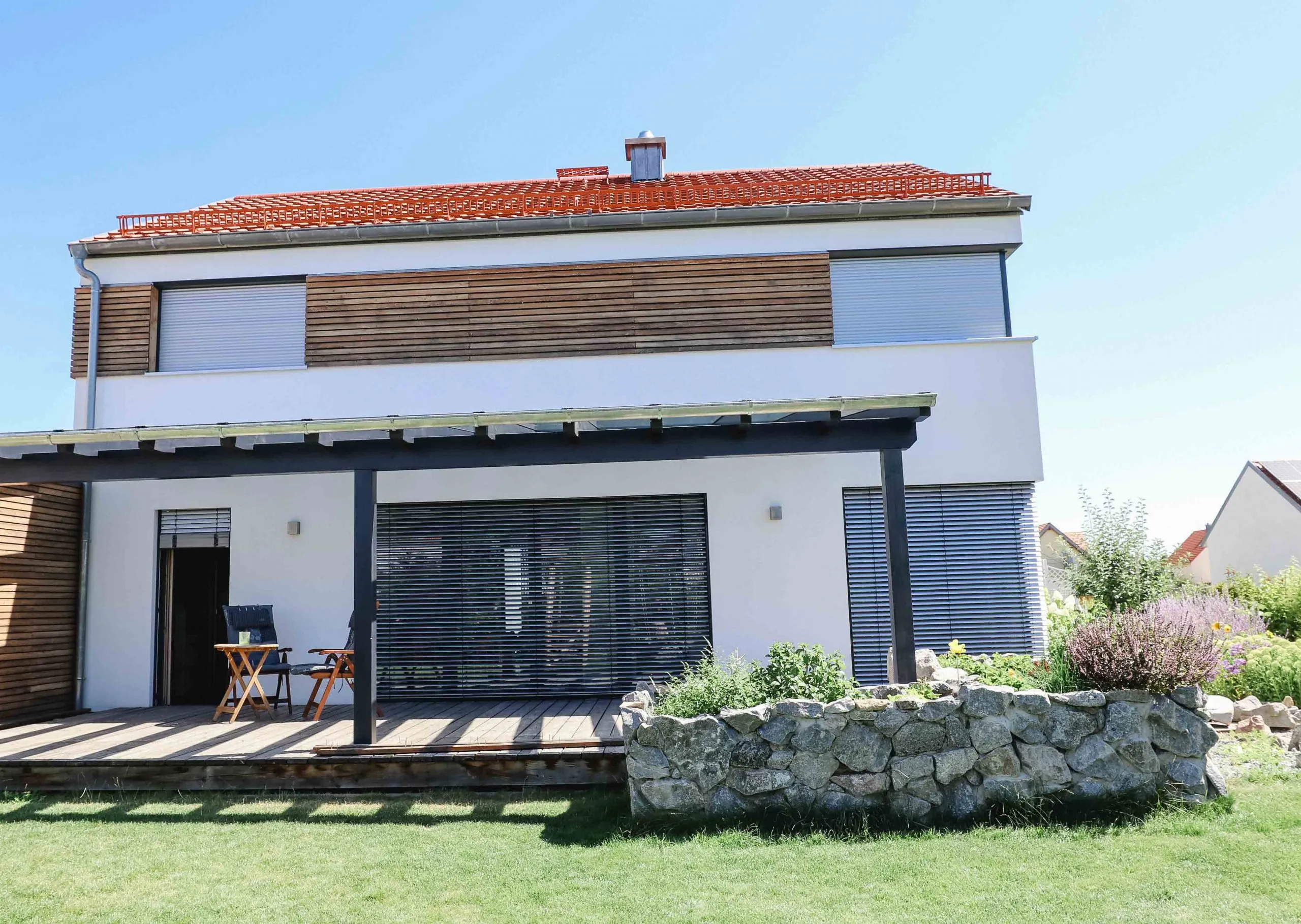 Mischfassade mit Rhombusleisten-Elemente, große Terrasse mit grau gestrichener Holzveranda Luftwärmepumpe im KG und Lüftung in Eigenleistung gebaut