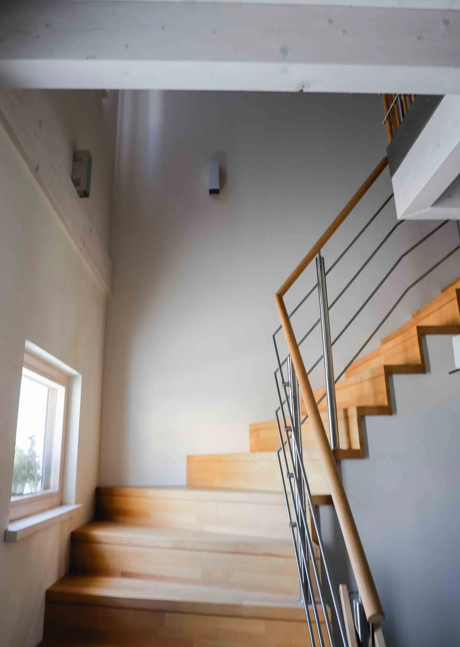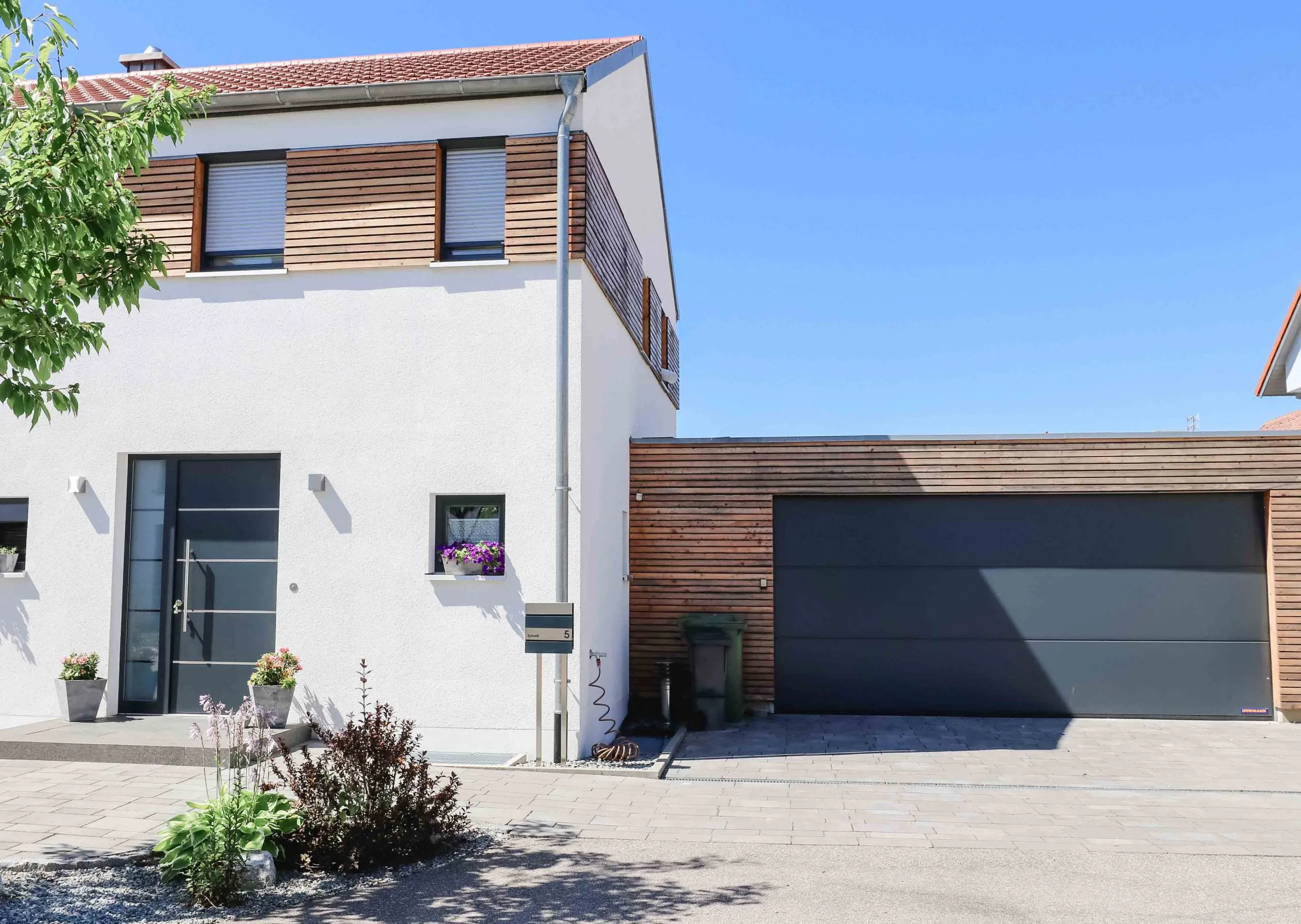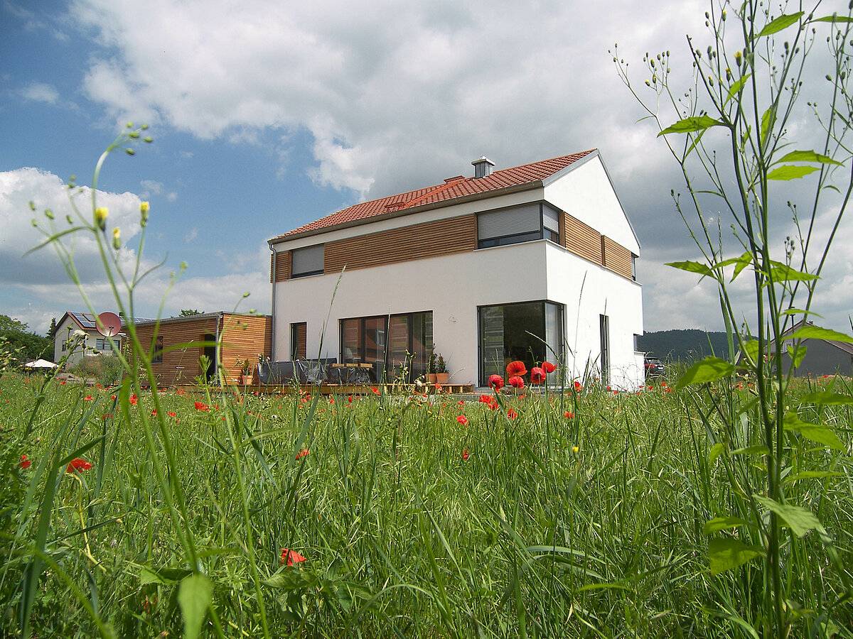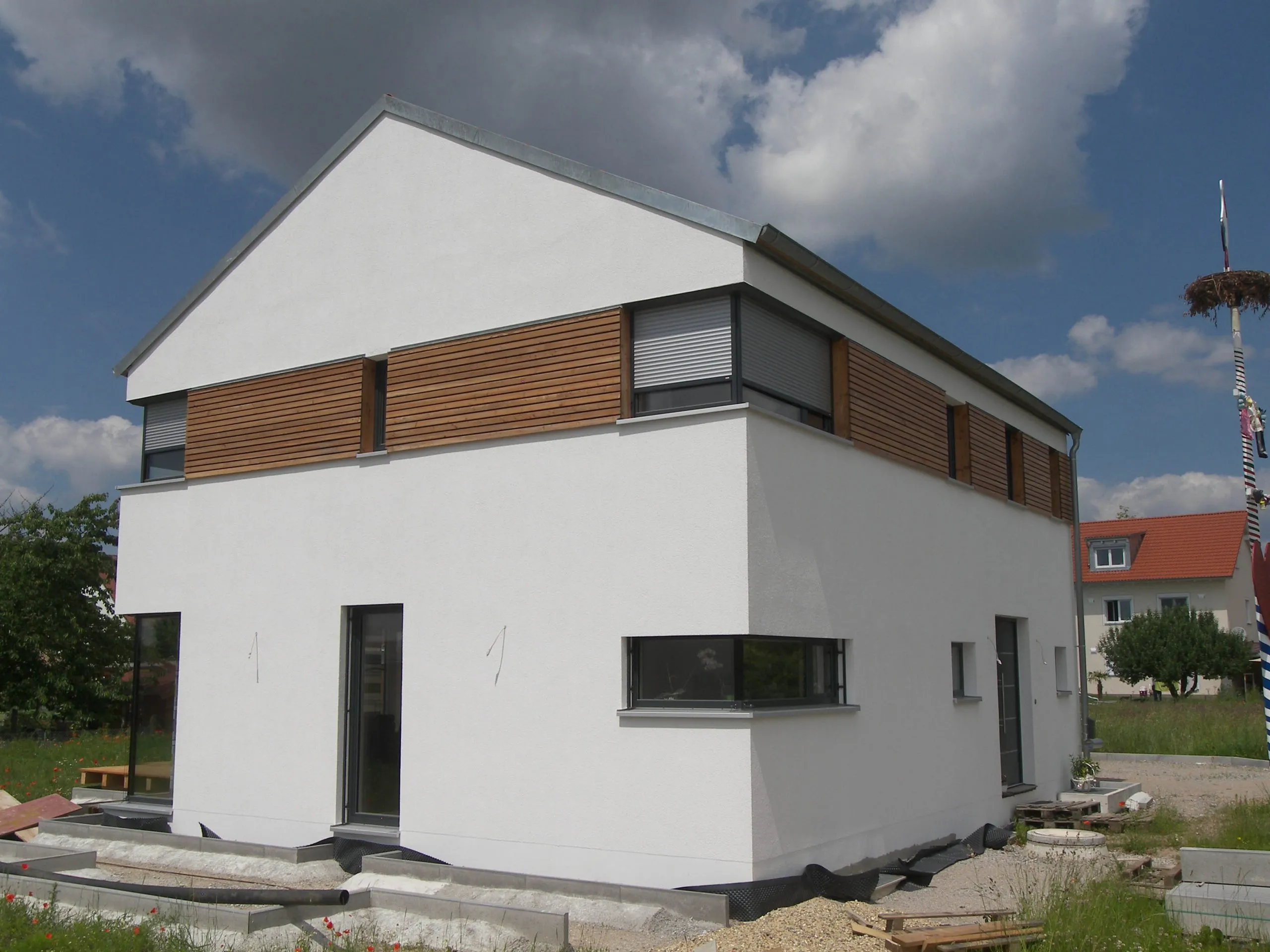 Mischfassade mit Rhombusleisten-Elemente, große Terrasse mit grau gestrichener Holzveranda Luftwärmepumpe im KG und Lüftung in Eigenleistung gebaut
