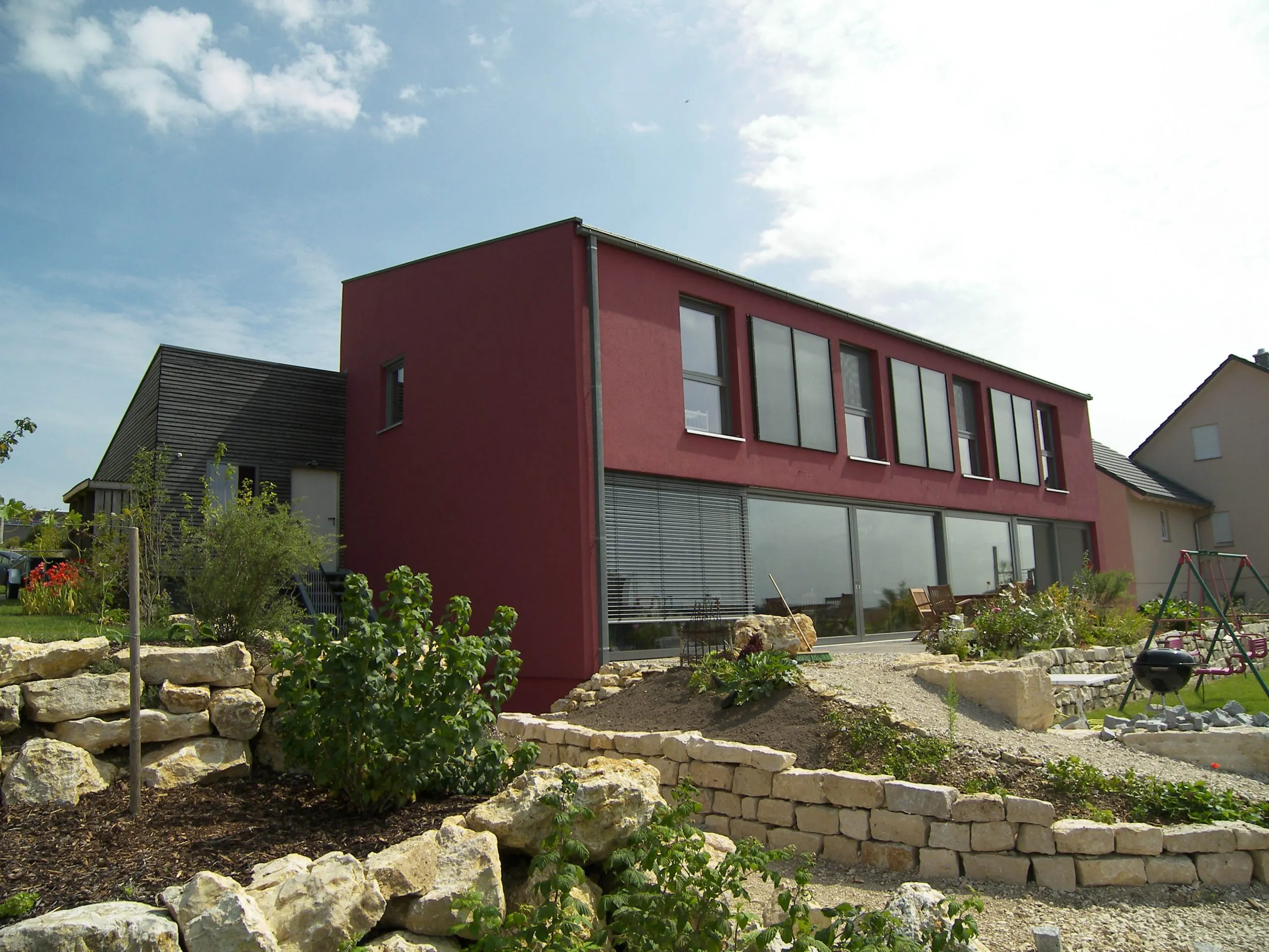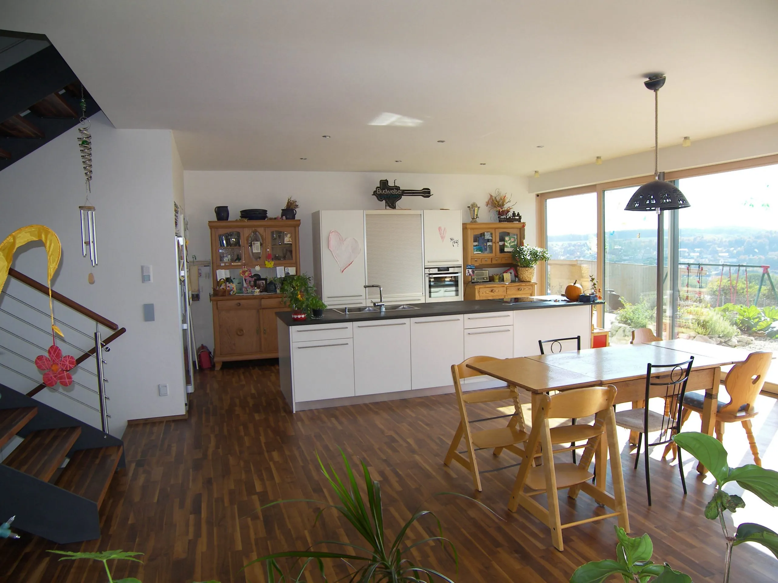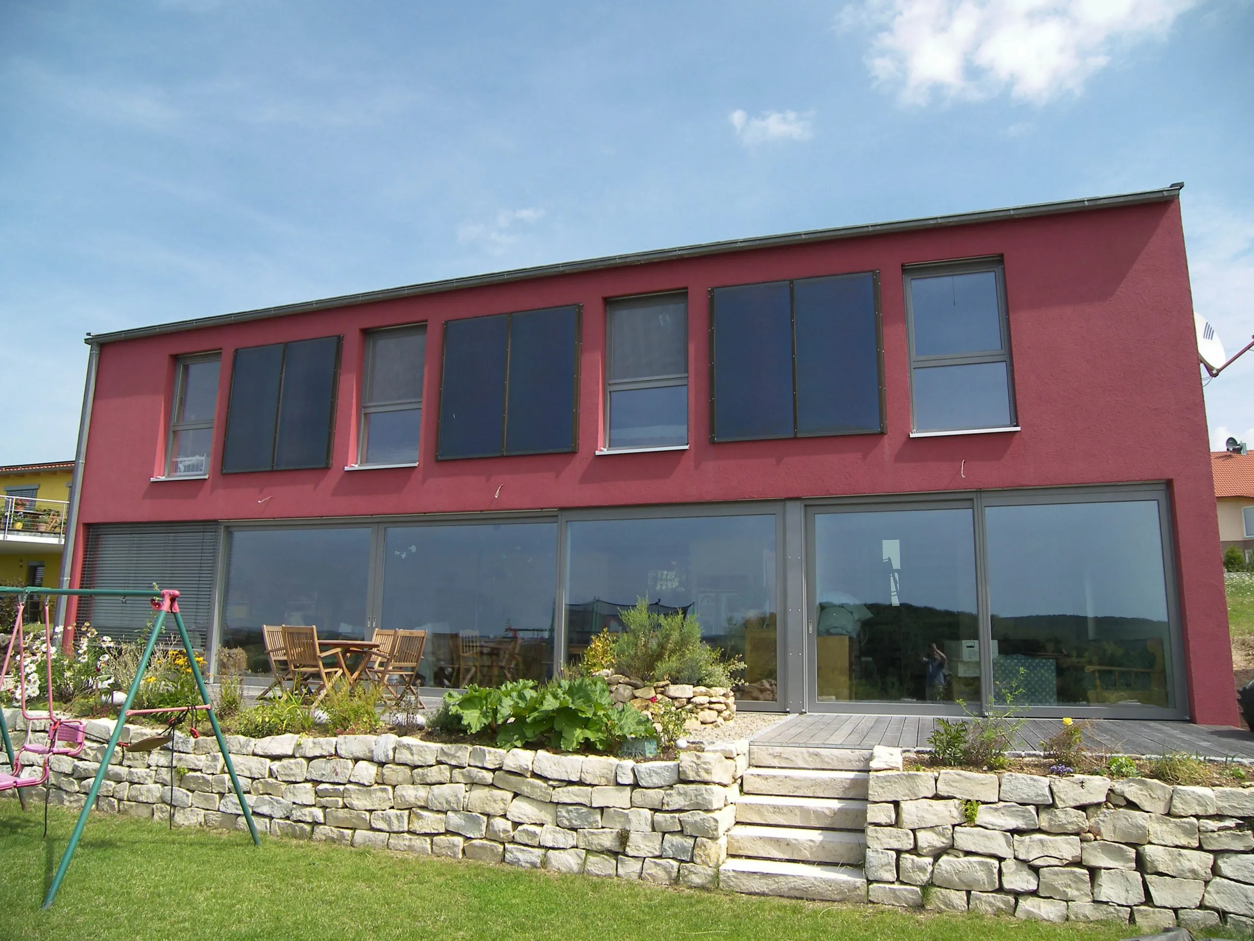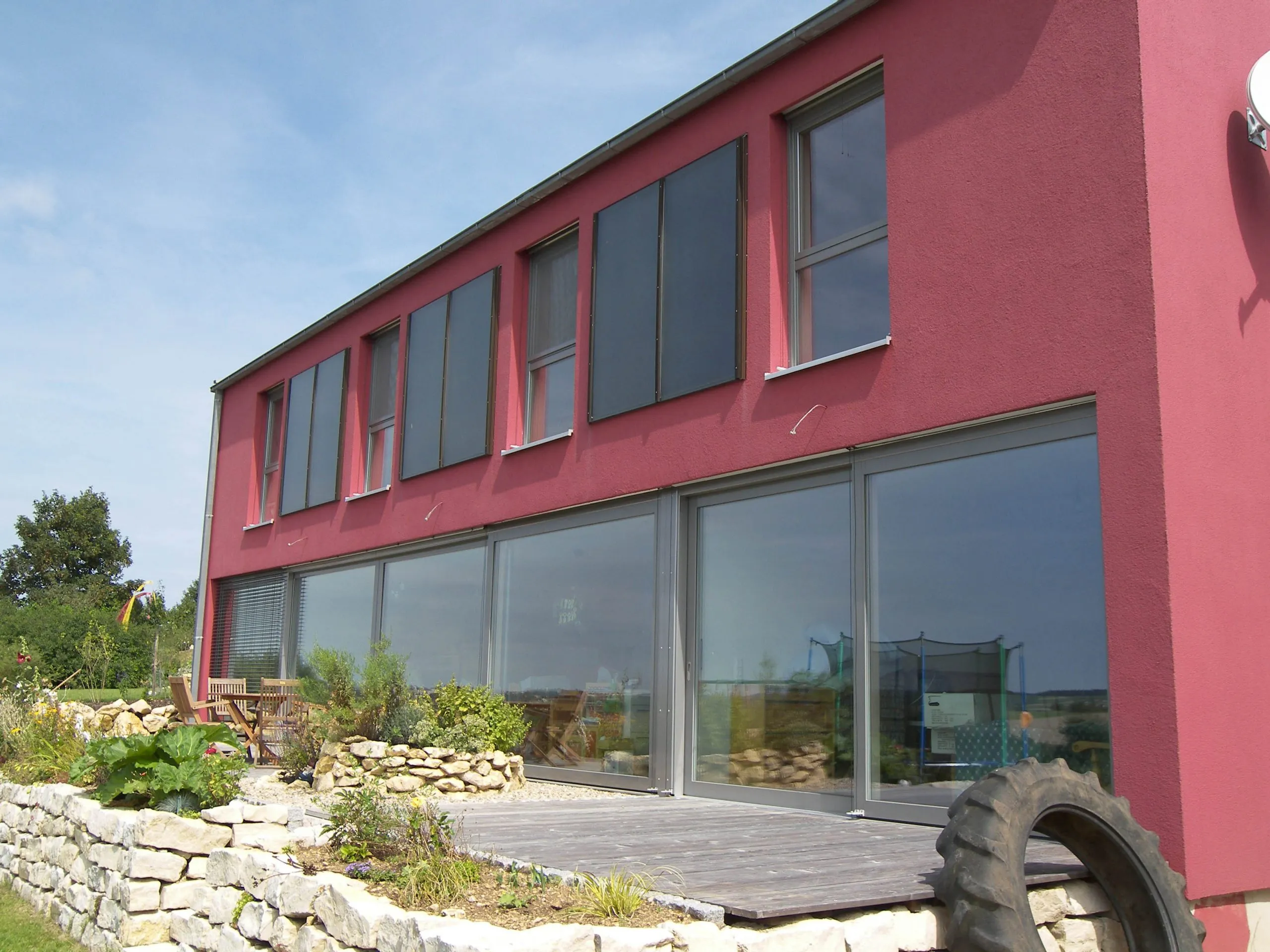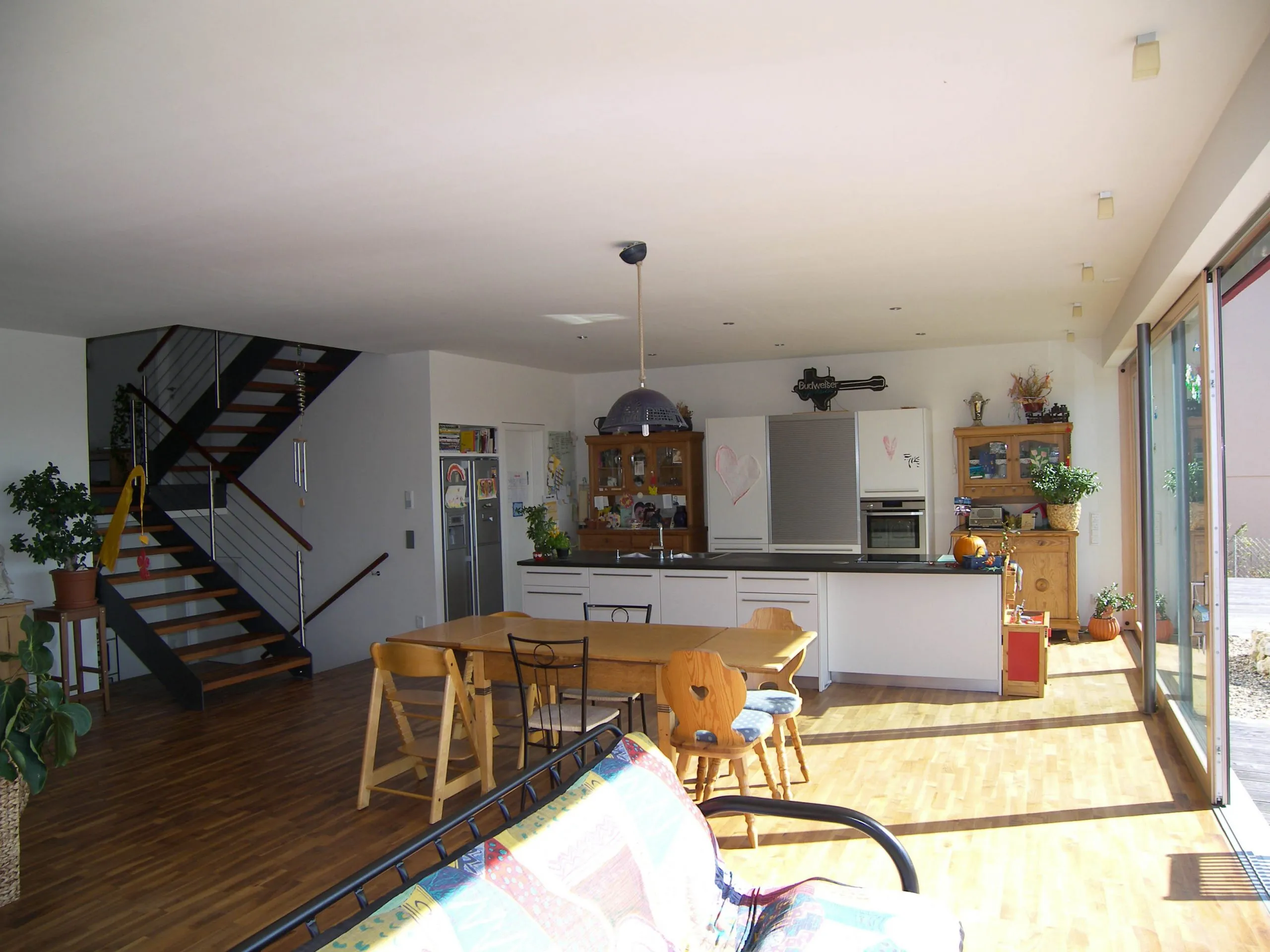 Versetztes Pultdach, Pelletsheizung mit Solarkollektoren an Fassade, Holzmassivboden in Nußbaum, zusätzlicher Kachelofen, Schiebetüre mit 6 Metern Breite