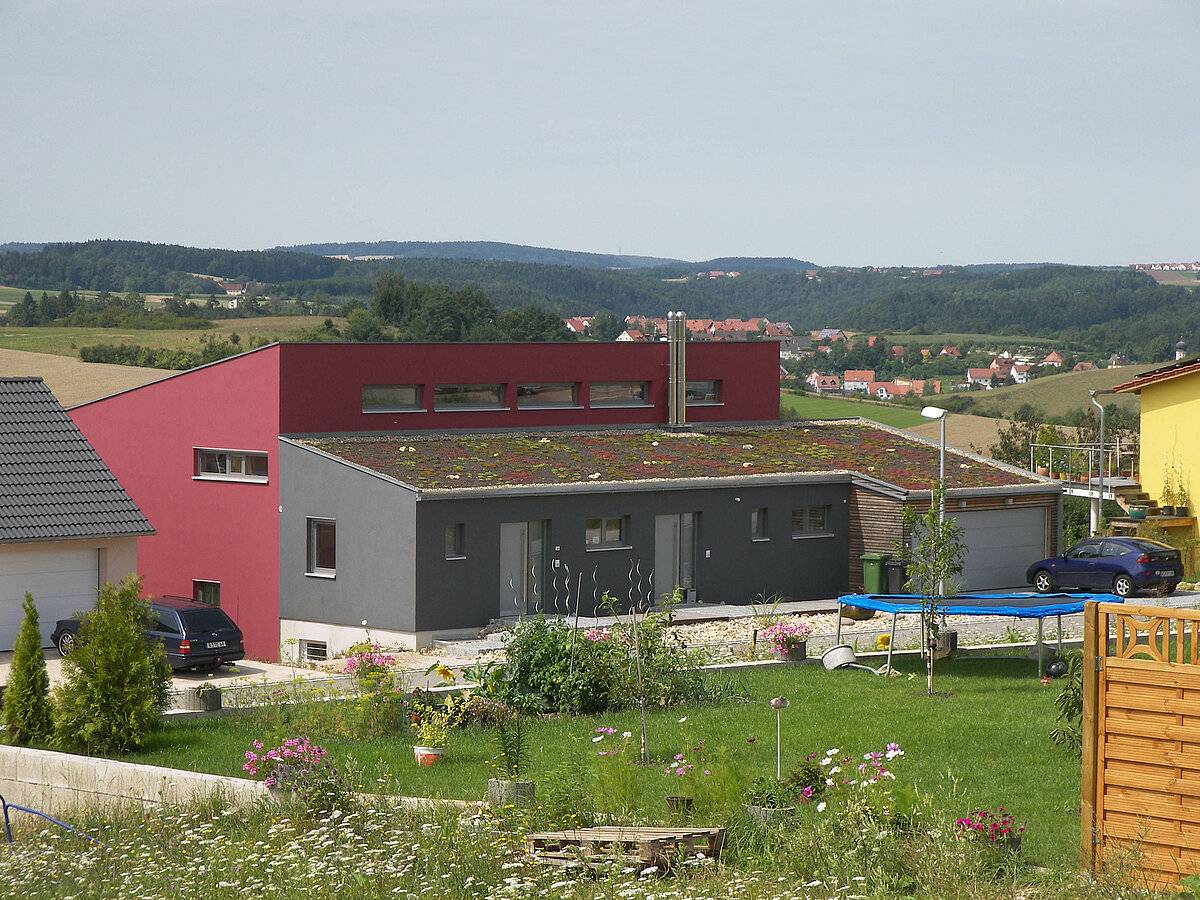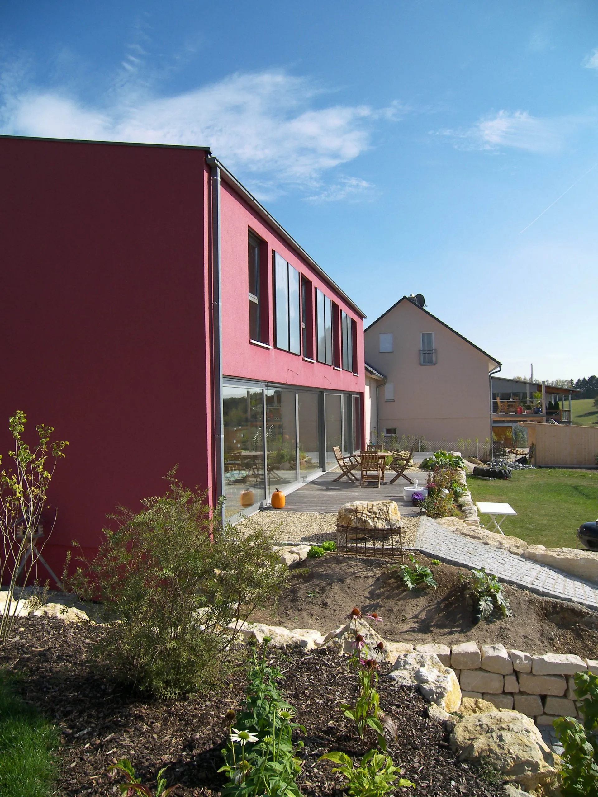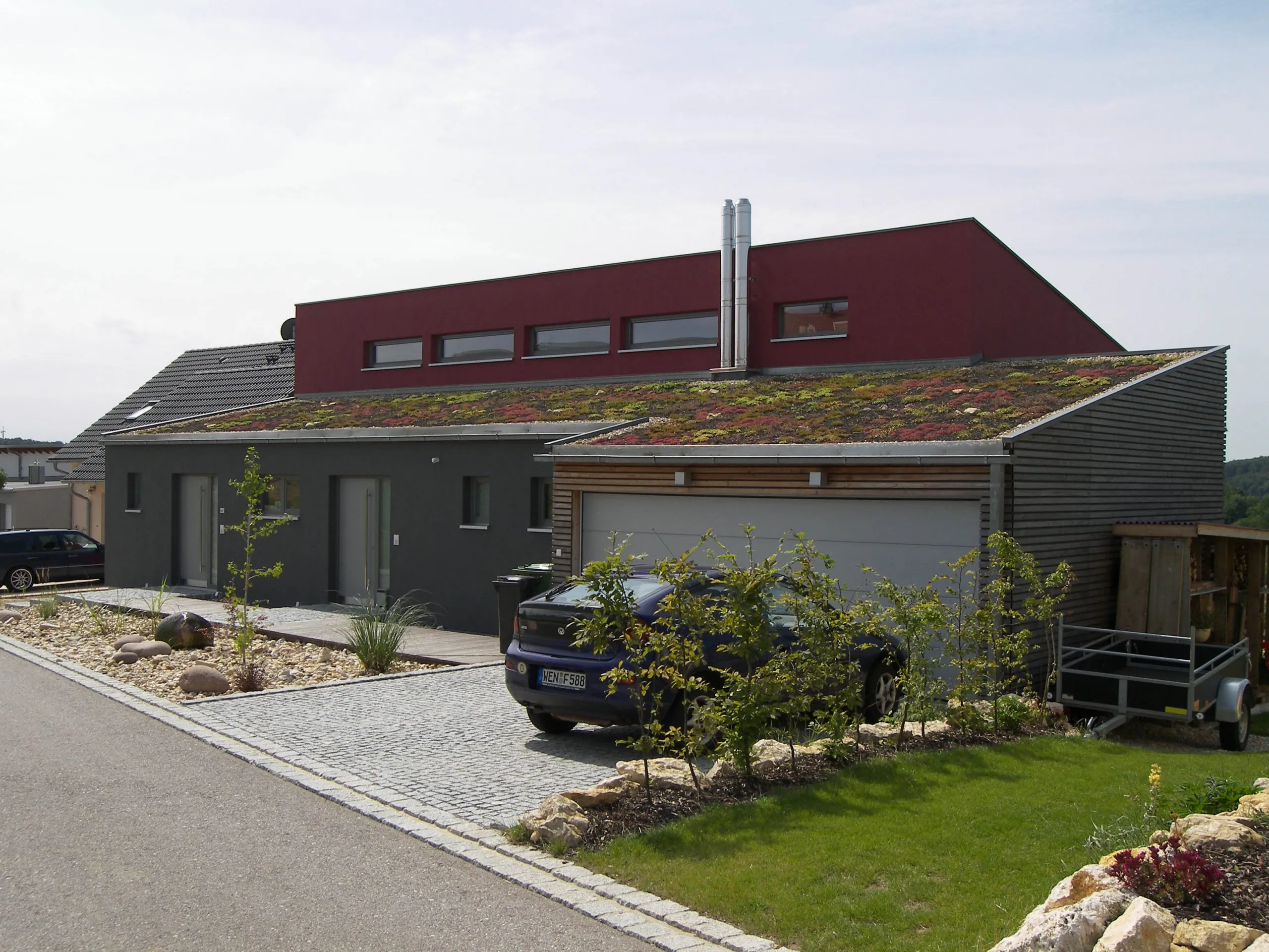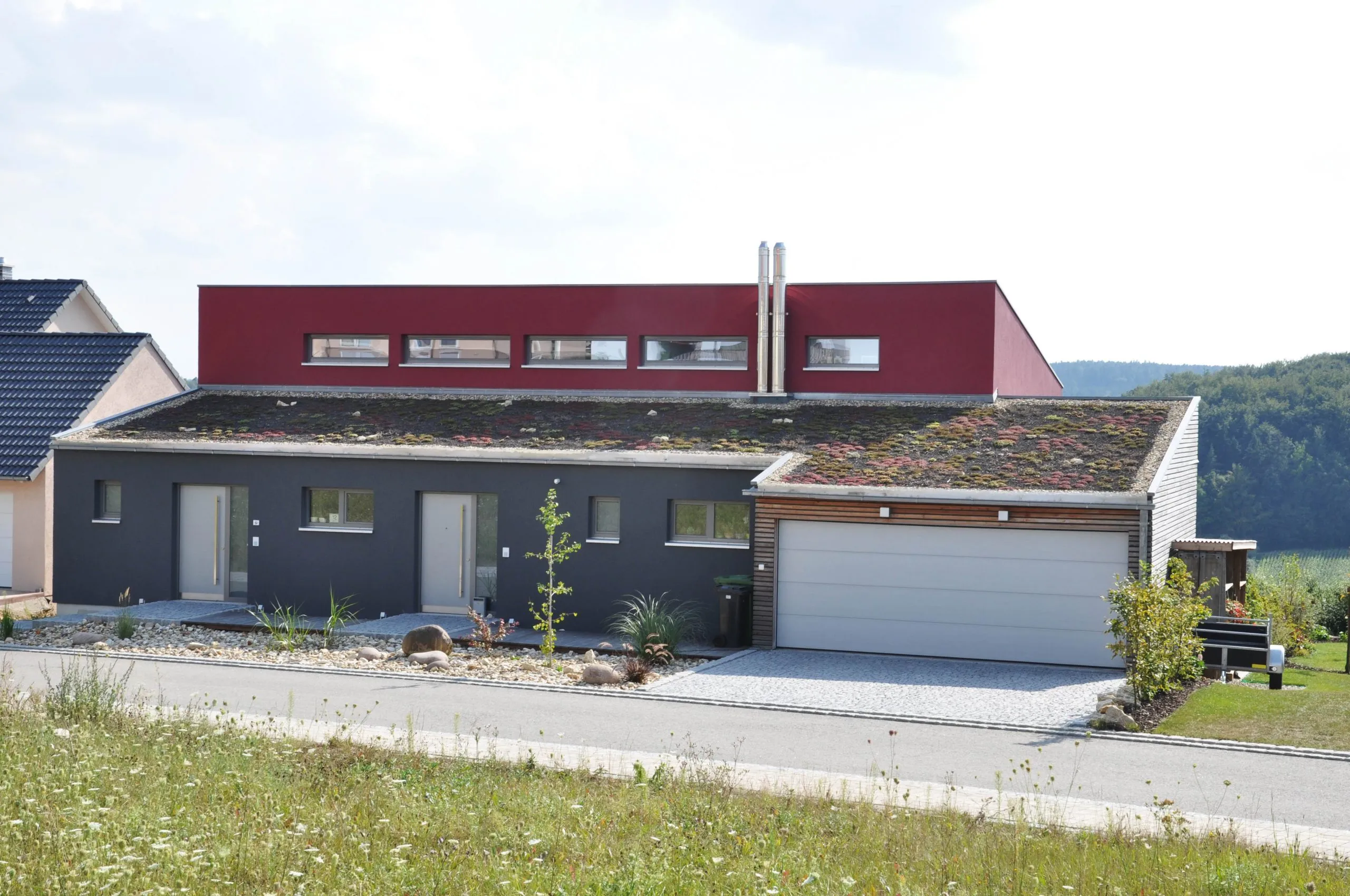 Versetztes Pultdach, Pelletsheizung mit Solarkollektoren an Fassade, Holzmassivboden in Nußbaum, zusätzlicher Kachelofen, Schiebetüre mit 6 Metern Breite
