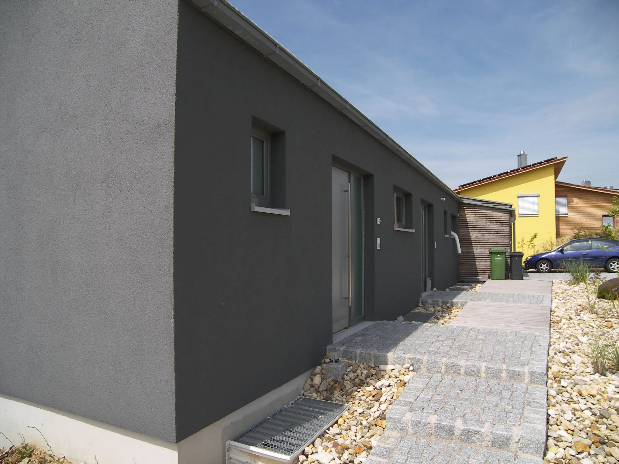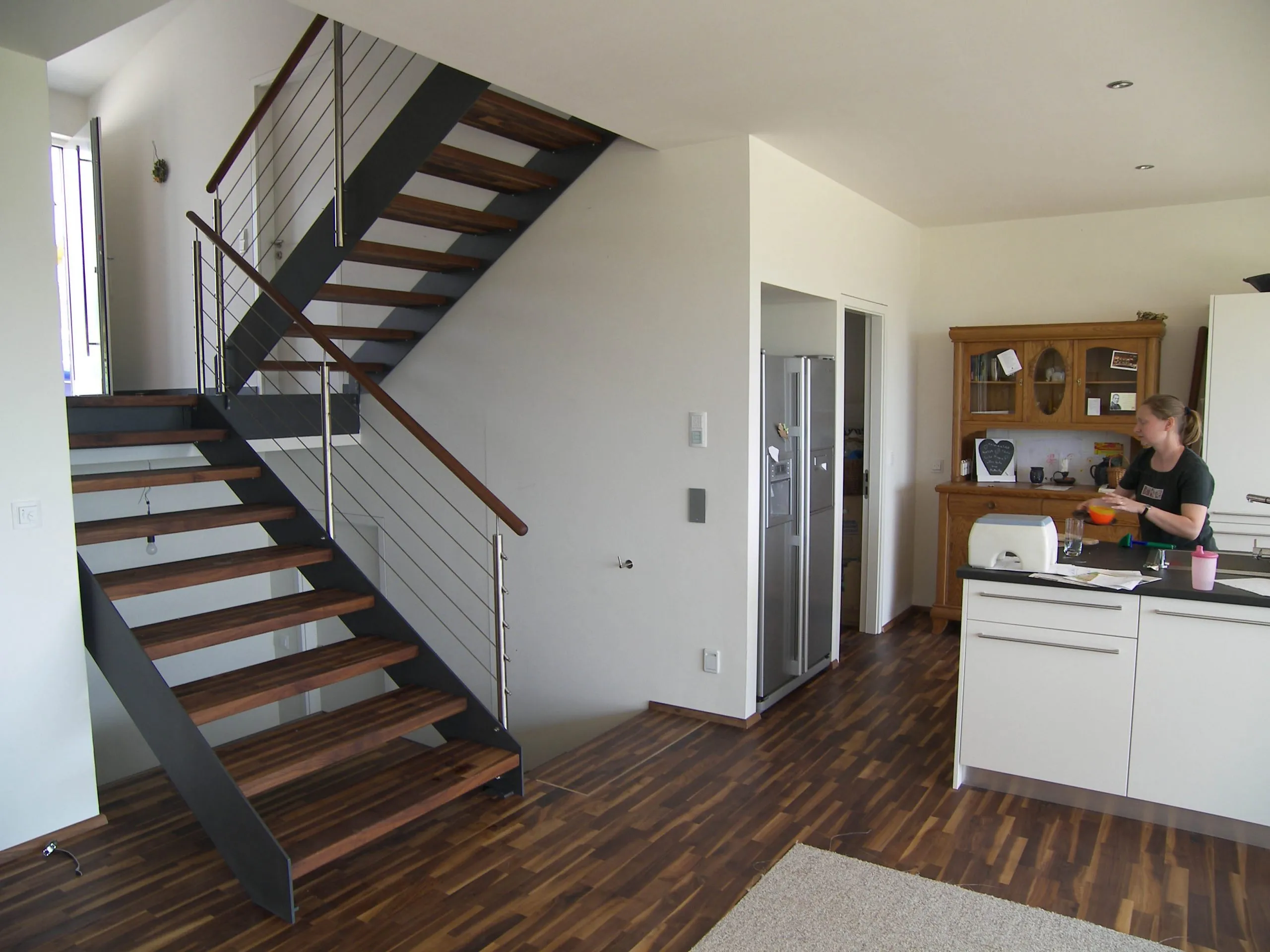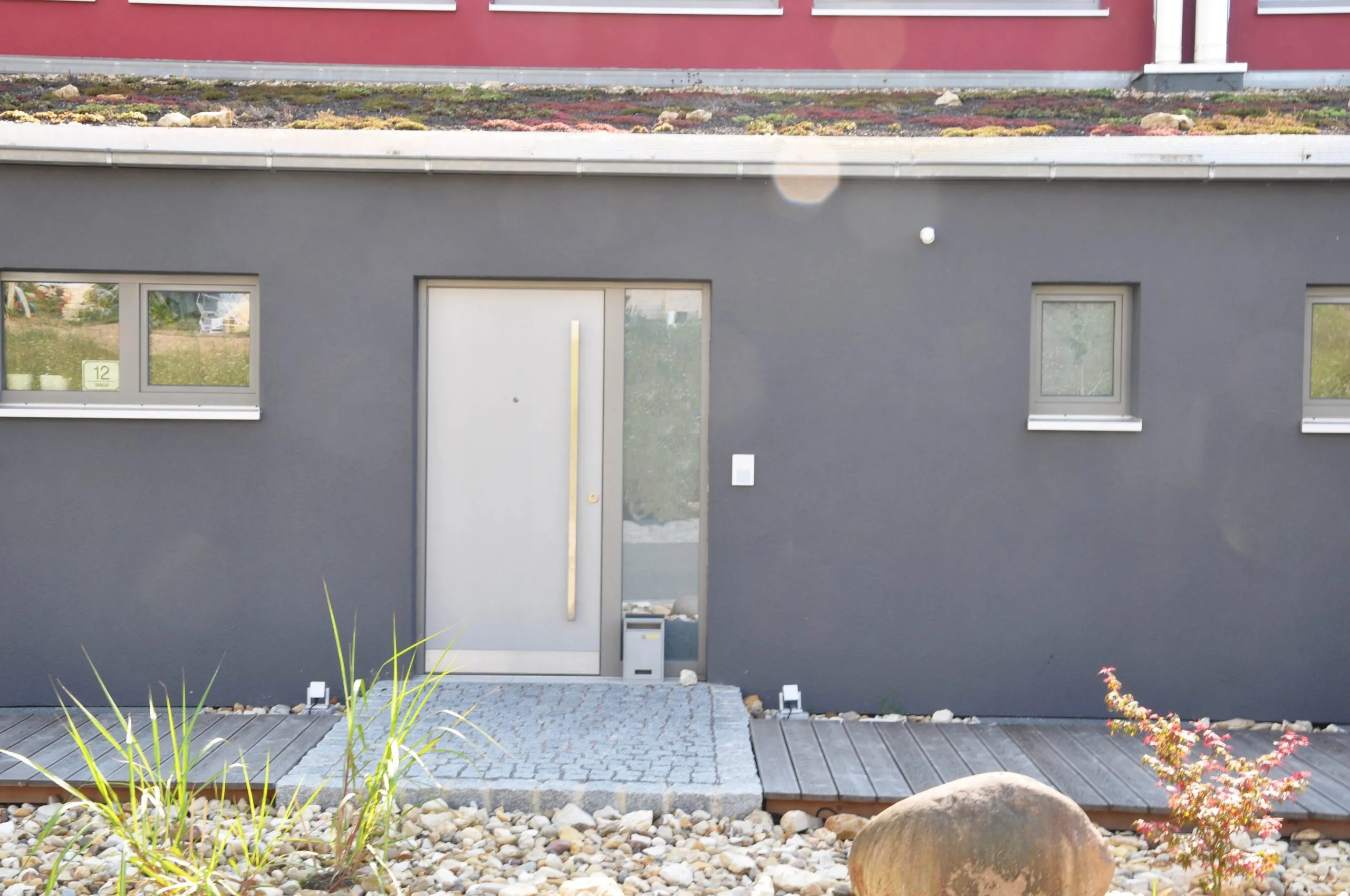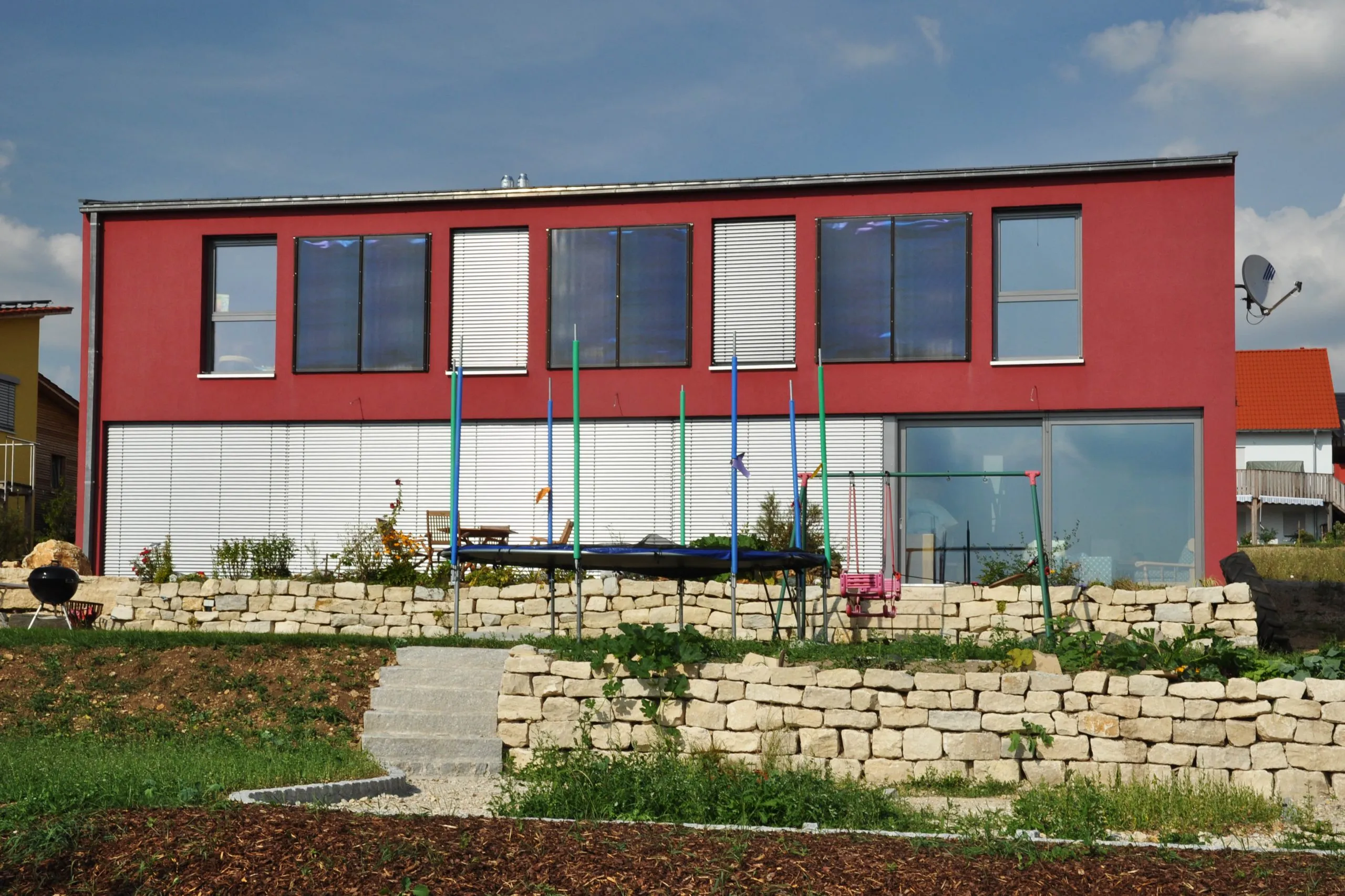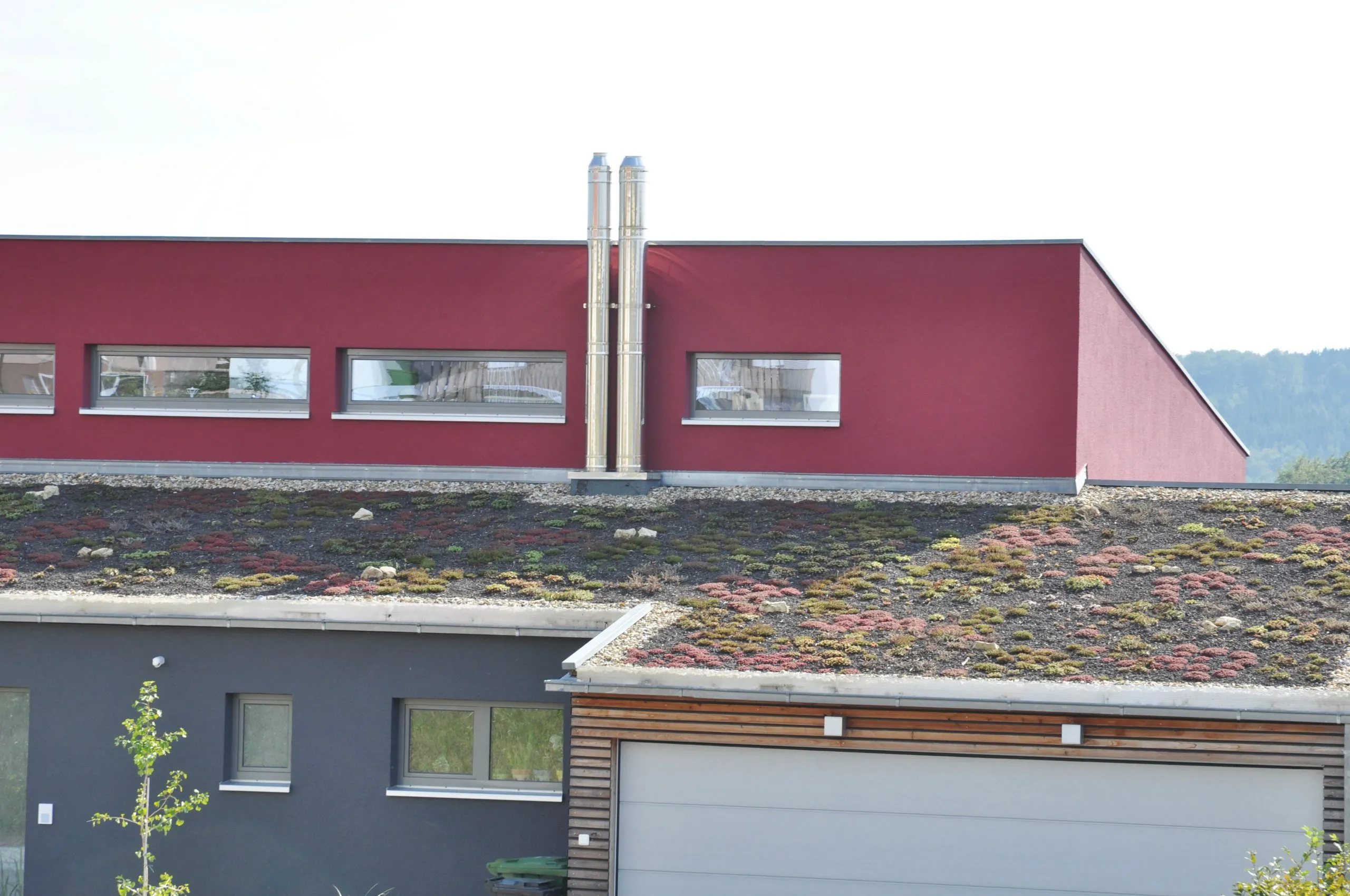 Versetztes Pultdach, Pelletsheizung mit Solarkollektoren an Fassade, Holzmassivboden in Nußbaum, zusätzlicher Kachelofen, Schiebetüre mit 6 Metern Breite