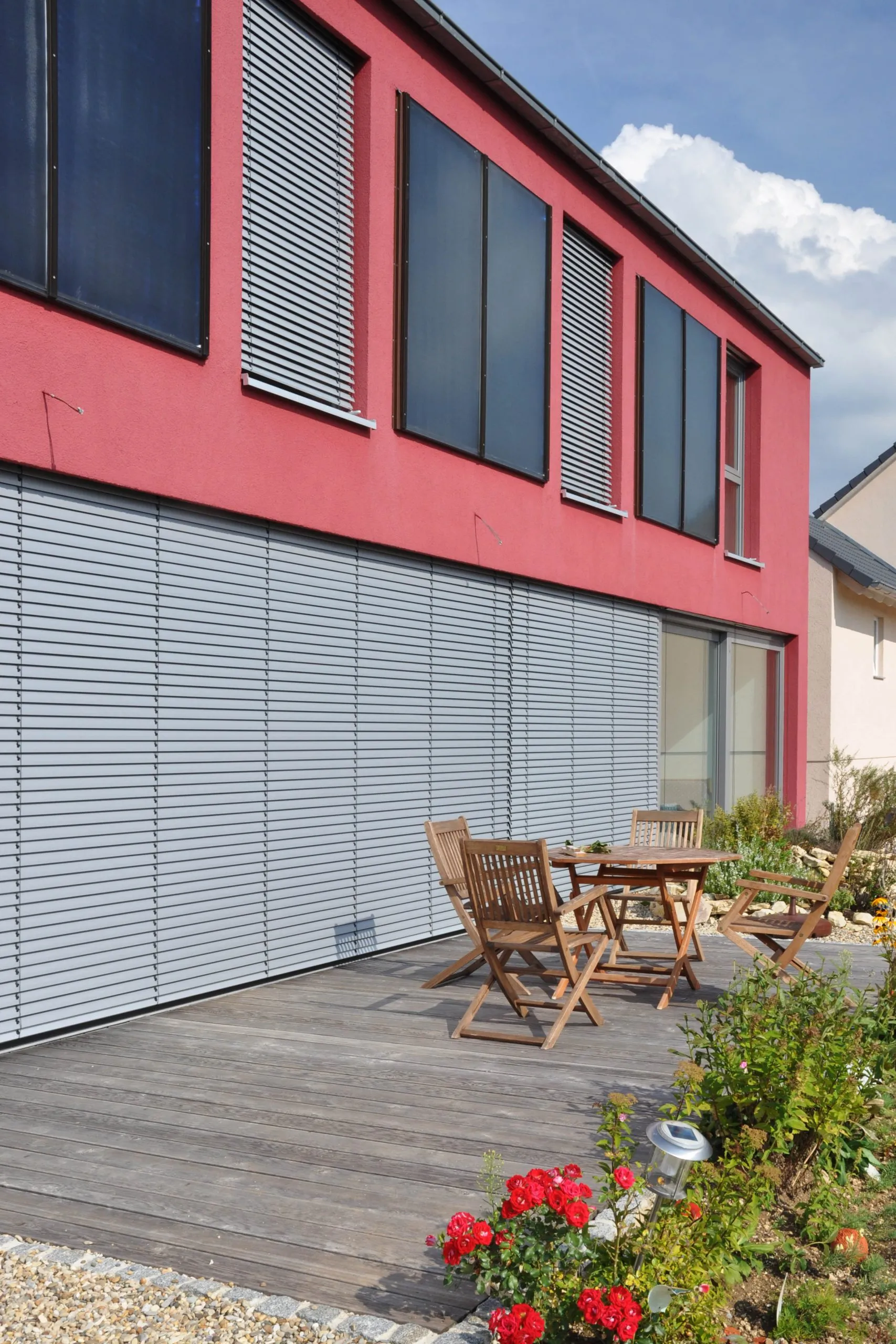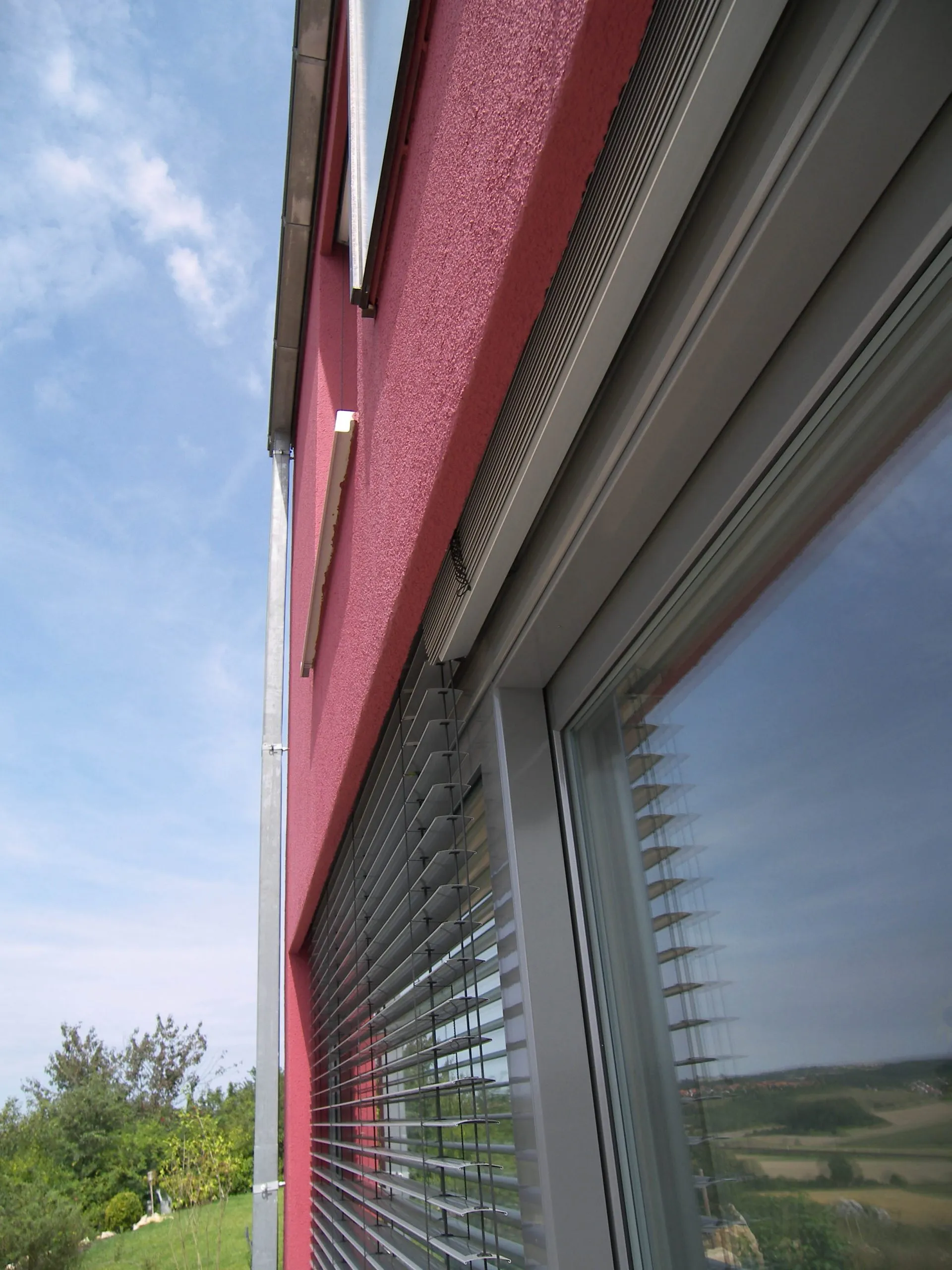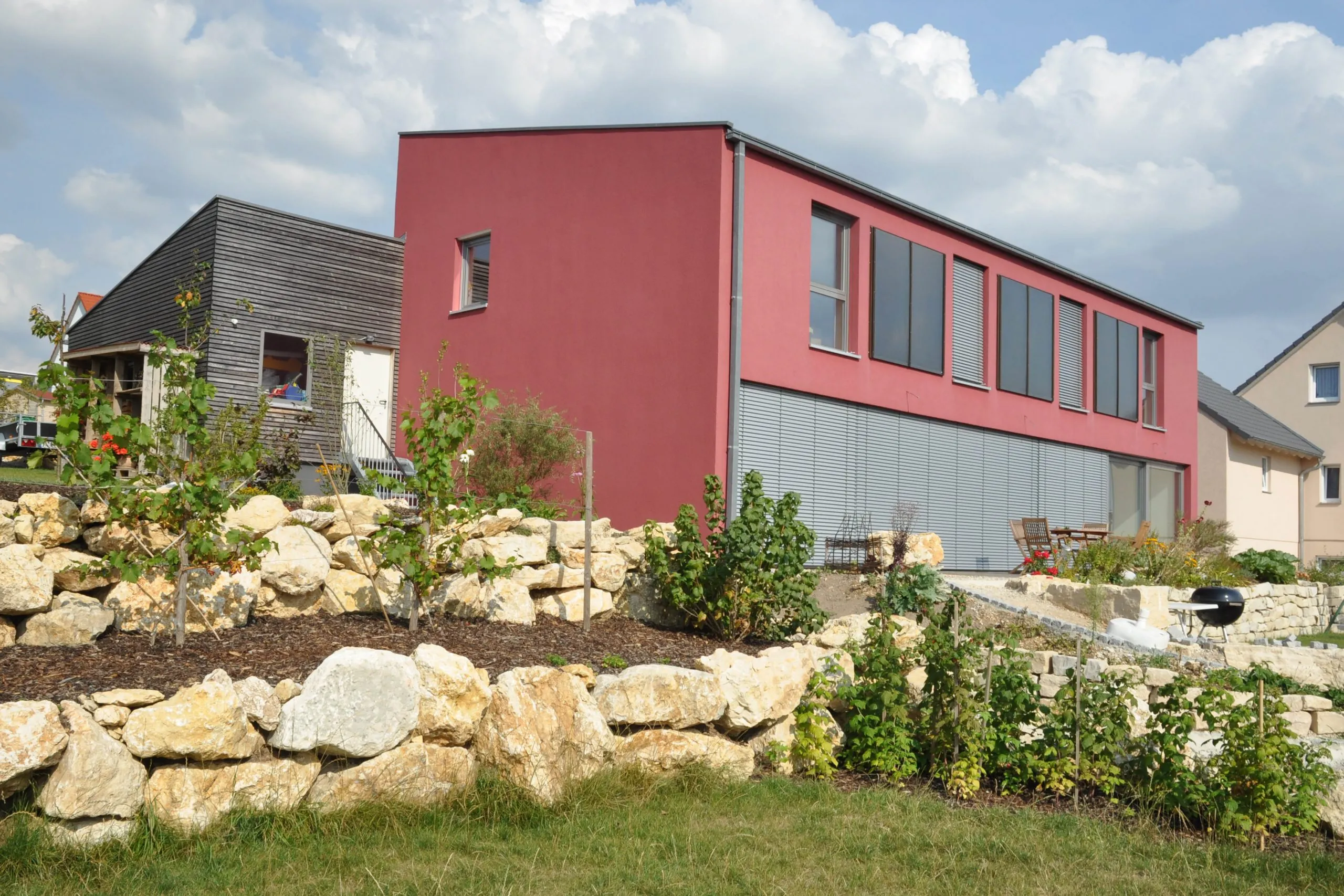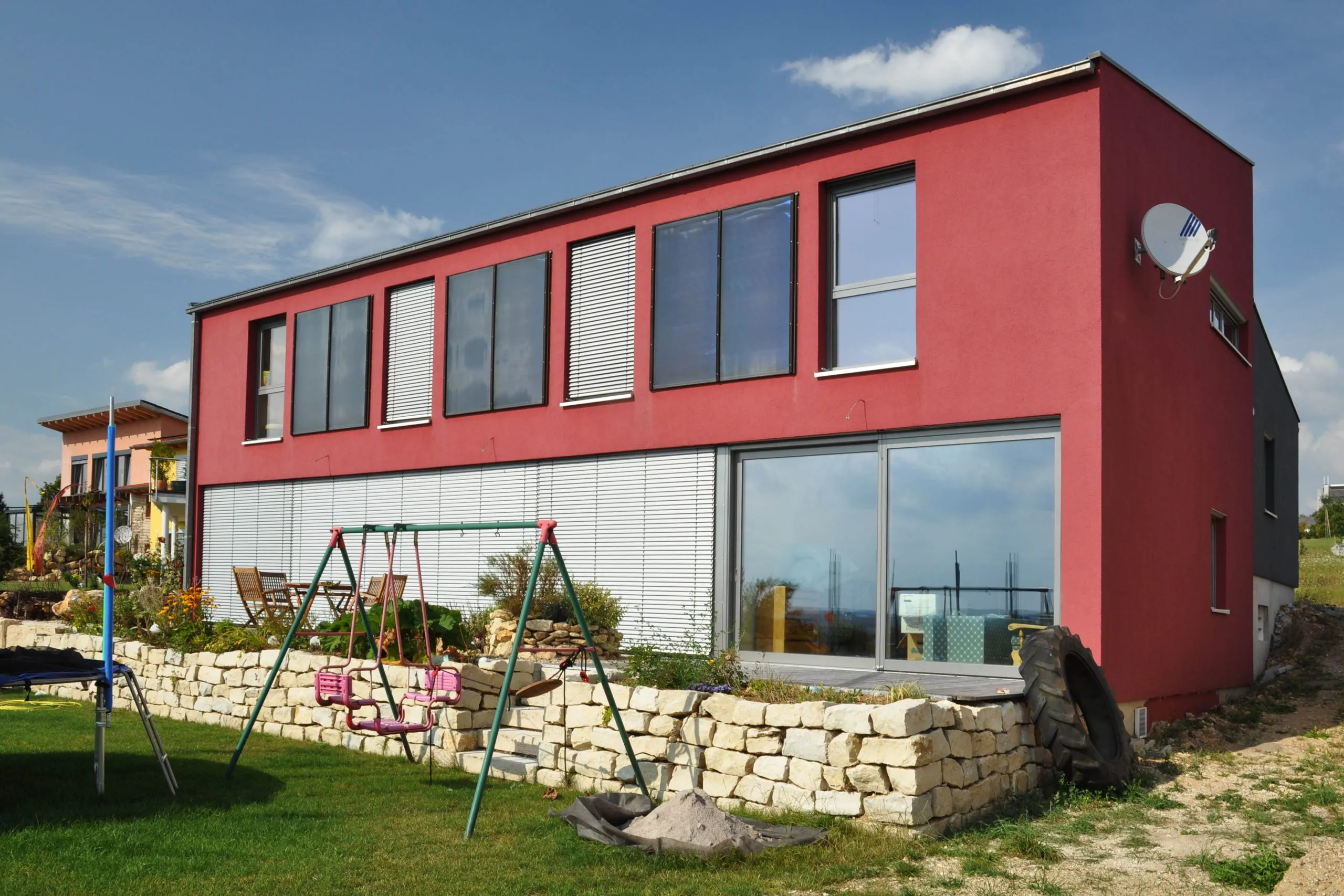 Versetztes Pultdach, Pelletsheizung mit Solarkollektoren an Fassade, Holzmassivboden in Nußbaum, zusätzlicher Kachelofen, Schiebetüre mit 6 Metern Breite