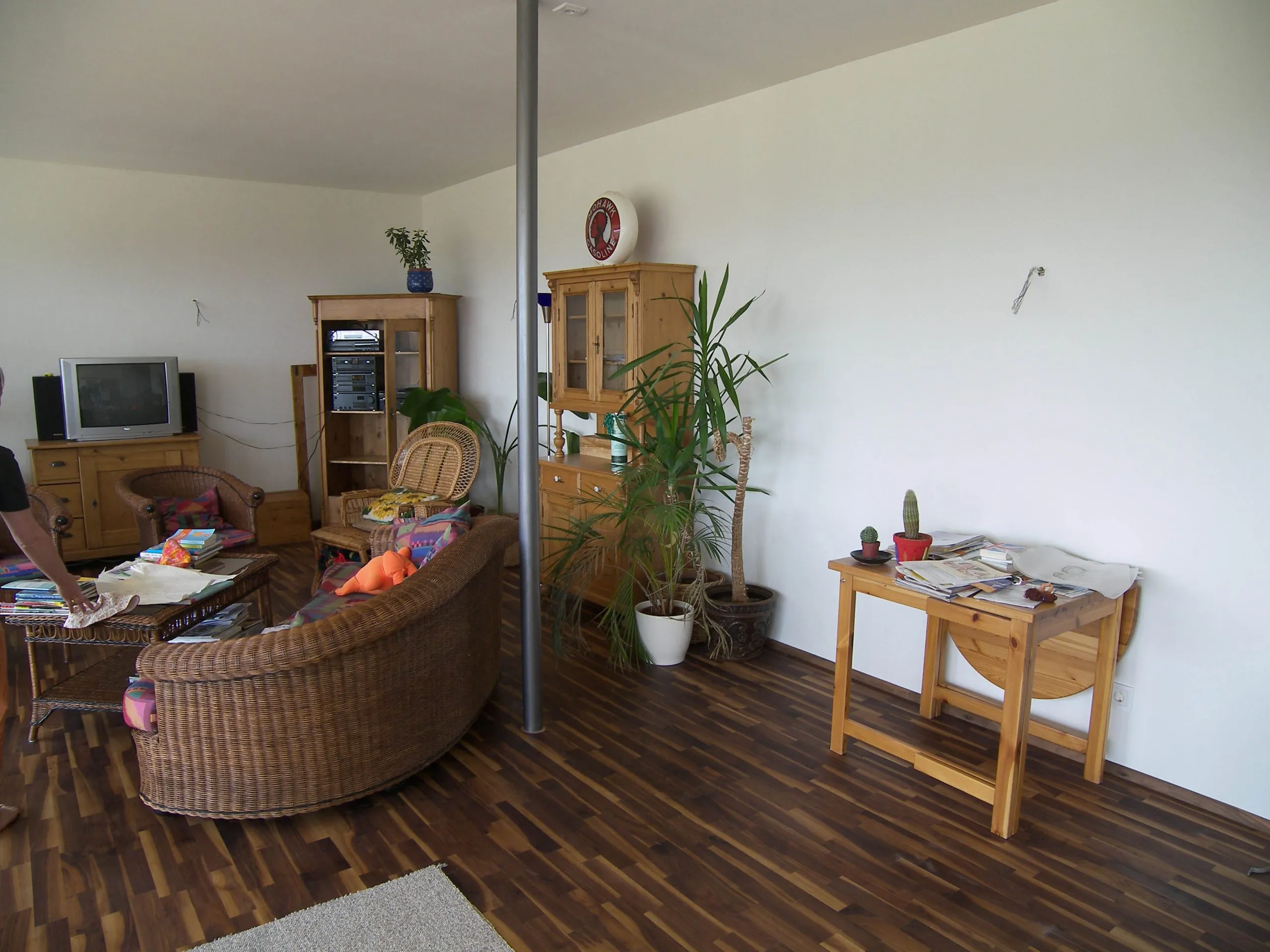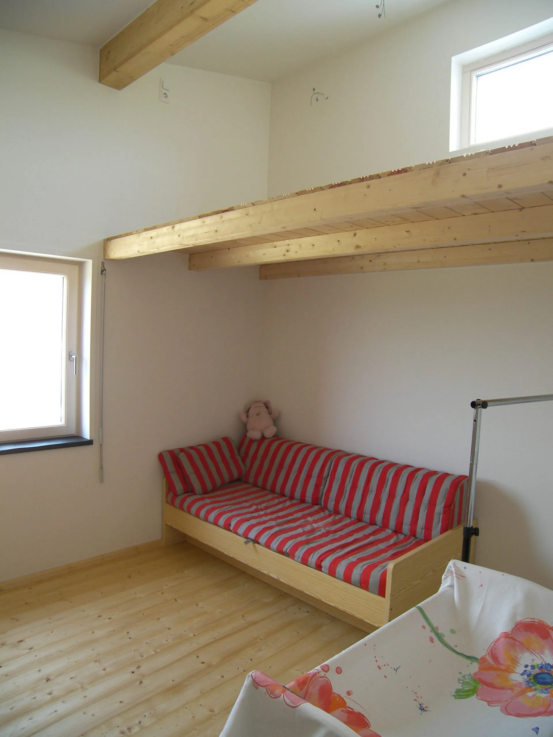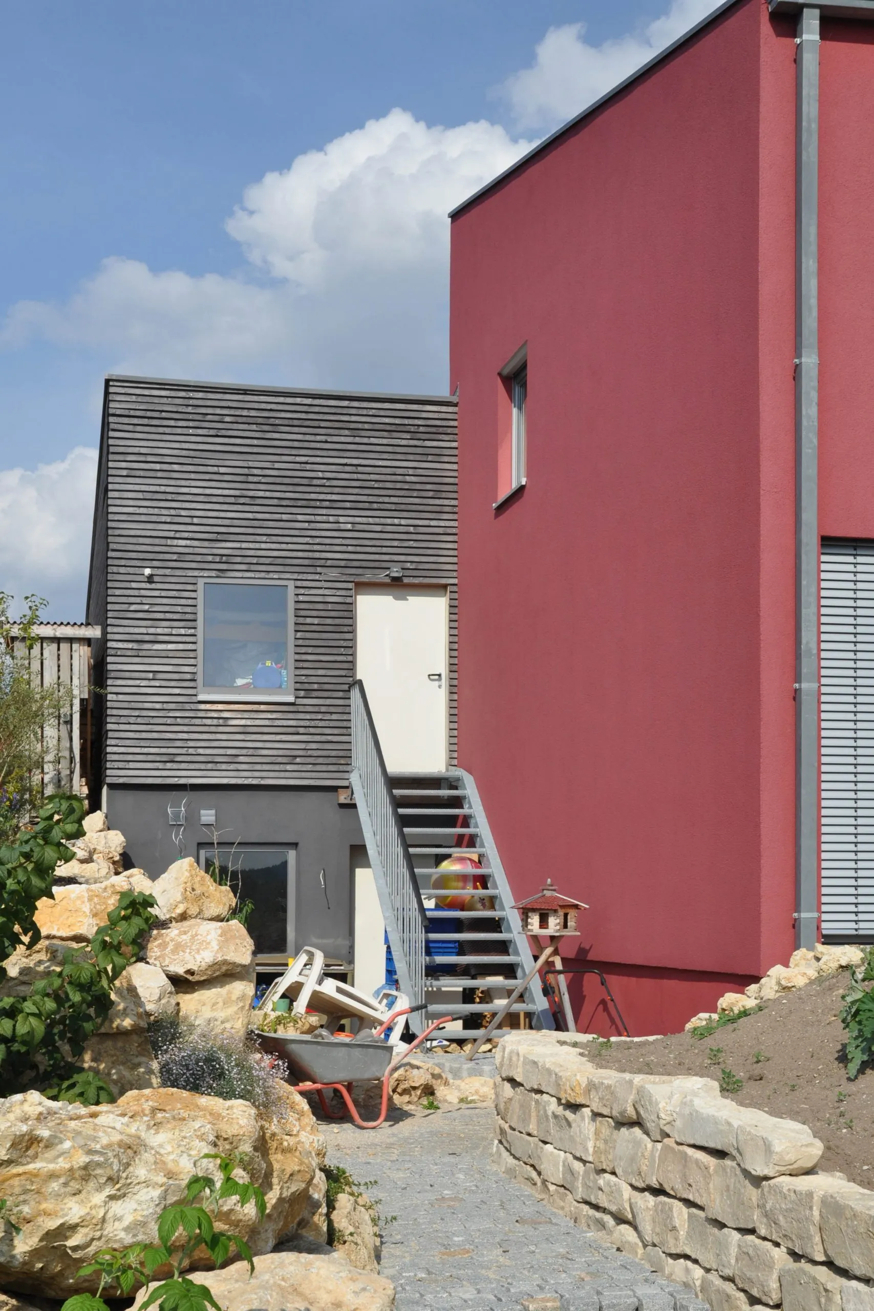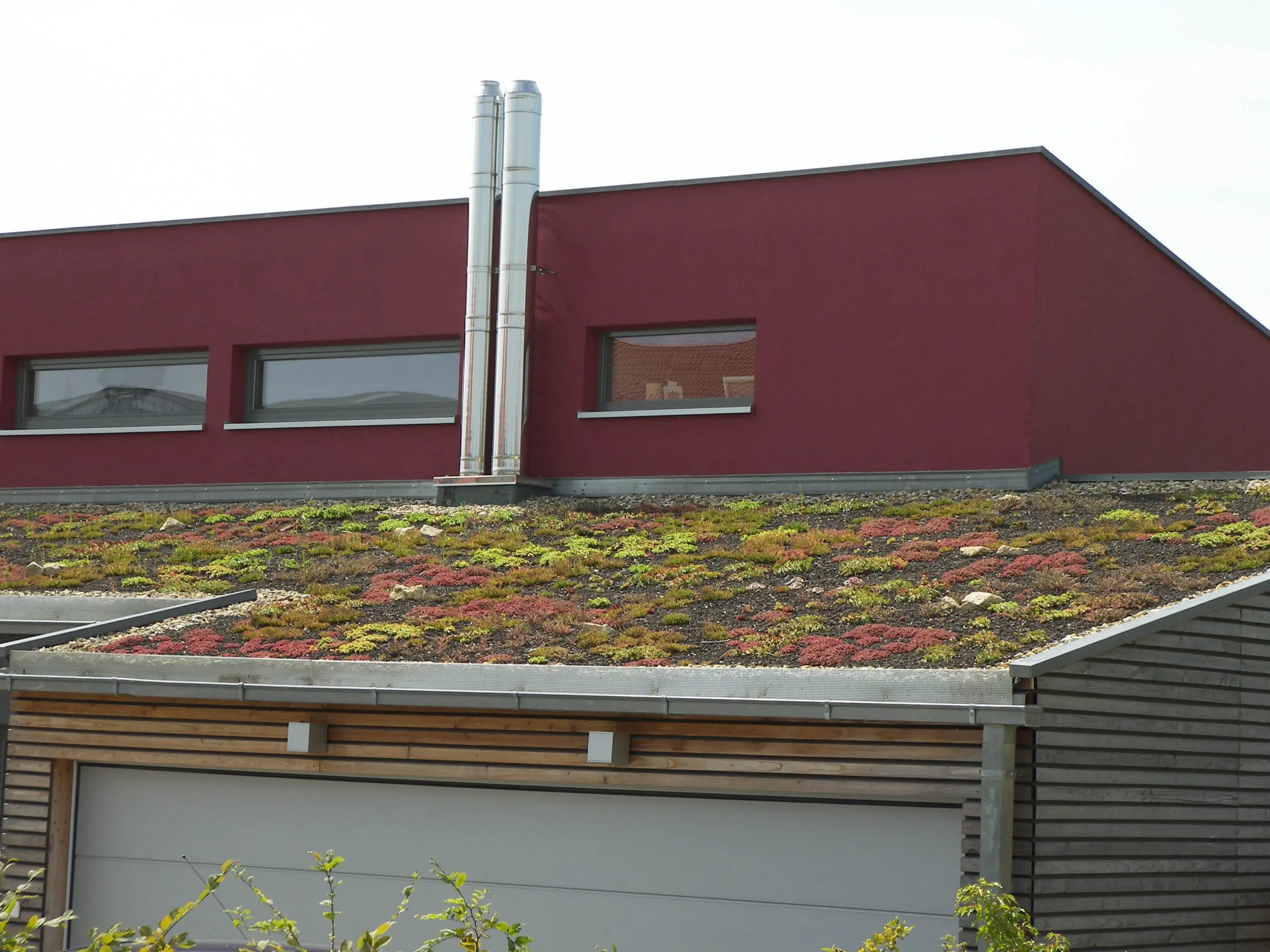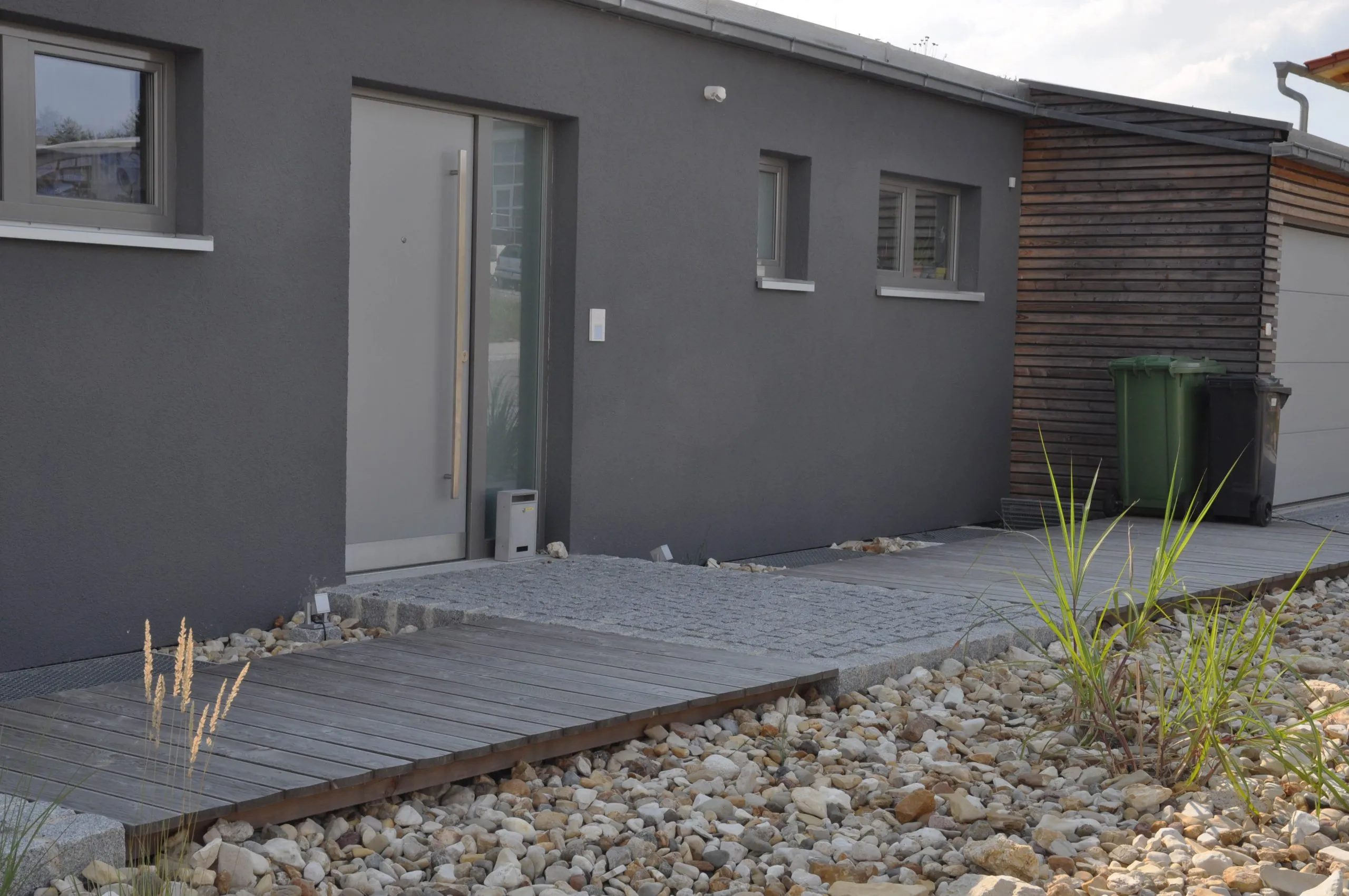 Versetztes Pultdach, Pelletsheizung mit Solarkollektoren an Fassade, Holzmassivboden in Nußbaum, zusätzlicher Kachelofen, Schiebetüre mit 6 Metern Breite