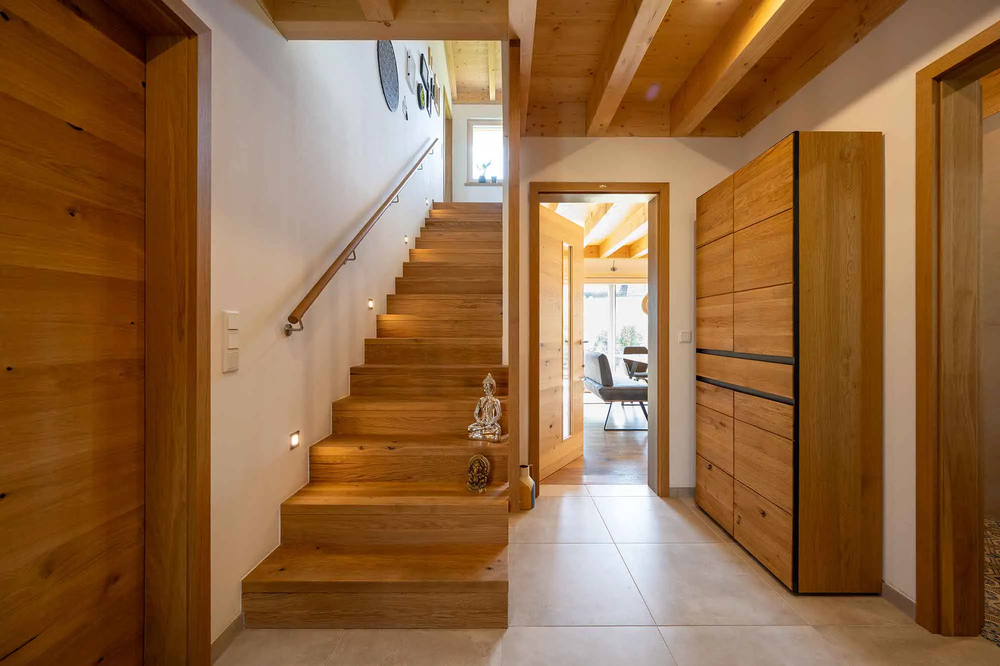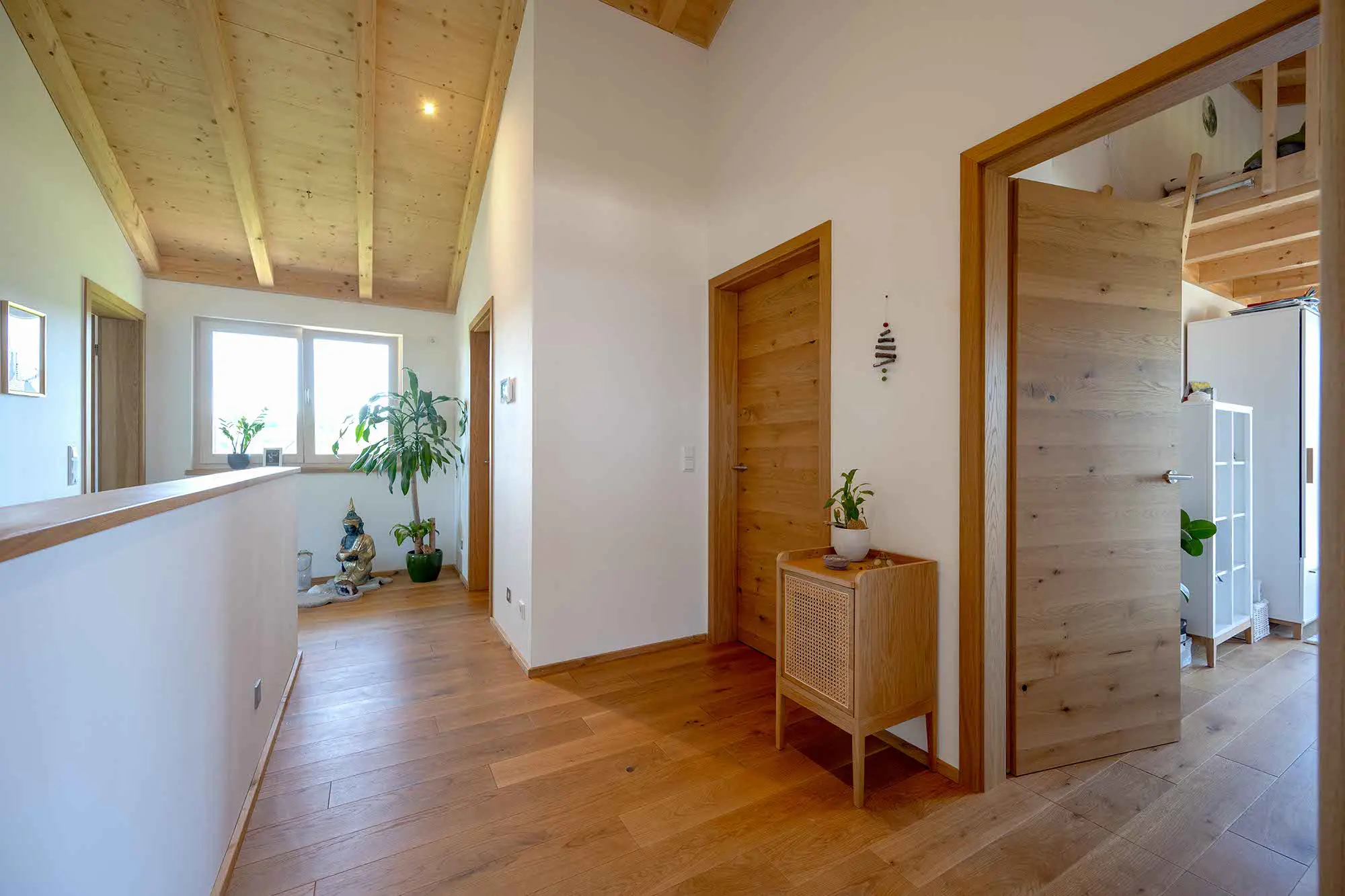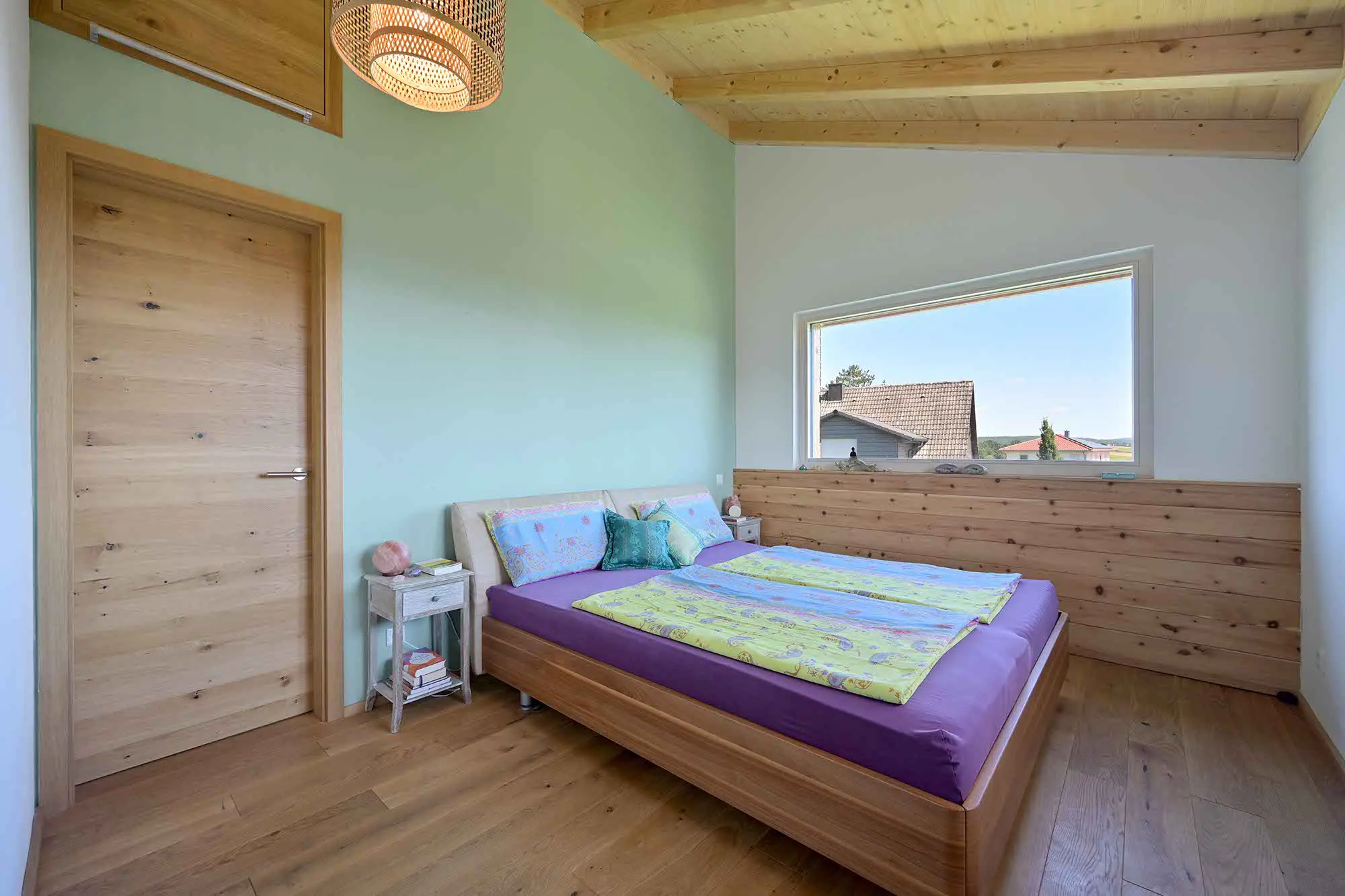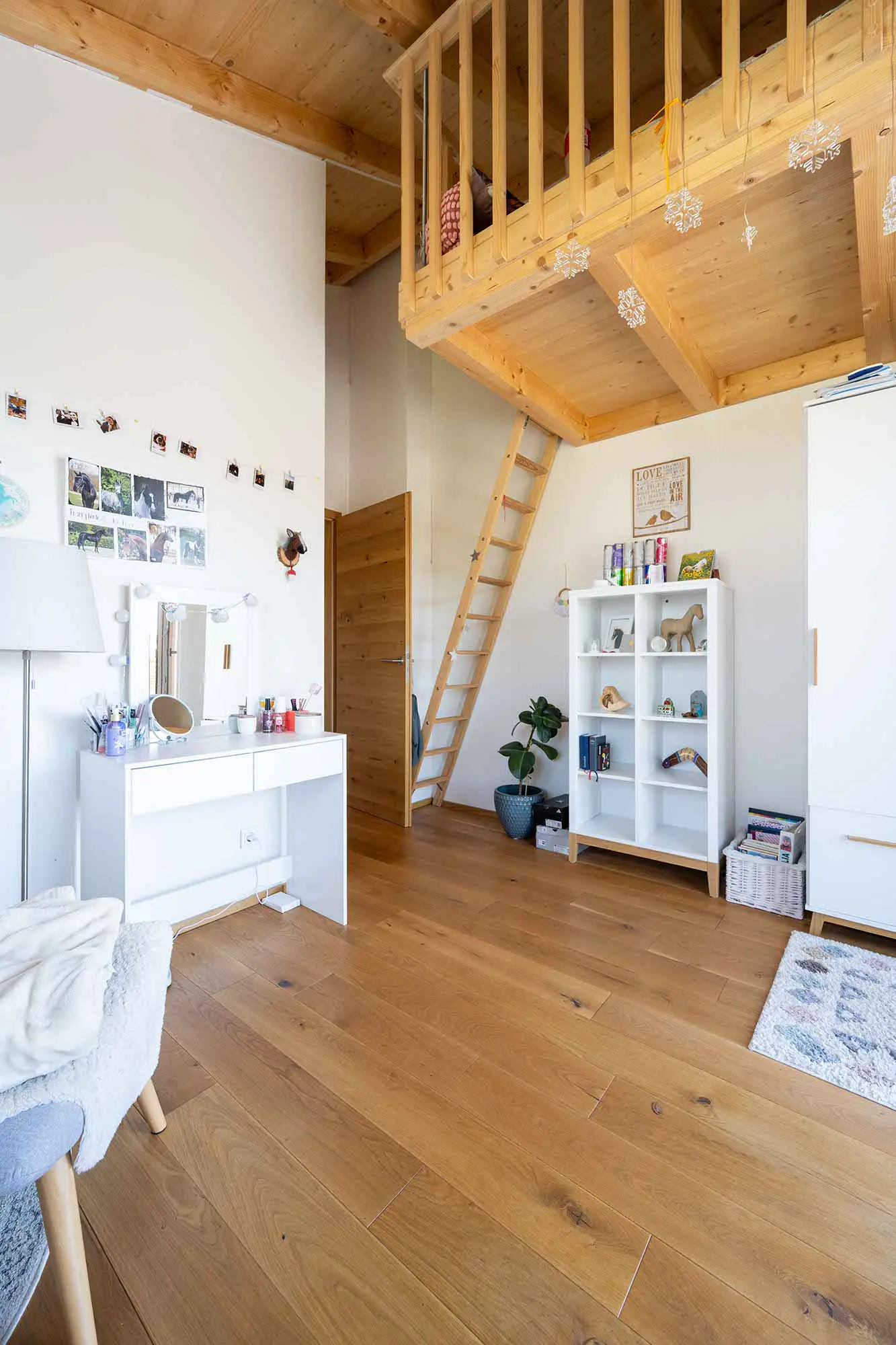 Zirbenwand im Schlafzimmer, Dachterrasse, windgeschützter Freisitz, maßgeschneiderter Stauraum unter der Treppe, Kinderzimmer mit Galerie