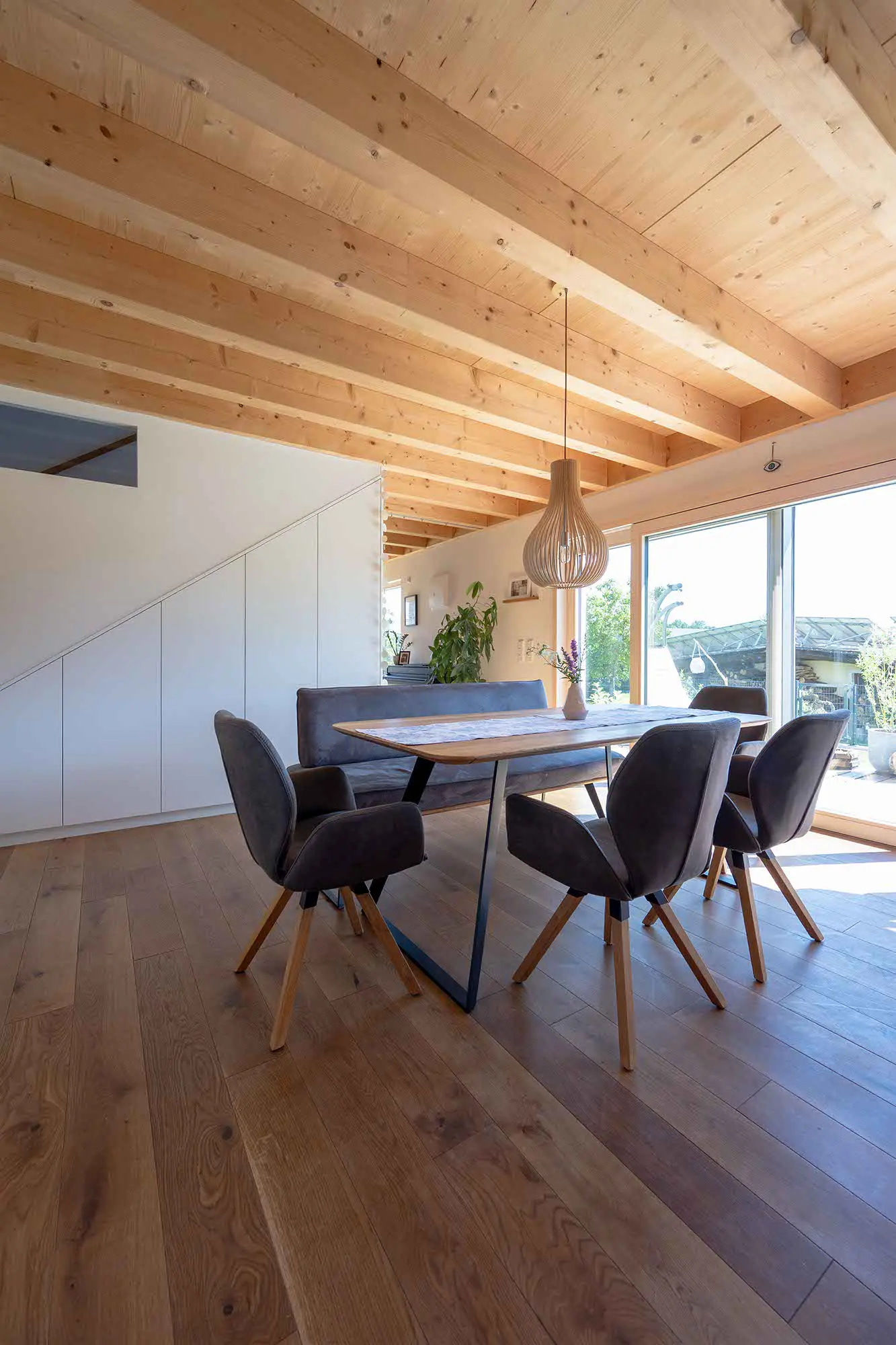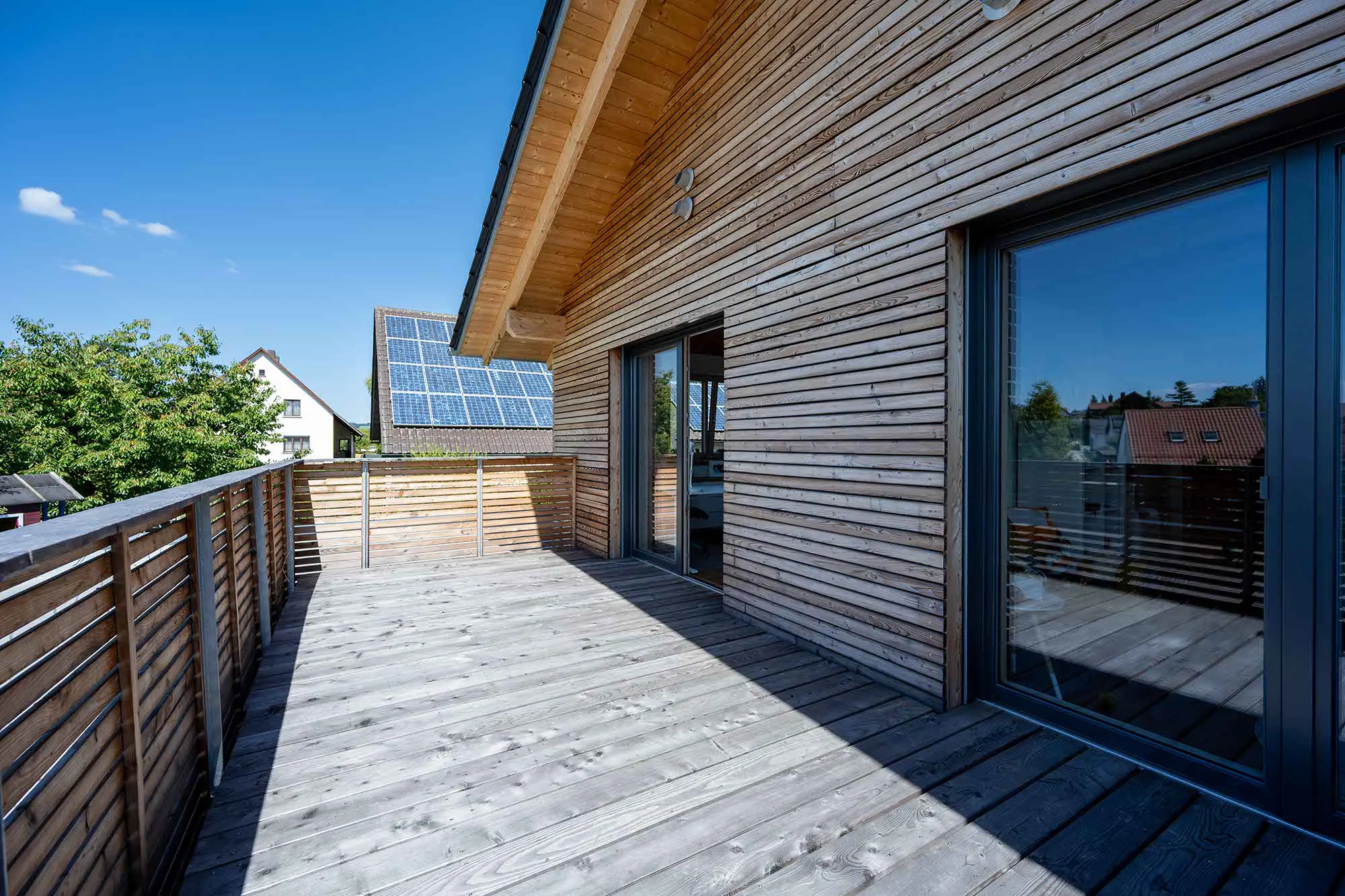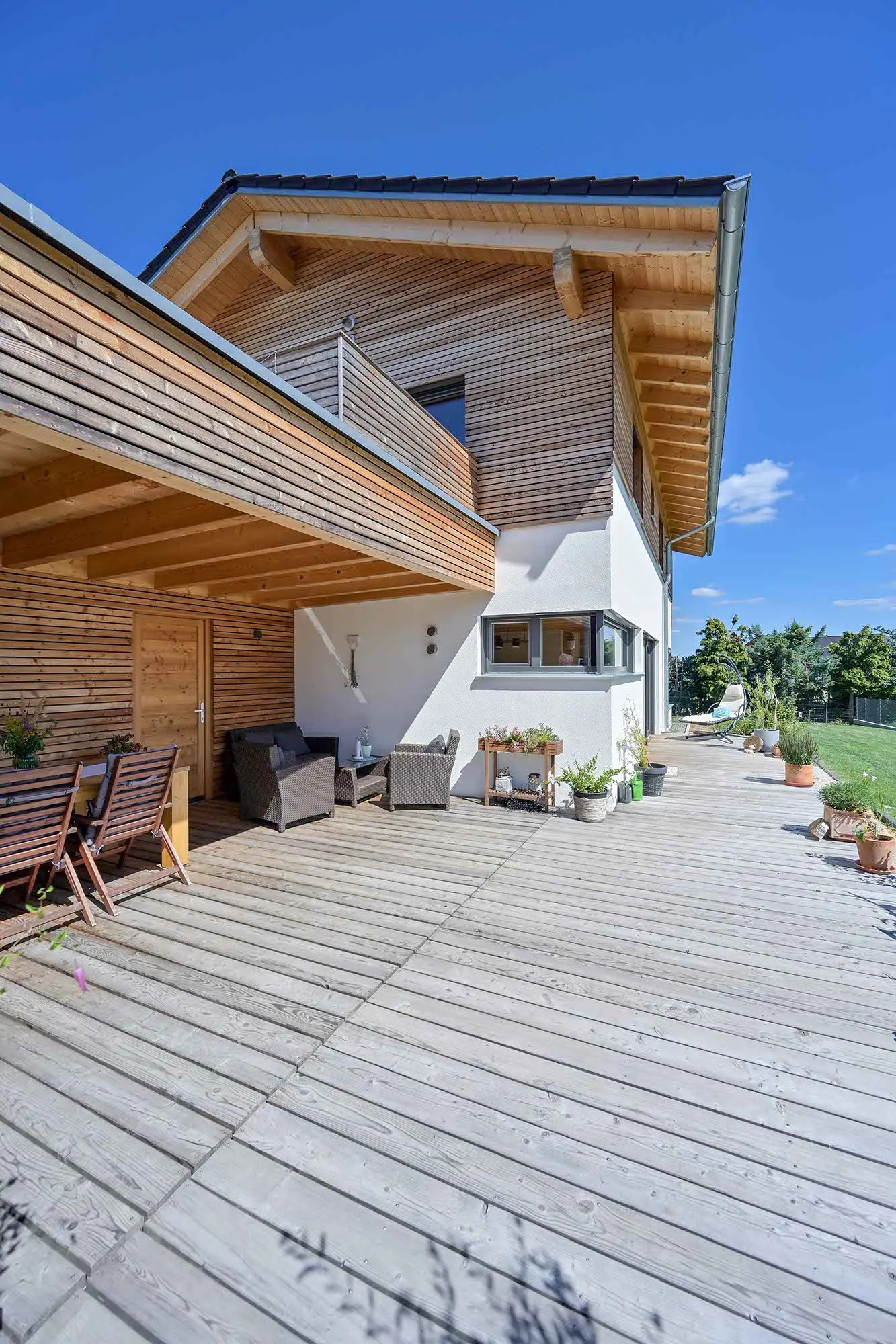Zirbenwand im Schlafzimmer, Dachterrasse, windgeschützter Freisitz, maßgeschneiderter Stauraum unter der Treppe, Kinderzimmer mit Galerie