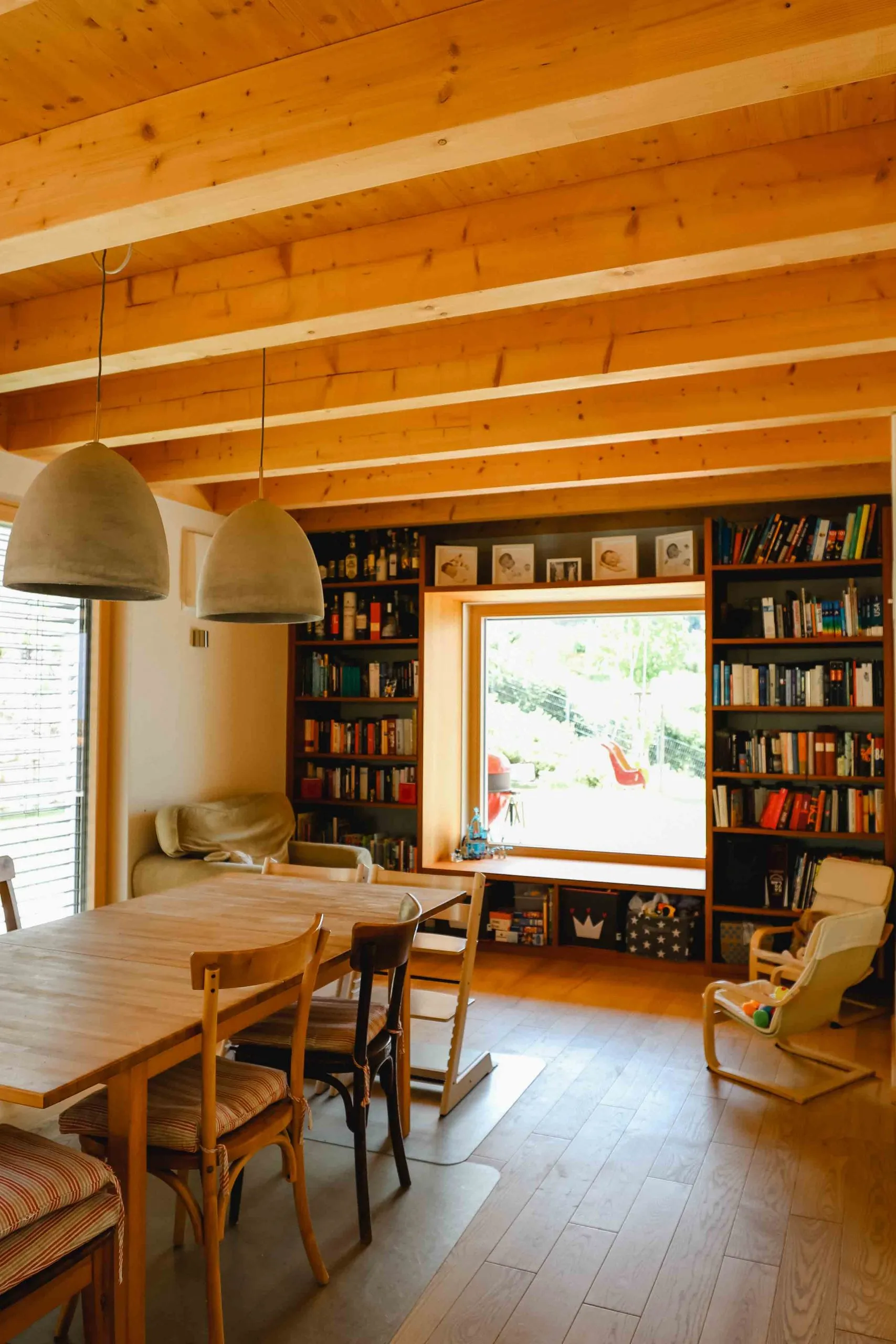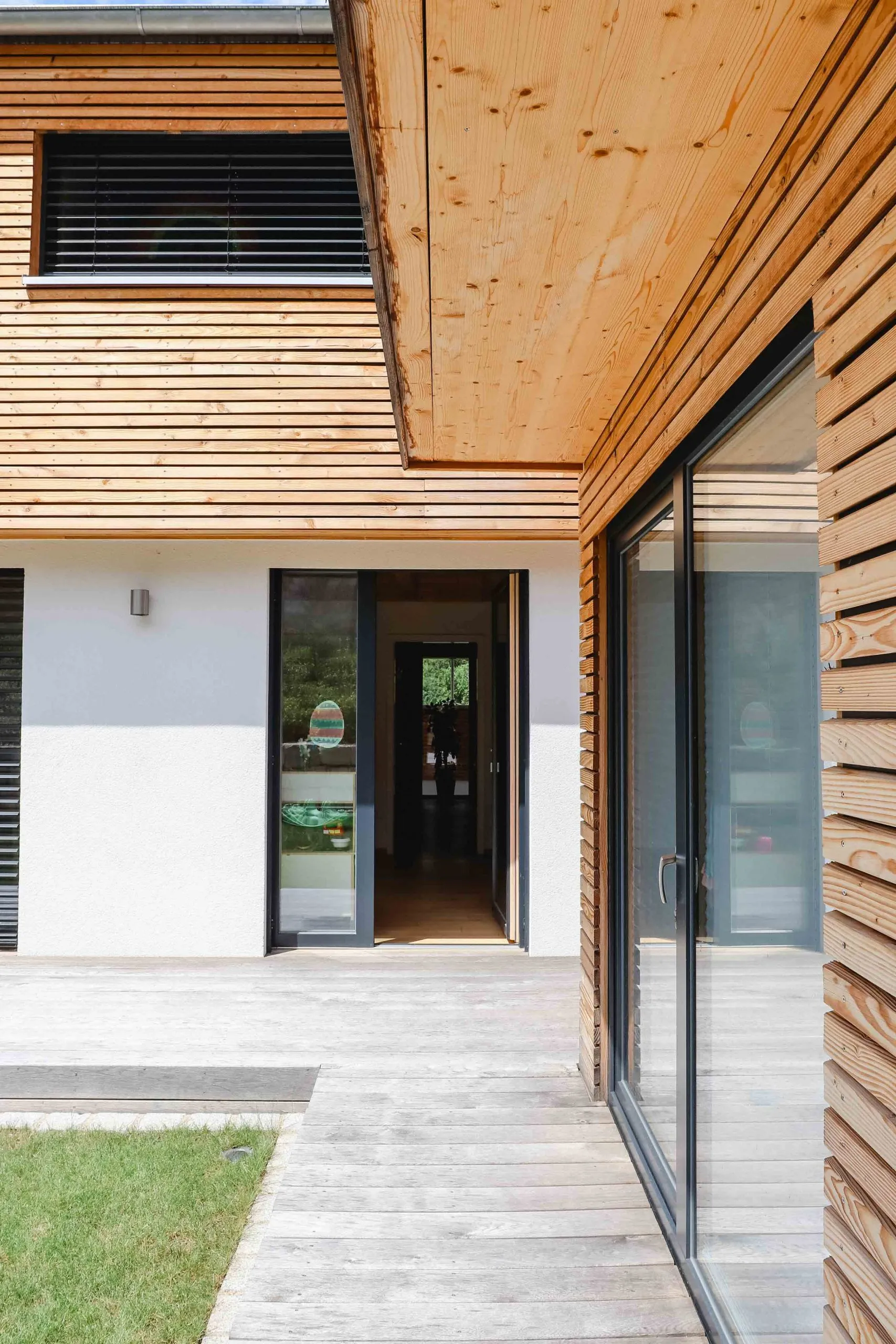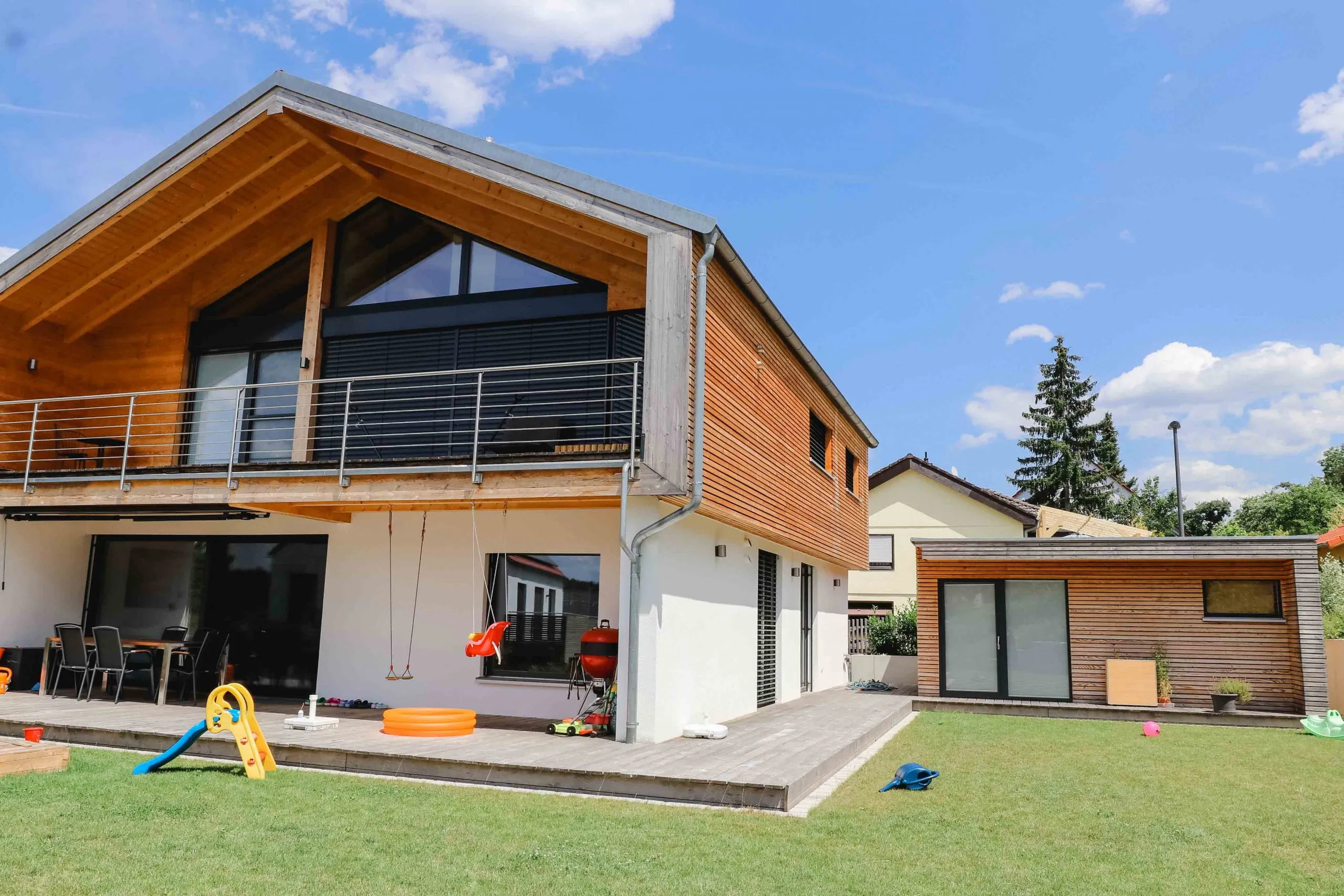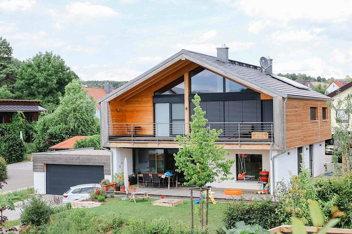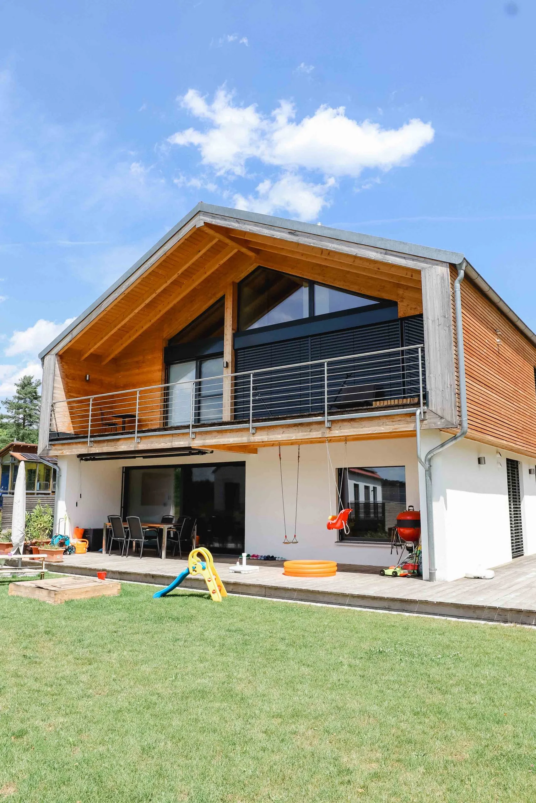 naturbelassene Rhombusleistenschalung, eindrucksvoller Balkon mit vorgezogenem Hauptdach, Saunahaus im Garten, Sitzfenster mit integriertem Bücherregal