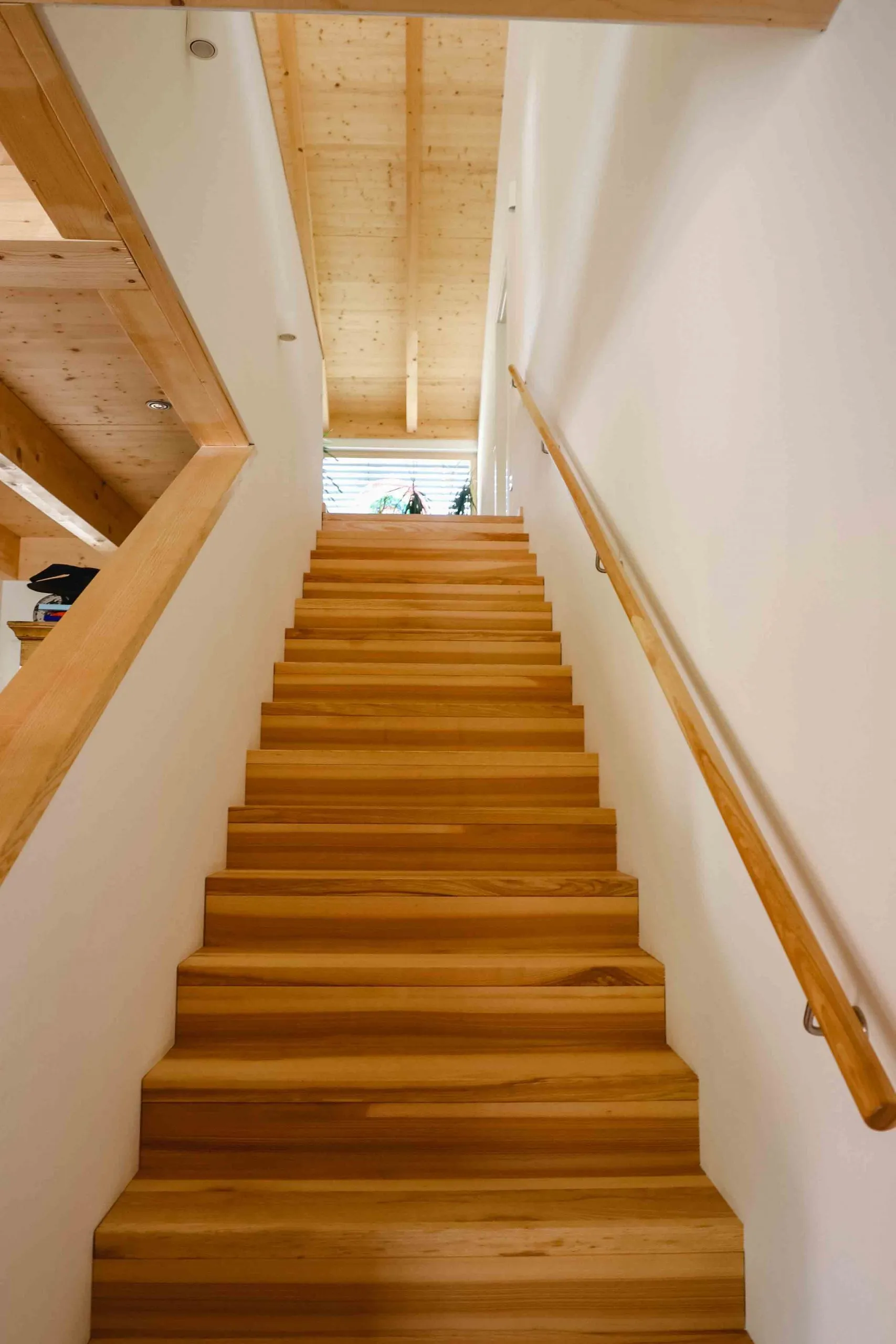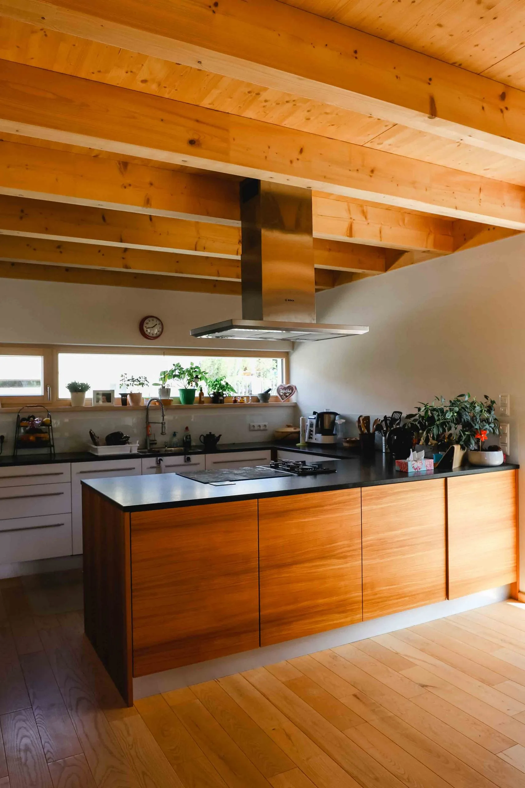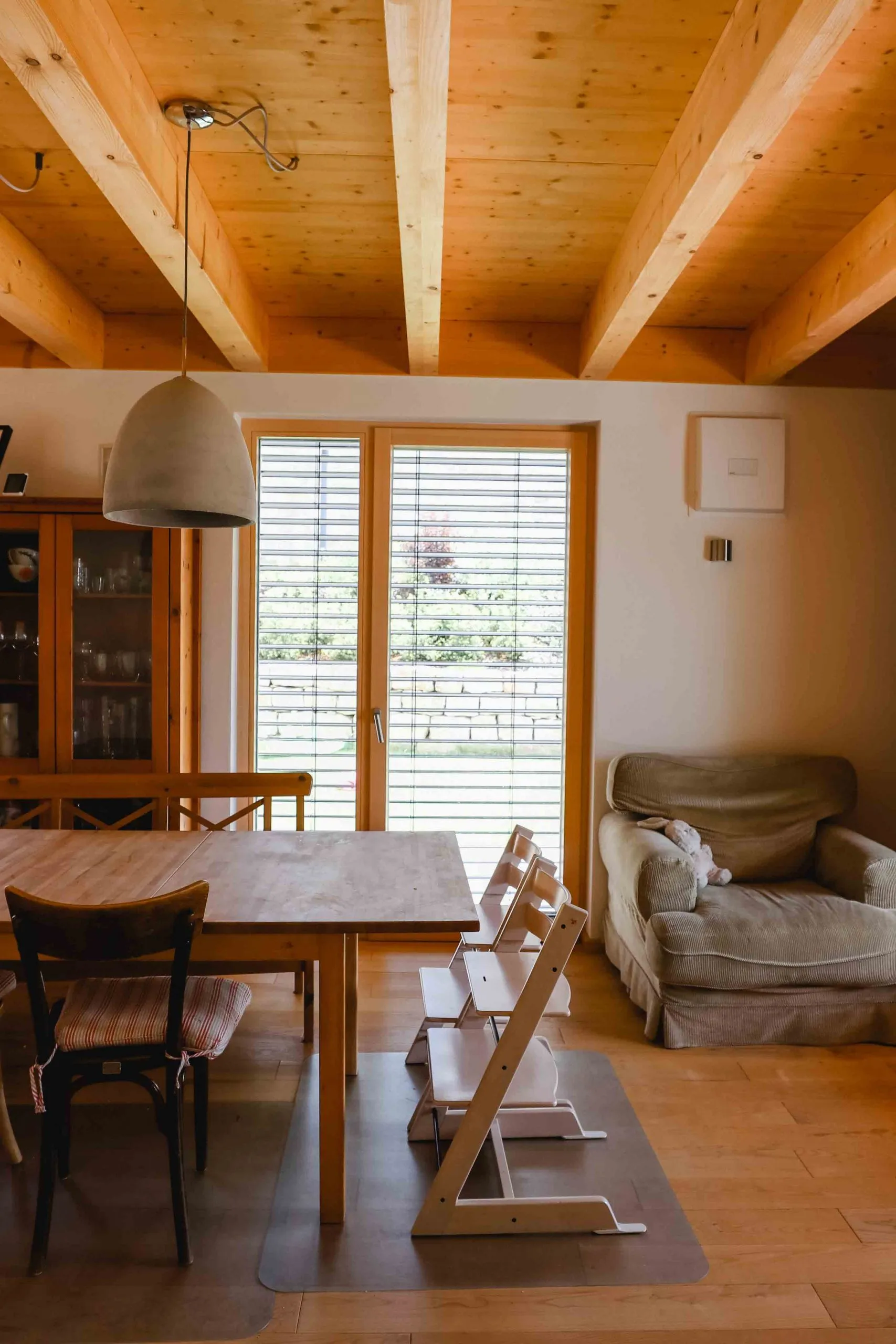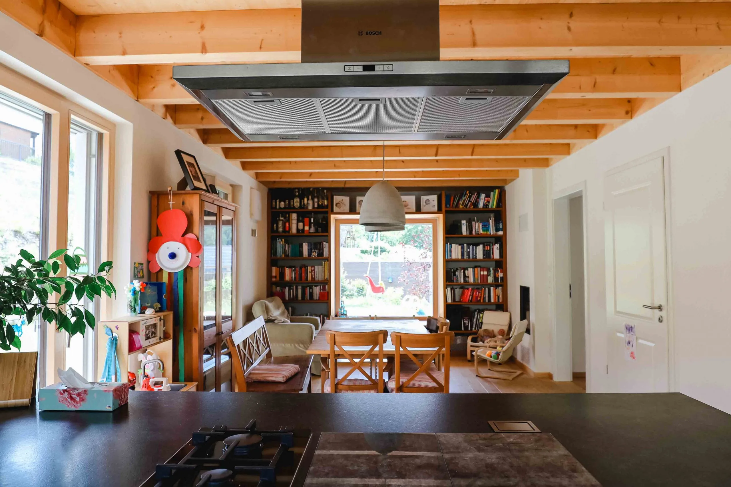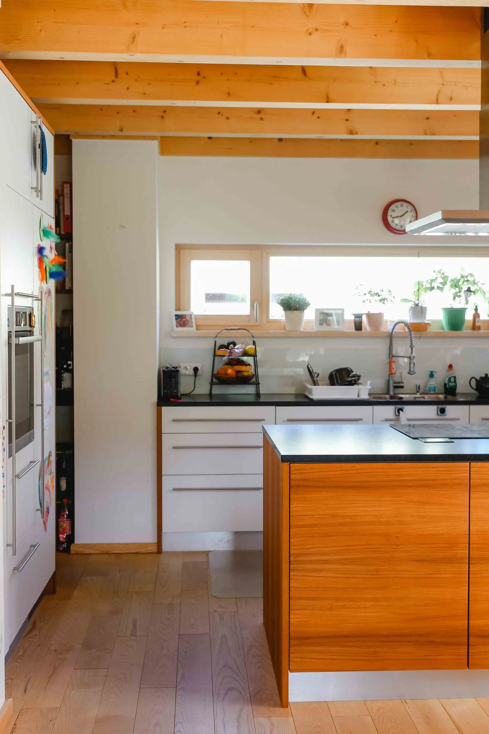 naturbelassene Rhombusleistenschalung, eindrucksvoller Balkon mit vorgezogenem Hauptdach, Saunahaus im Garten, Sitzfenster mit integriertem Bücherregal