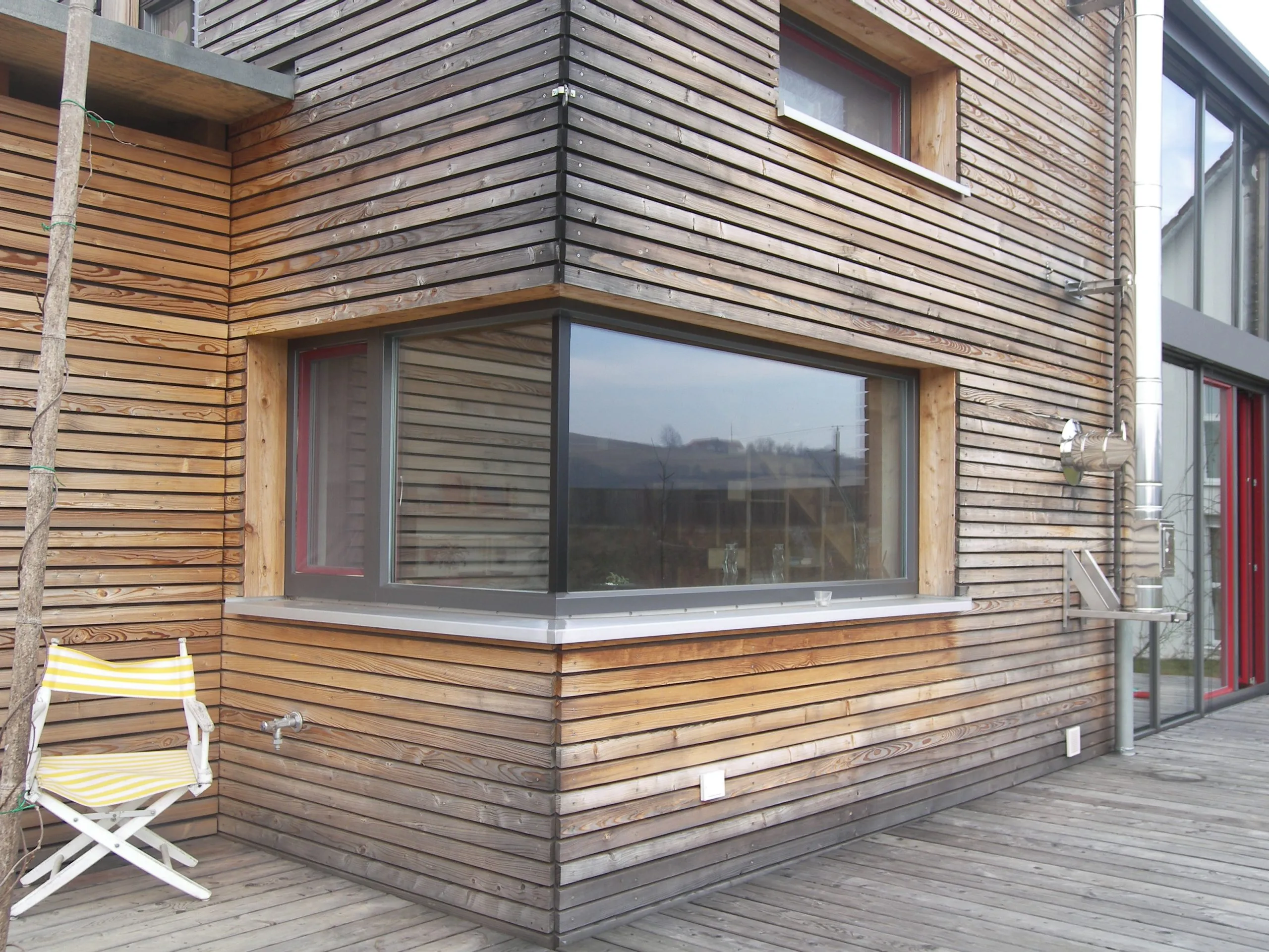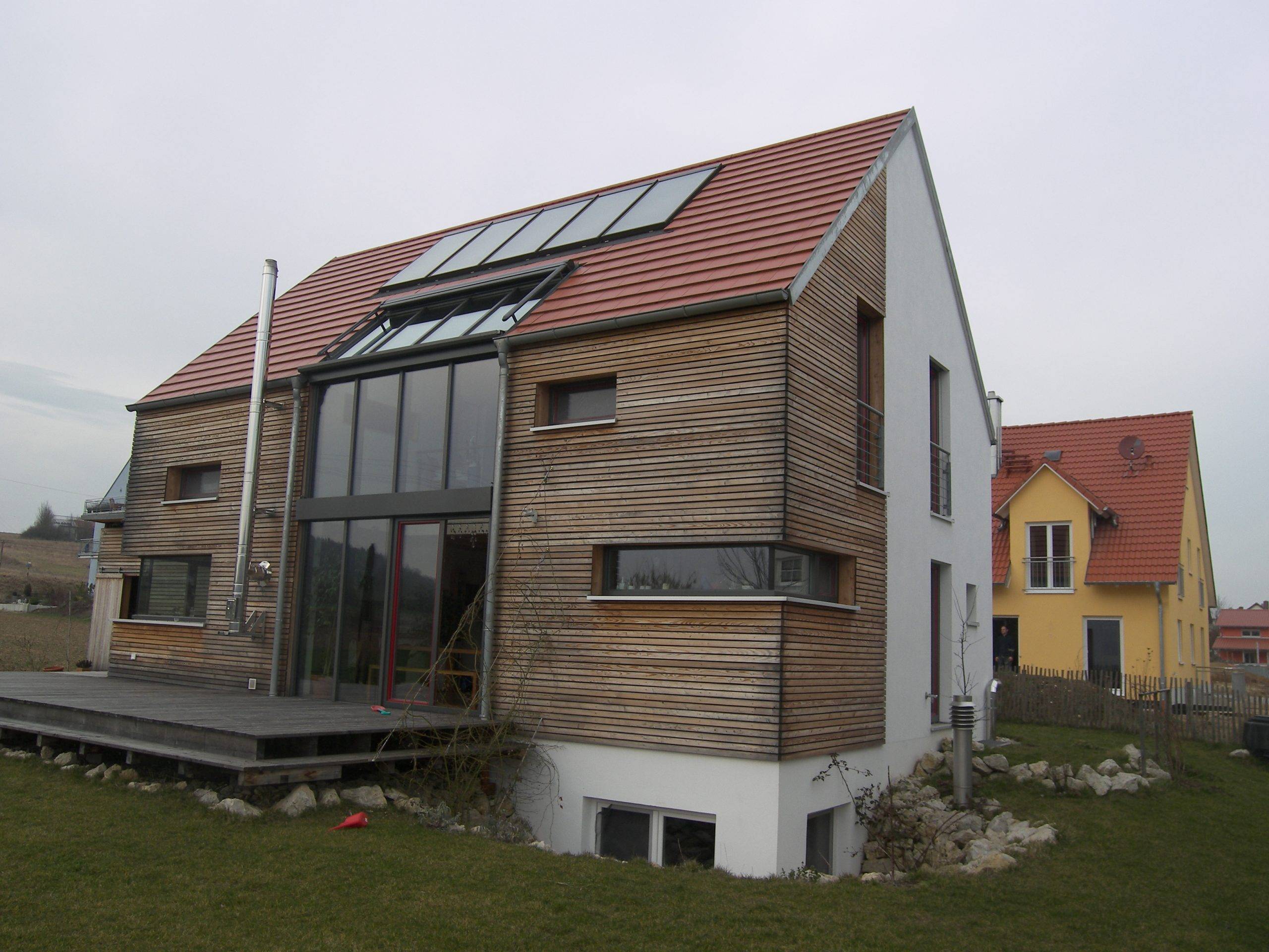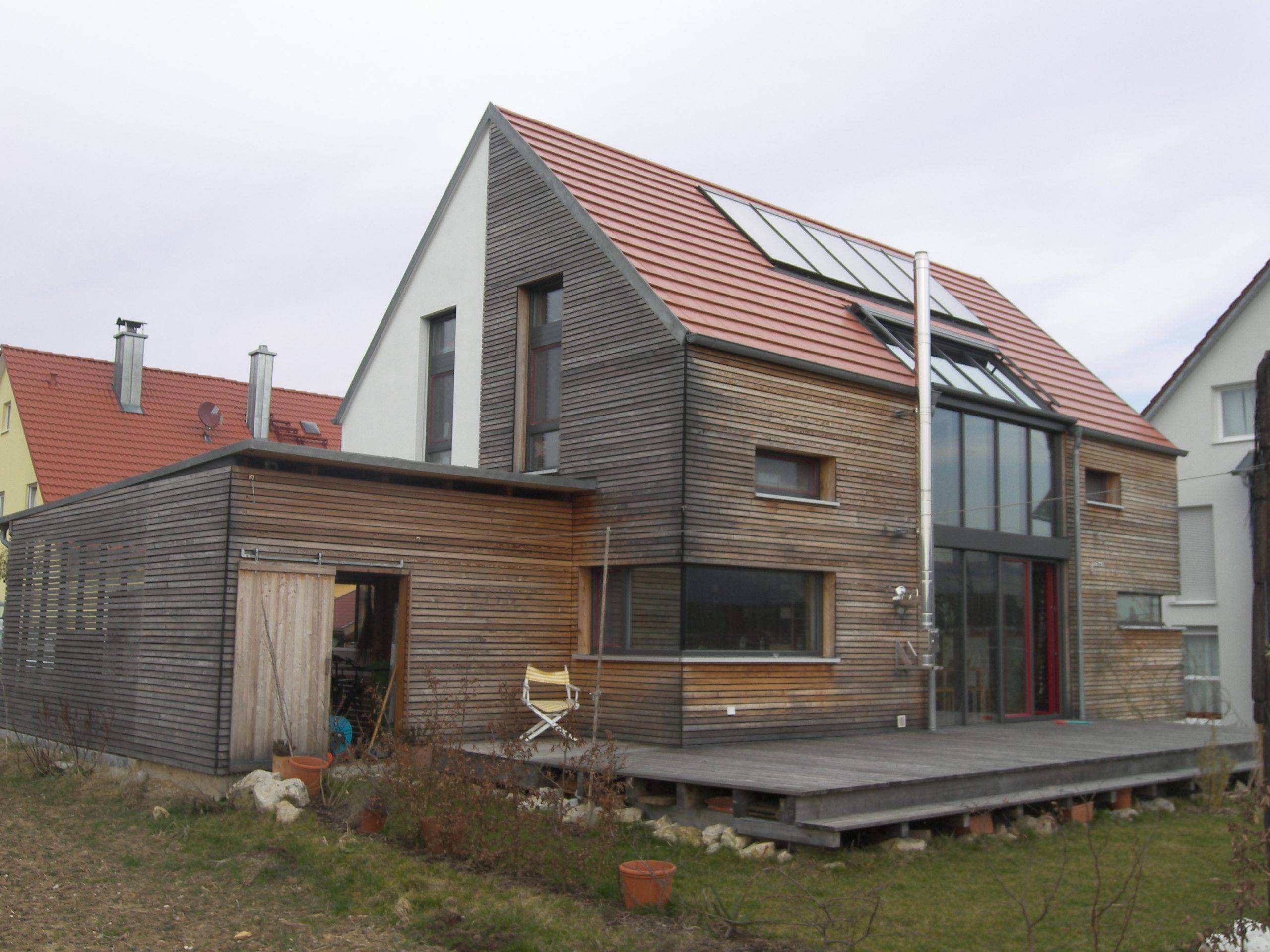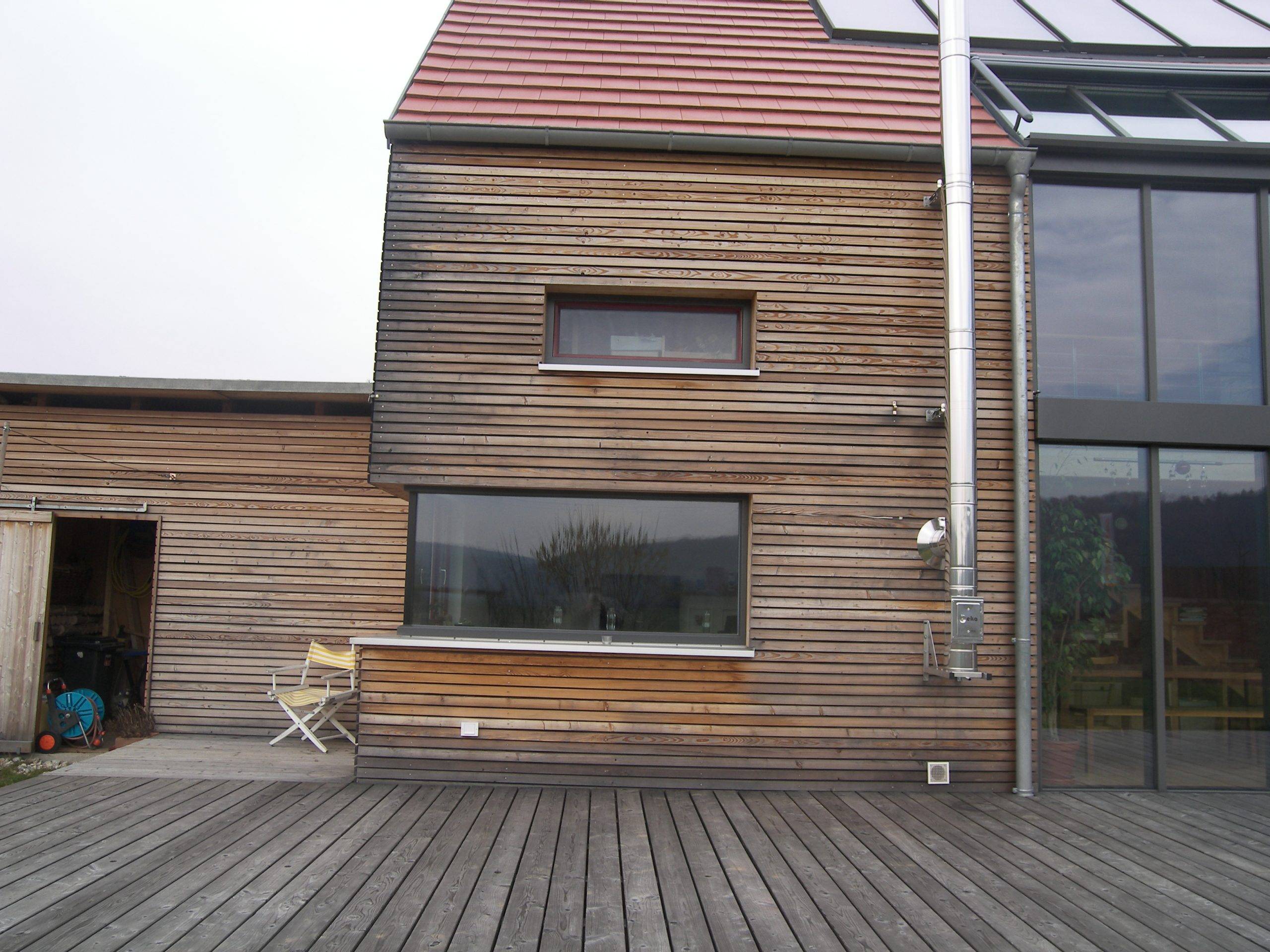 Wintergarten in Fassade integriert, mit Beschattung, Ganzhausheizung mit Kaminofen für Scheitholz mit Wassertaschen