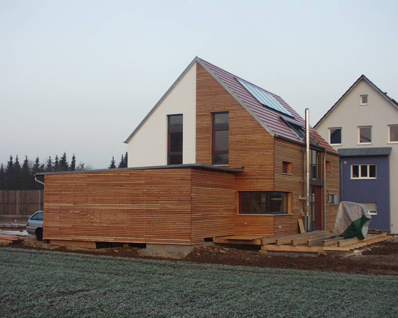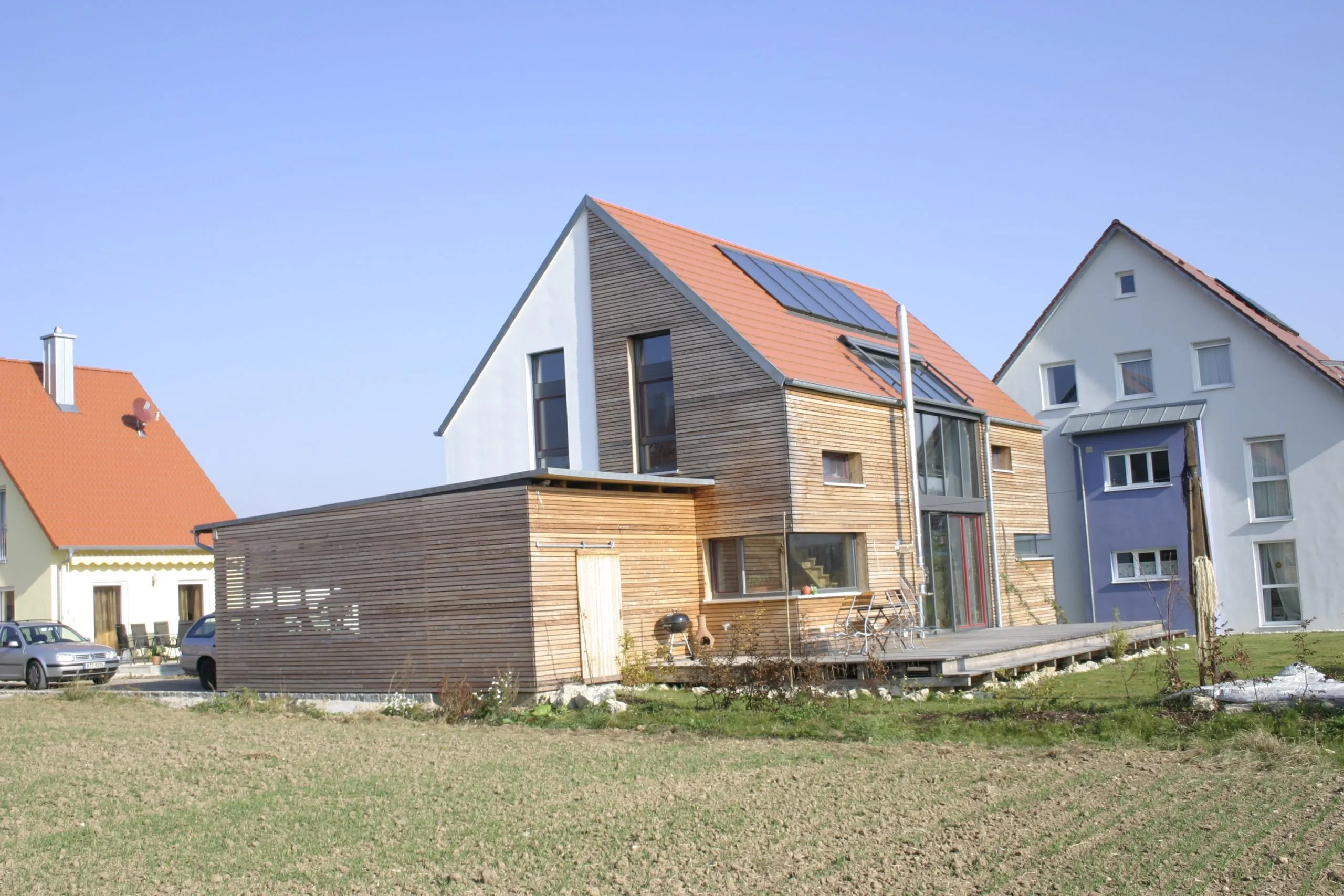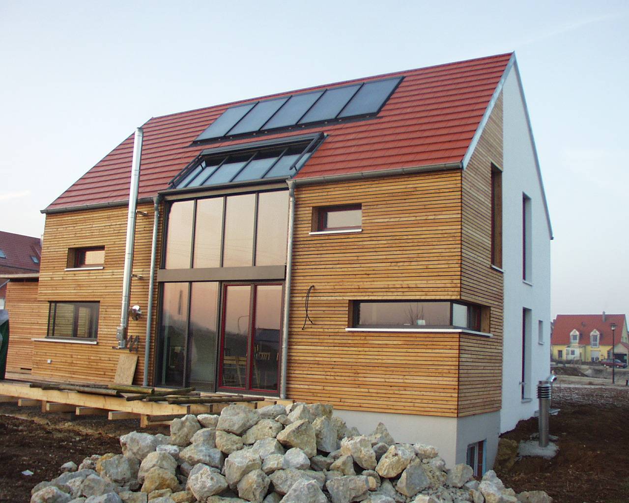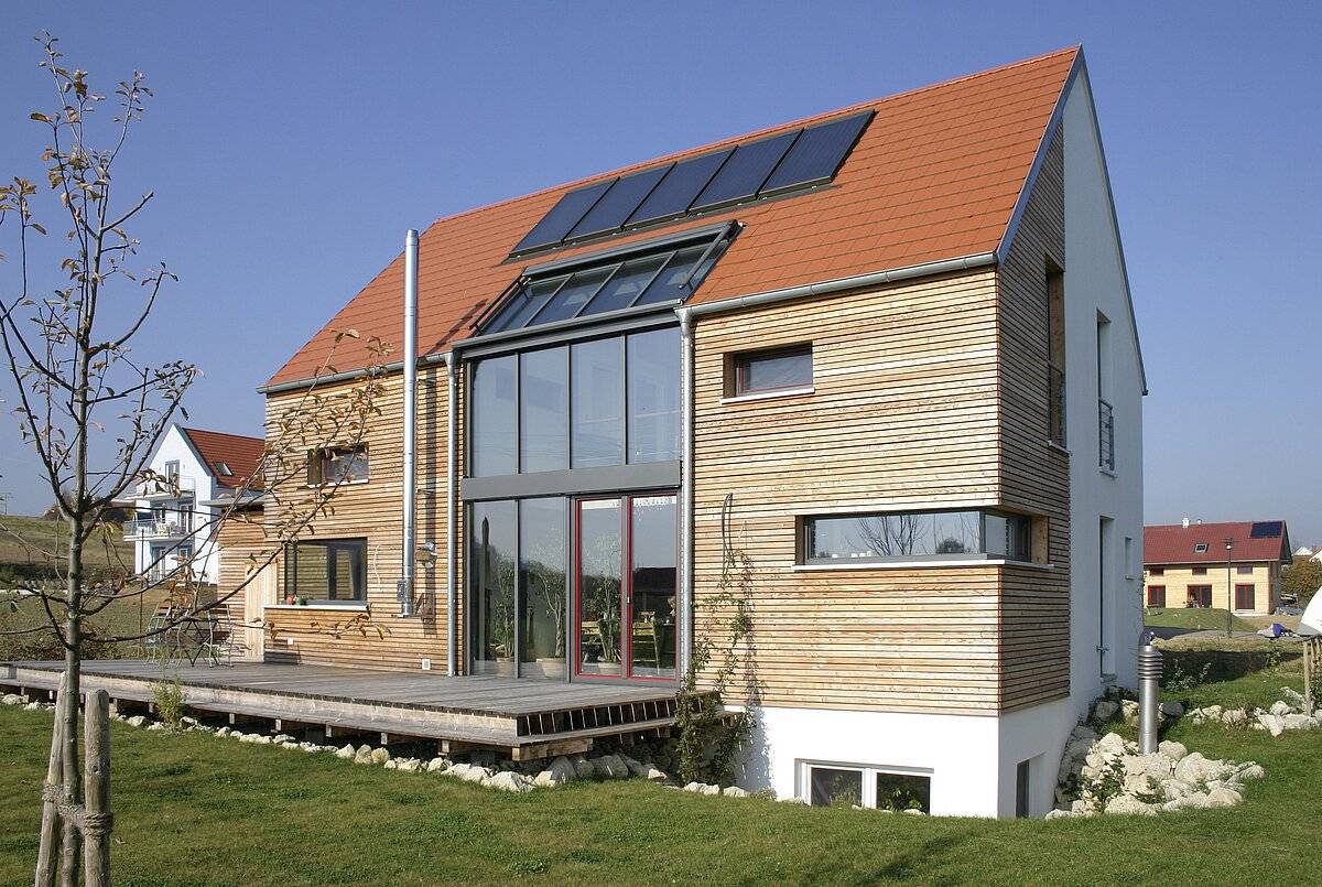 Wintergarten in Fassade integriert, mit Beschattung, Ganzhausheizung mit Kaminofen für Scheitholz mit Wassertaschen