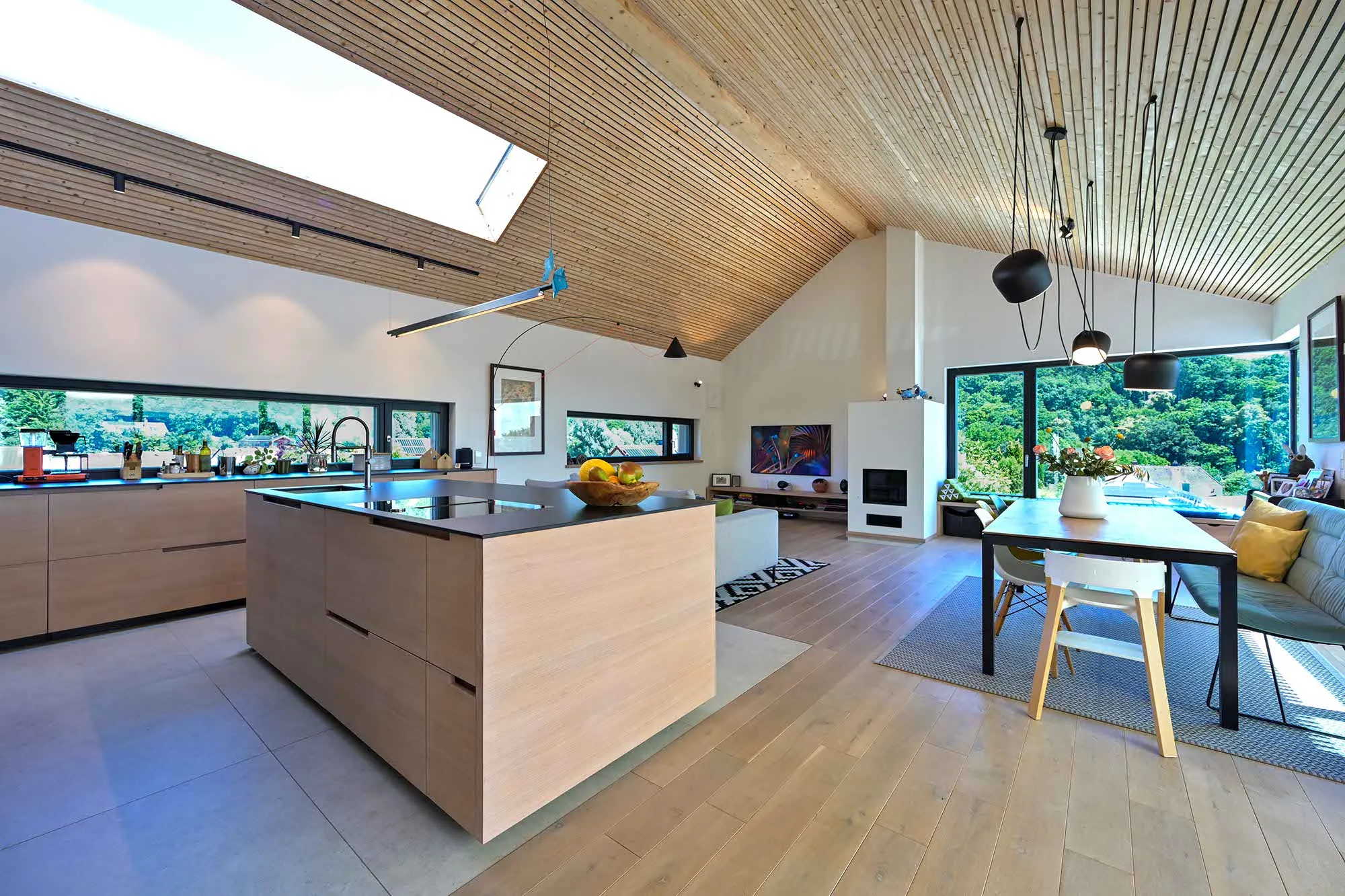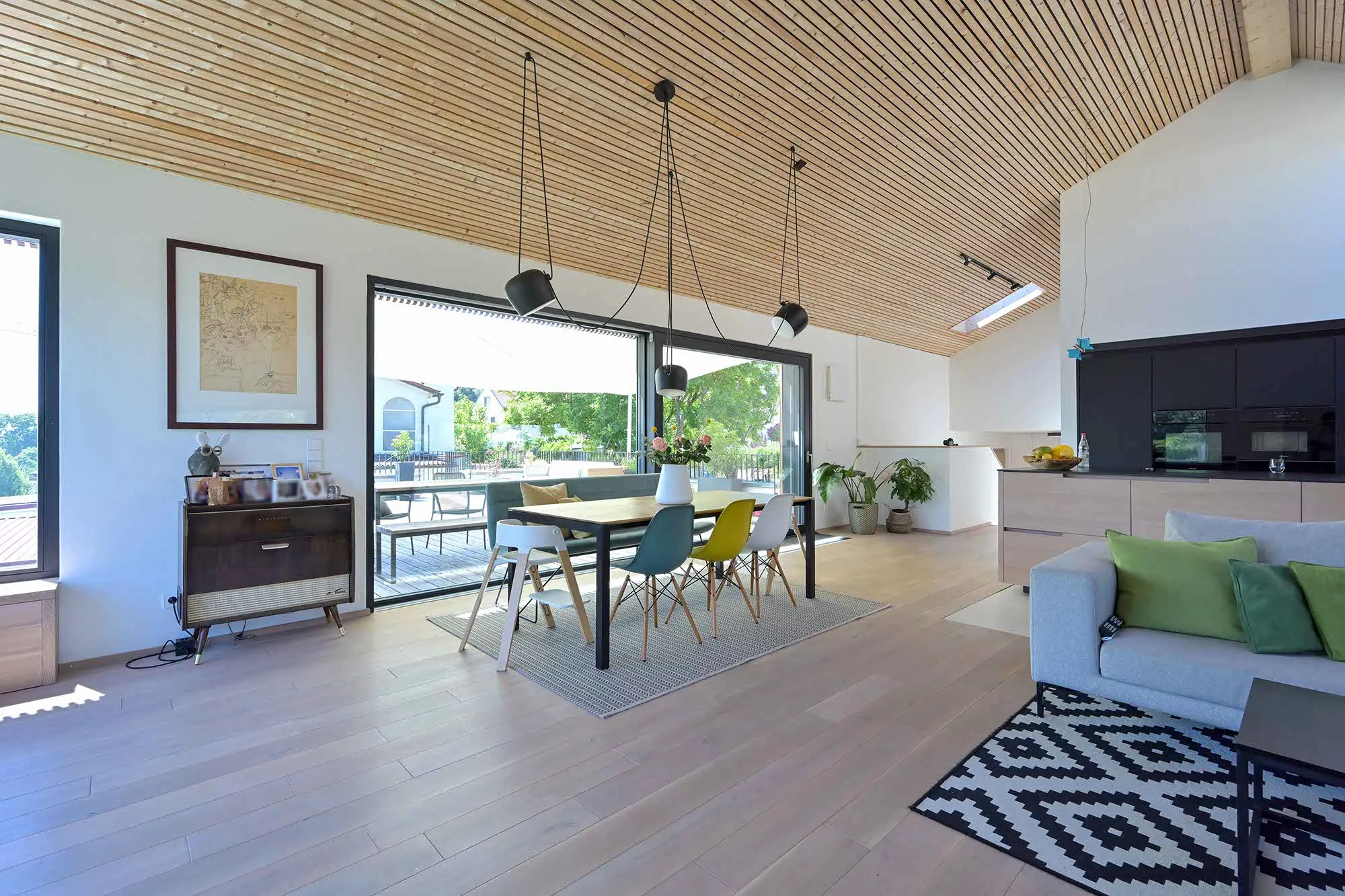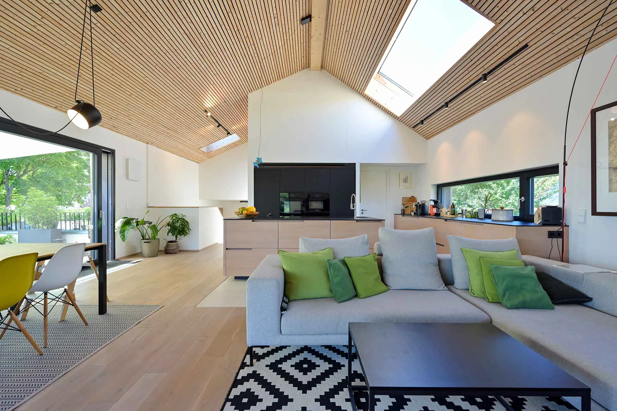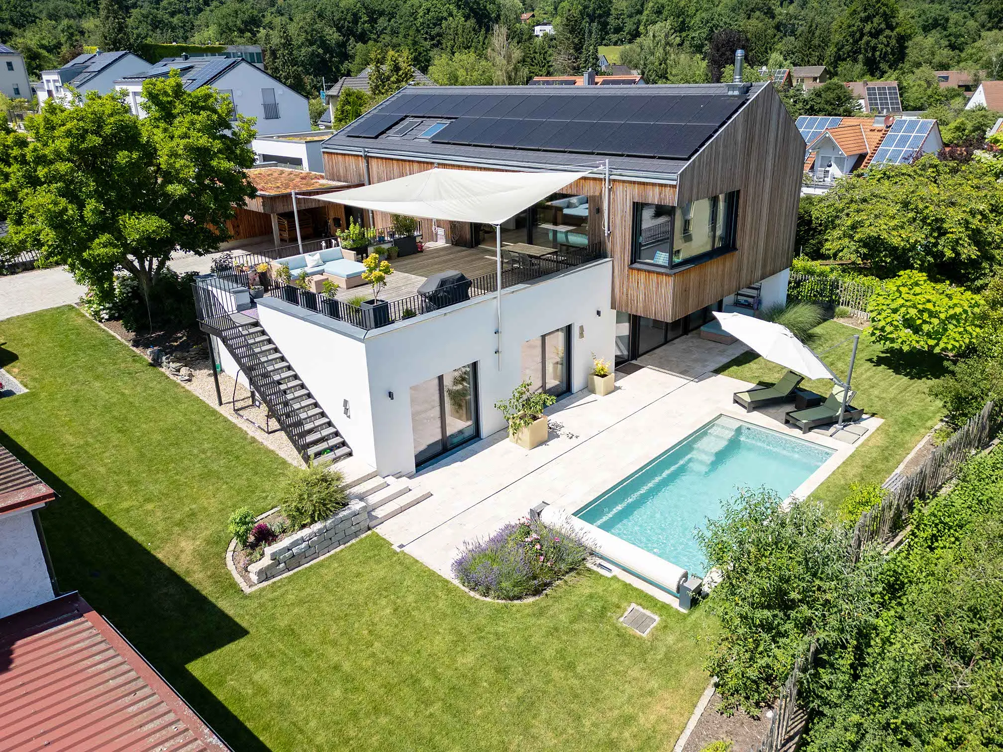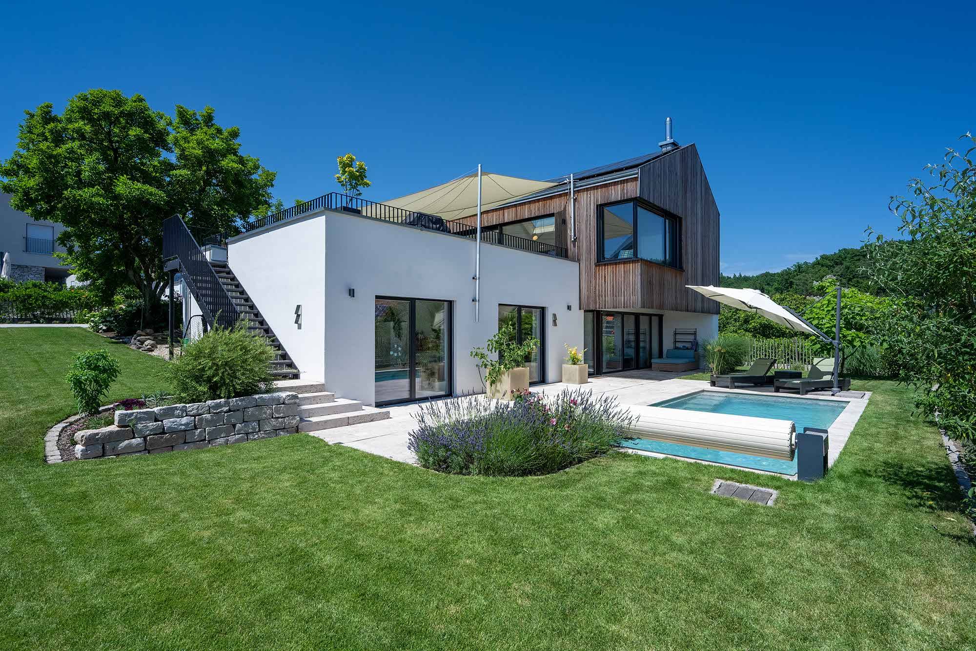 Holzlamellendecke, Wohnräume im OG (Hanglage), Pool im Garten