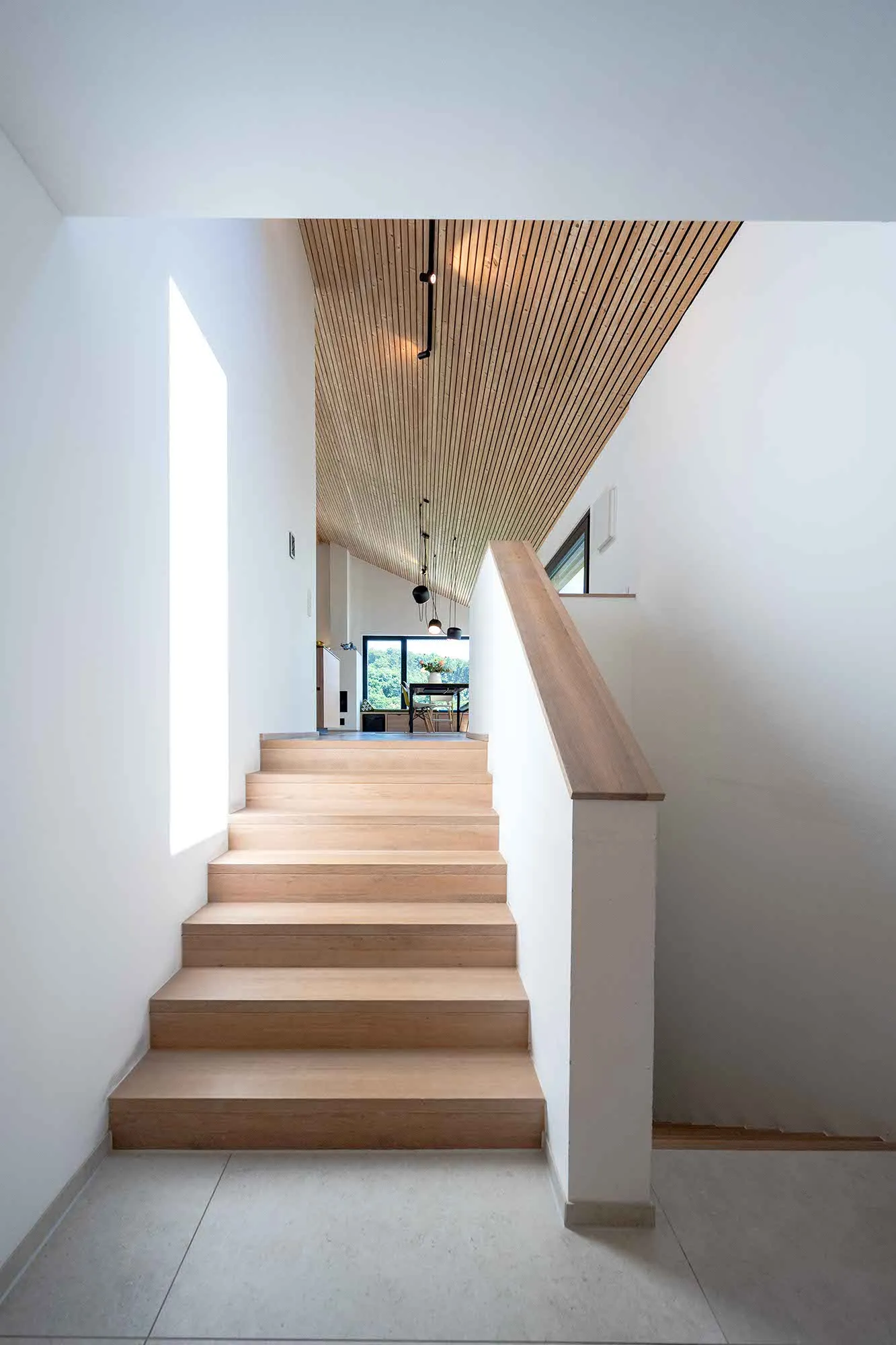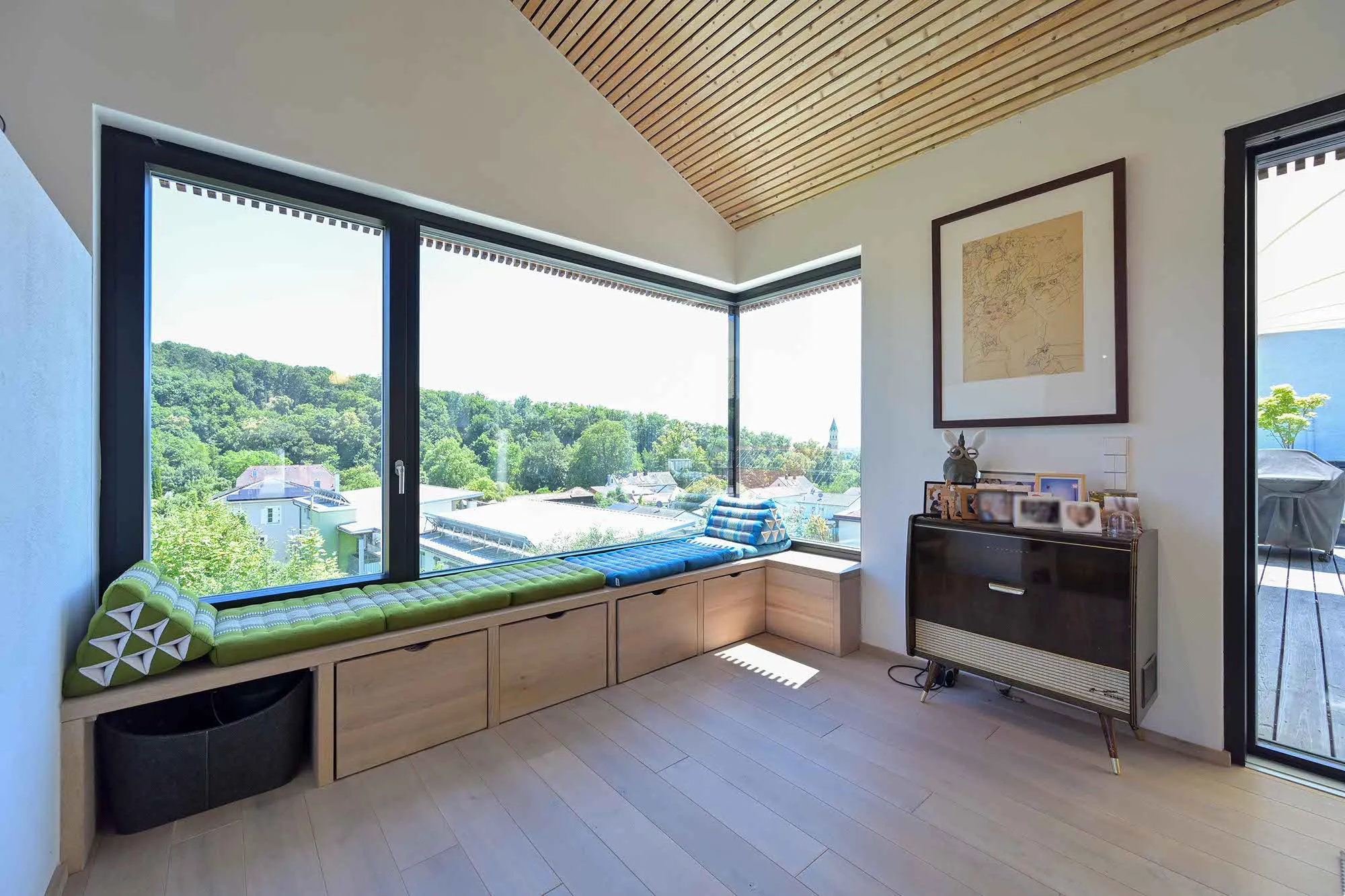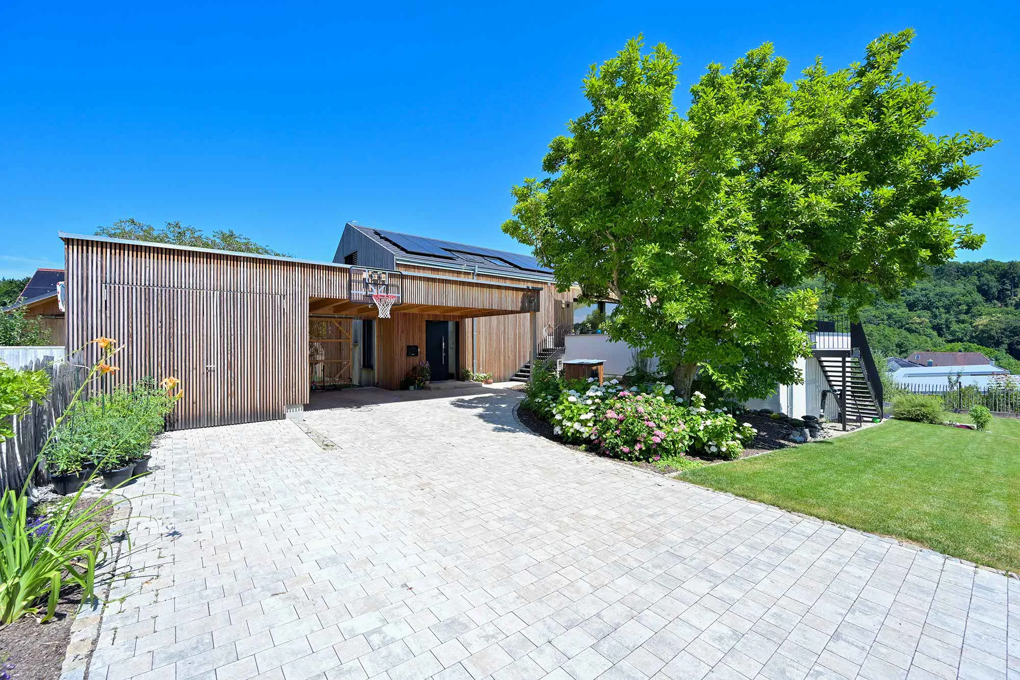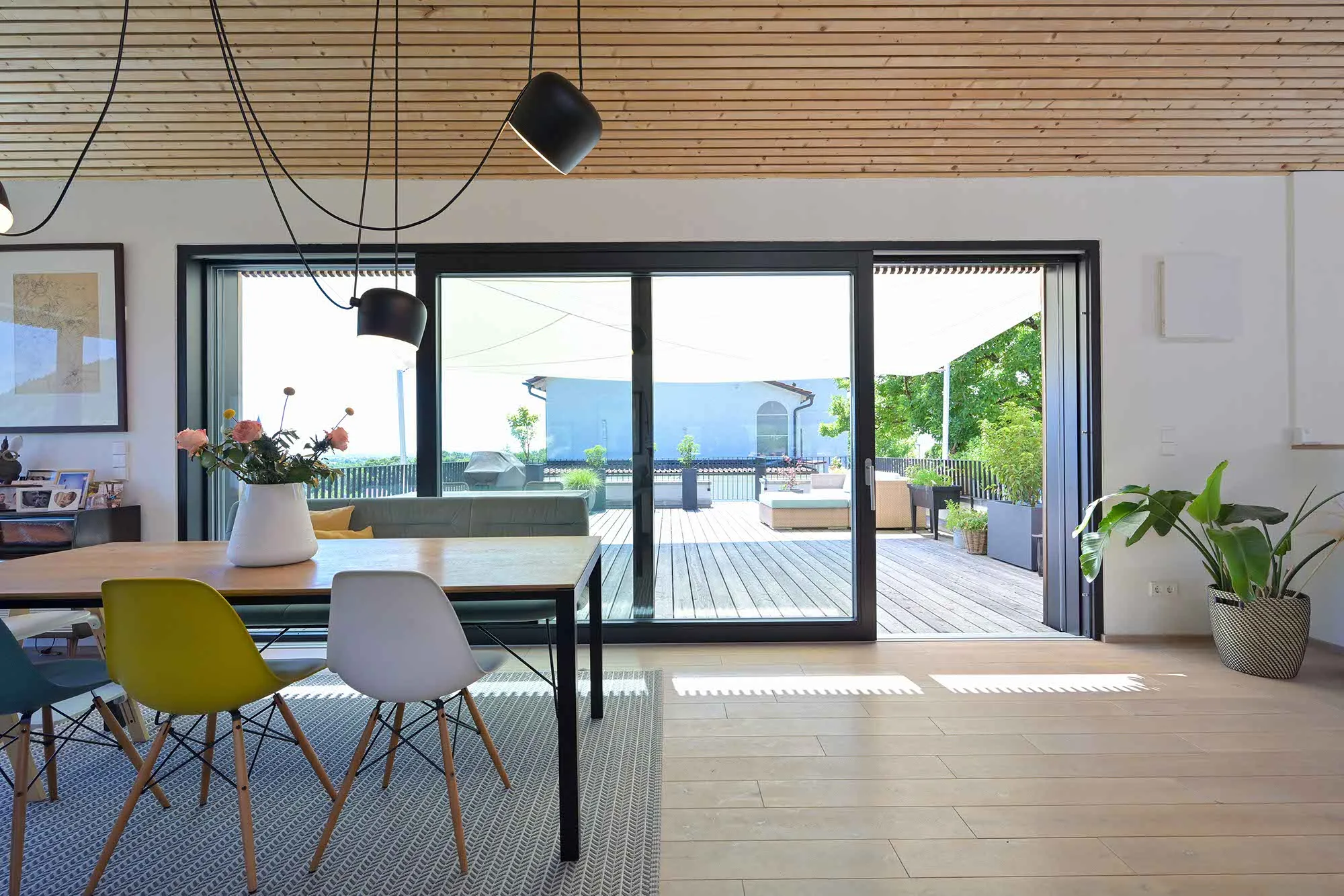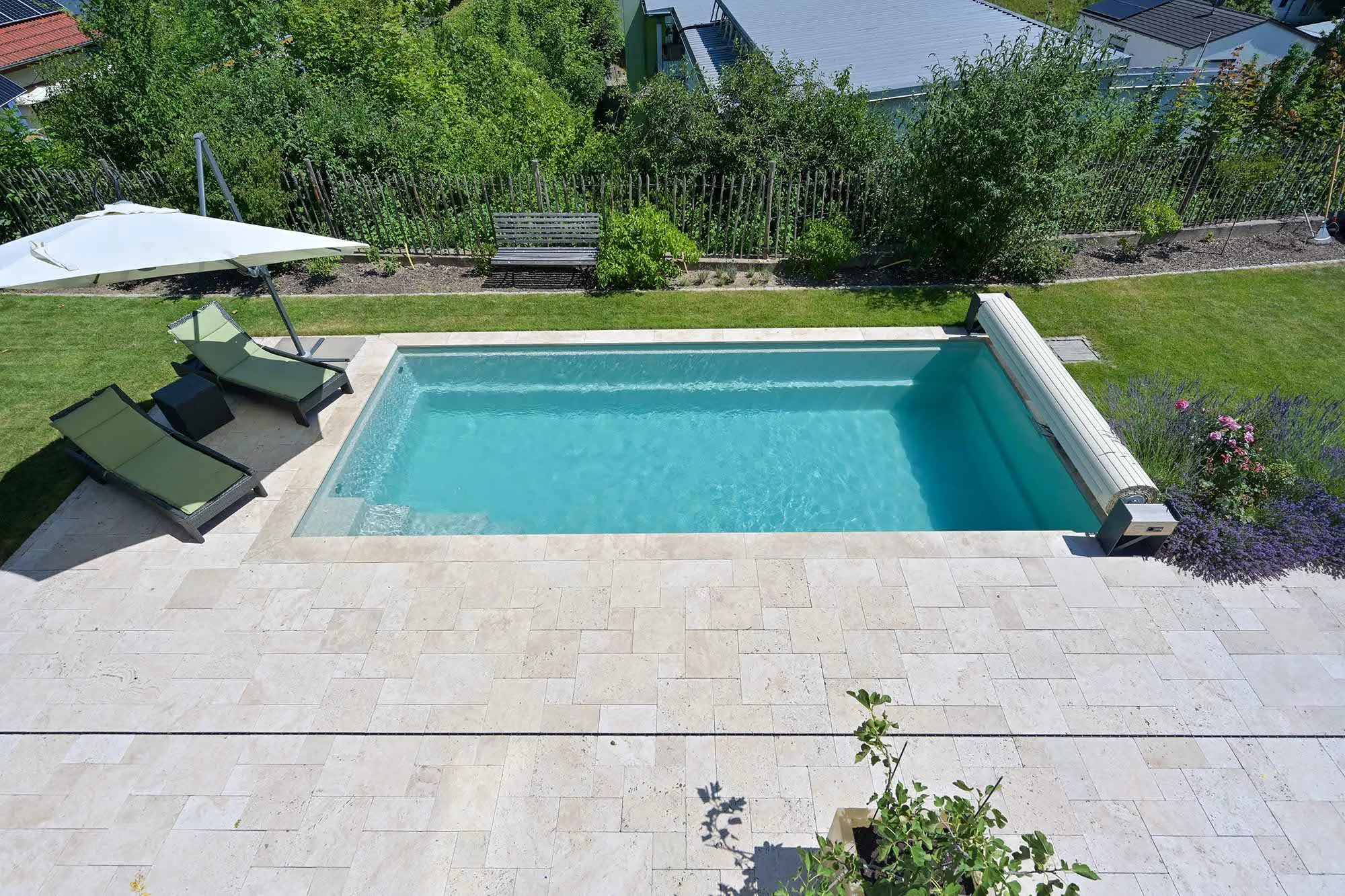 Holzlamellendecke, Wohnräume im OG (Hanglage), Pool im Garten