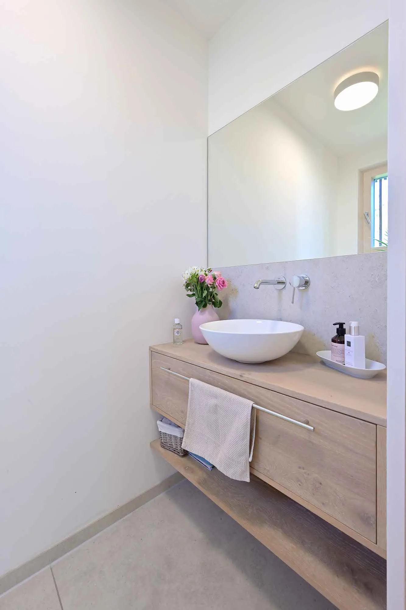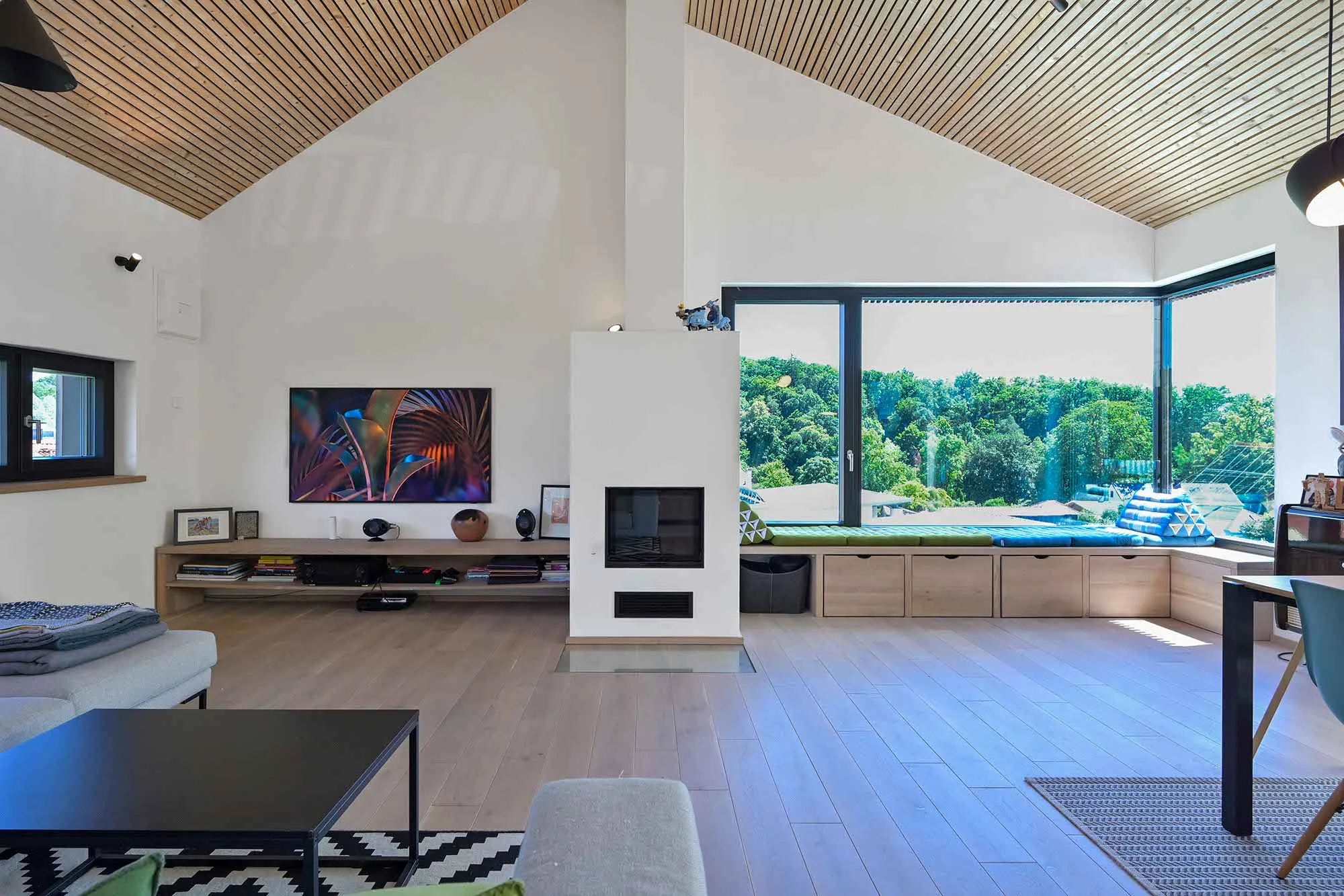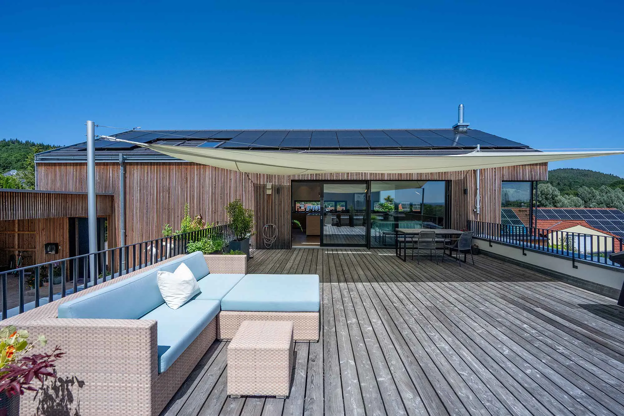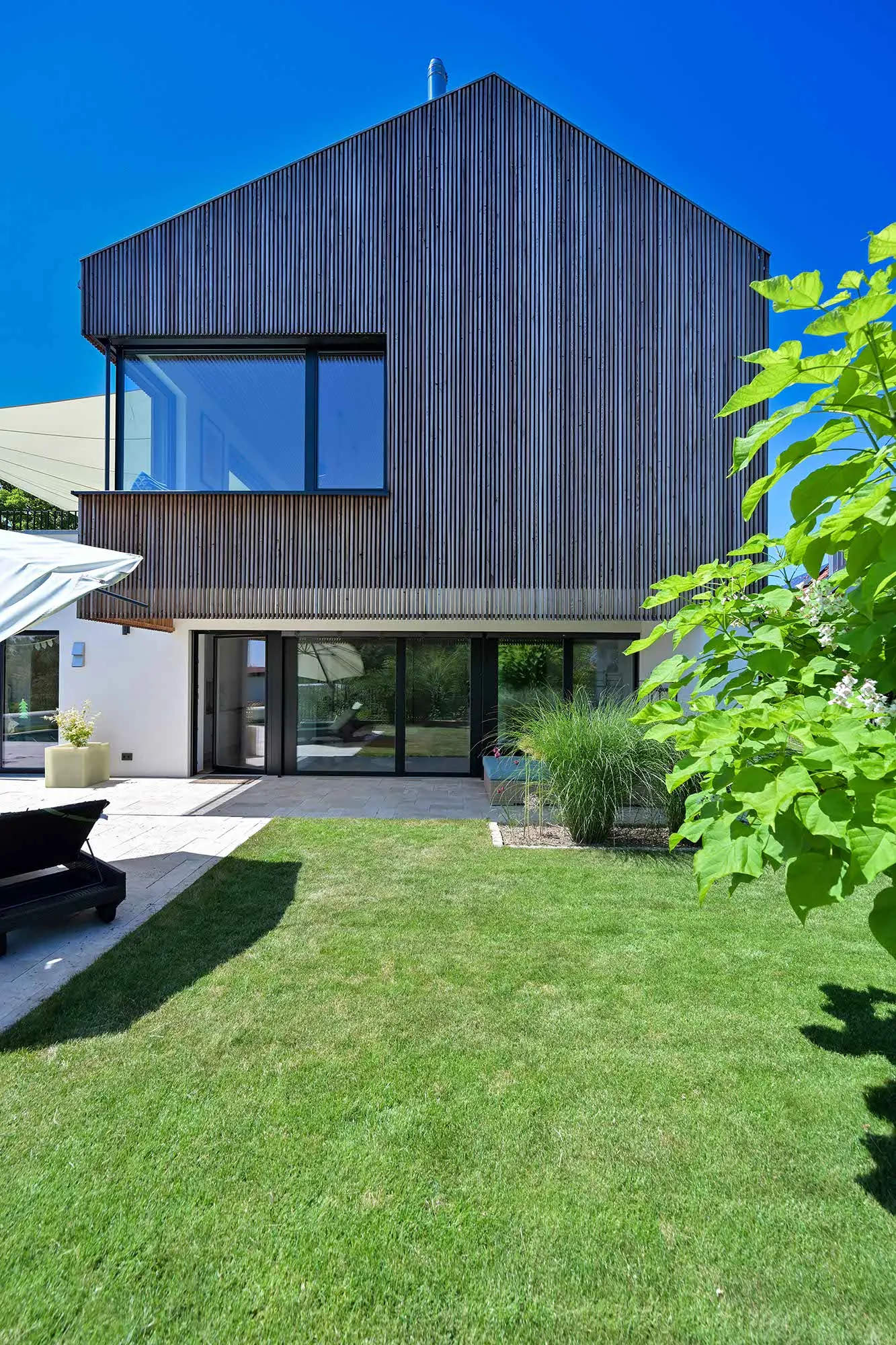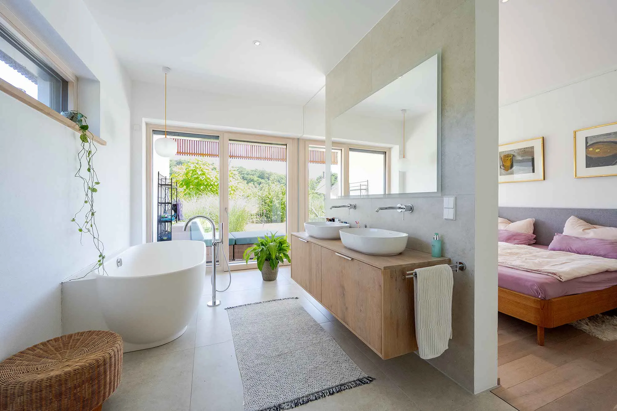 Holzlamellendecke, Wohnräume im OG (Hanglage), Pool im Garten
