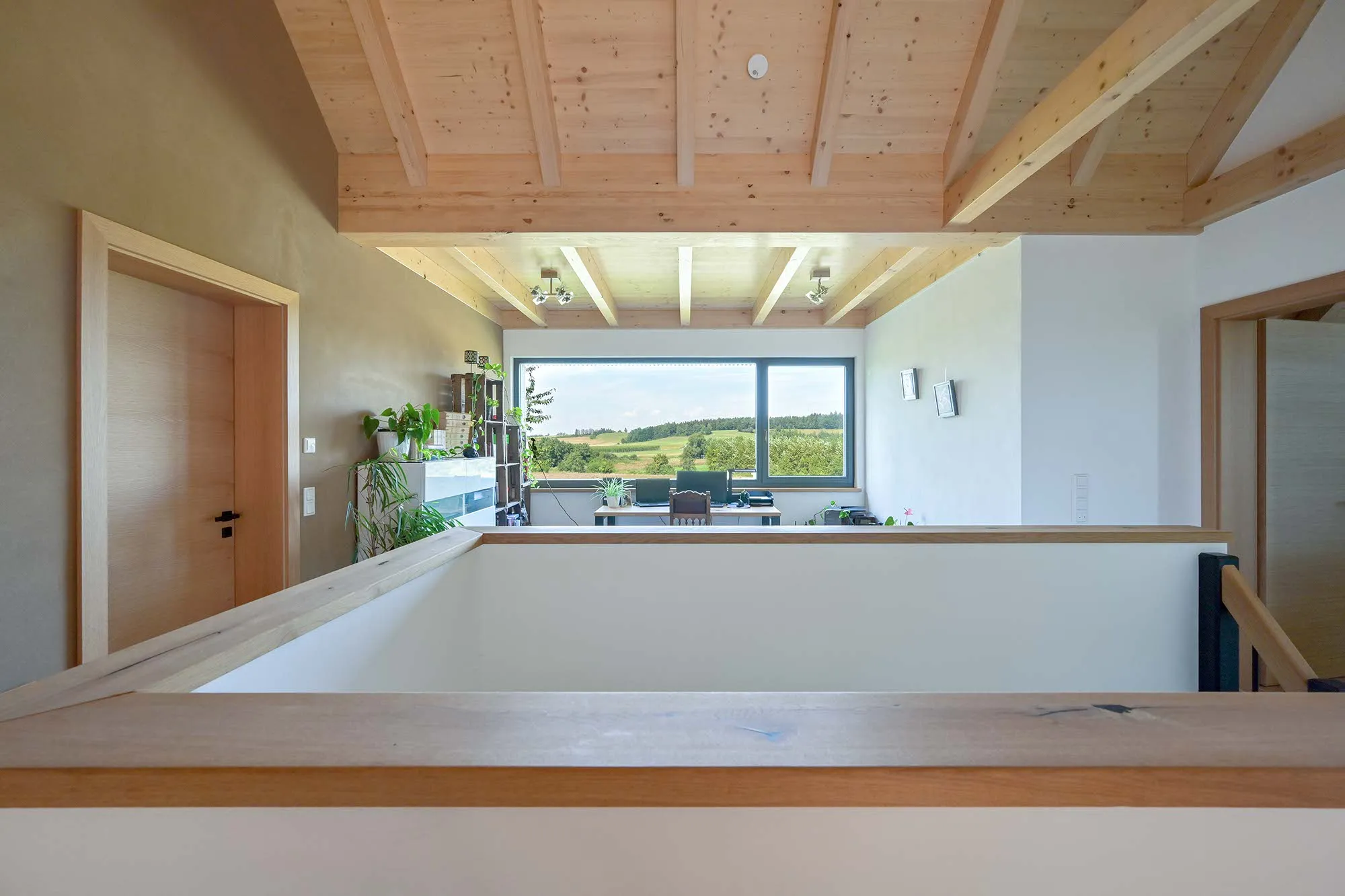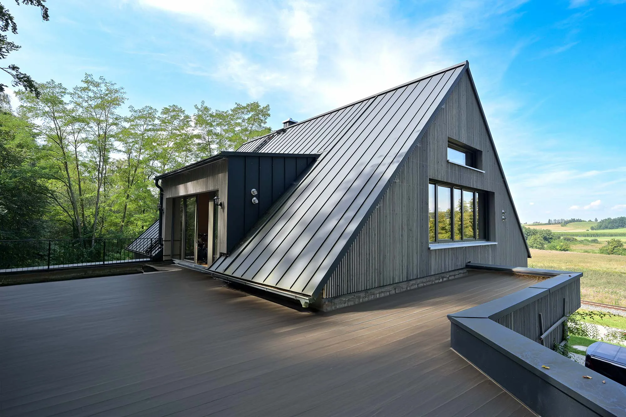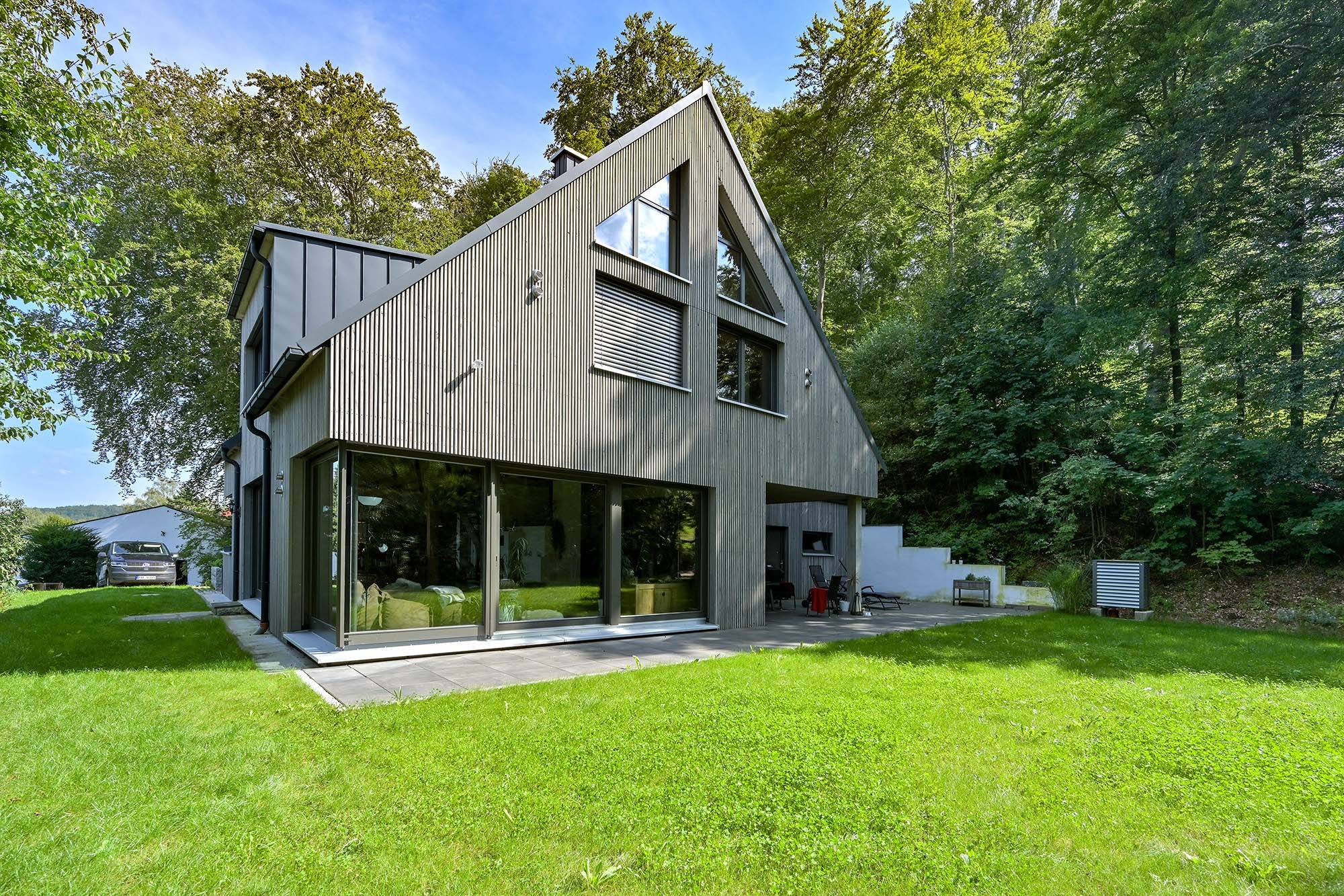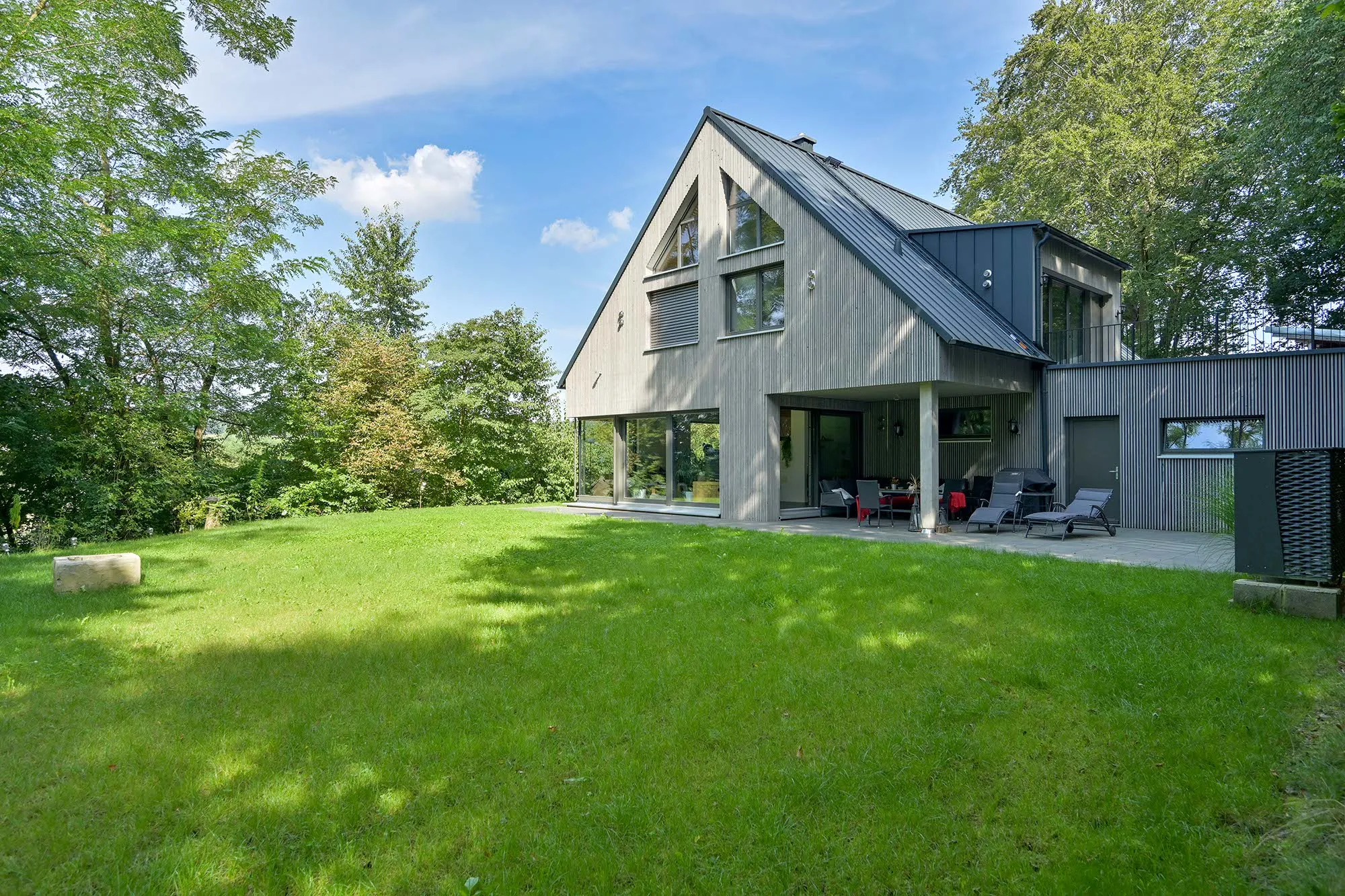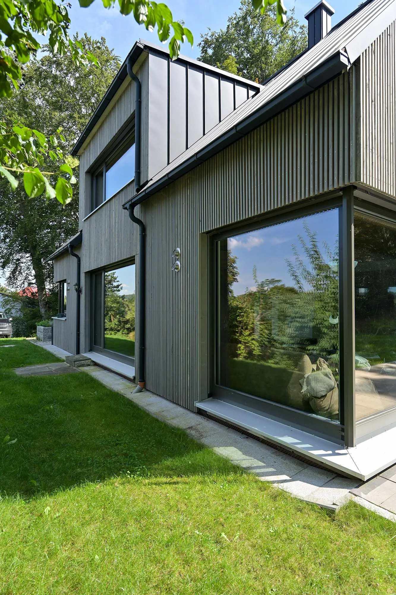 Dacheindeckung mit Stehfalzblech, große Fensterelemente, vorvergraute Lärchenfassade, Giebelfenster an Dachstuhl angeglichen (Dreiecksfenster), in Galerie integriertes Arbeitszimmer