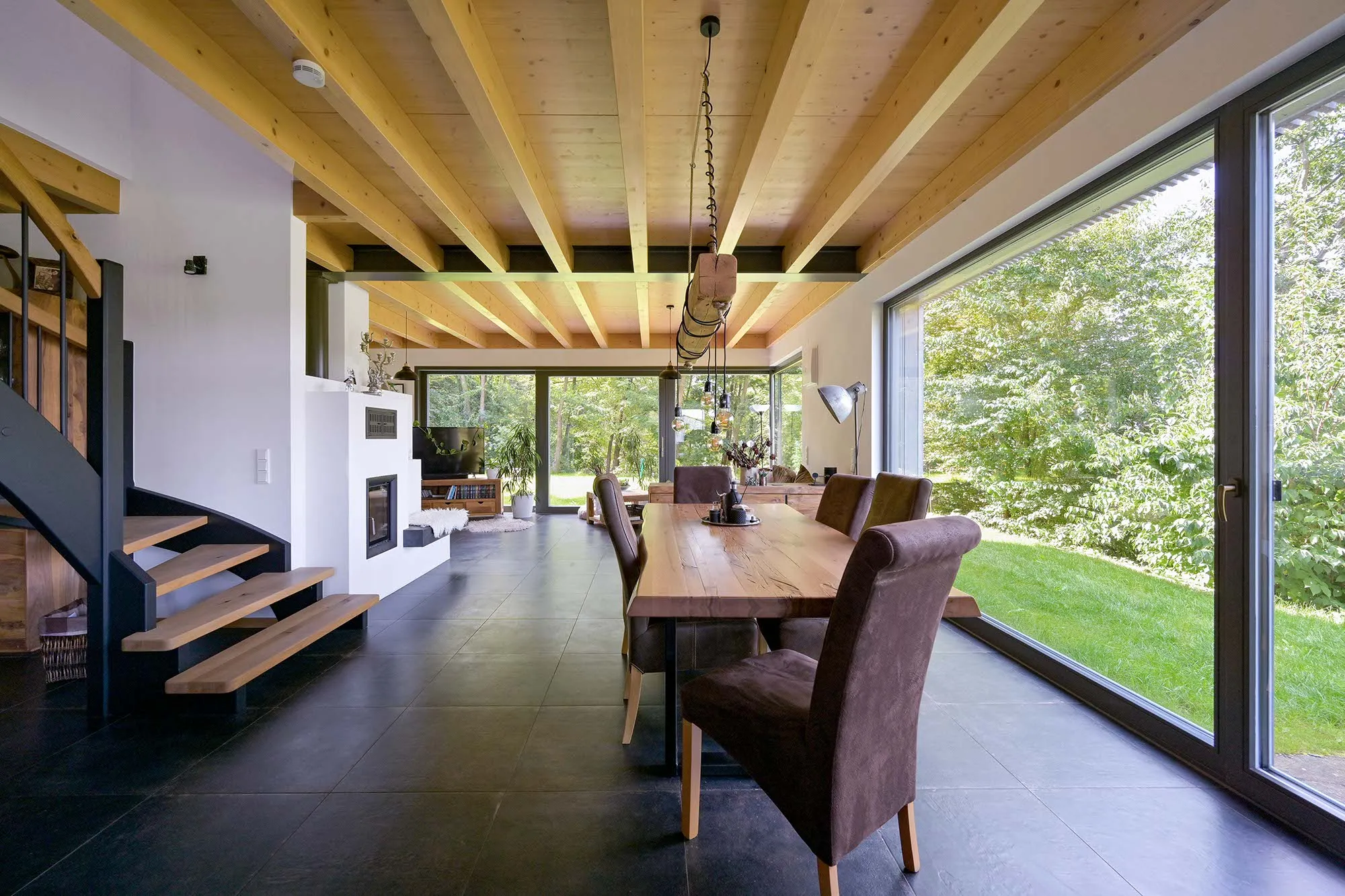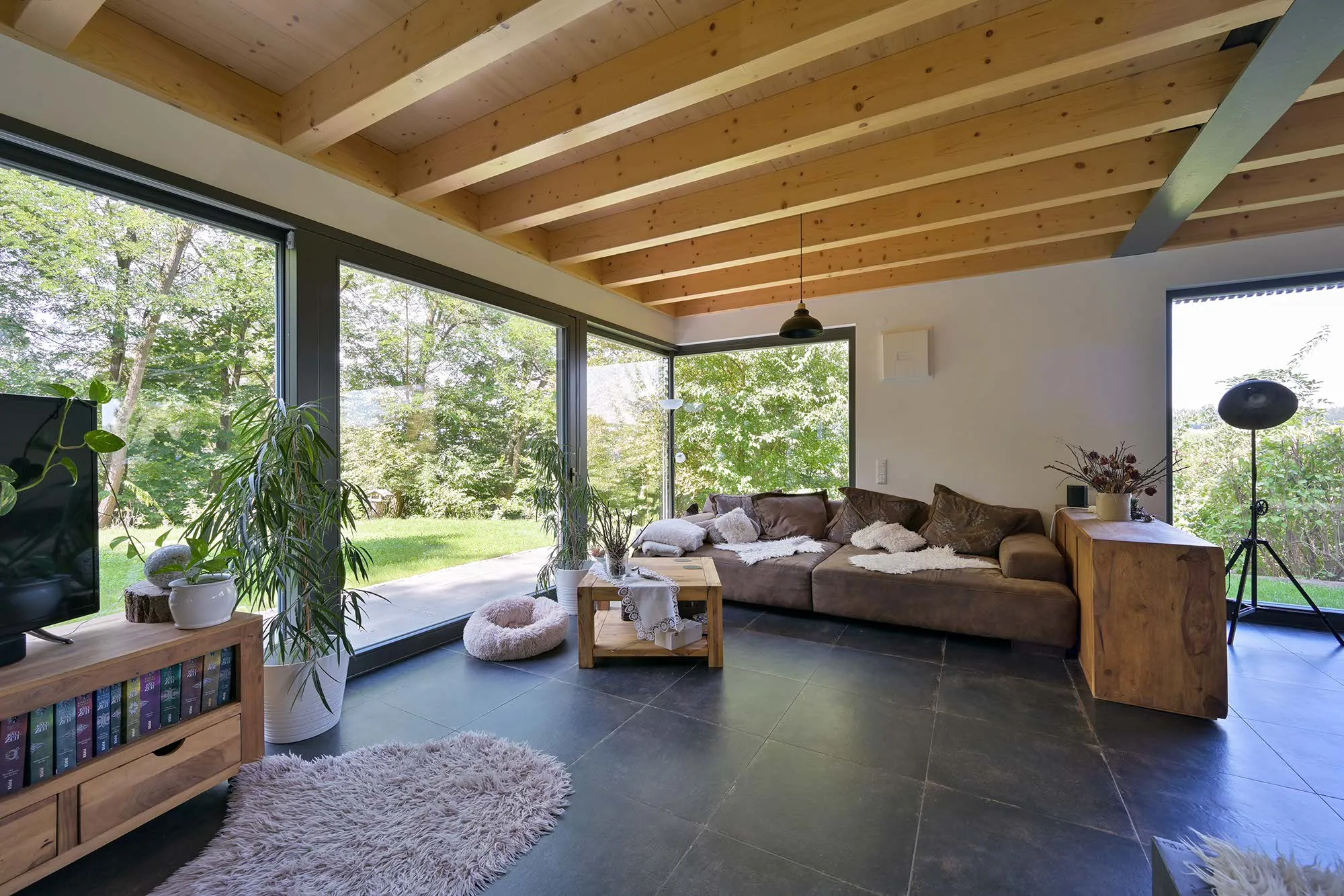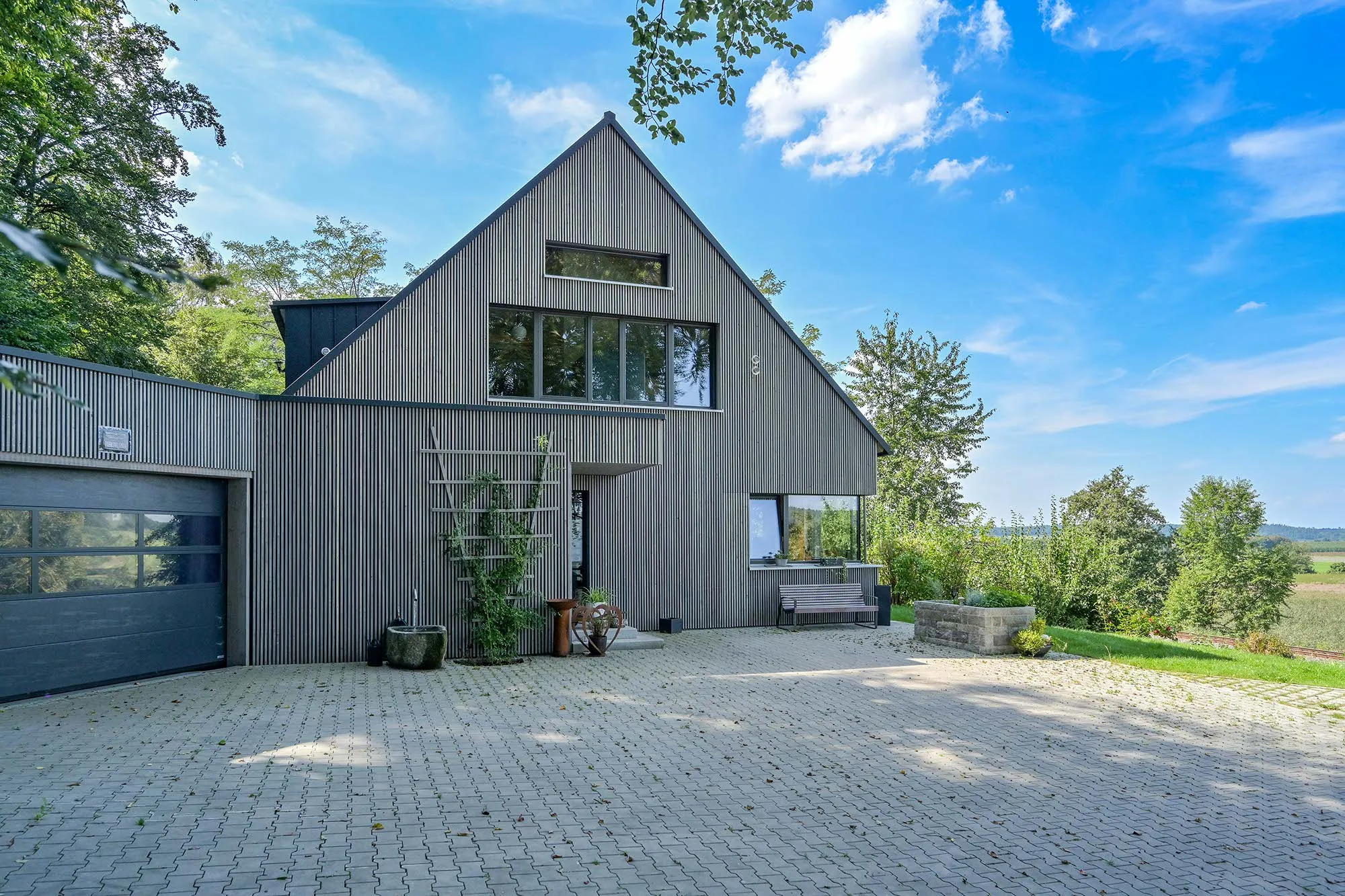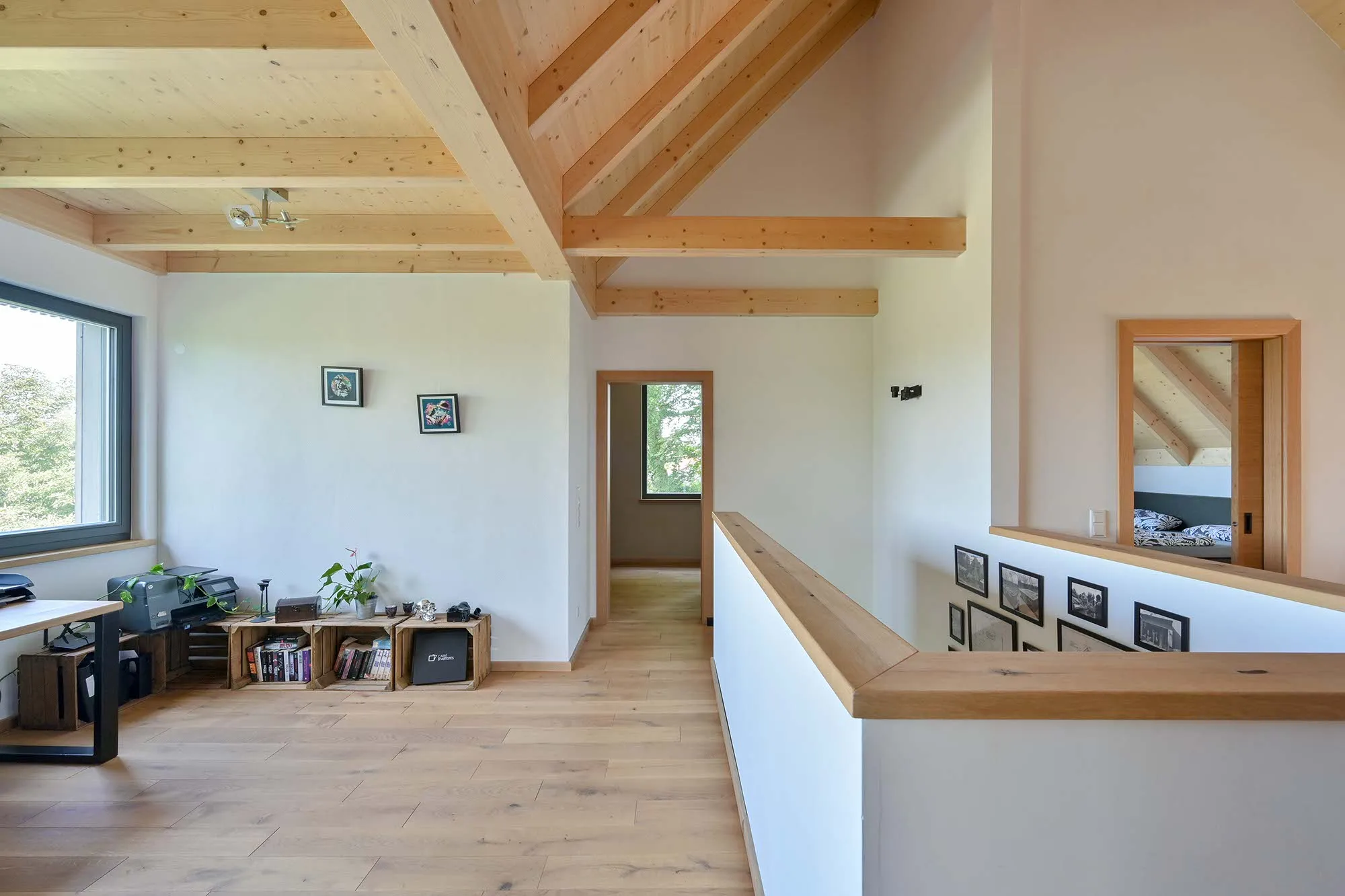 Dacheindeckung mit Stehfalzblech, große Fensterelemente, vorvergraute Lärchenfassade, Giebelfenster an Dachstuhl angeglichen (Dreiecksfenster), in Galerie integriertes Arbeitszimmer
