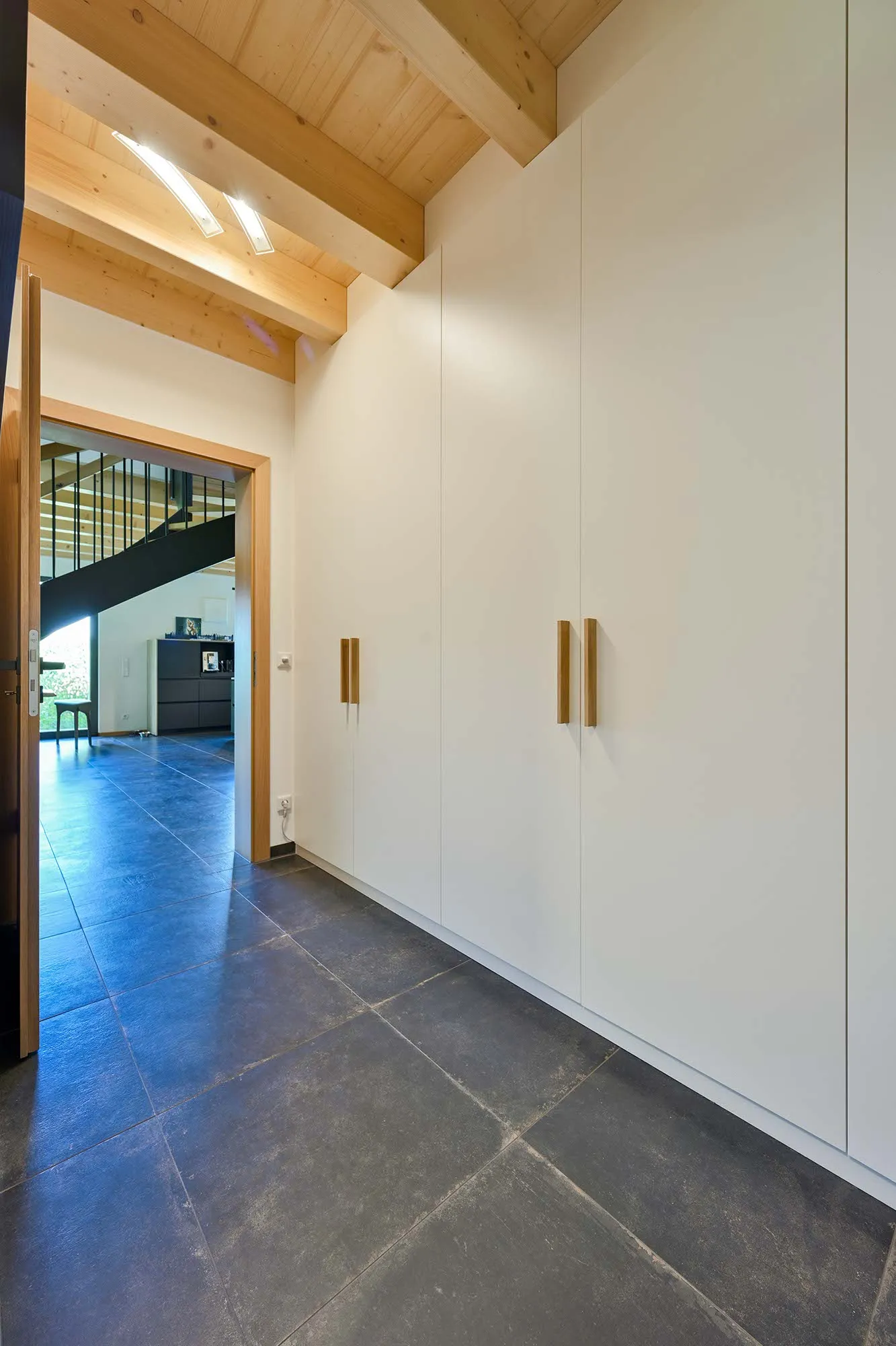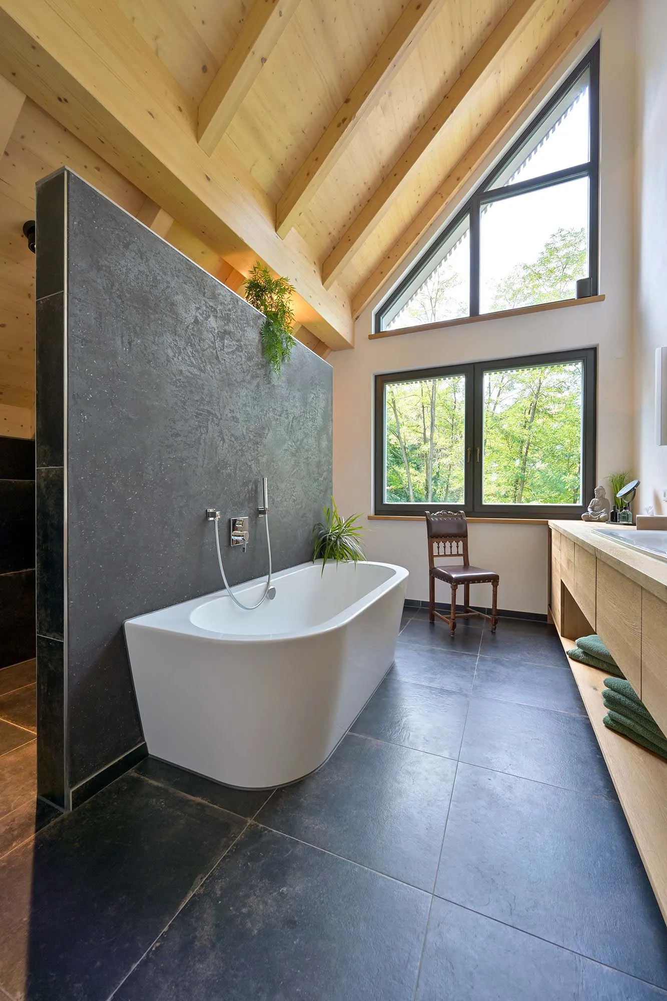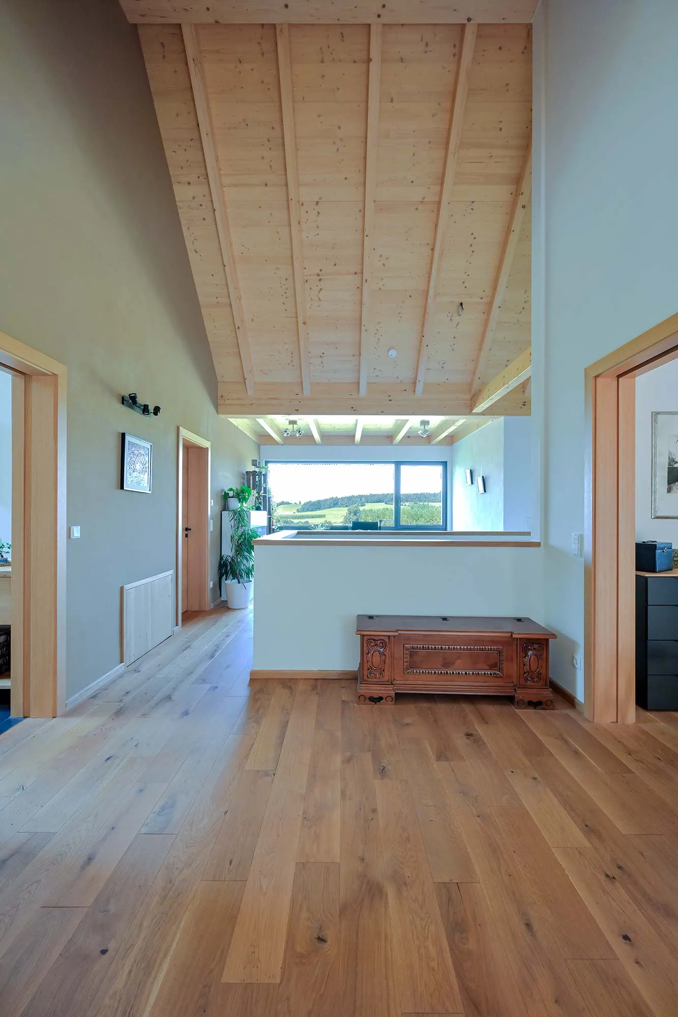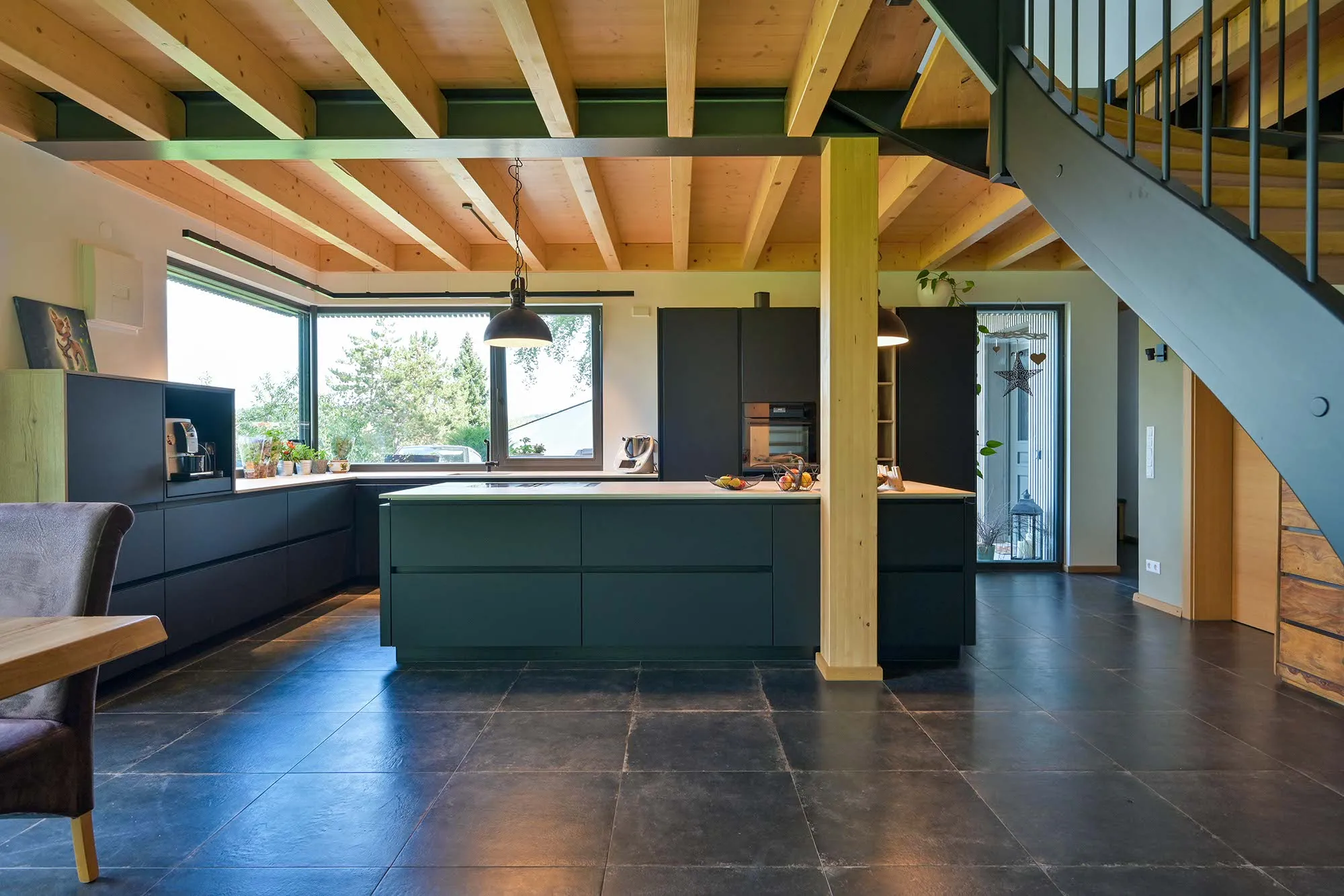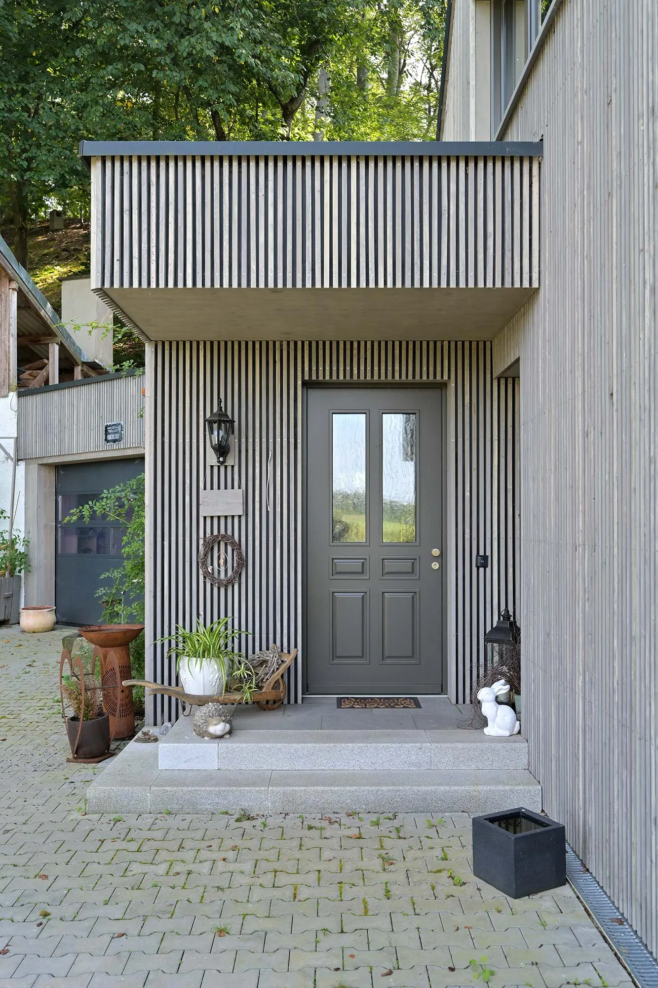 Dacheindeckung mit Stehfalzblech, große Fensterelemente, vorvergraute Lärchenfassade, Giebelfenster an Dachstuhl angeglichen (Dreiecksfenster), in Galerie integriertes Arbeitszimmer