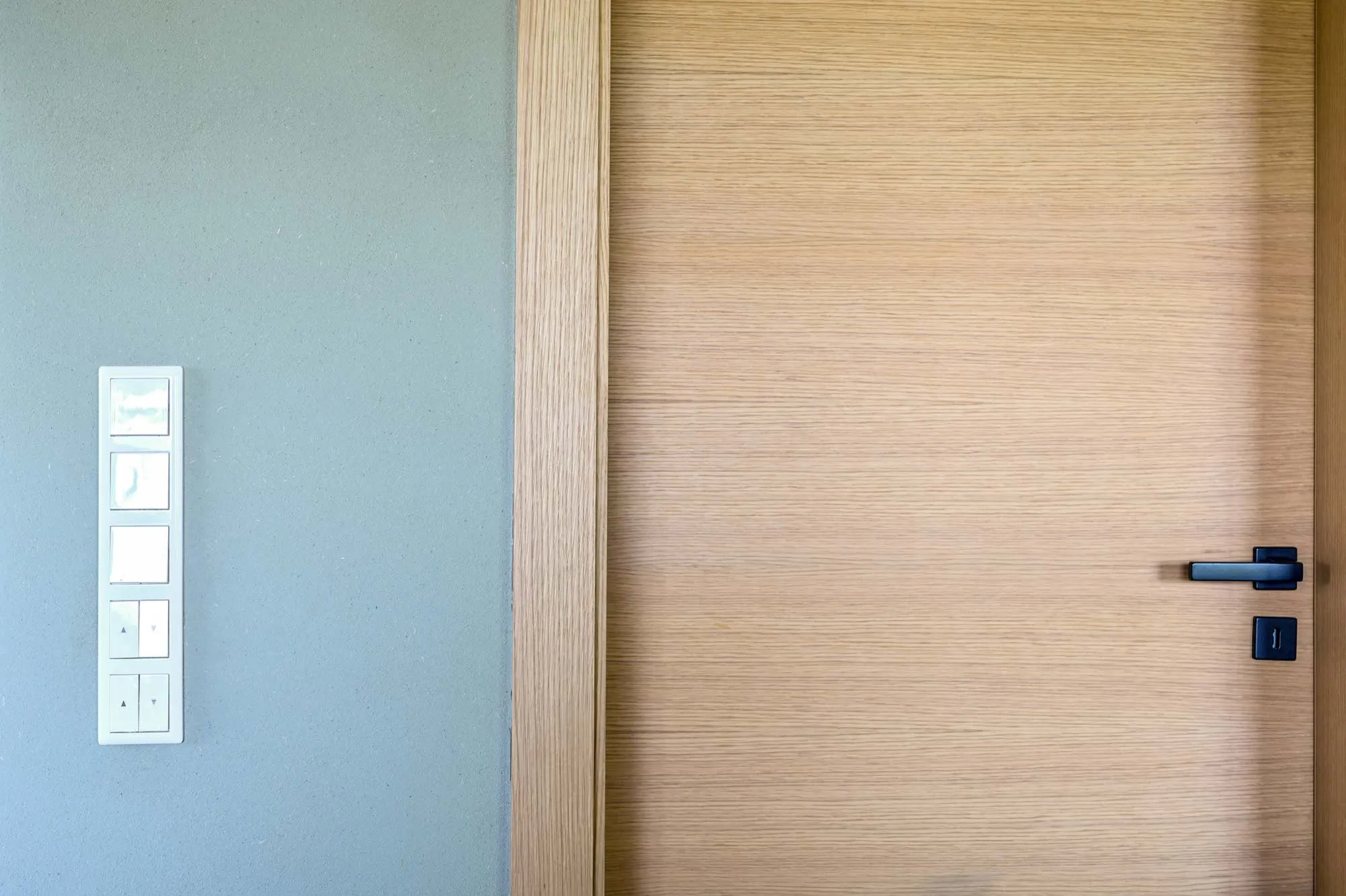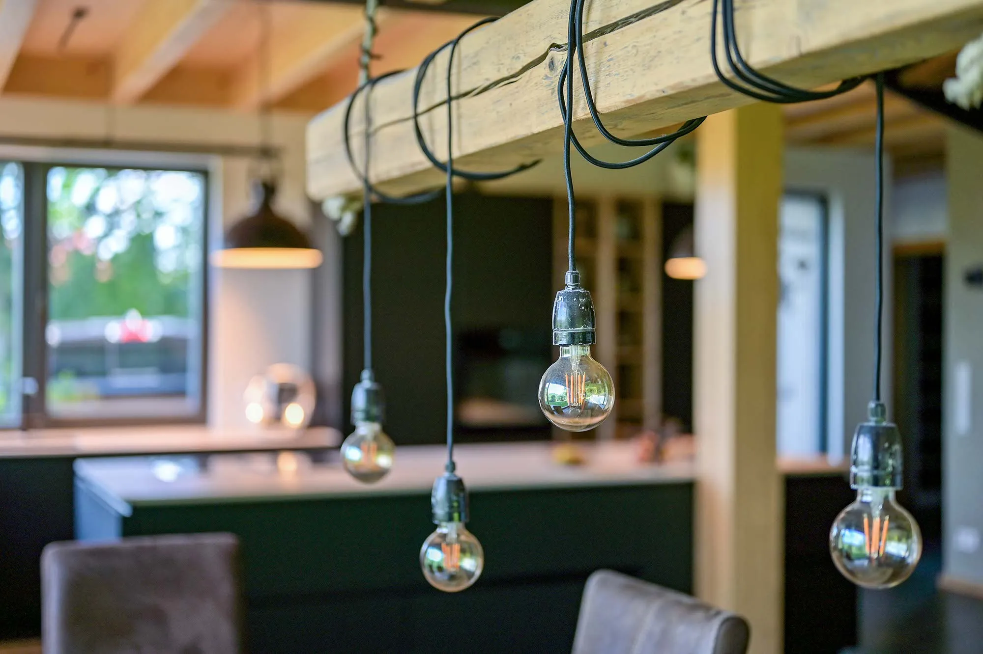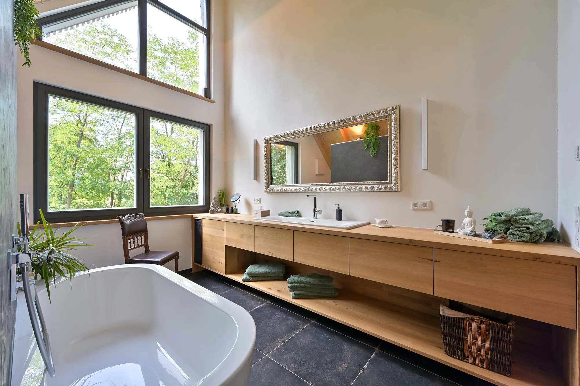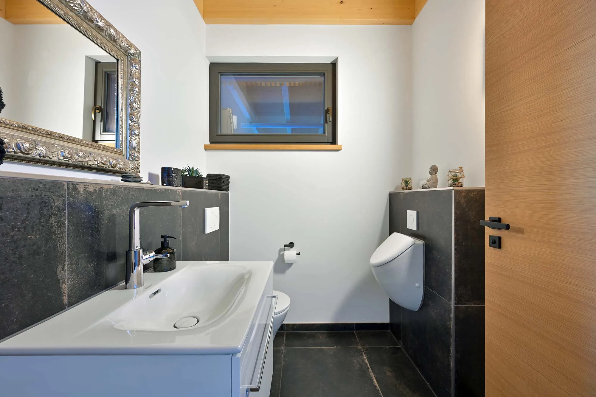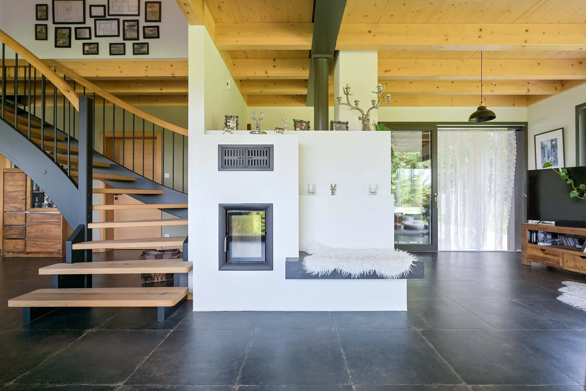 Dacheindeckung mit Stehfalzblech, große Fensterelemente, vorvergraute Lärchenfassade, Giebelfenster an Dachstuhl angeglichen (Dreiecksfenster), in Galerie integriertes Arbeitszimmer