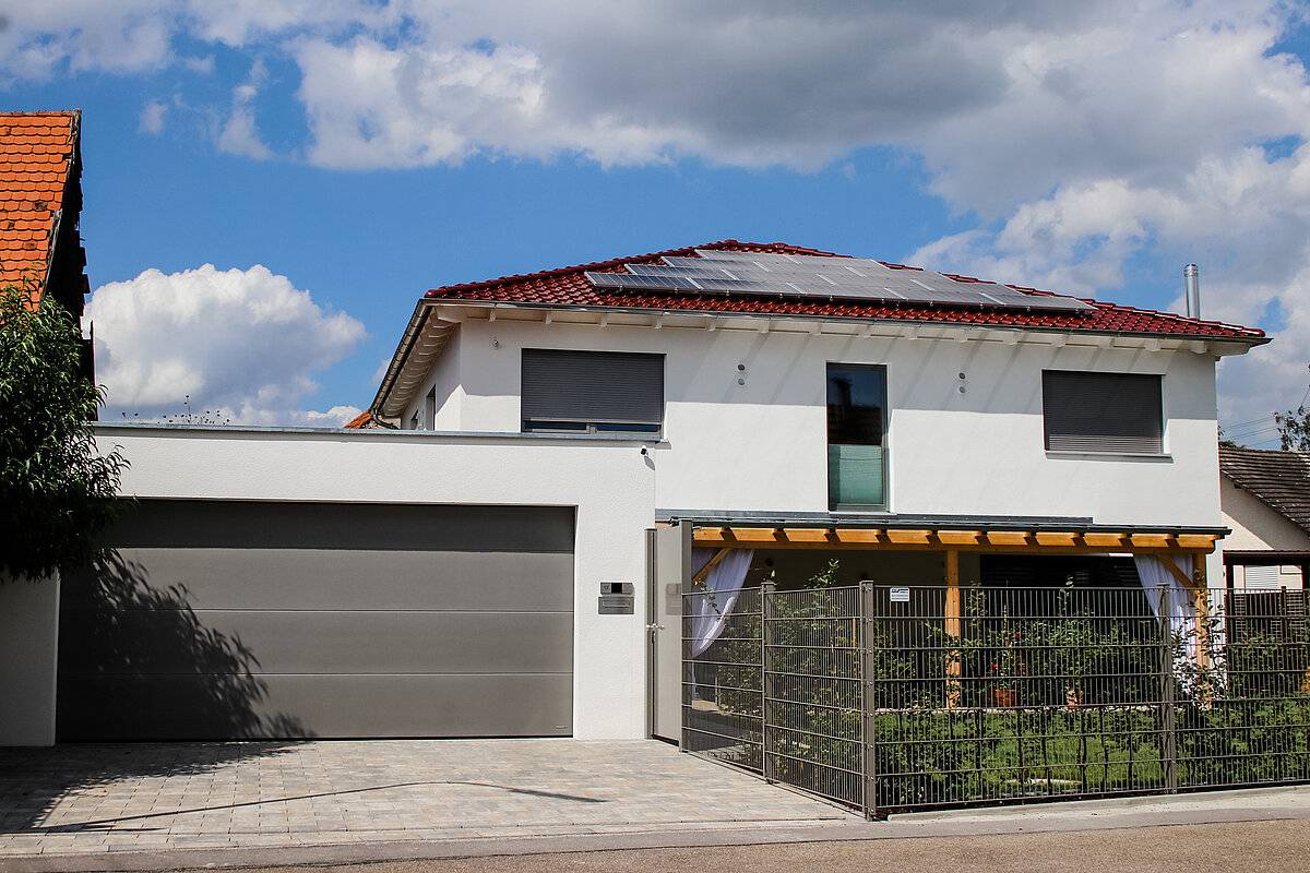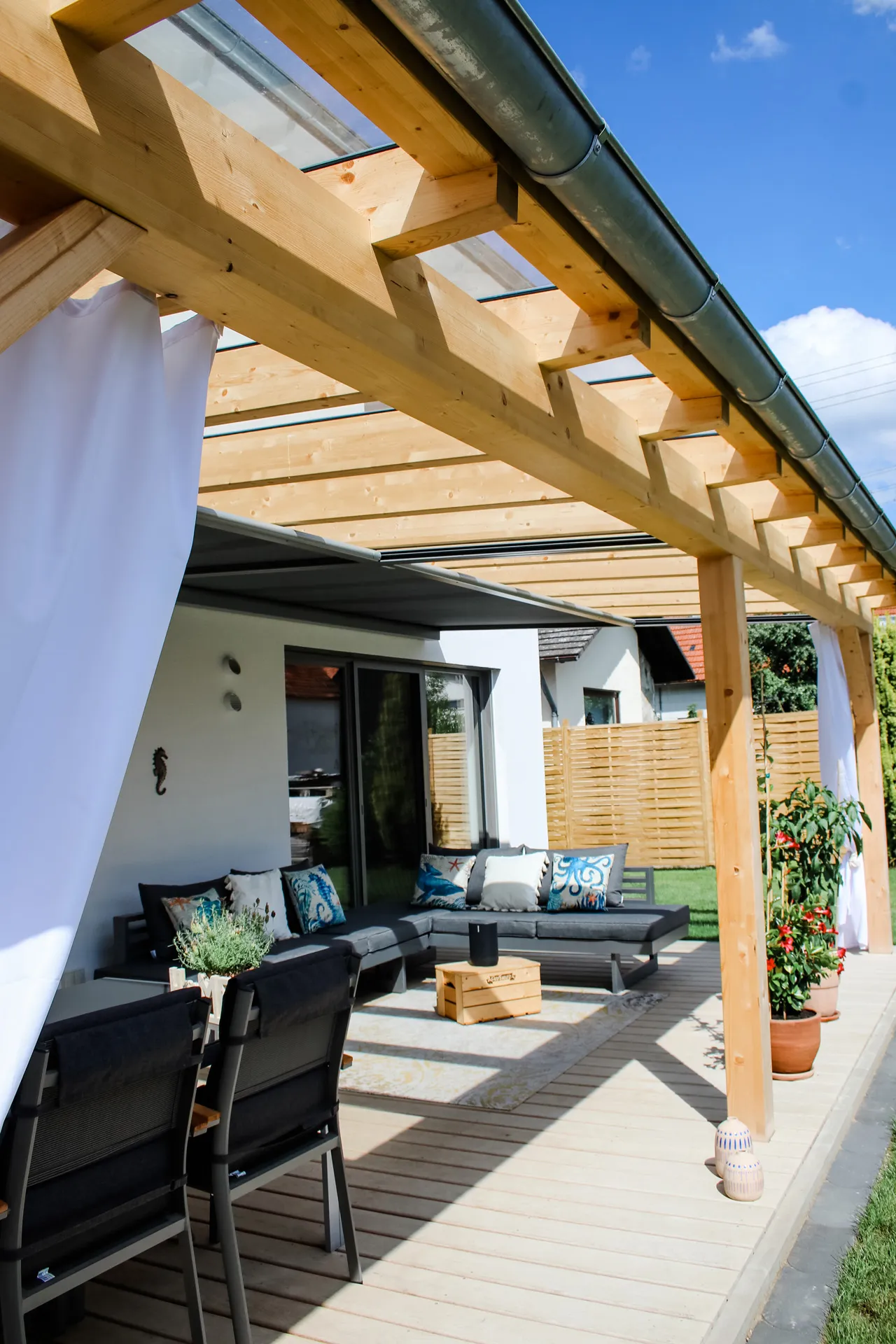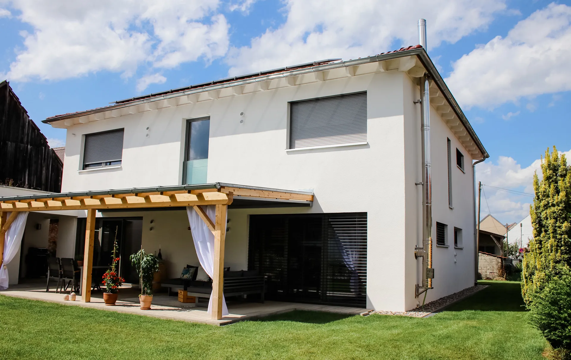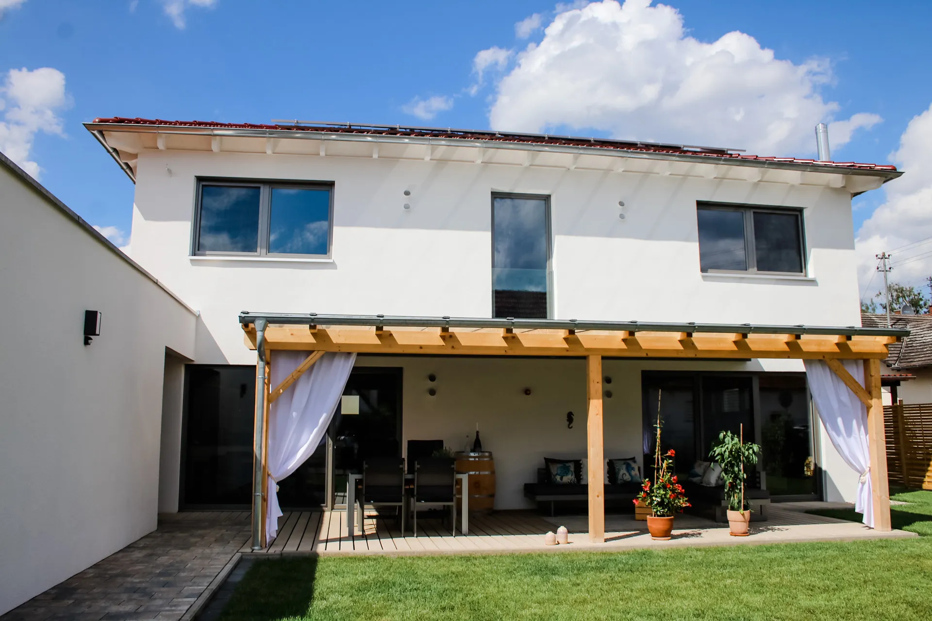 Wellnessoase im Badezimmer; Fensterbänke aus Naturstein; großzügige Pergola; Holzbalkendecke im UG; Sichtdachstuhl im OG; große Schiebetür als Raumtrenner zwischen Ess- und Wohnbereich