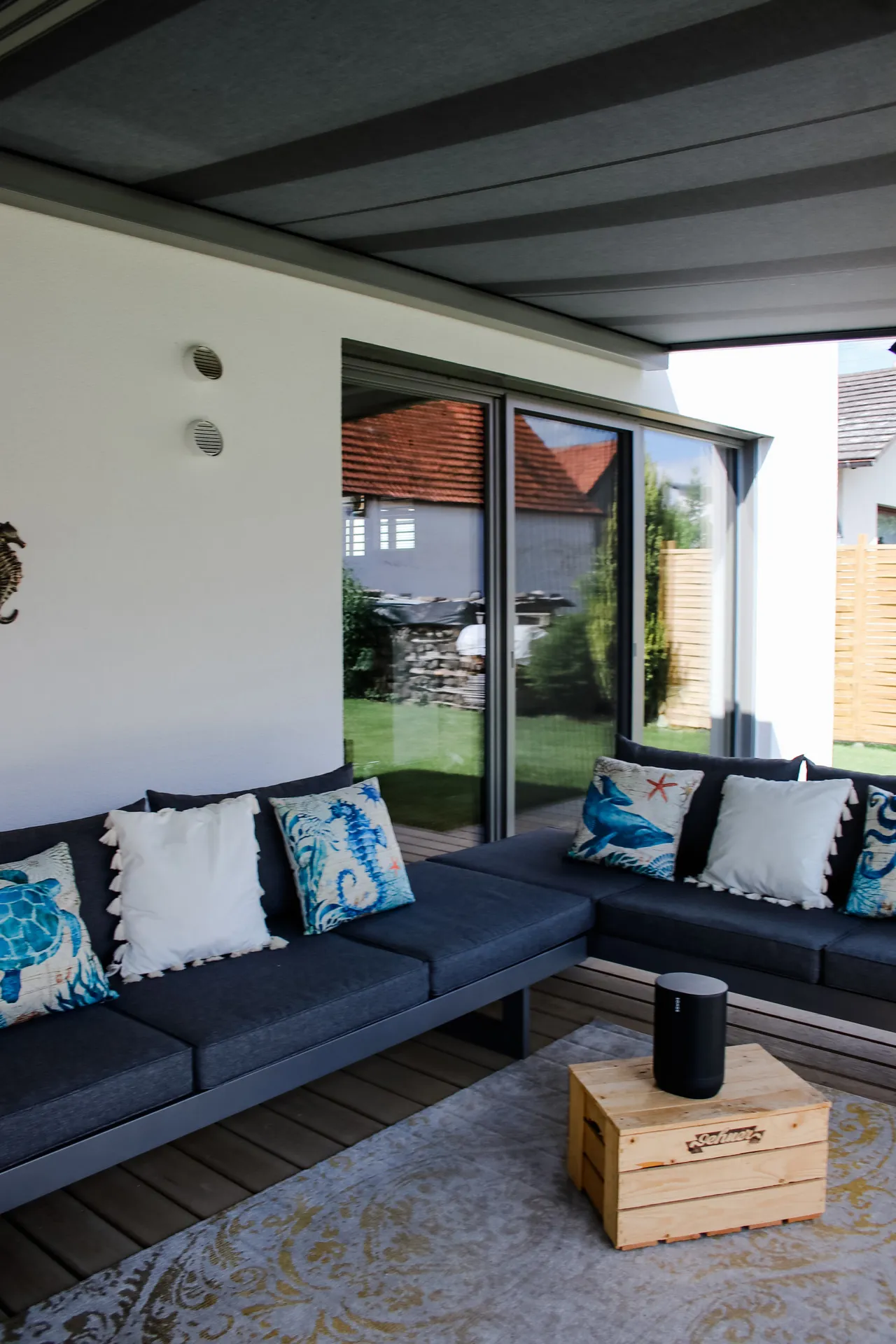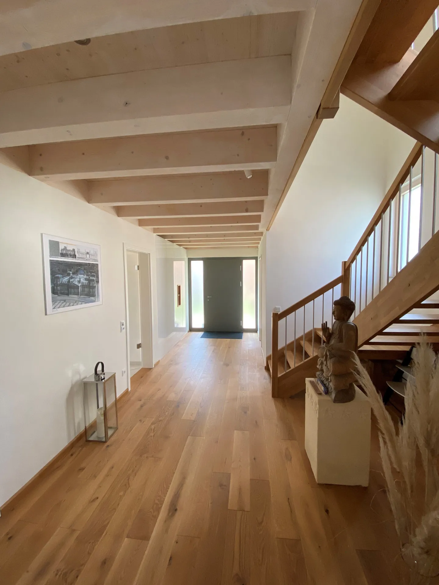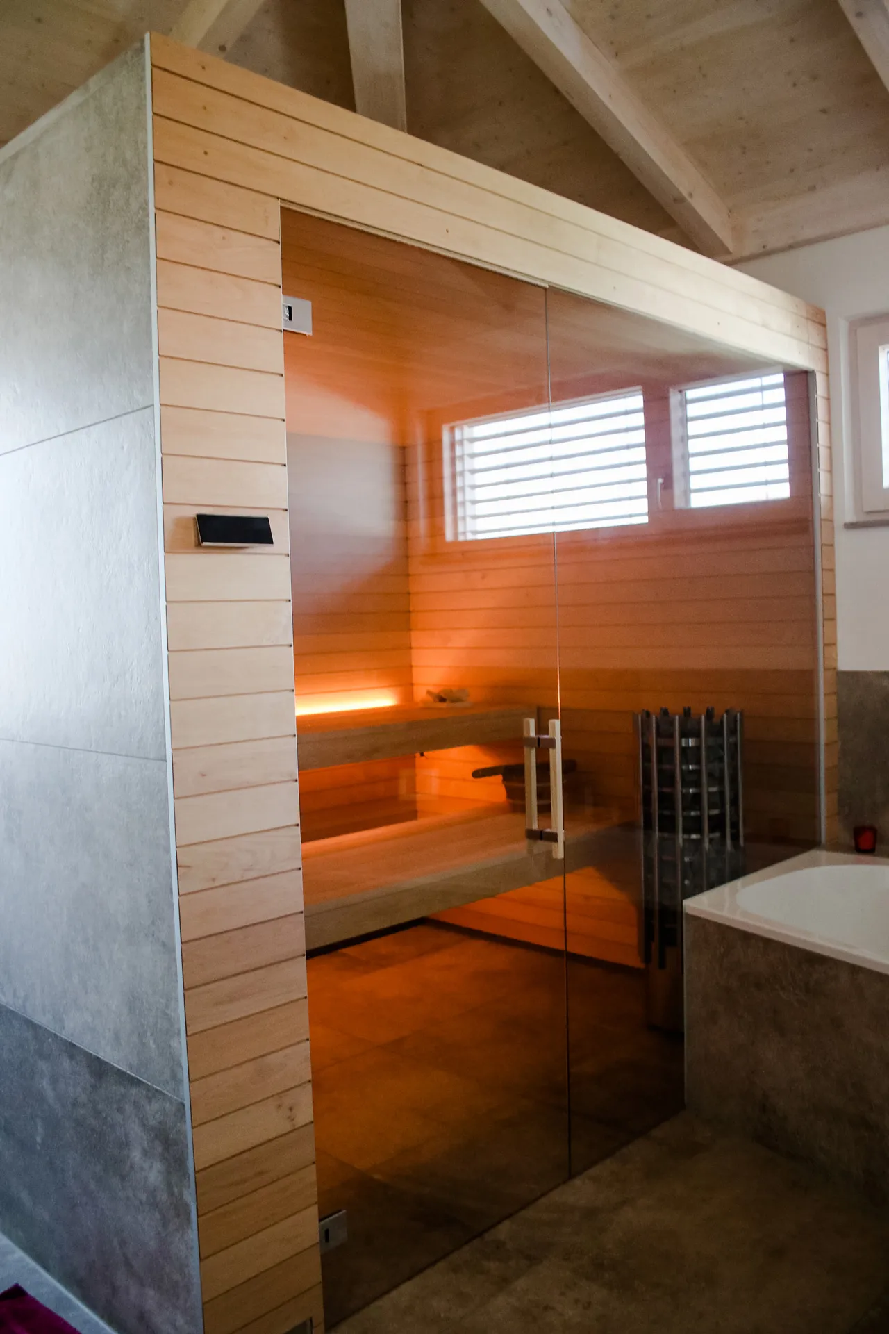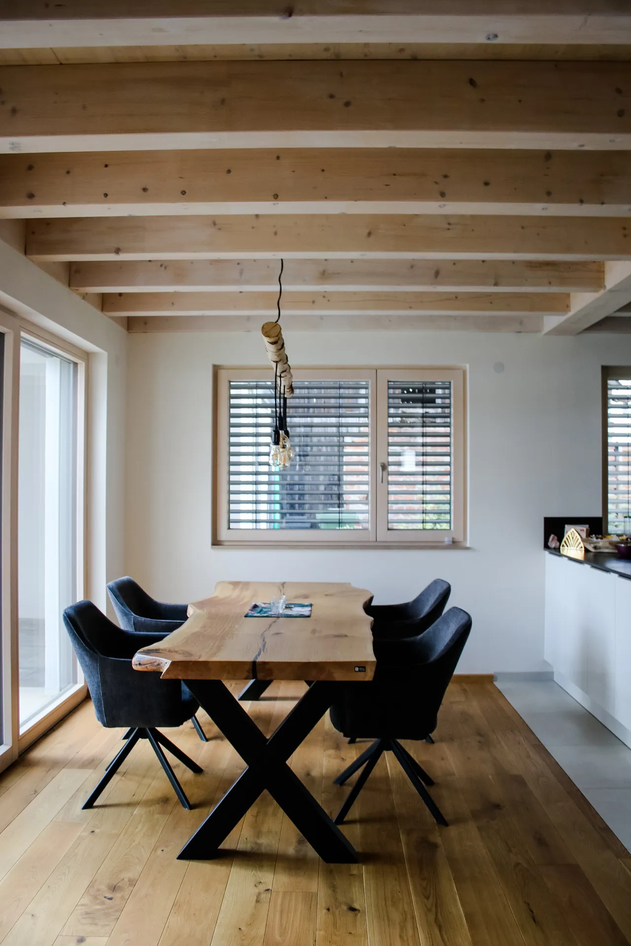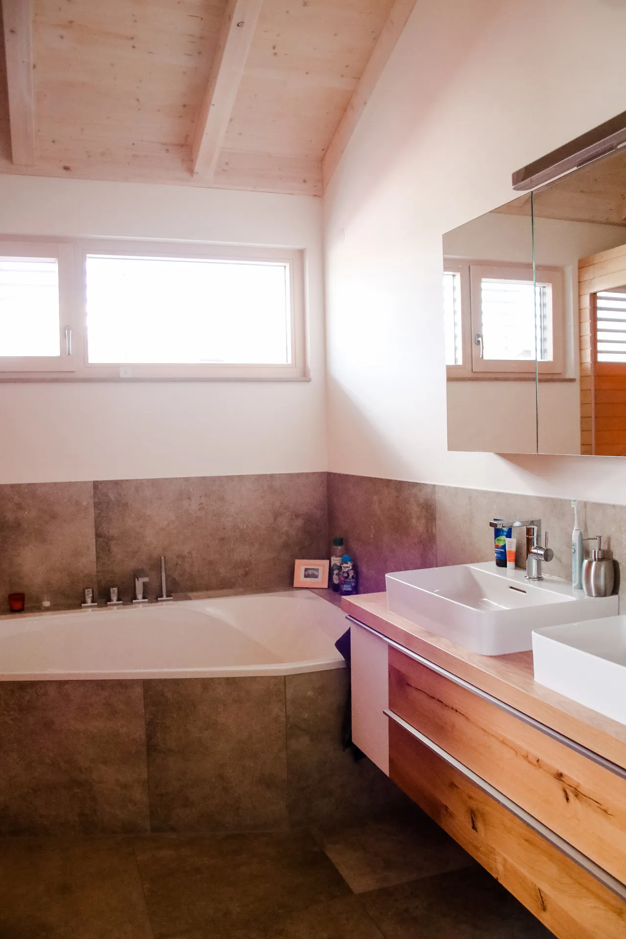 Wellnessoase im Badezimmer; Fensterbänke aus Naturstein; großzügige Pergola; Holzbalkendecke im UG; Sichtdachstuhl im OG; große Schiebetür als Raumtrenner zwischen Ess- und Wohnbereich